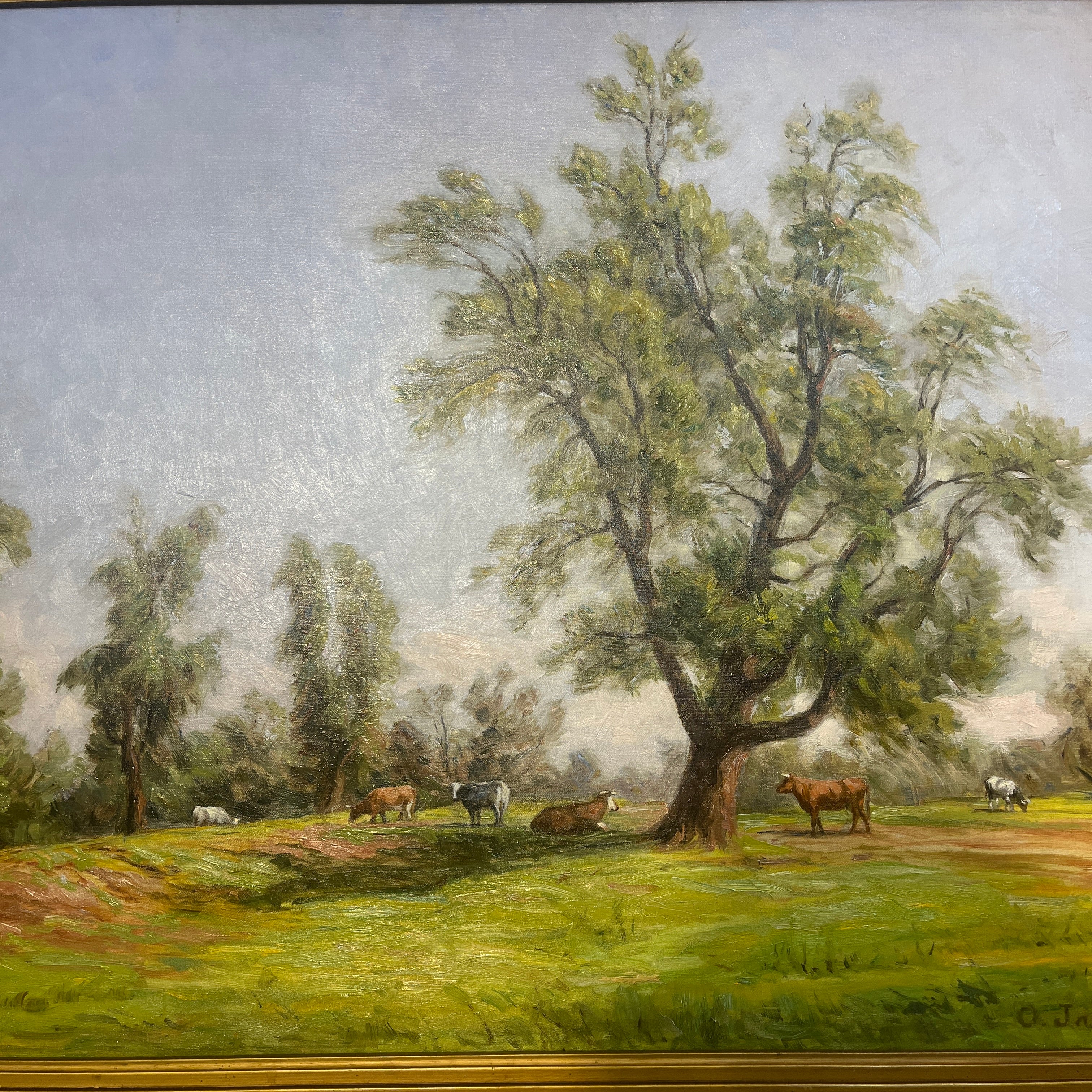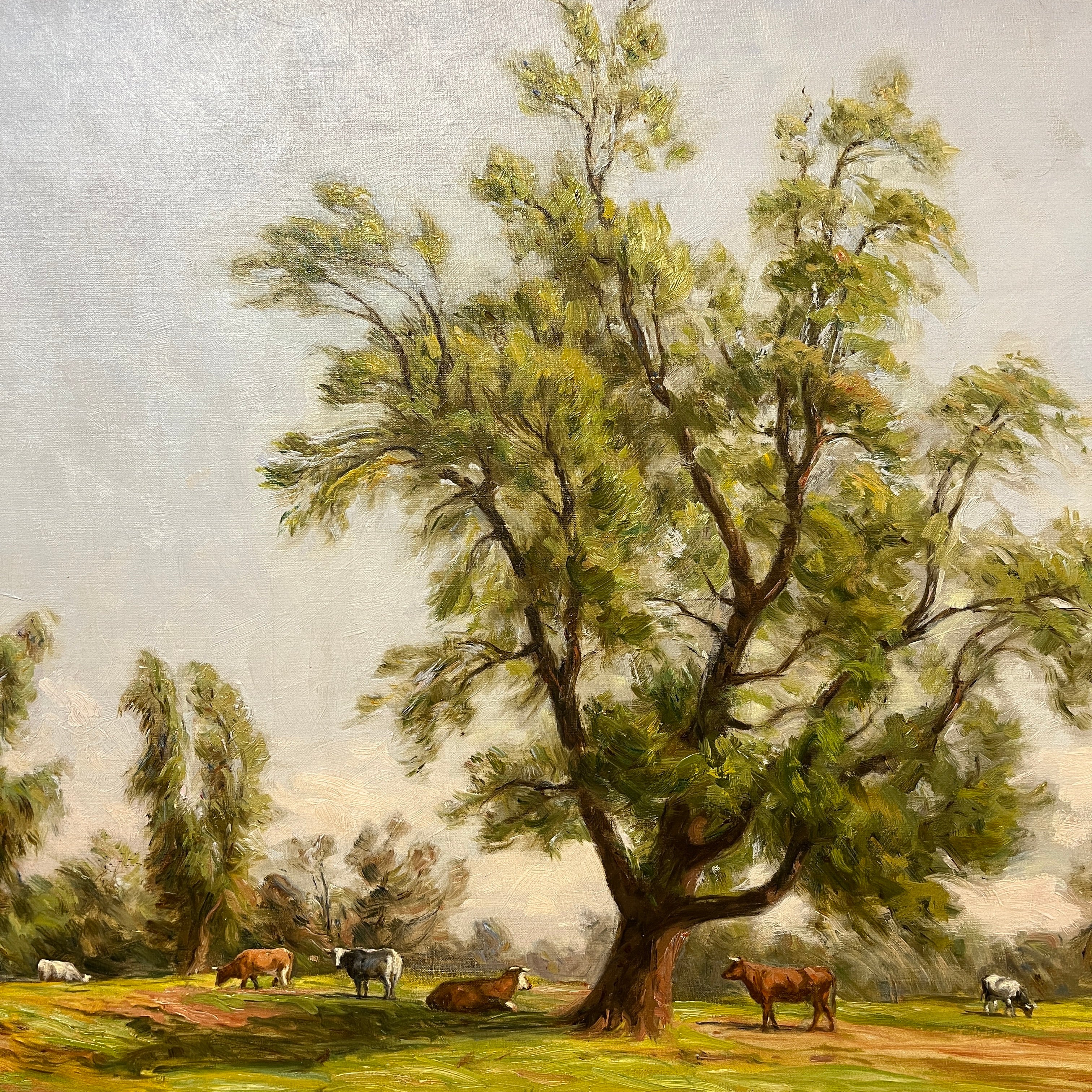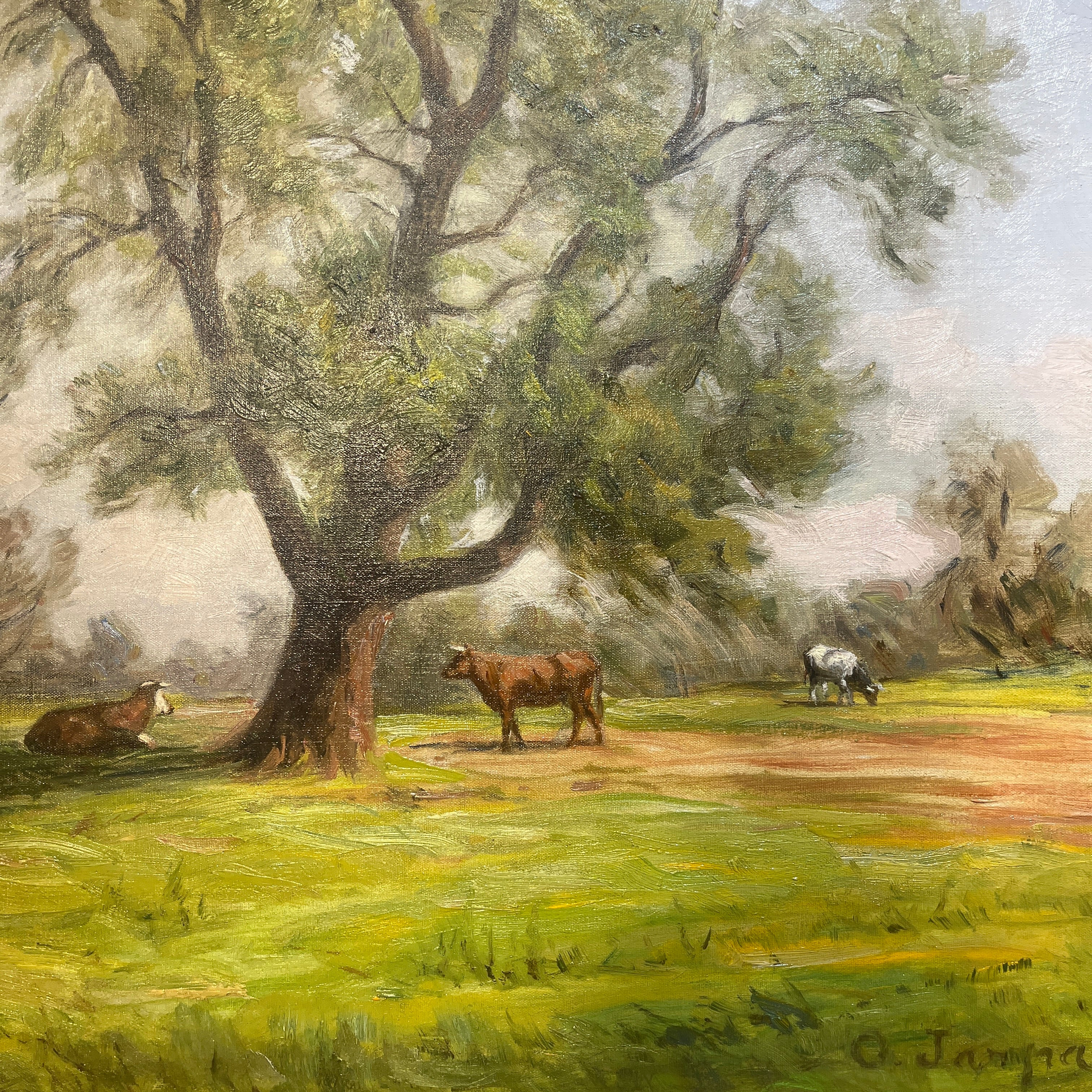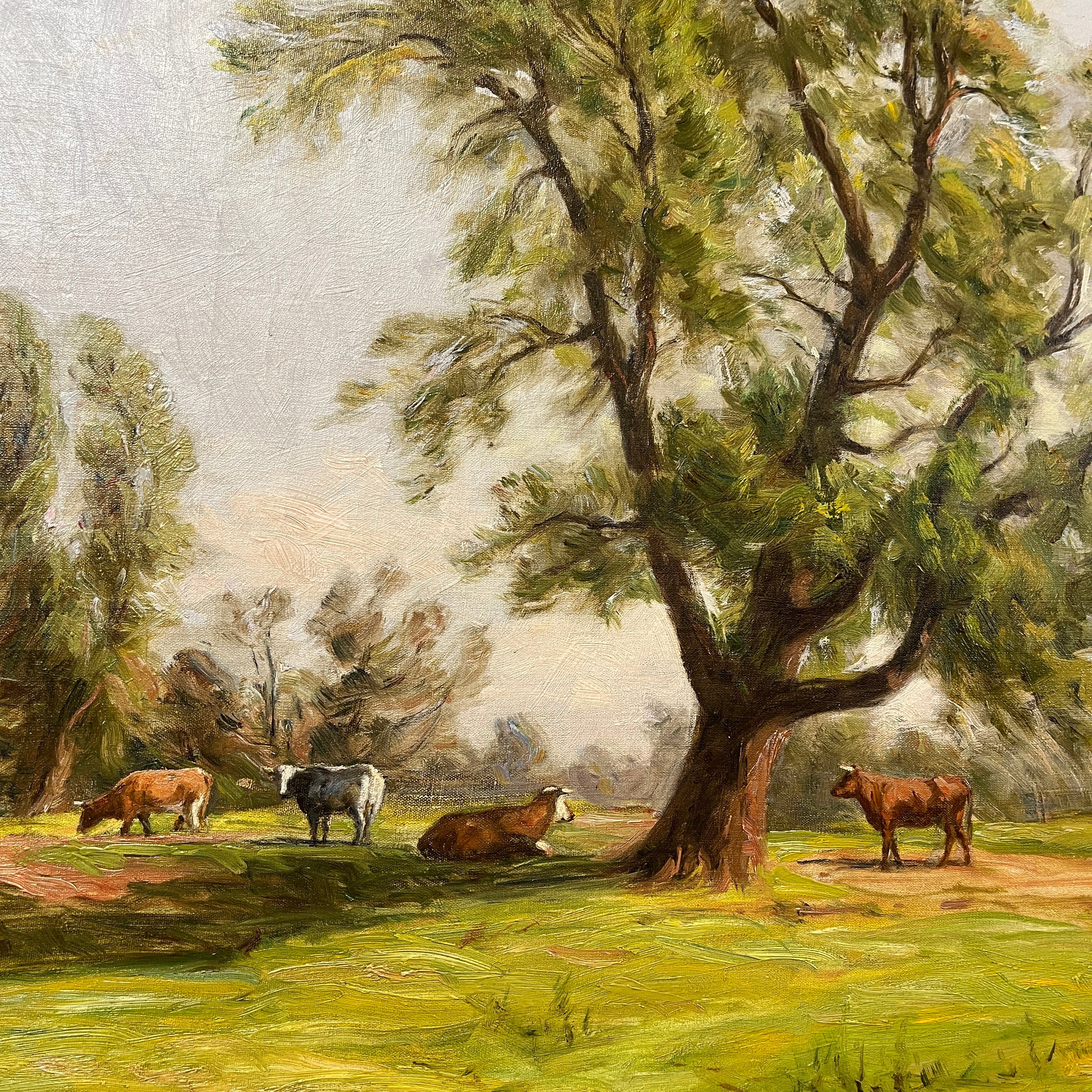 Sublime óleo sobre tela del talentoso pintor chileno Onofre Jarpa, que retrata una clásica imagen del sur de Chile. El cuadro de gran tamaño se puede ver a distancia un verde prado con vacas pastando y descansando bajo la sombra de un gran árbol. Si uno presta atención al trabajo que hay en esta pintura, se va encontrando con más y más detalles con la intención de plasmar en la tela una escena viva. La pintura es de una belleza única; un cielo celeste claro despejado con pequeñas pinceladas de sinuosas nubes, los desniveles del terreno y la preocupación por incluso dejar zonas más terrosas y otras donde abunda el pasto. Este es un cuadro donde Onofre Jarpa muestra porqué es uno de los pintores chilenos más destacados.