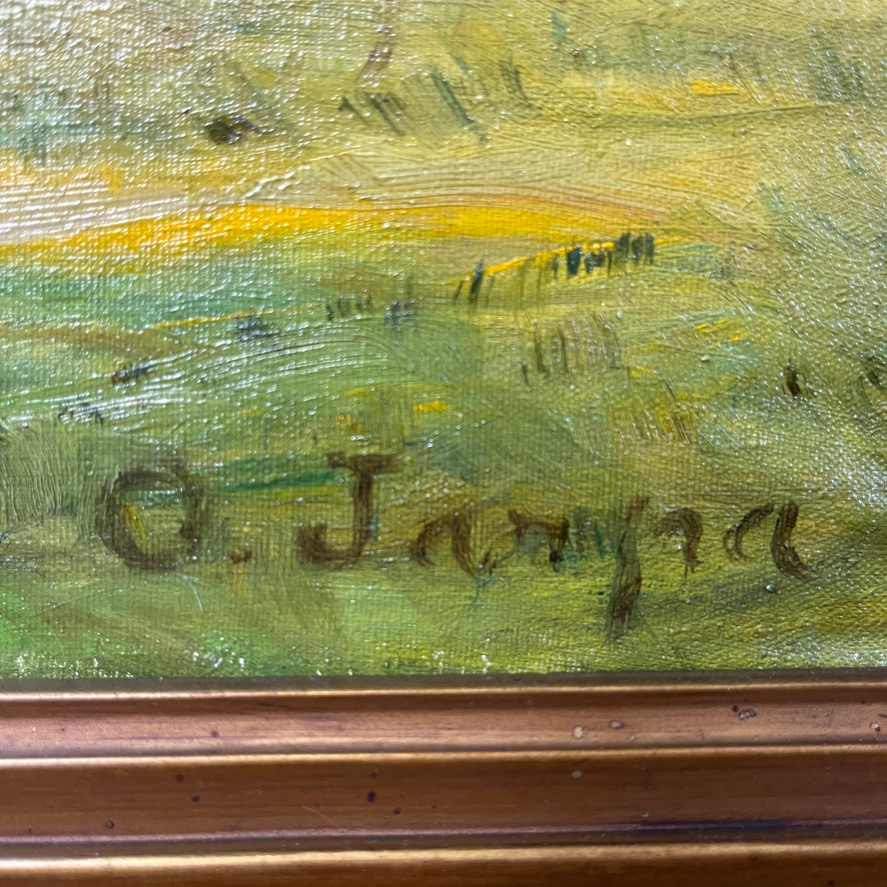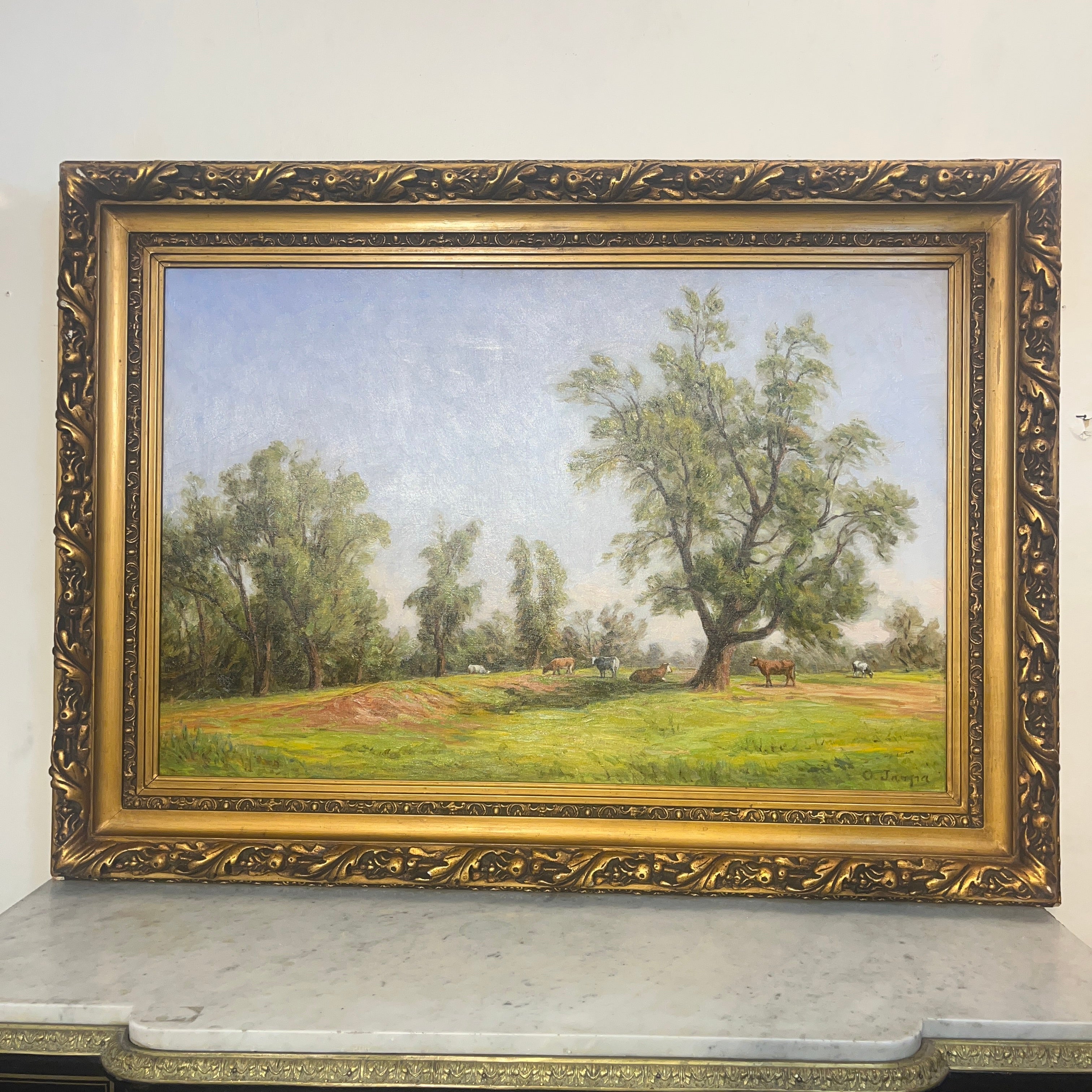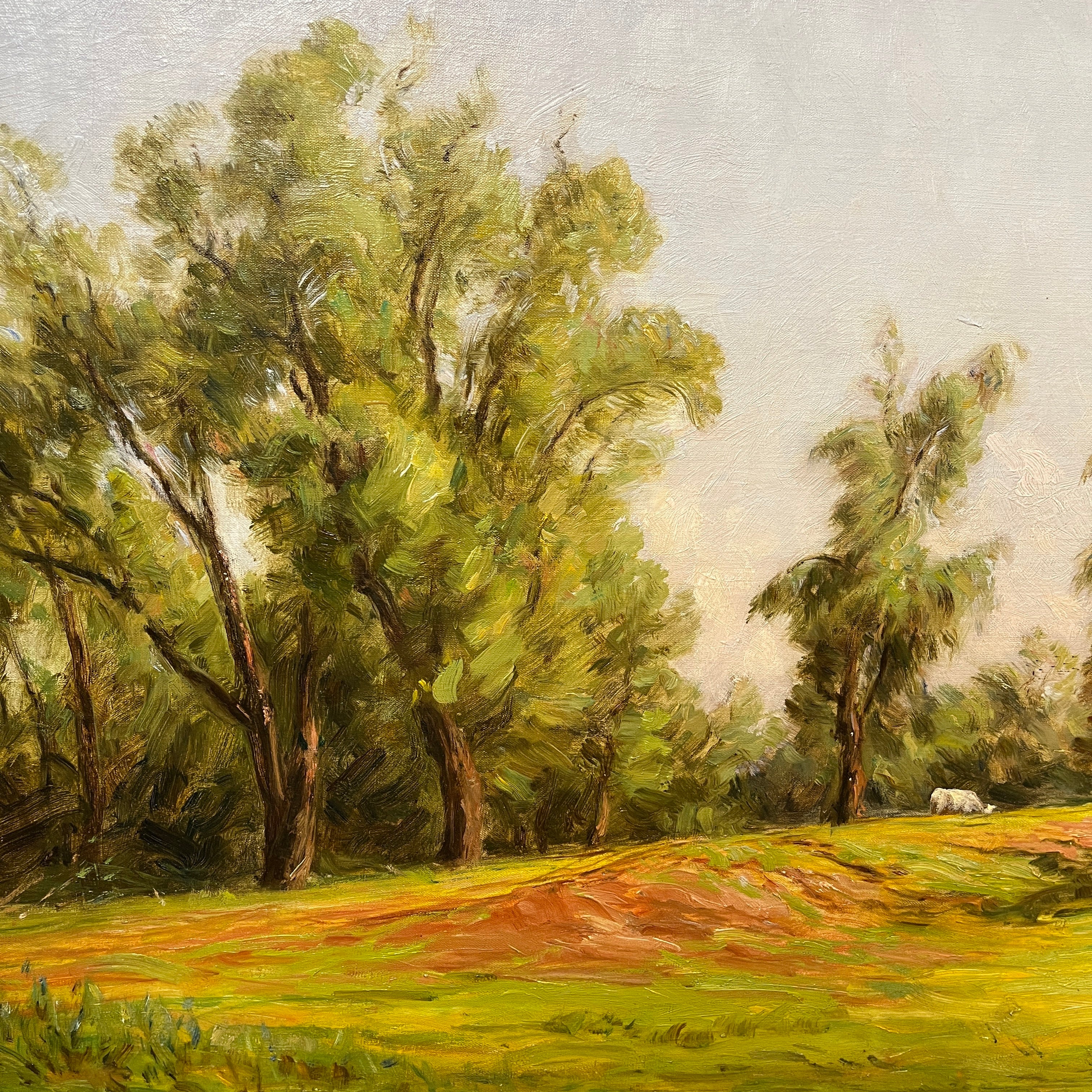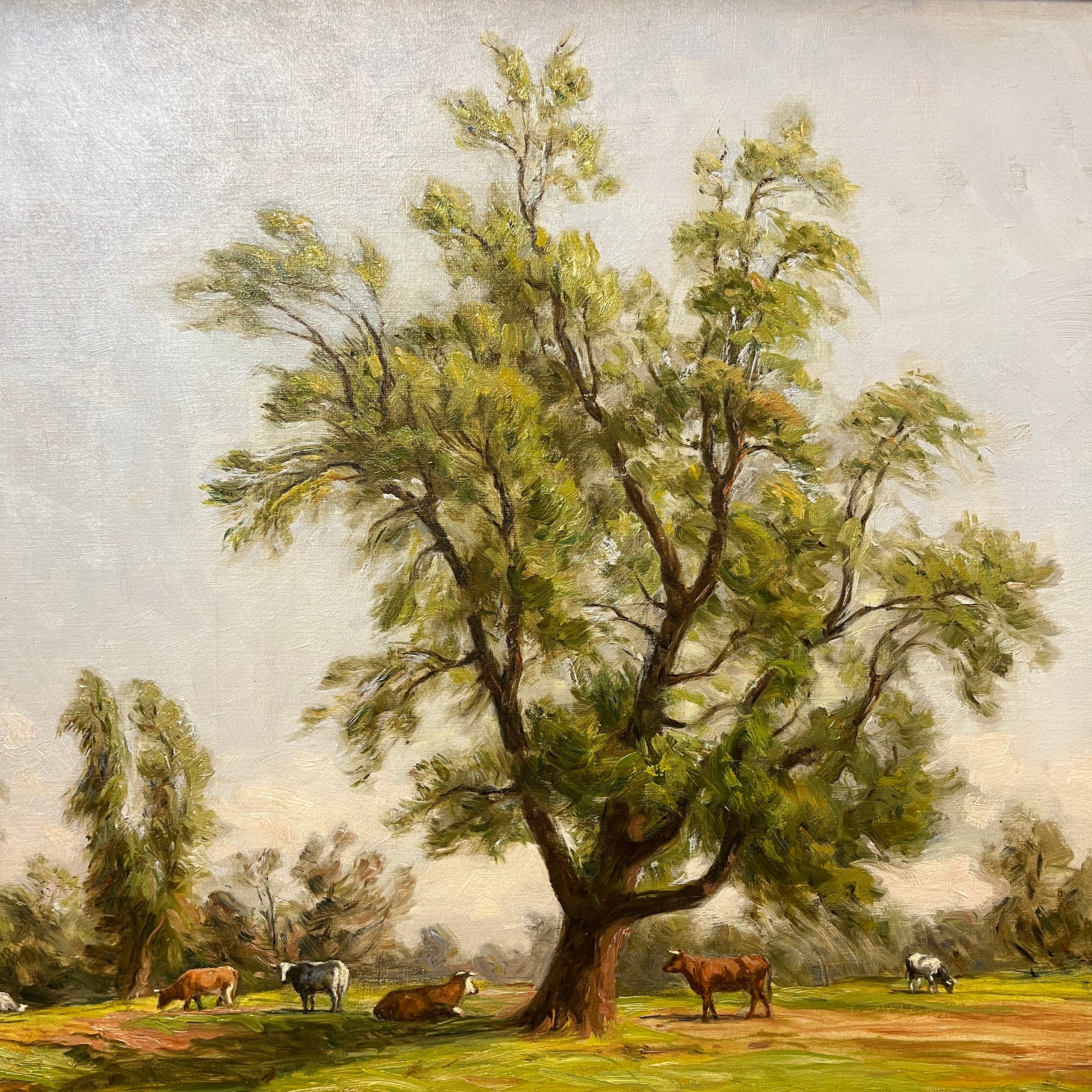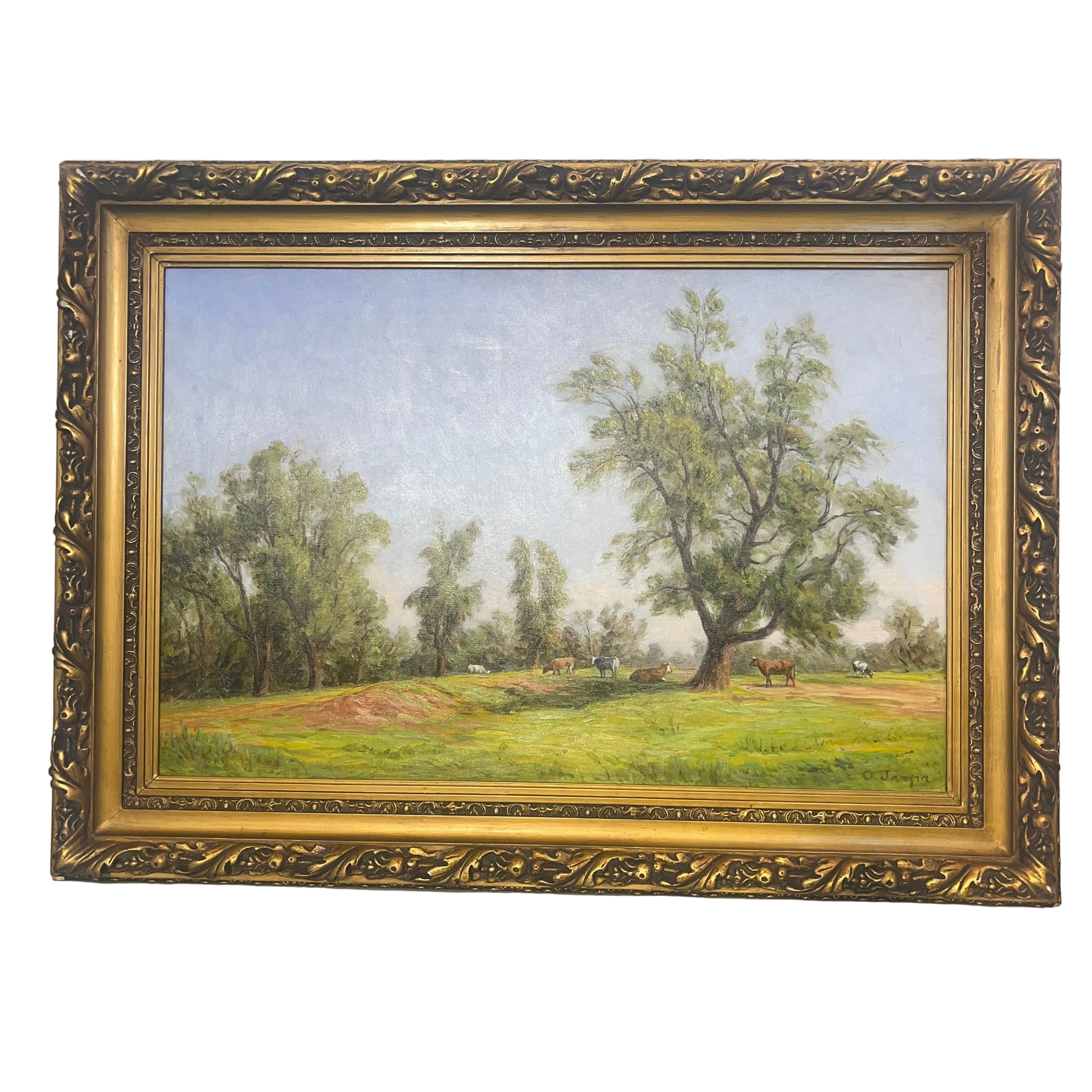 Sublime óleo sobre tela del talentoso pintor chileno Onofre Jarpa, que retrata una clásica imagen del sur de Chile. El cuadro de gran tamaño se puede ver a distancia un verde prado con vacas pastando y descansando bajo la sombra de un gran árbol. Si uno presta atención al trabajo que hay en esta pintura, se va encontrando con más y más detalles con la intención de plasmar en la tela una escena viva. La pintura es de una belleza única; un cielo celeste claro despejado con pequeñas pinceladas de sinuosas nubes, los desniveles del terreno y la preocupación por incluso dejar zonas más terrosas y otras donde abunda el pasto. Este es un cuadro donde Onofre Jarpa muestra porqué es uno de los pintores chilenos más destacados.