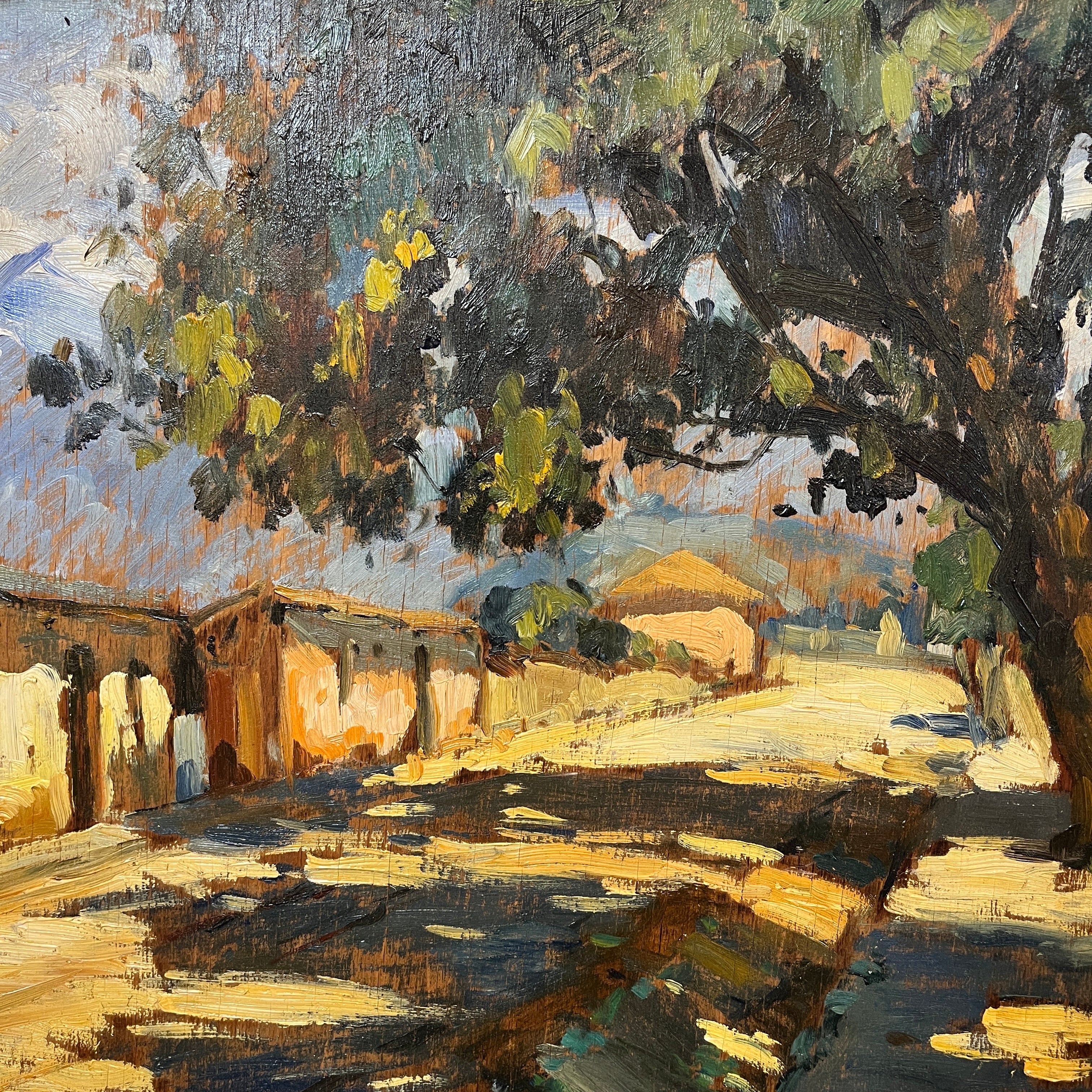 Particular óleo del destacado pintor chileno Pacheco Altamirano, que a través de sus pinceladas retrata una hermosa escena rural que se aleja de sus característicos mares del sur del país. Aquí nos encontramos con un luminoso paisaje rural, con un camino de tierra que es bordeado por bellas casas de adobe y un árbol de gran tamaño que y verde follaje que entrega una acogedora sombra en un día de Sol. La firma en la parte posterior del cuadro además nos dice 'Renca, 1949'.