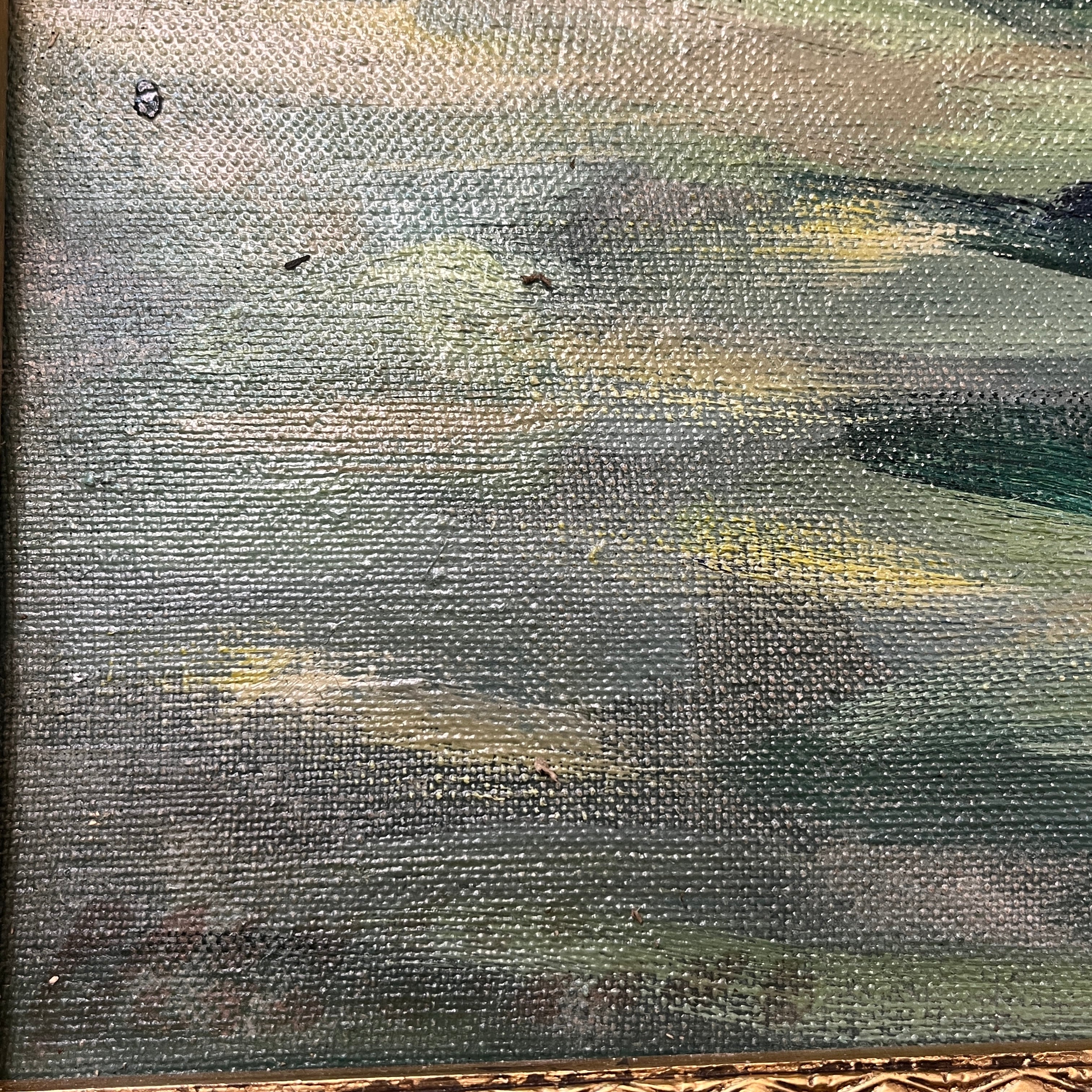 Hermoso óleo del artista chileno Pacheco Altamirano de un colorido muelle con sus respectivas embarcaciones detenidas y pescadores dentro de ellas trabajando.