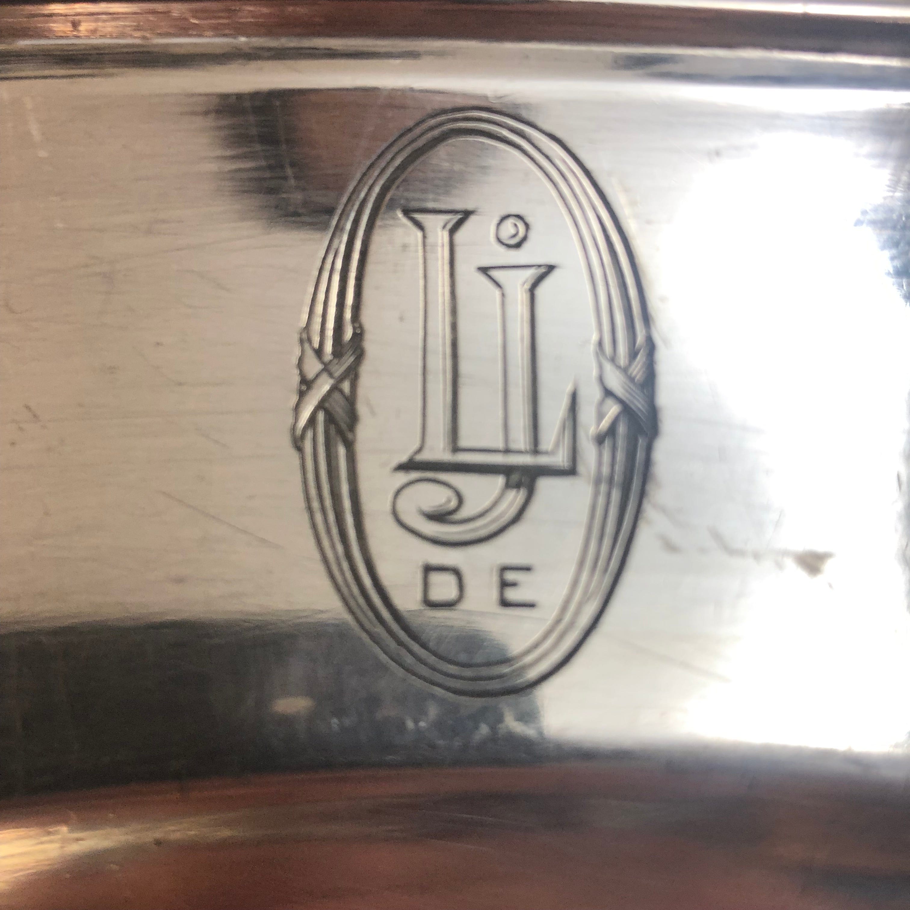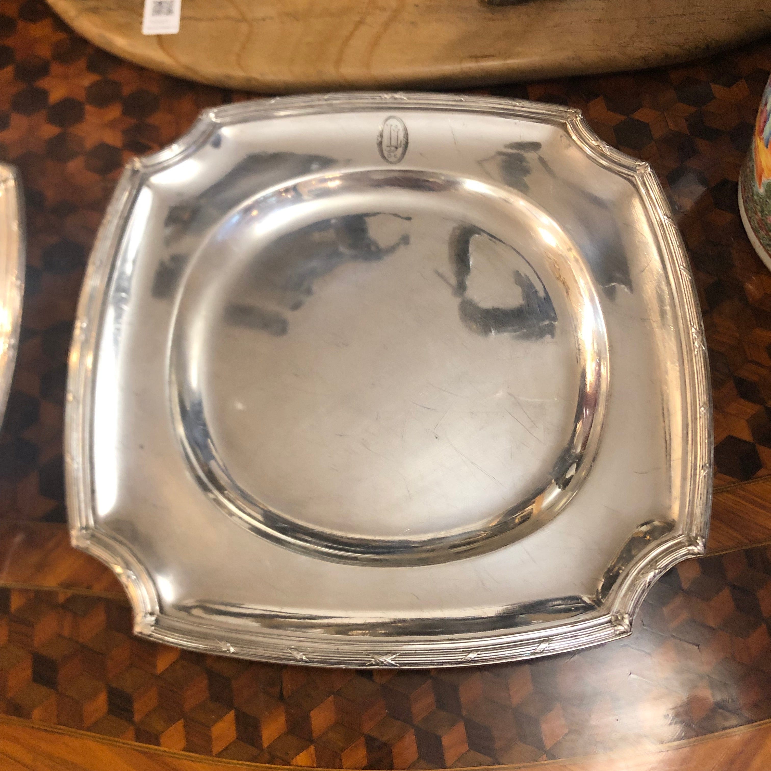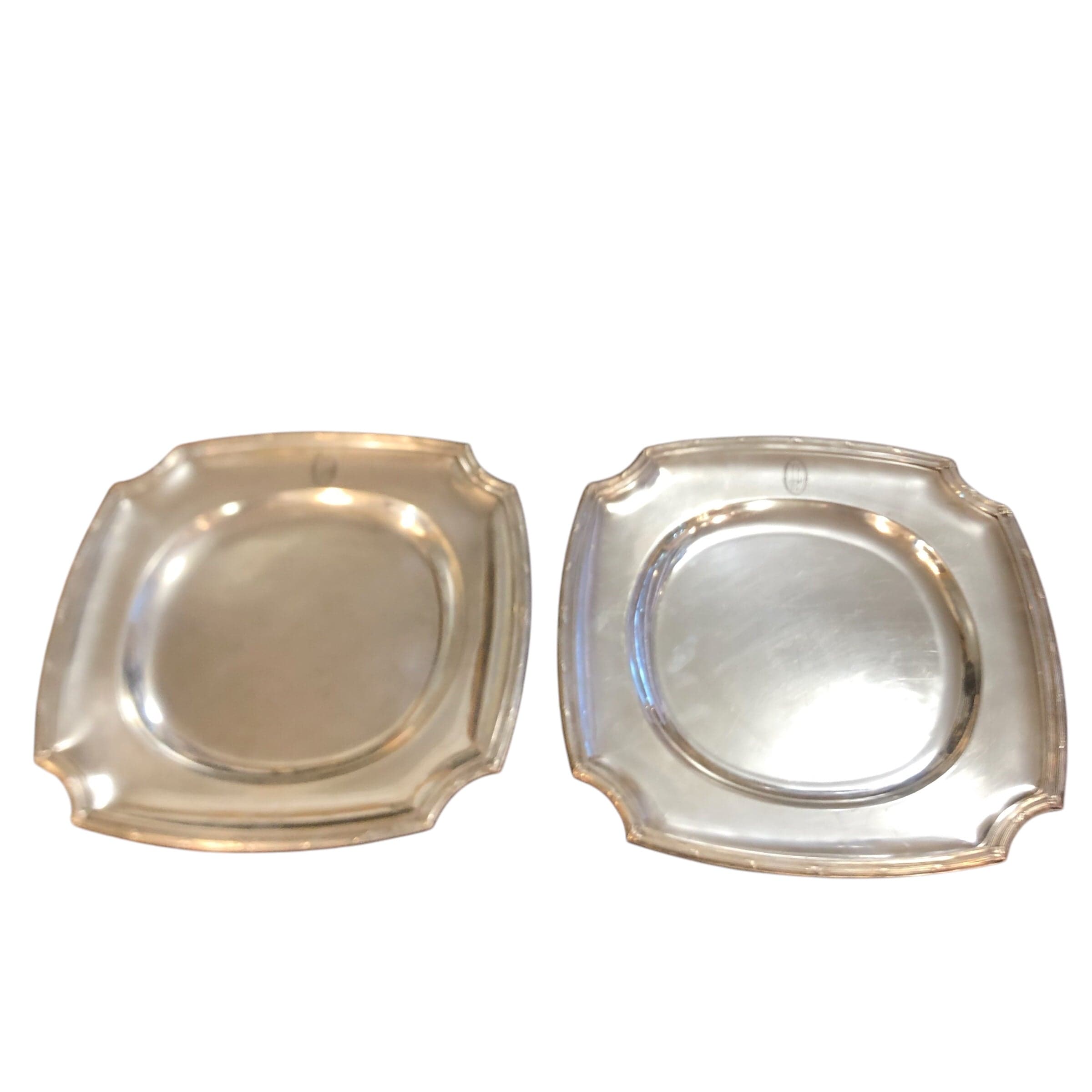 Par de Bandejas de la reconocida marca francesa Christofle, cada una con fino tallado en los bordes y las letras L y J en su diseño.