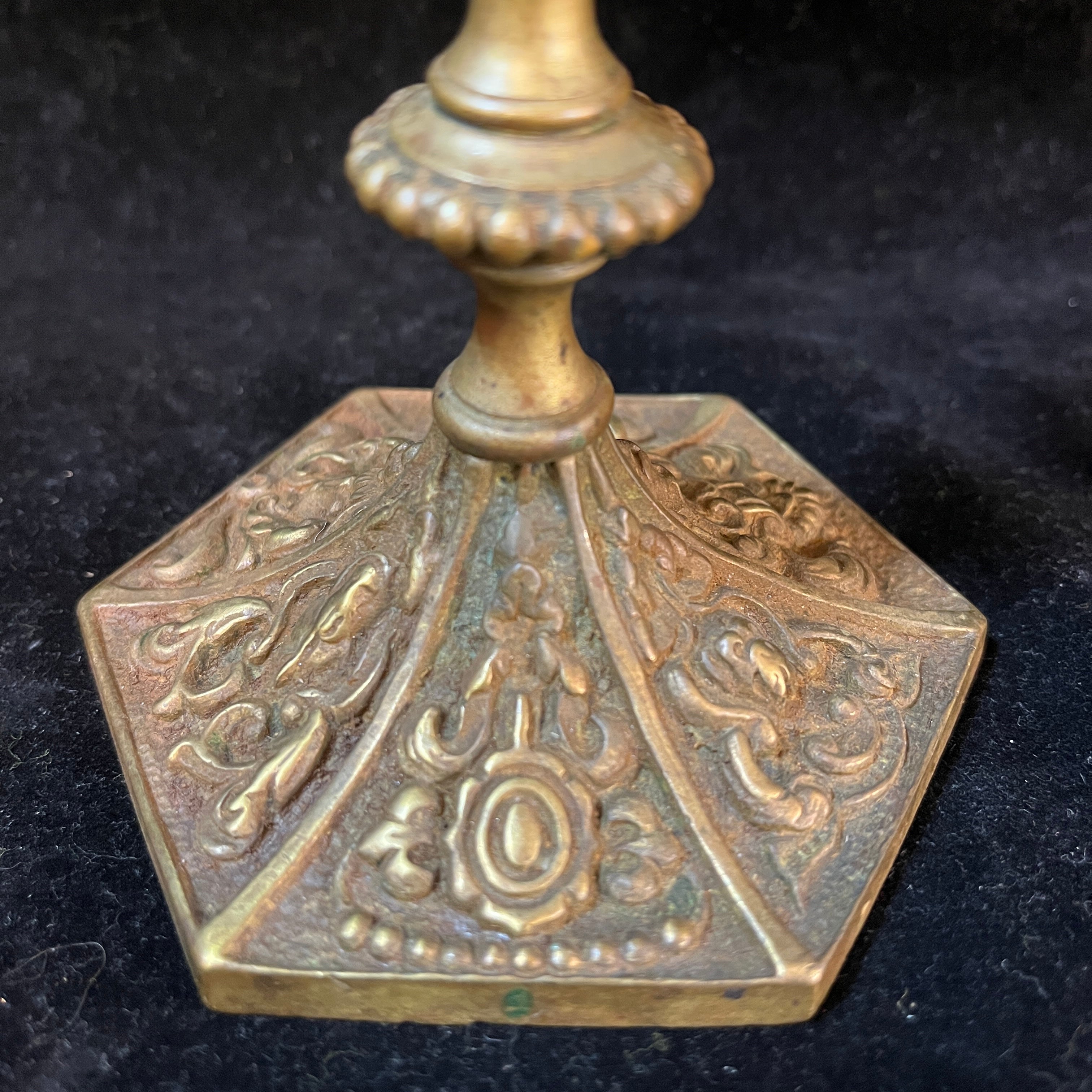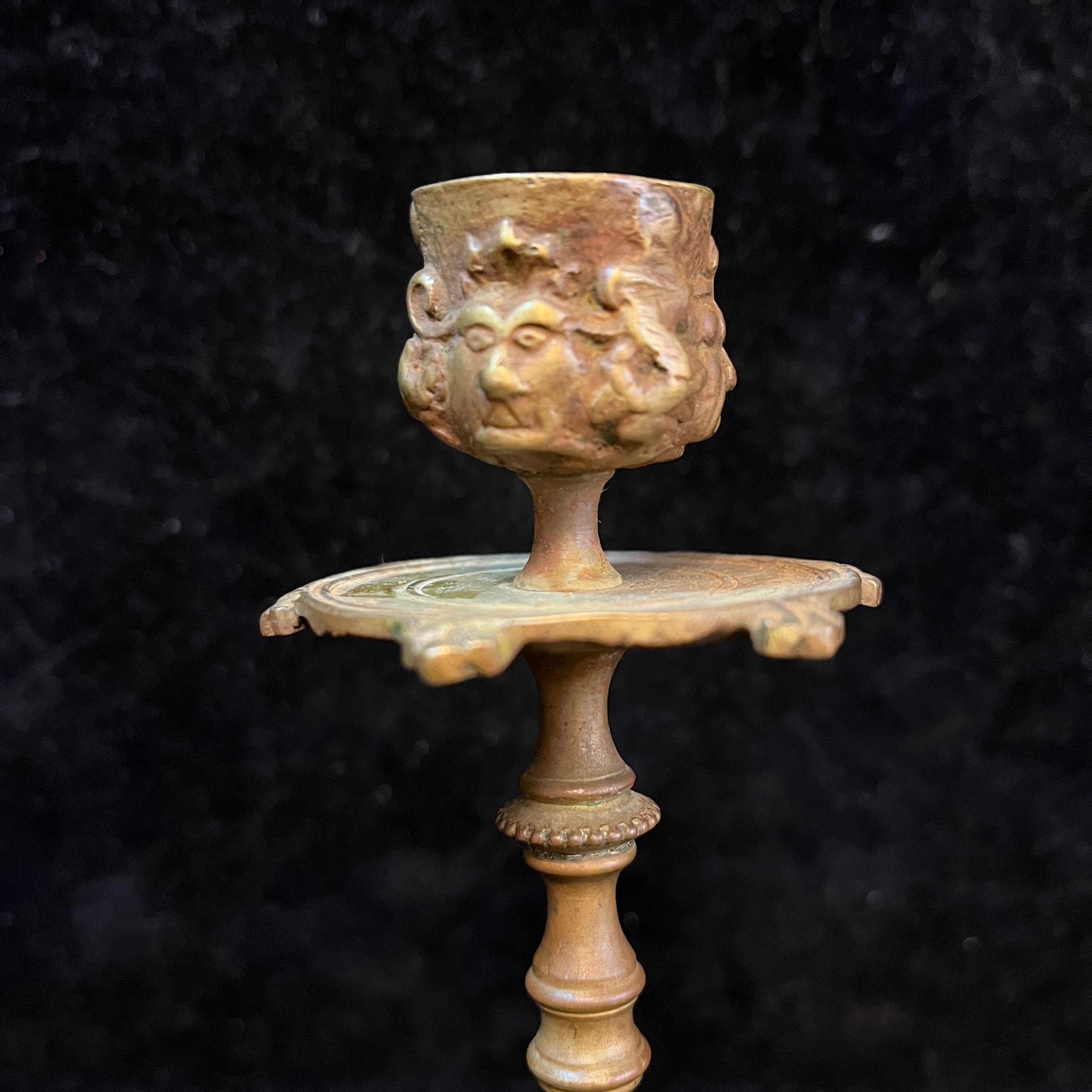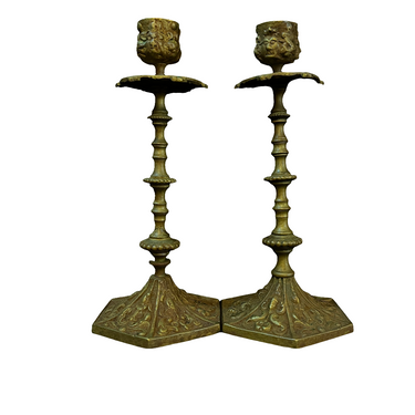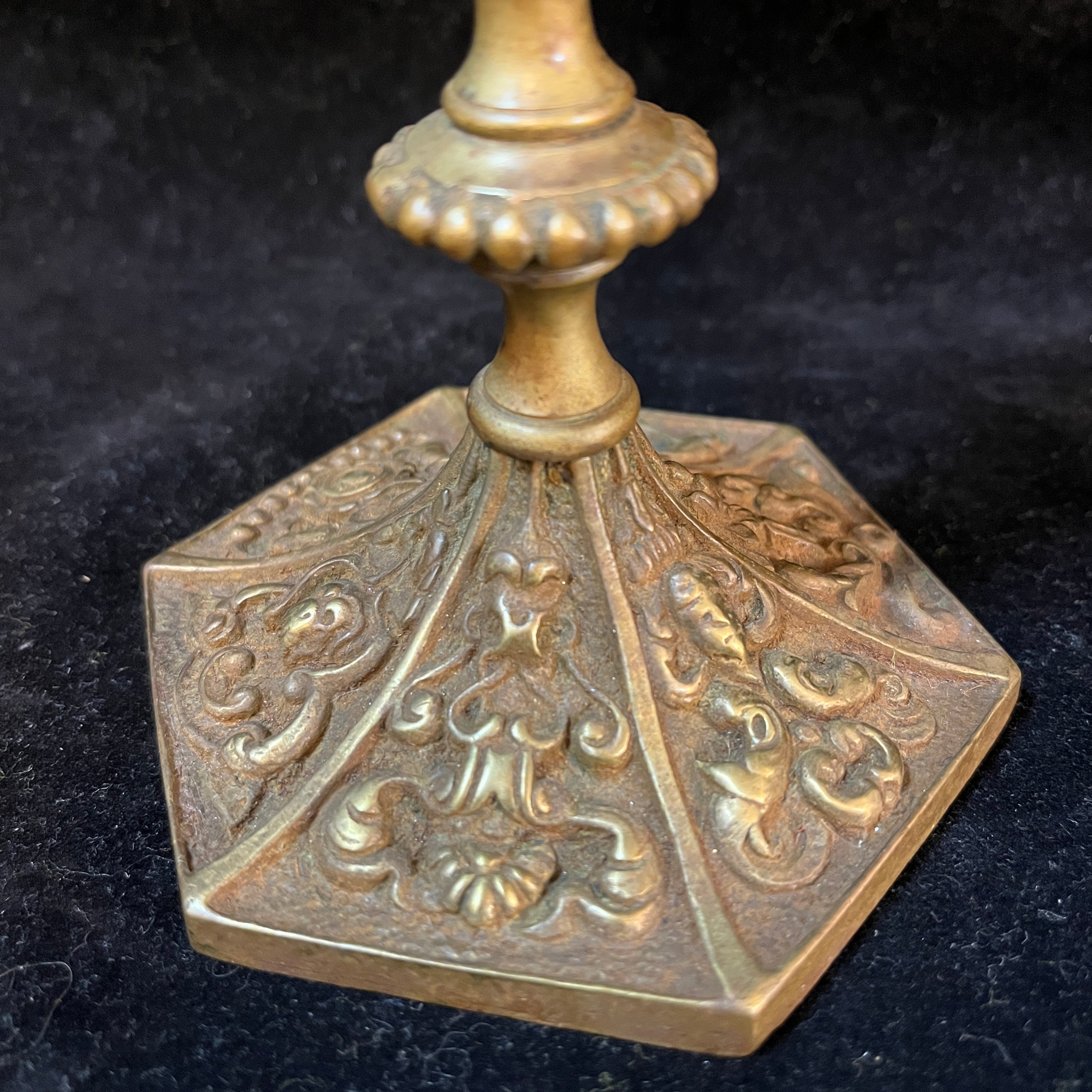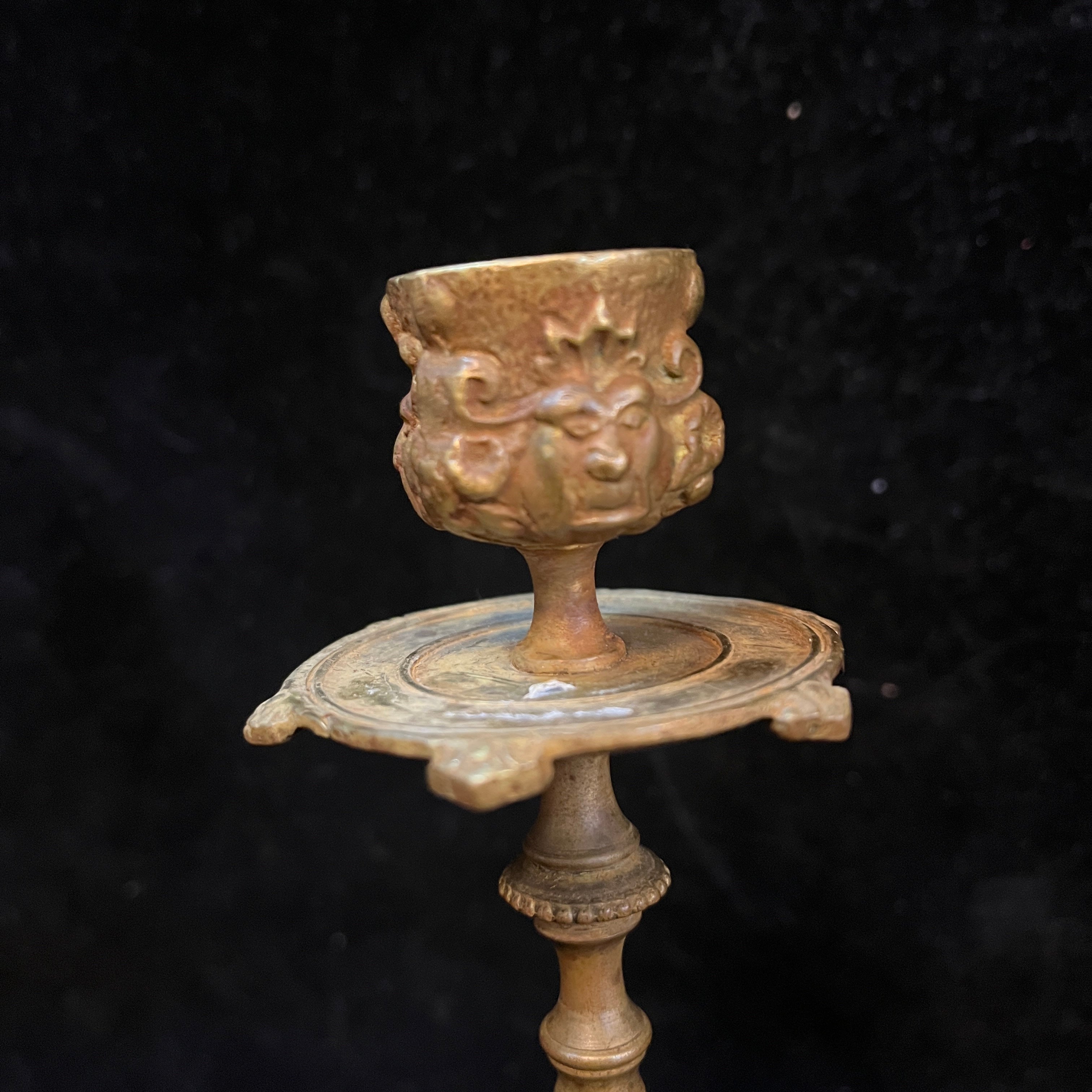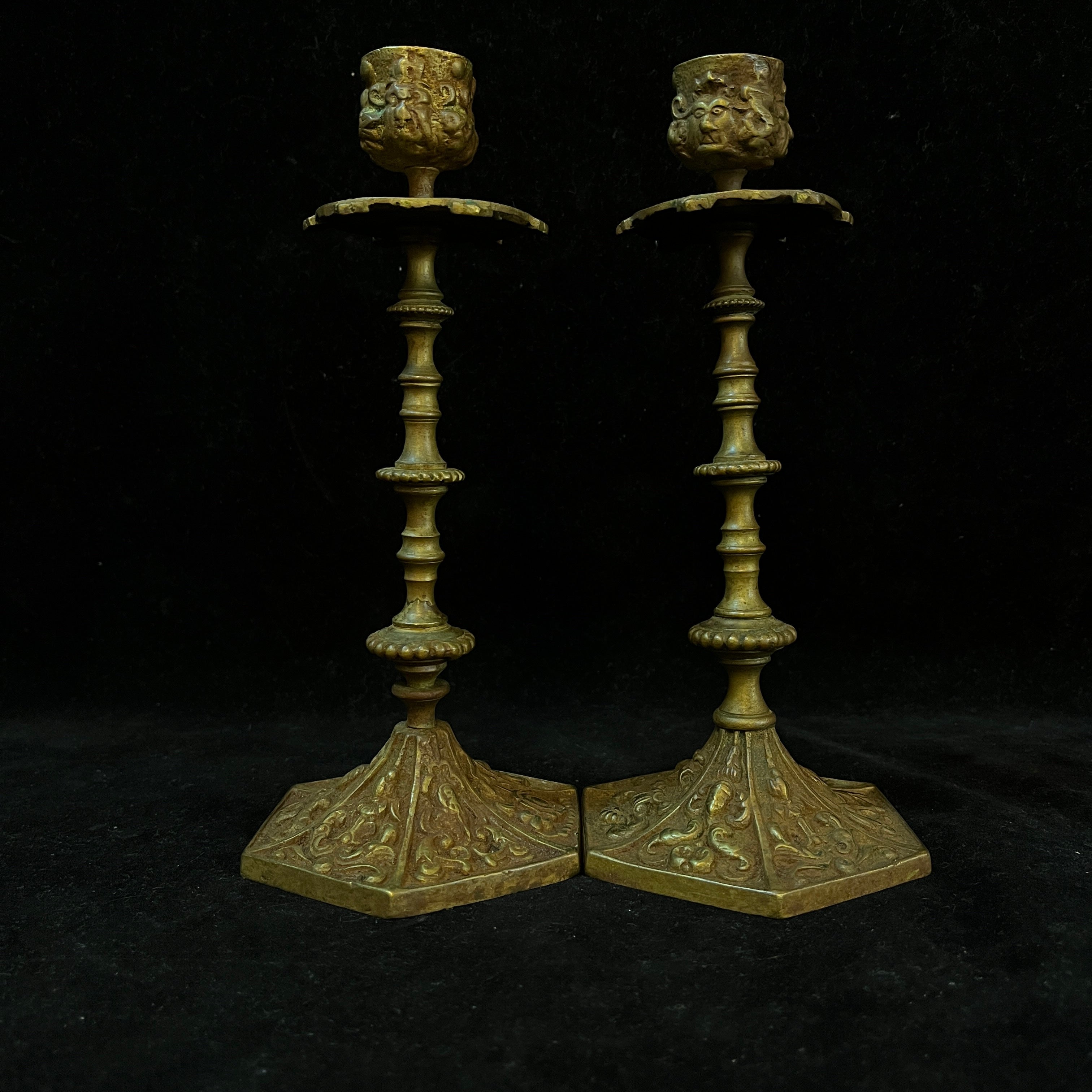 Bellos candelabros de bronce franceses en tonos dorados con rostros tallados en la parte superior y decoraciones florales en su base.