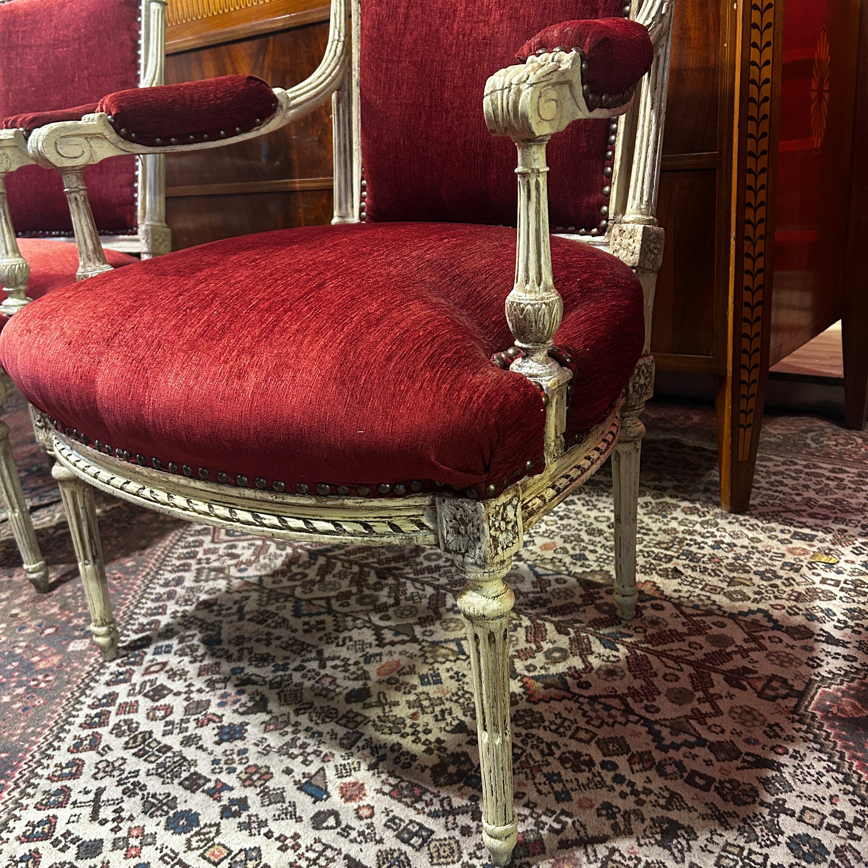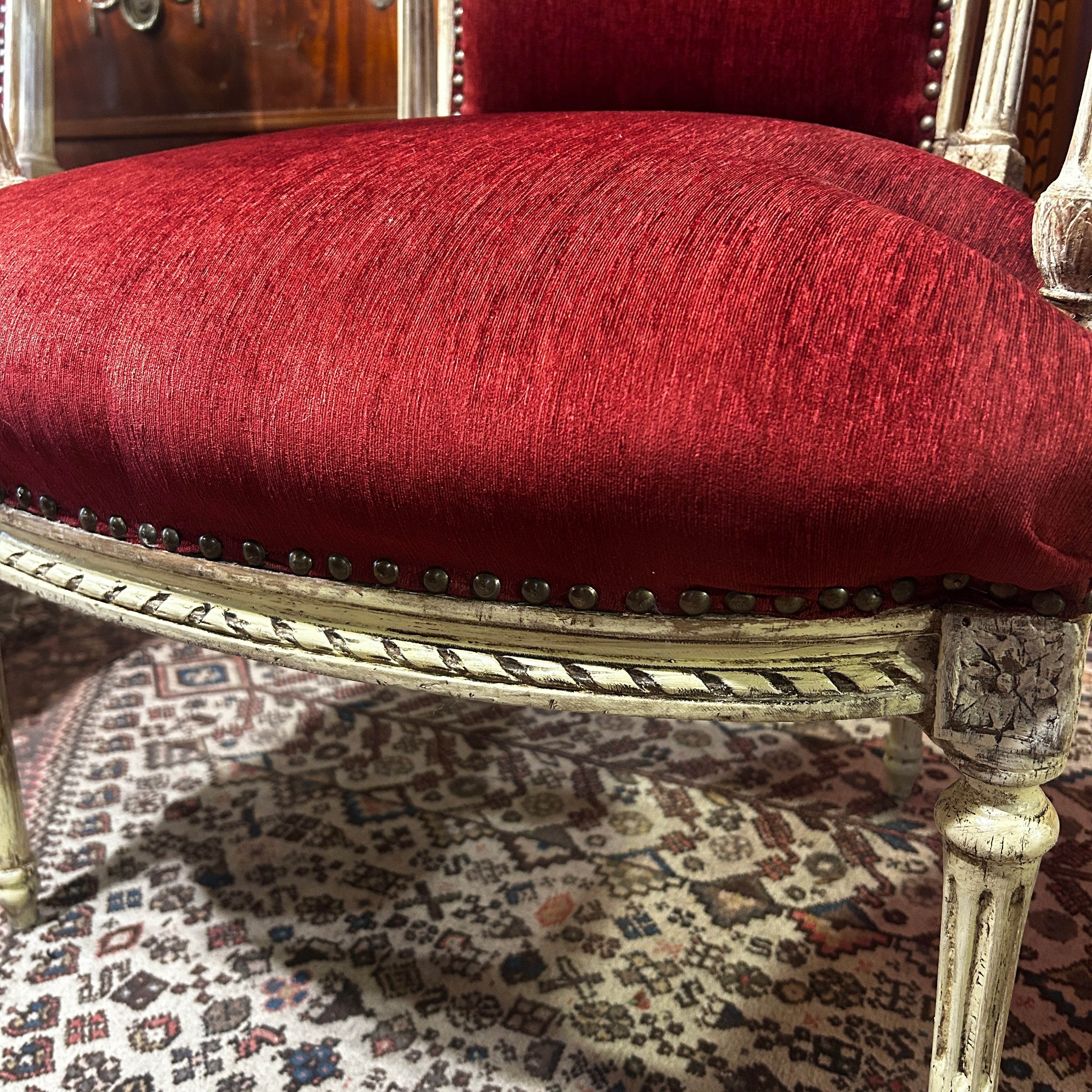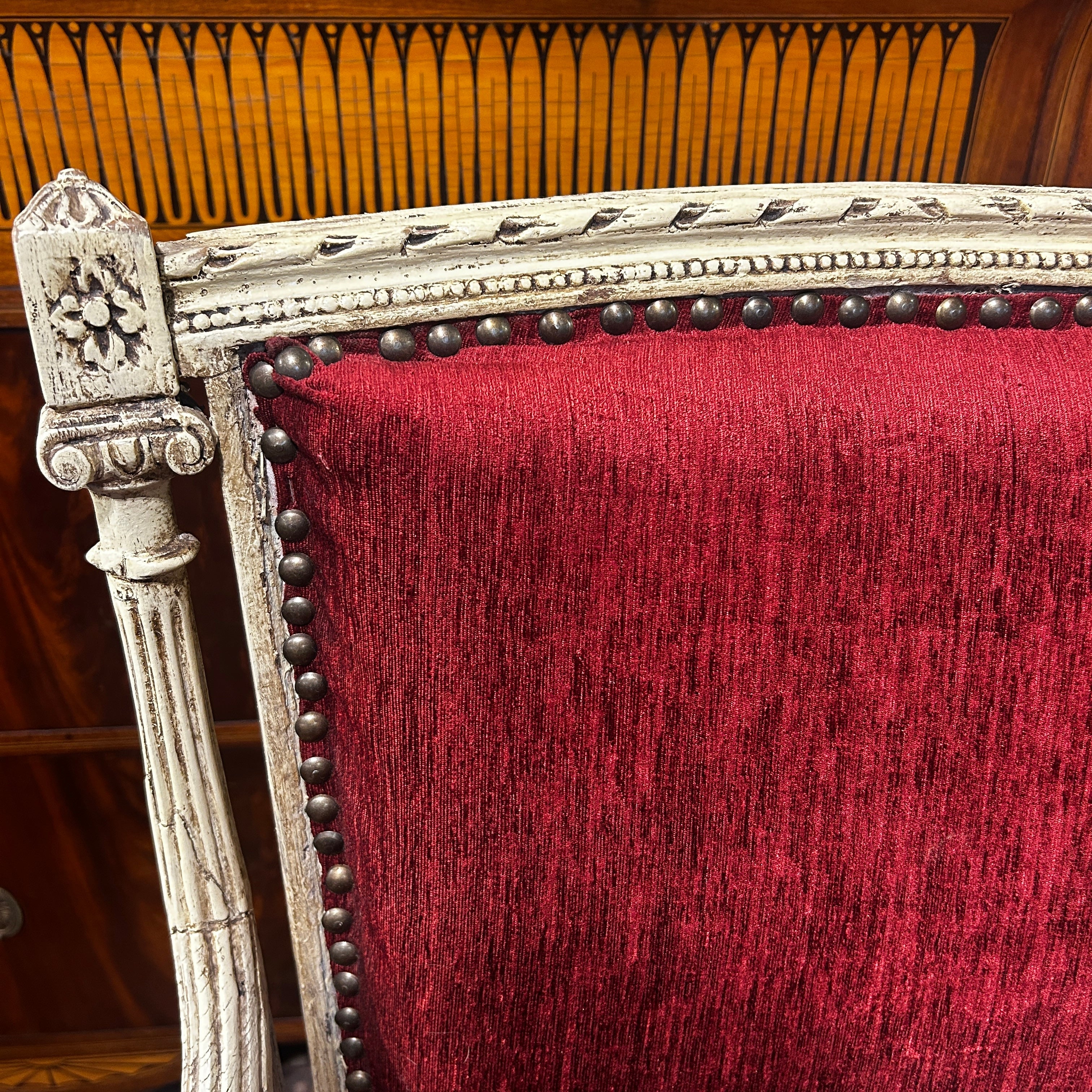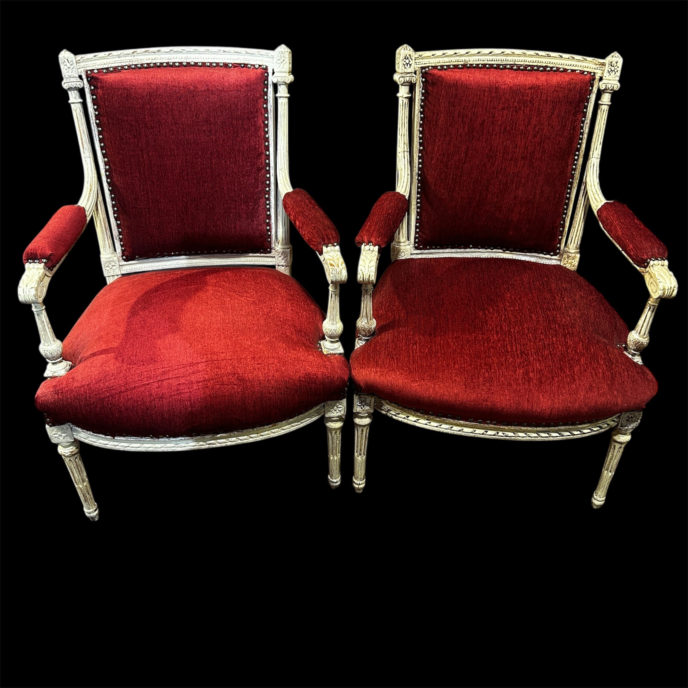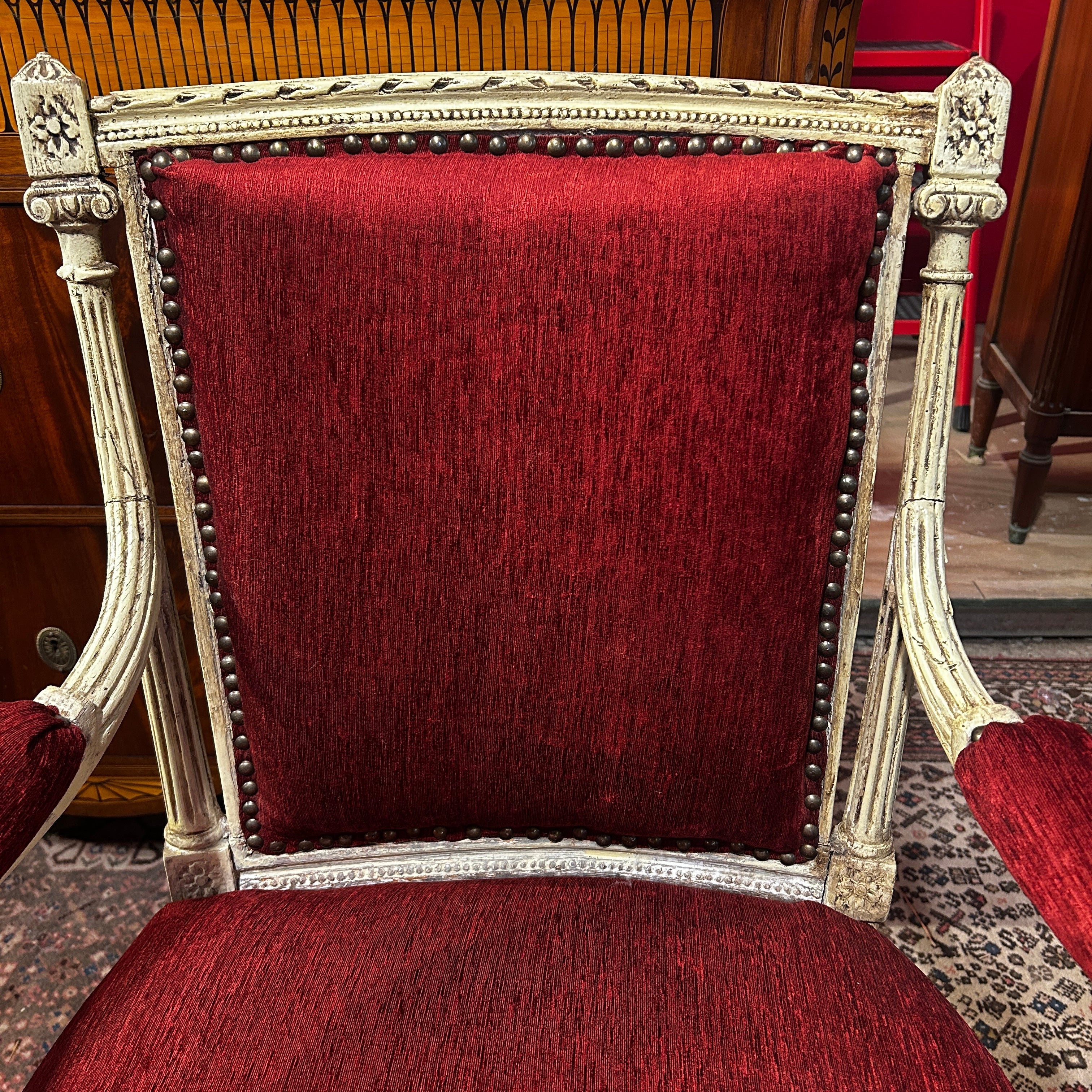 Par de sillones franceses legítimos 1920 de estilo Luis XVI. Este estilo se caracteriza por su diseño neoclásico, que incluye patas rectas, cónicas y acanaladas. Tiene bellos tallados florales, clavetones y un tapiz nuevo terracota. Su pátina ha sido retocada en tono marfil.