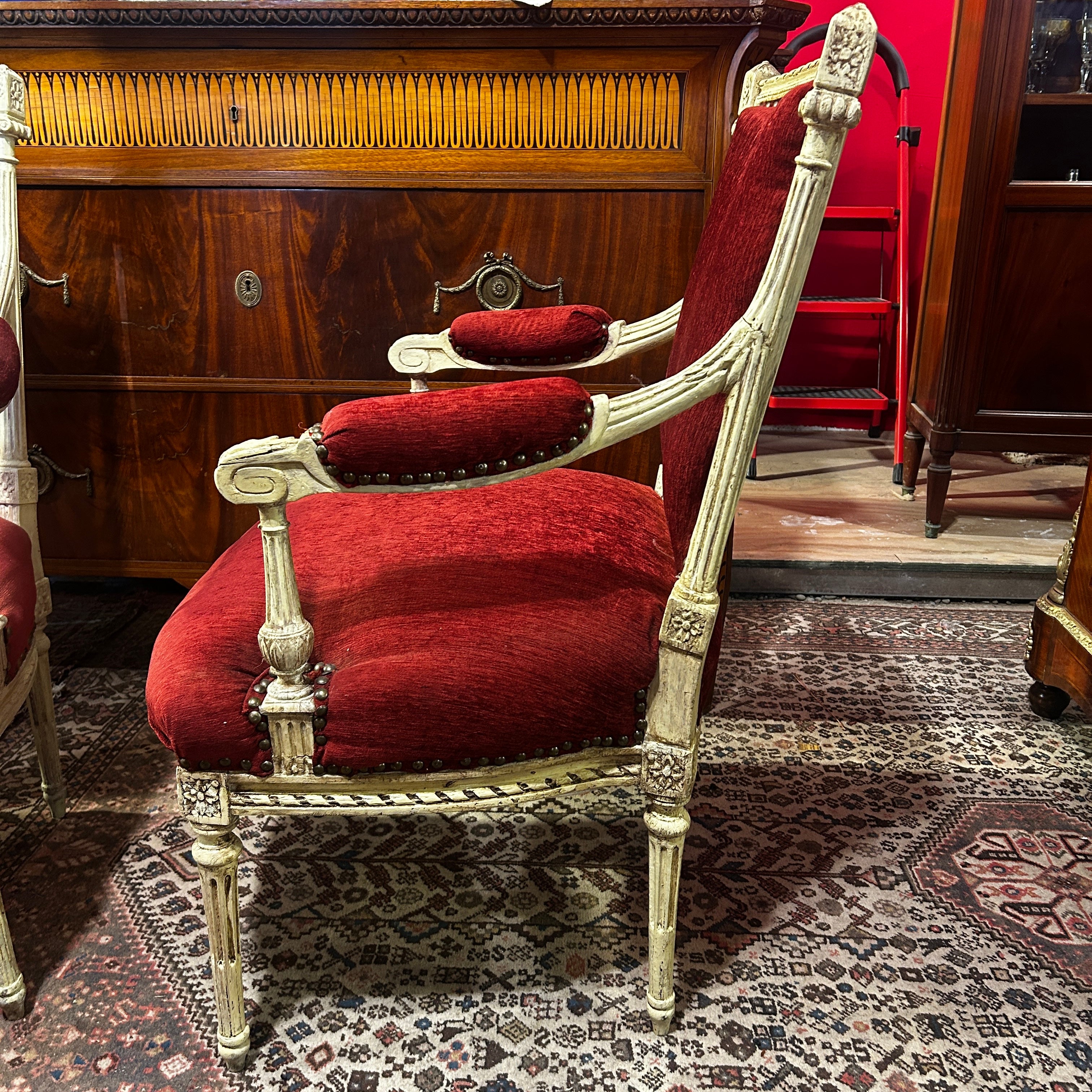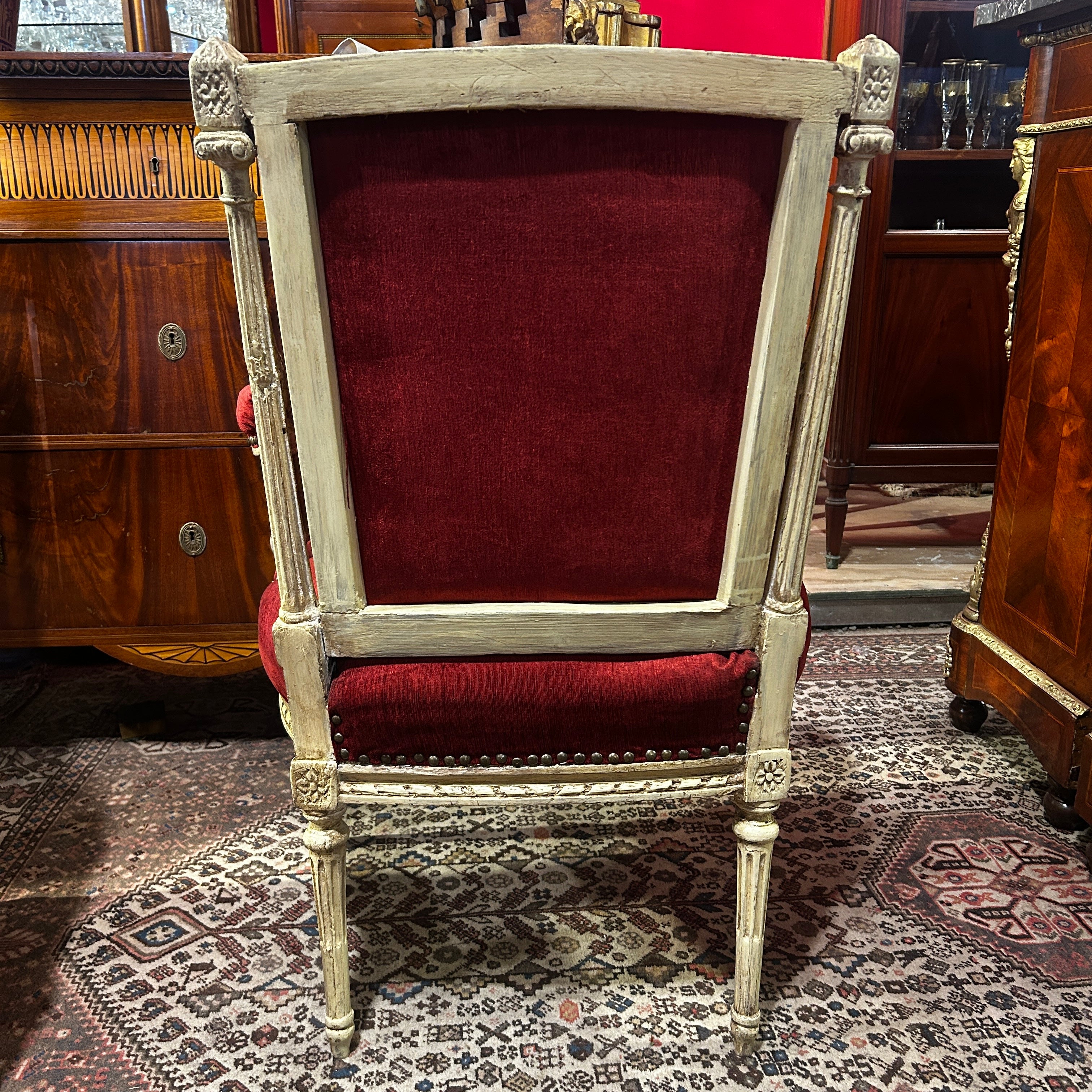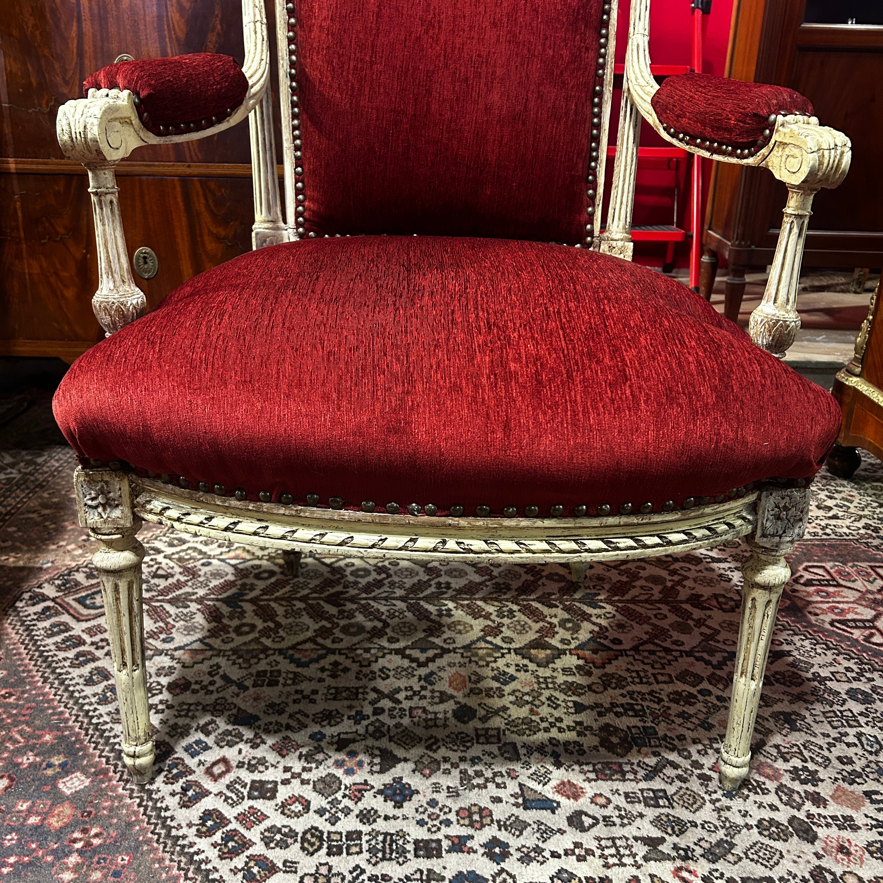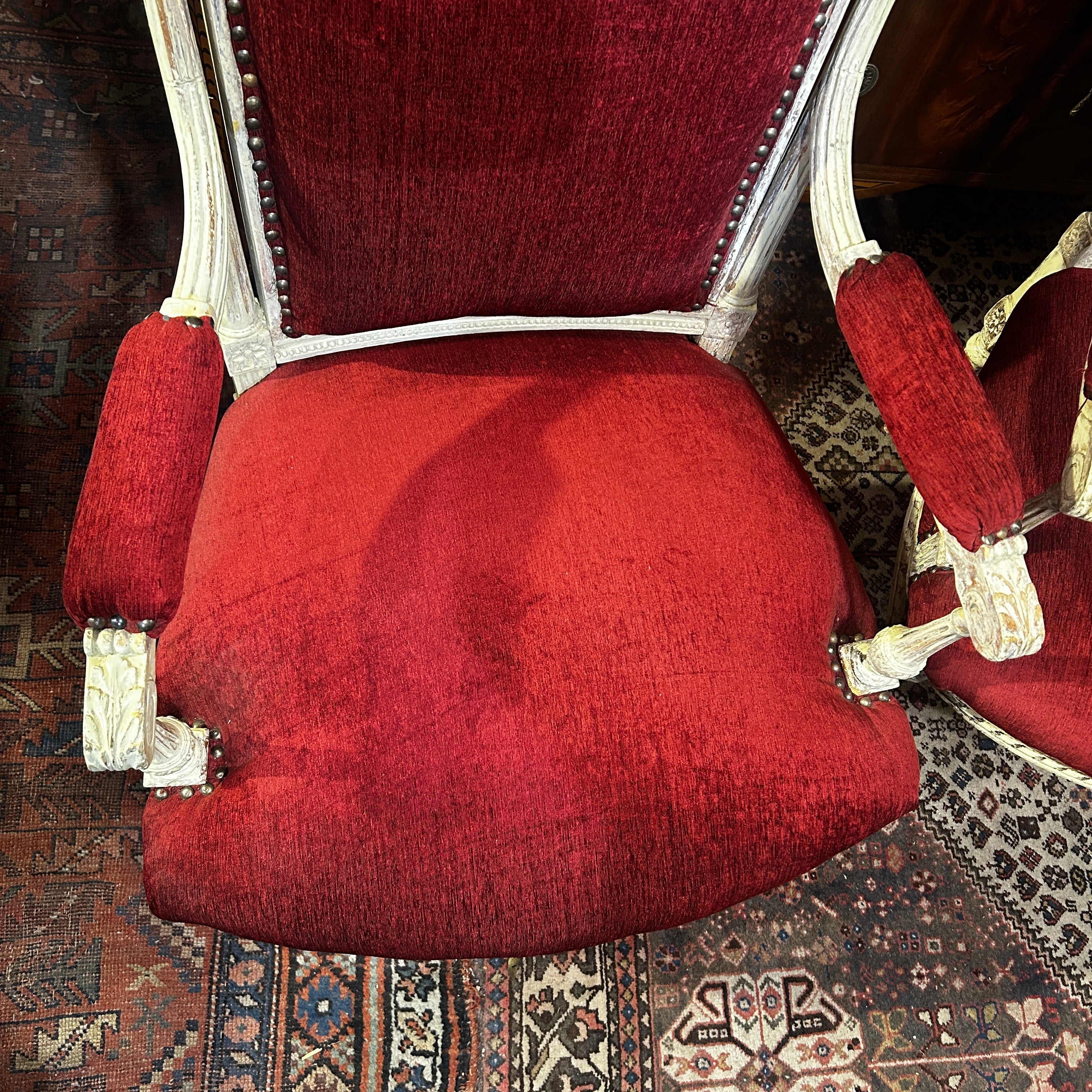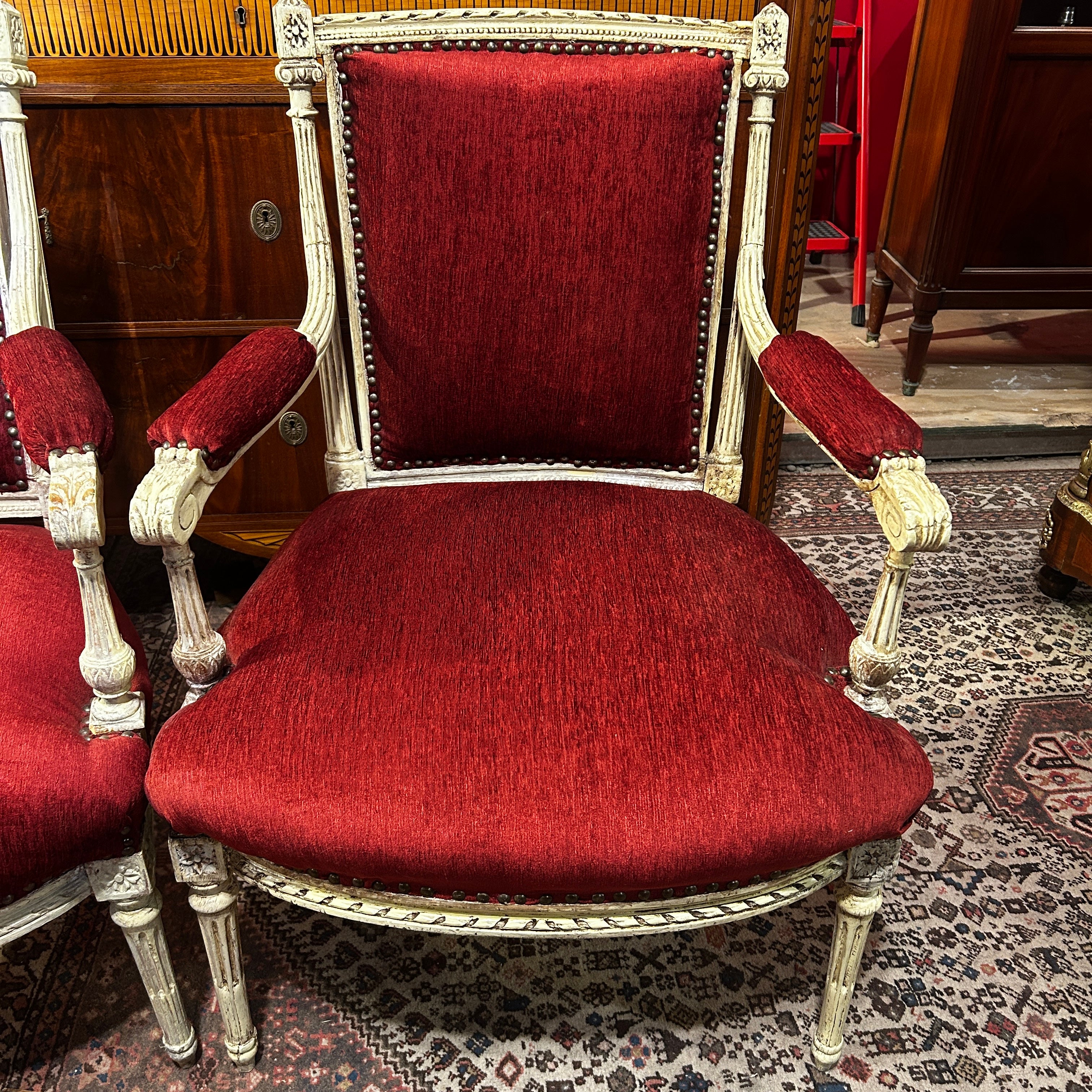 Par de sillones franceses legítimos 1920 de estilo Luis XVI. Este estilo se caracteriza por su diseño neoclásico, que incluye patas rectas, cónicas y acanaladas. Tiene bellos tallados florales, clavetones y un tapiz nuevo terracota. Su pátina ha sido retocada en tono marfil.