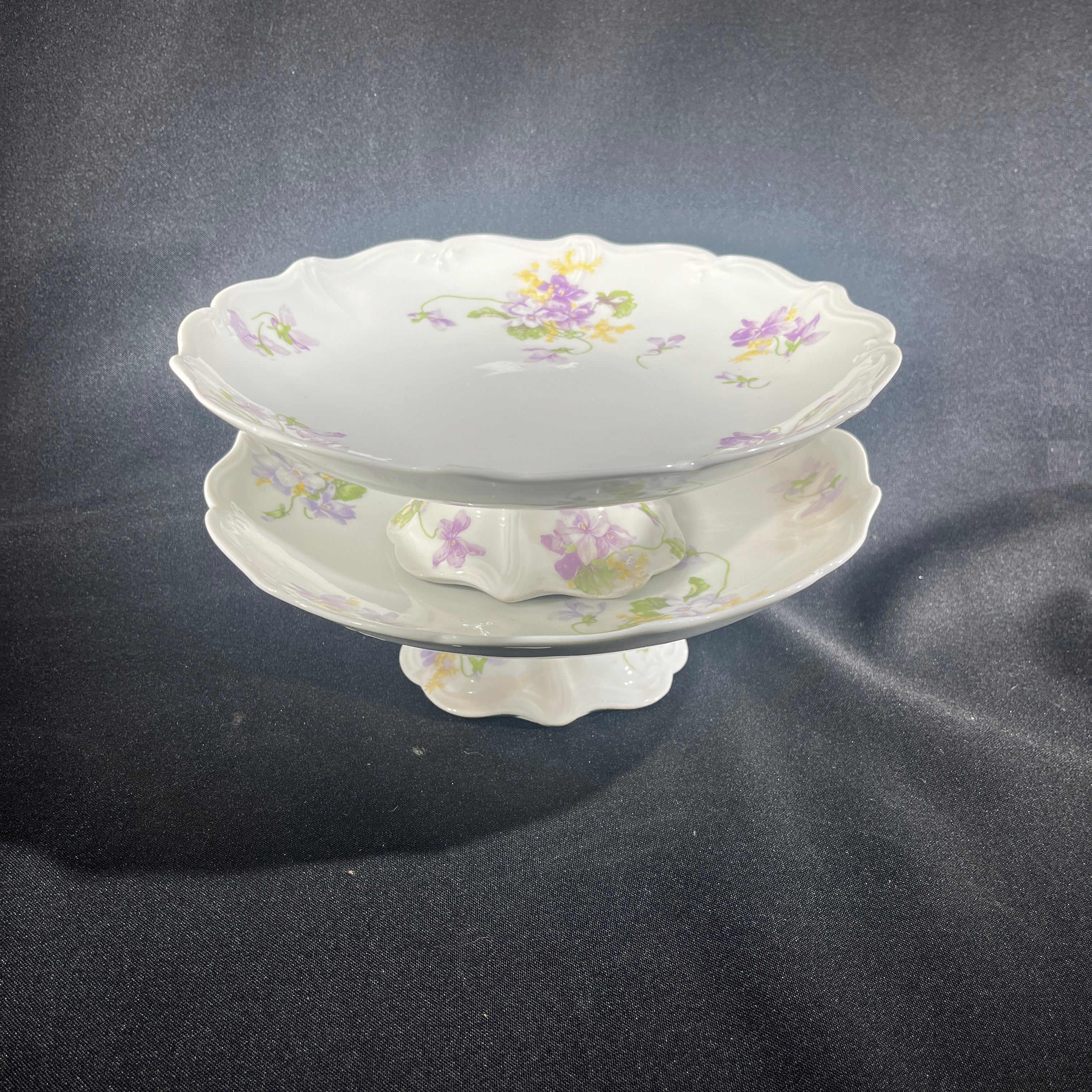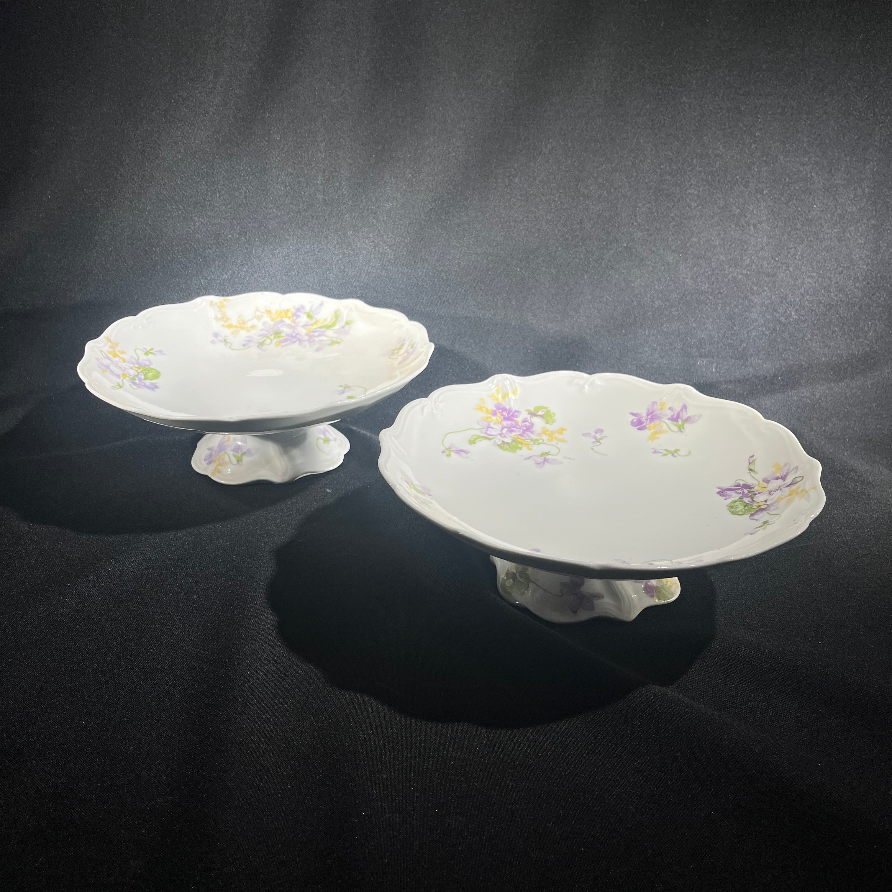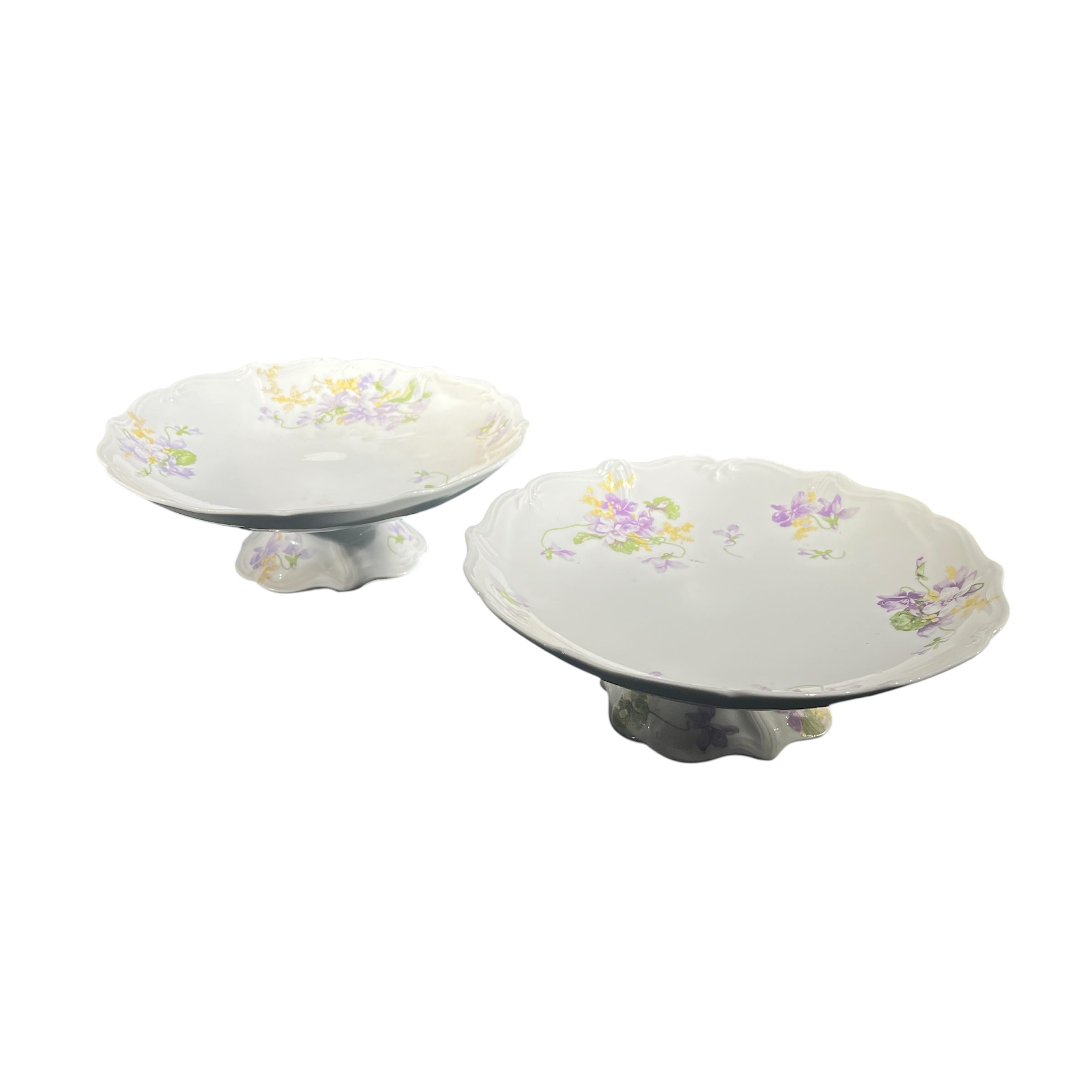 Bellísima pareja de torteros de porcelana de origen francés de la prestigiosa marca Limoges, fabricados por E. Bourgeois. Las piezas tienen un delicado diseño floral pintado a mano, en verde , amarillo y morado, además de un borde en curva tipo tulipán.