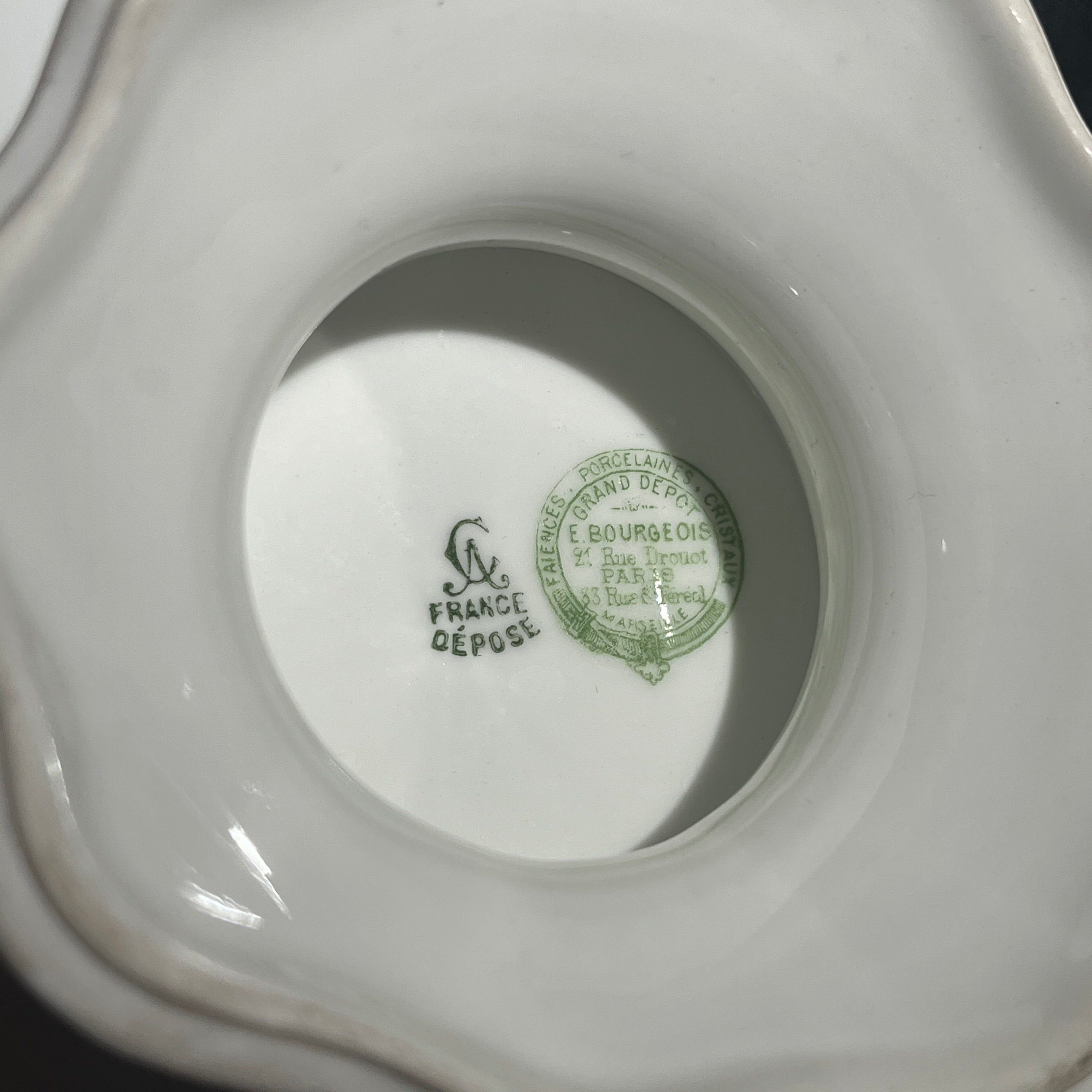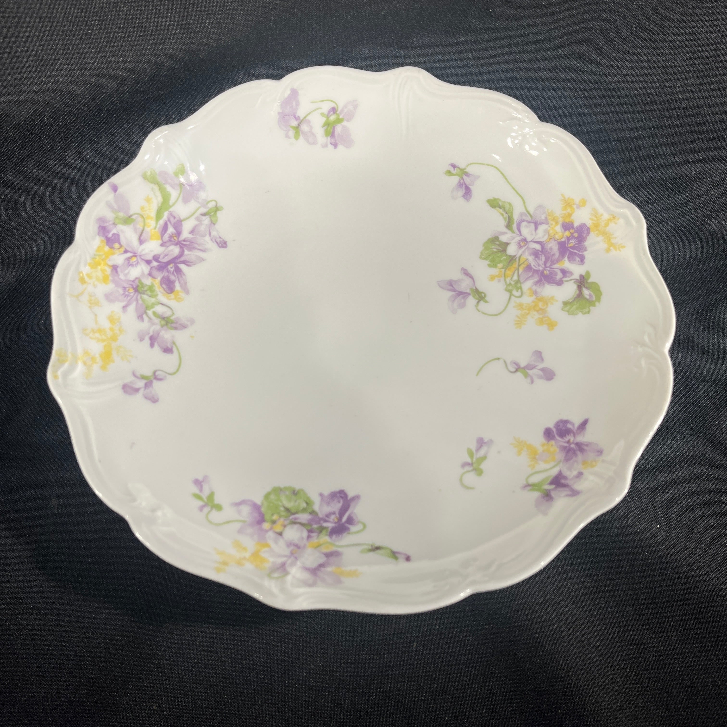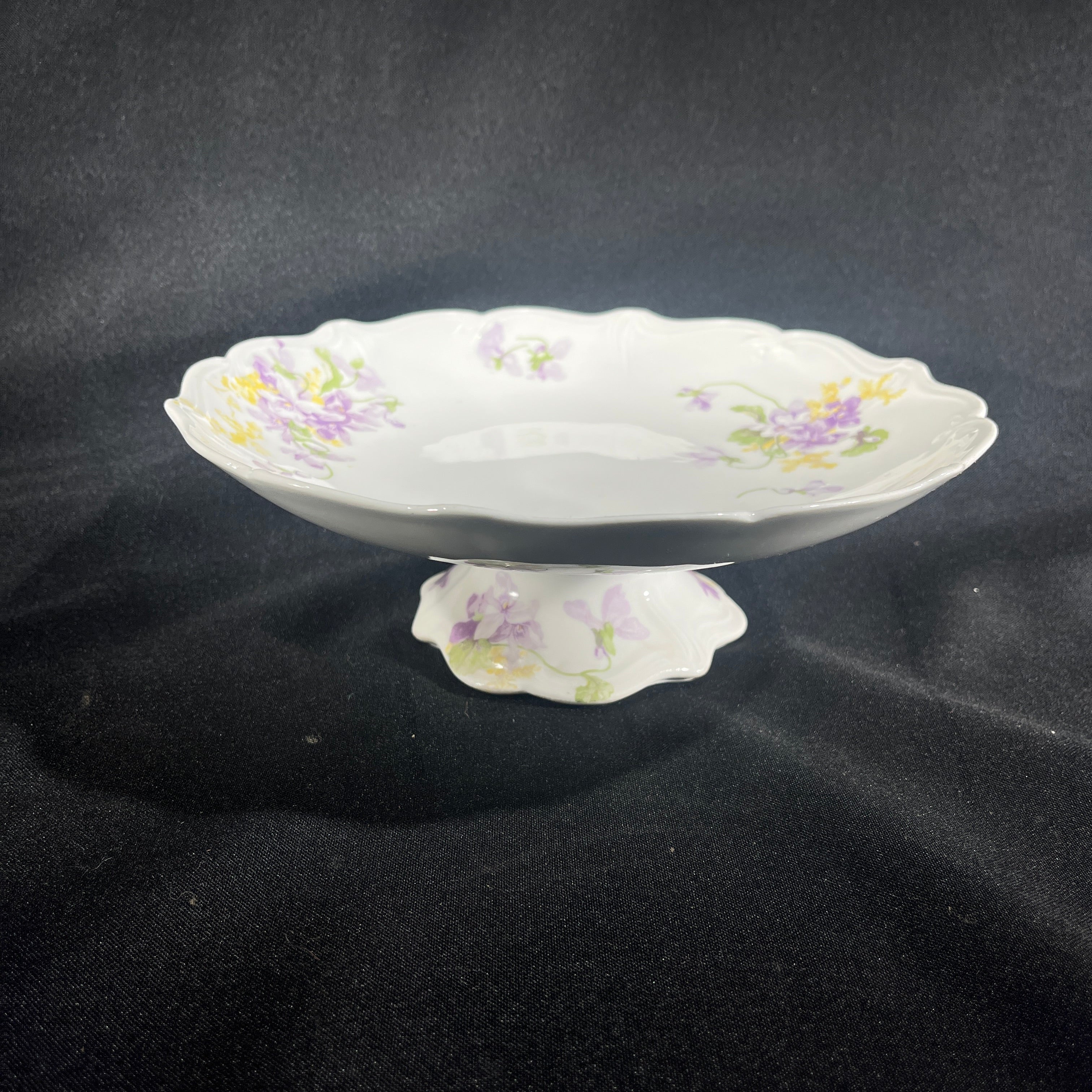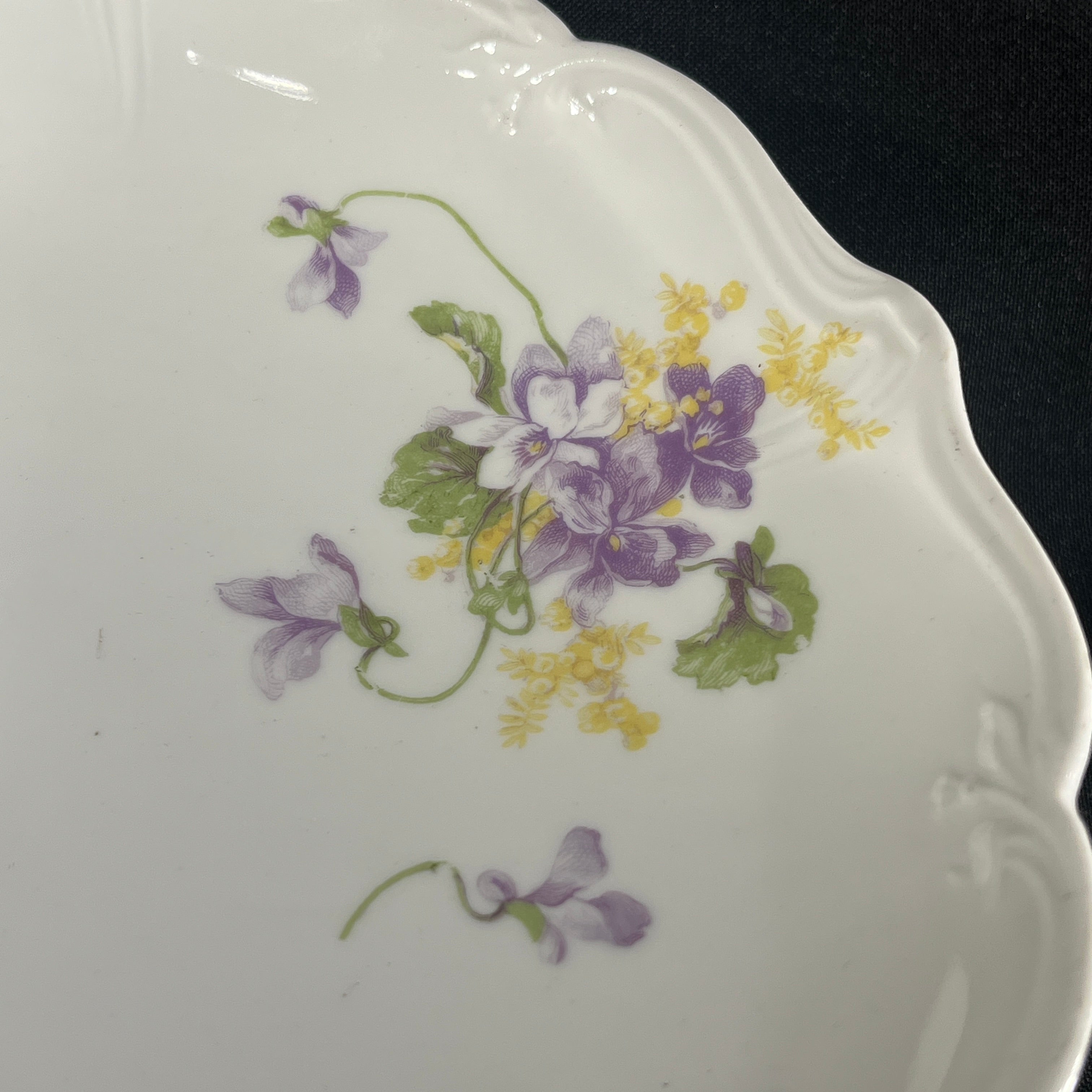 Bellísima pareja de torteros de porcelana de origen francés de la prestigiosa marca Limoges, fabricados por E. Bourgeois. Las piezas tienen un delicado diseño floral pintado a mano, en verde , amarillo y morado, además de un borde en curva tipo tulipán.