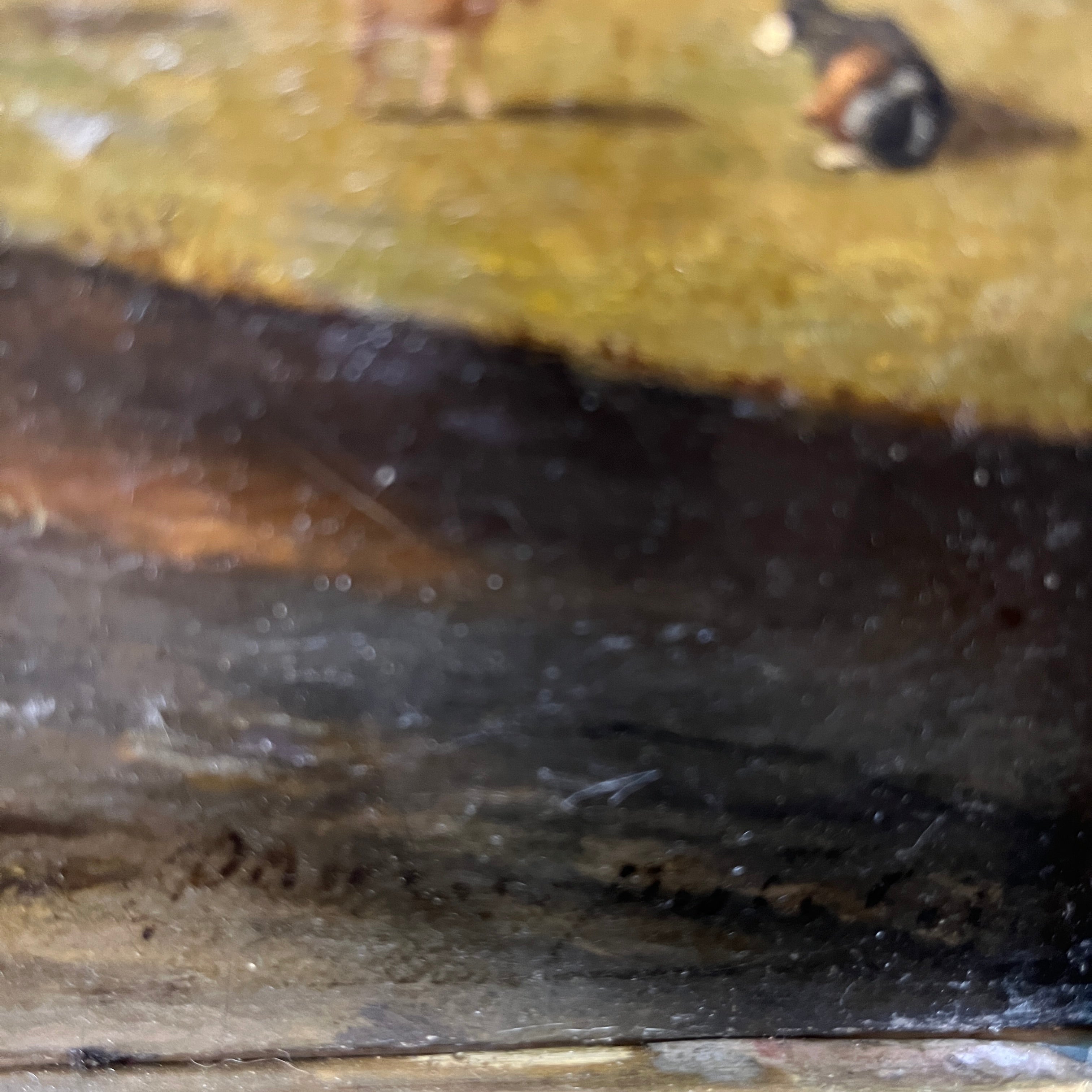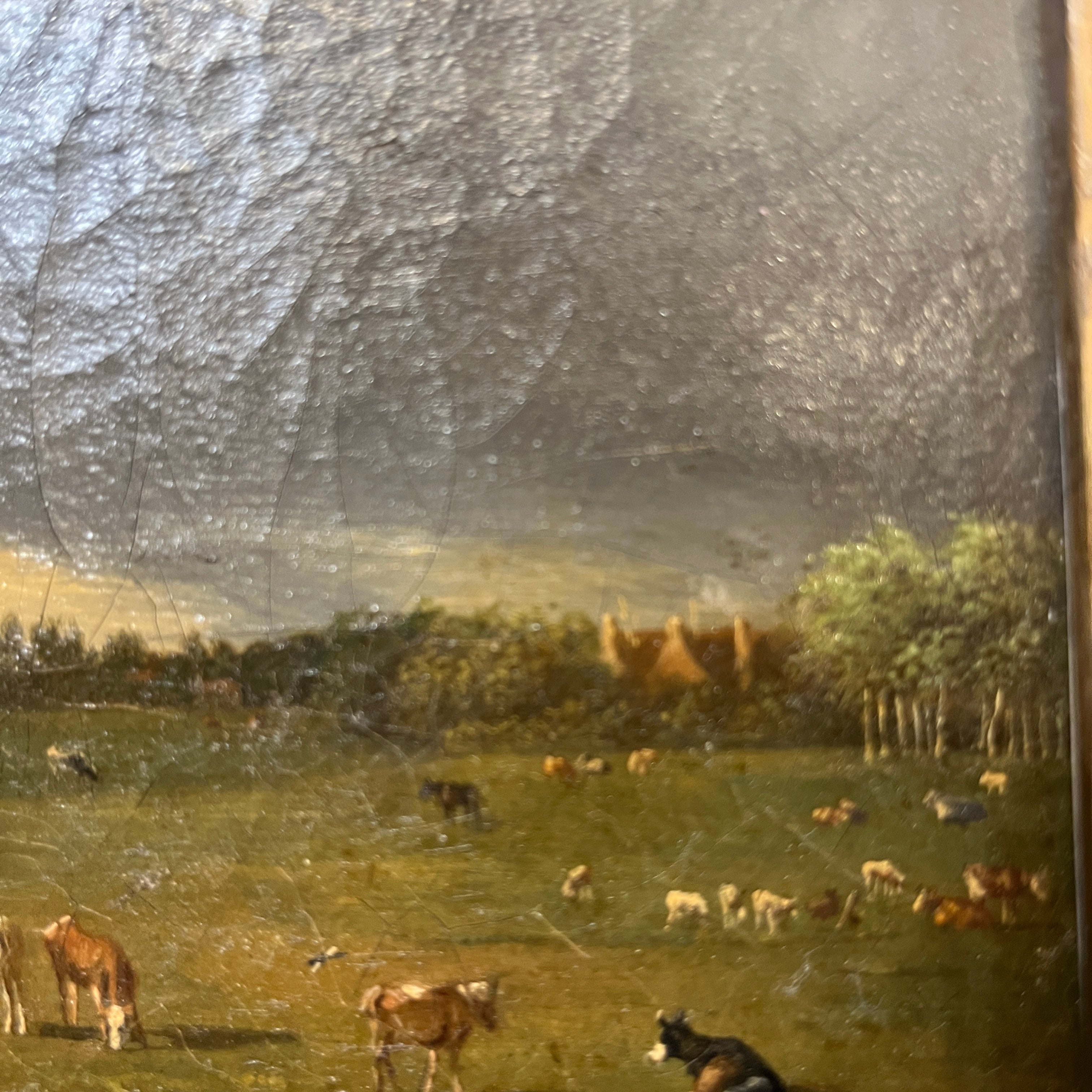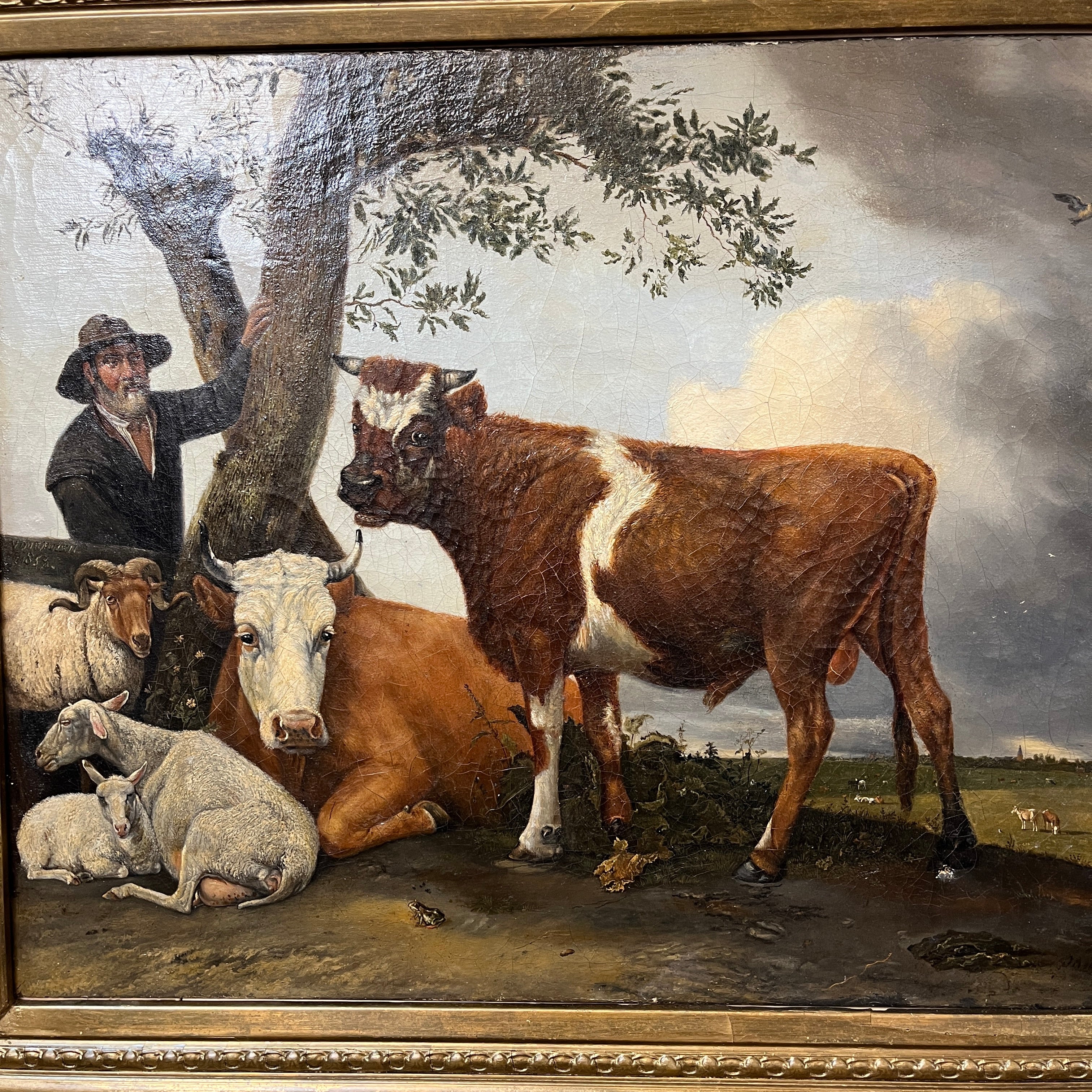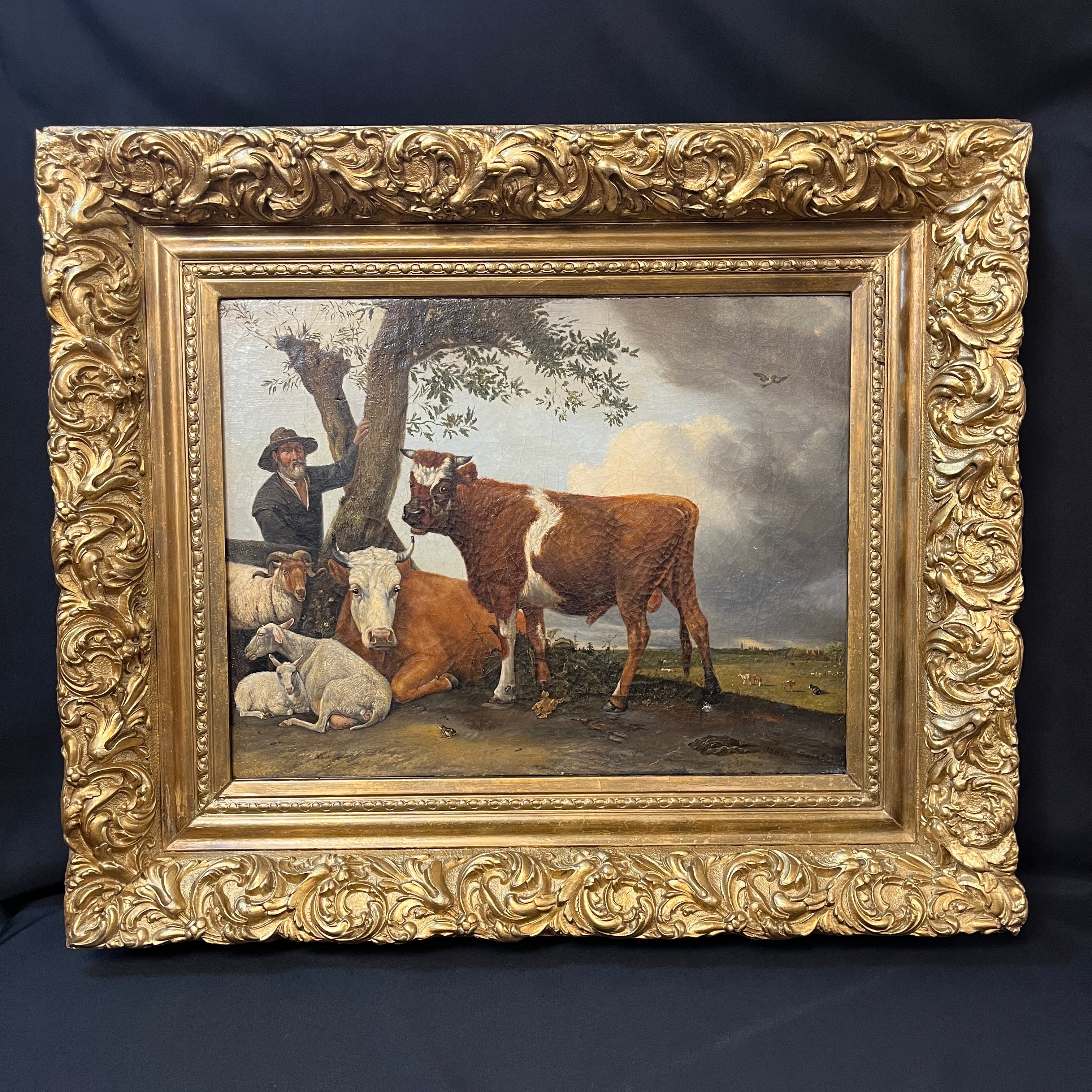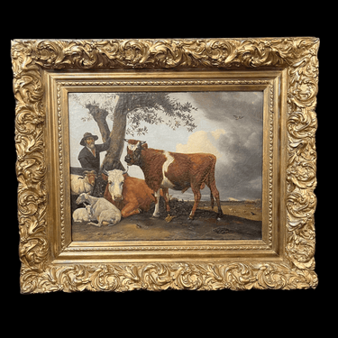 Maravilloso óleo sobre tela de Paulus Potter (1625). Fue un pintor y grabador barroco Neerlandés, especializado en animales y paisajes. Nos presenta la imagen de un ganadero descansando junto a sus animales como escena principal, sin embargo si prestamos atención al fondo, podemos ver que también están ocurriendo acciones. Podemos observar las nubes grises que avisan mal tiempo, en el cielo también un ave sobrevolando y en la lejanía más ganado pastando, además de una singular rana. También es interesante el nivel de detalle que logra con su pincelada, al pintar las ramas del árbol o, incluso rizos en el lomo de una de las vacas. Es una pintura, para detenerse frente a ella y perderse buscando secretos ocultos. El marco de este cuadro también resalta con un dorado intenso, distintos niveles y tallados ornamentales mucha curva que entran a la pintura mayor dimensión. La tela posee un craquelado natural producto del paso del tiempo el cual le entrega una fuerza especial a toda la obra.
