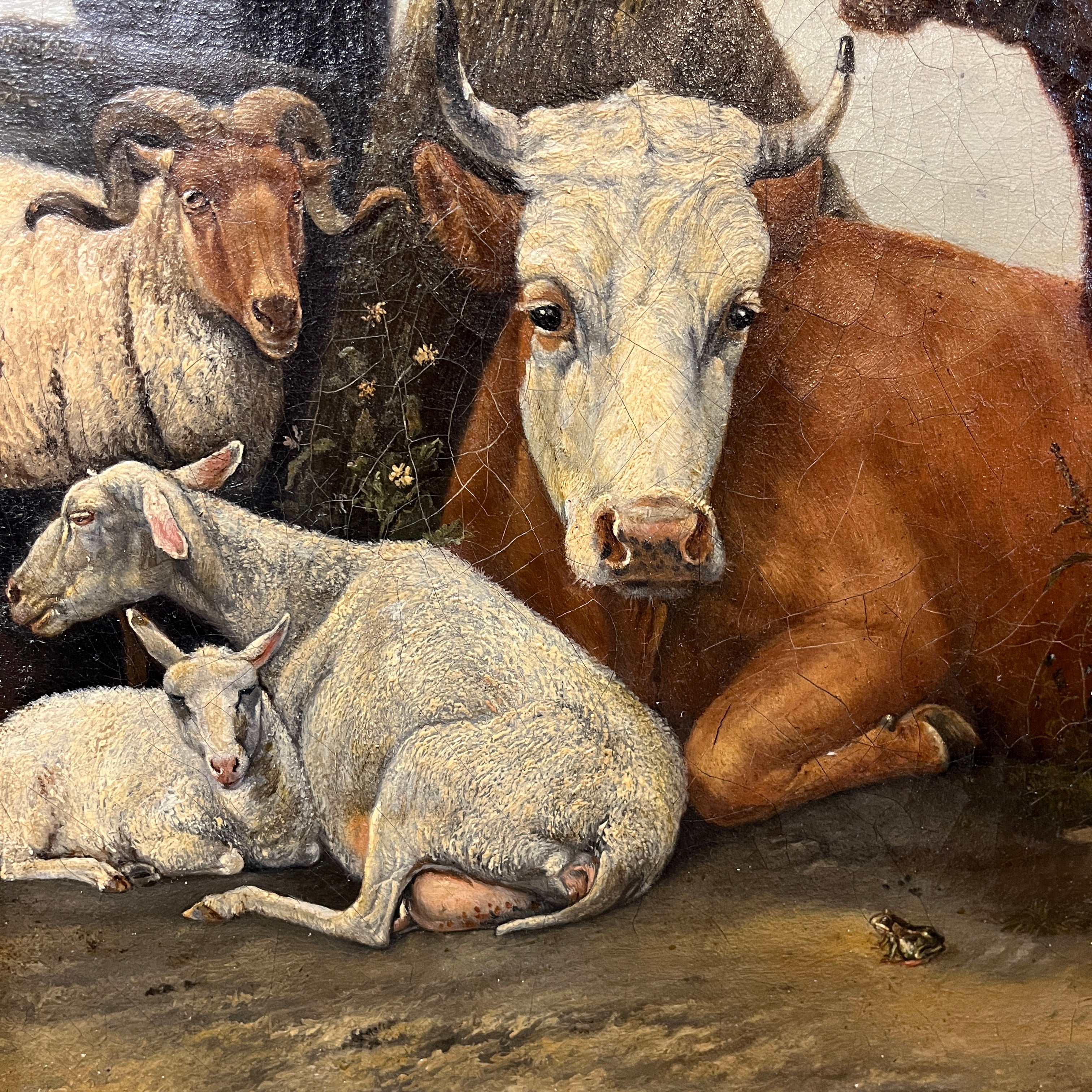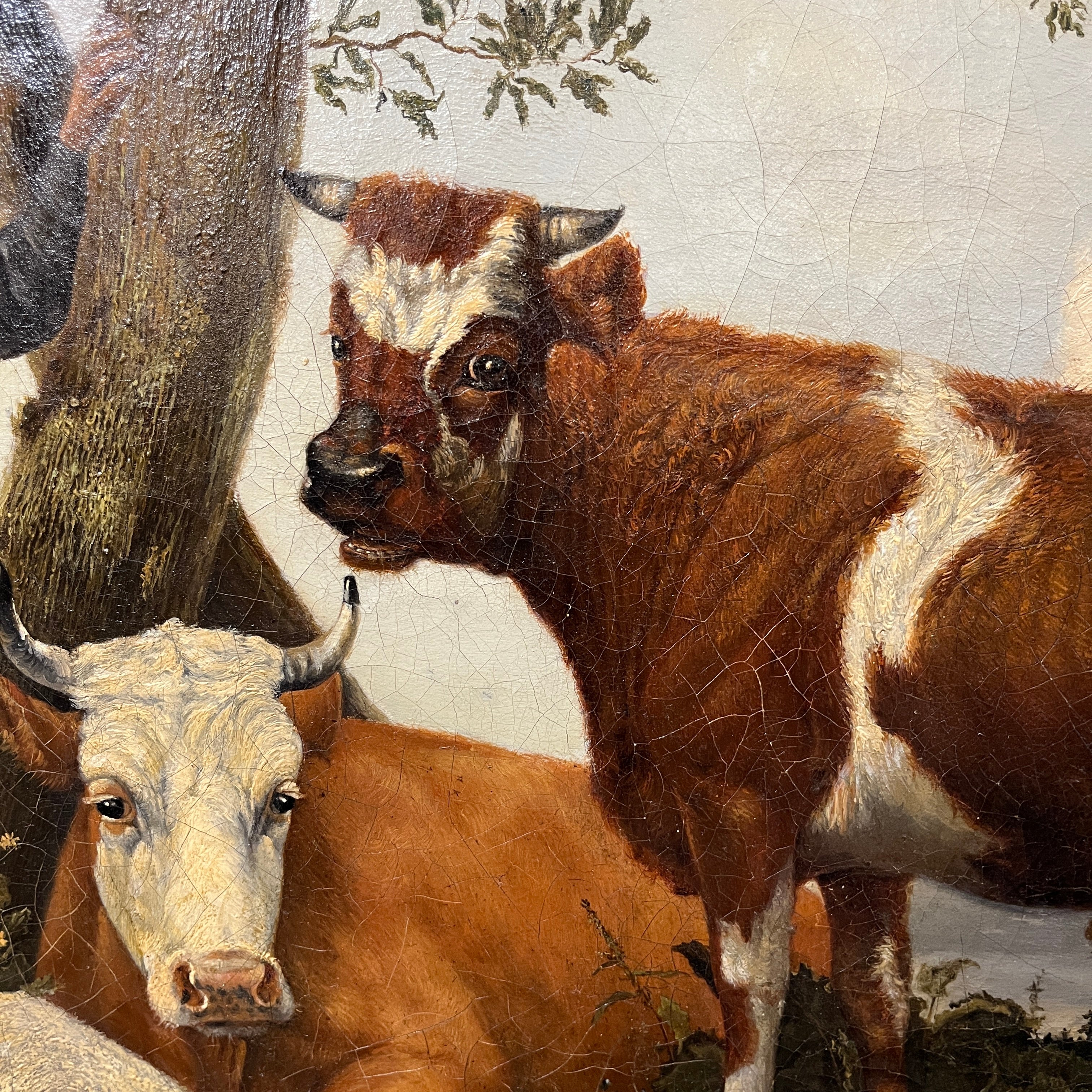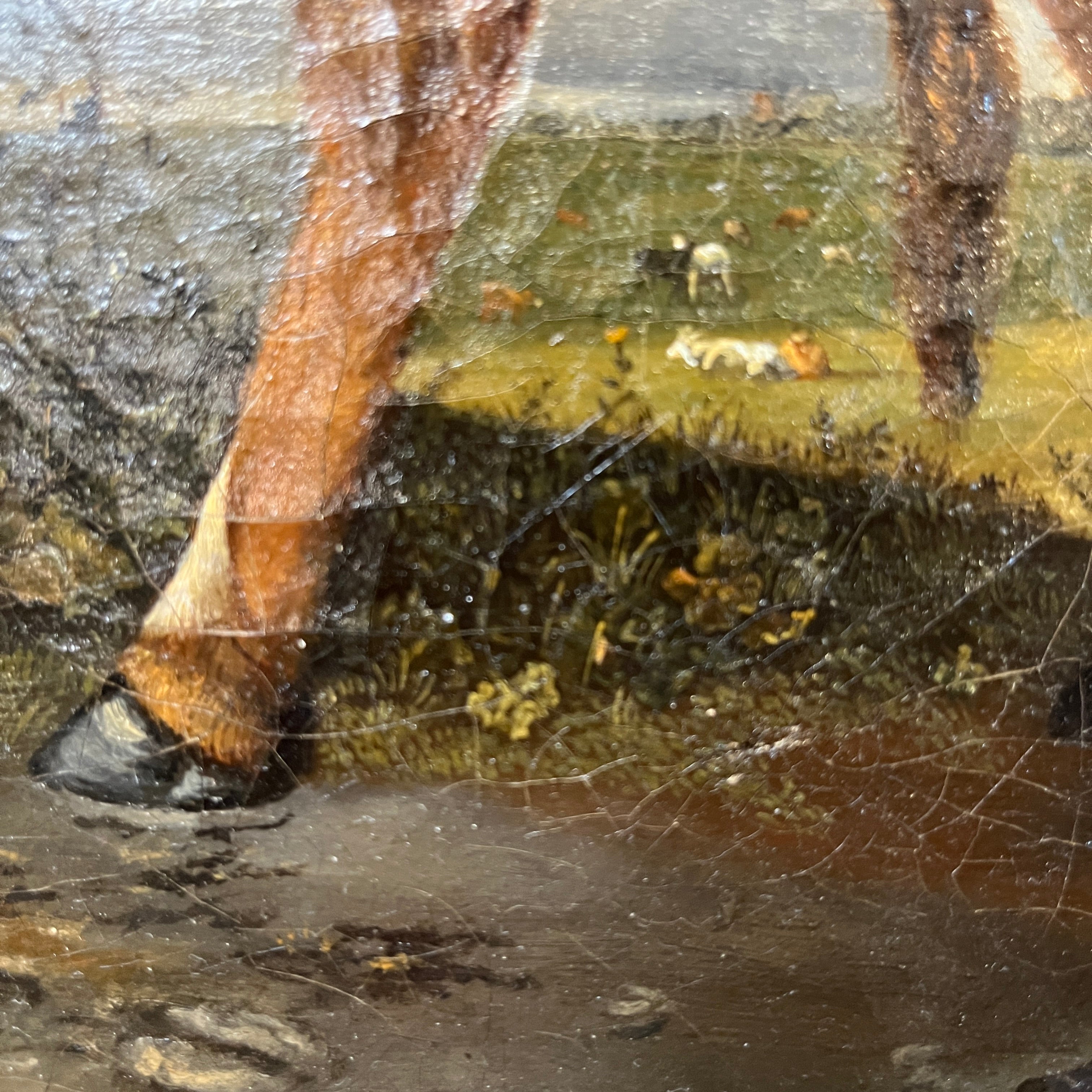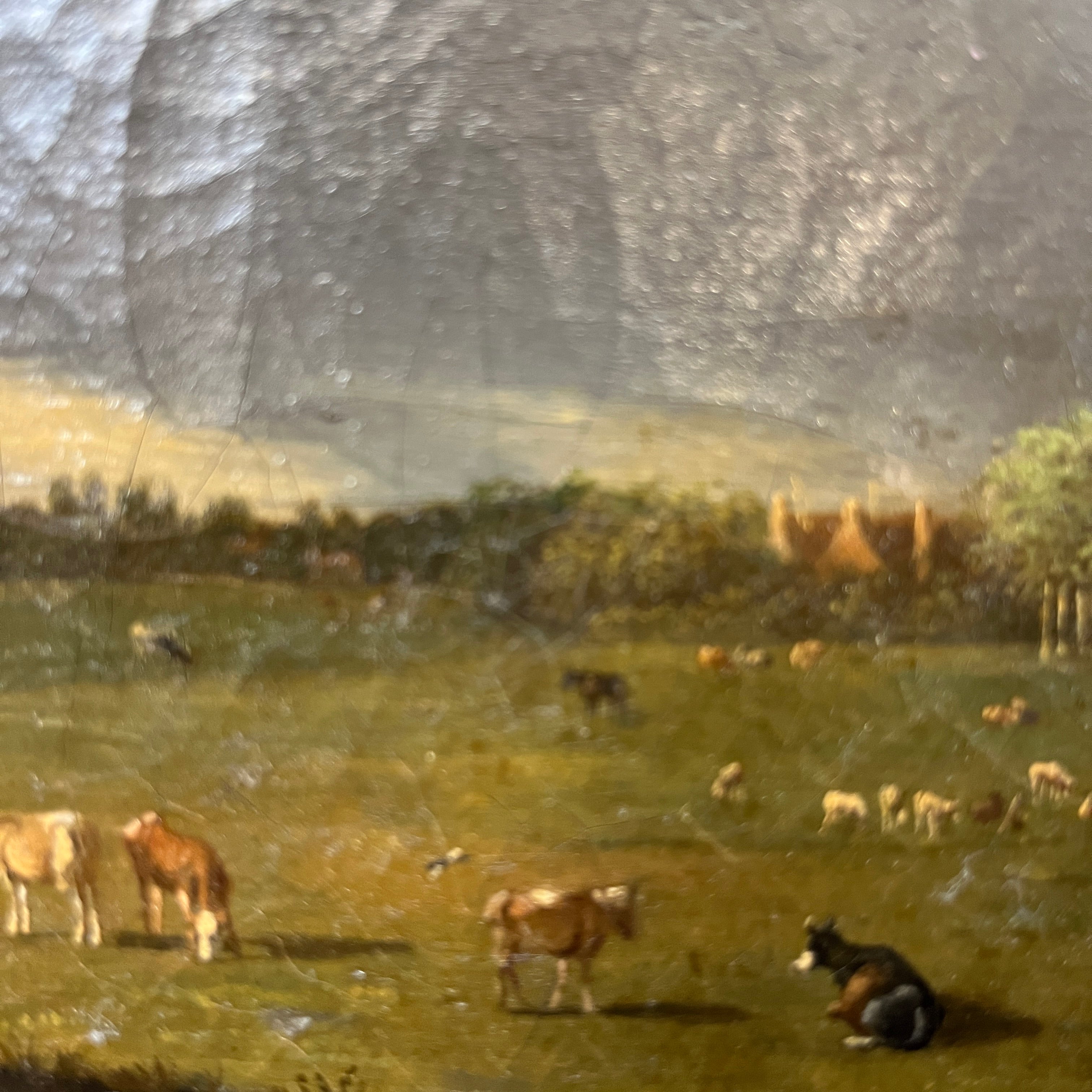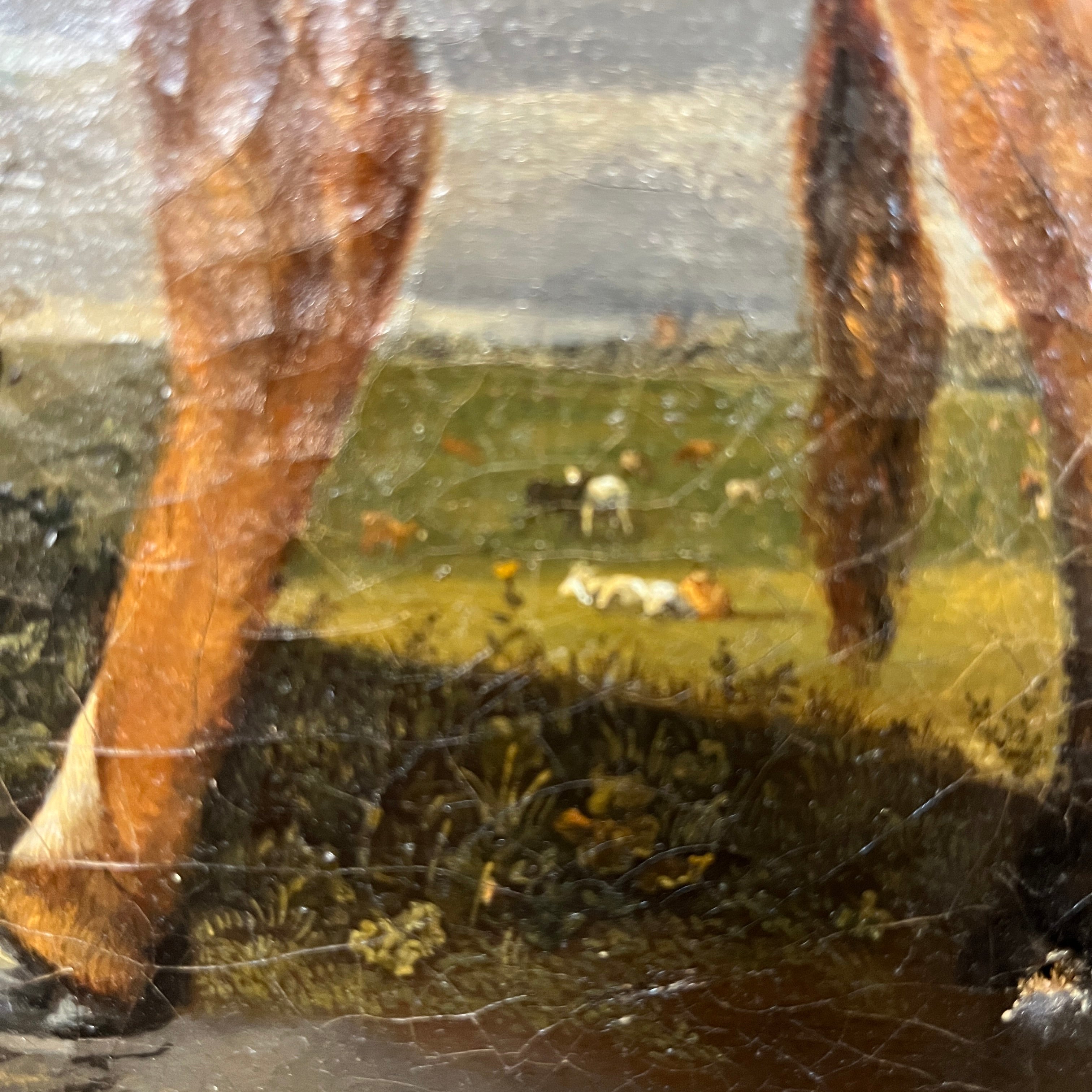 Maravilloso óleo sobre tela de Paulus Potter (1625). Fue un pintor y grabador barroco Neerlandés, especializado en animales y paisajes. Nos presenta la imagen de un ganadero descansando junto a sus animales como escena principal, sin embargo si prestamos atención al fondo, podemos ver que también están ocurriendo acciones. Podemos observar las nubes grises que avisan mal tiempo, en el cielo también un ave sobrevolando y en la lejanía más ganado pastando, además de una singular rana. También es interesante el nivel de detalle que logra con su pincelada, al pintar las ramas del árbol o, incluso rizos en el lomo de una de las vacas. Es una pintura, para detenerse frente a ella y perderse buscando secretos ocultos. El marco de este cuadro también resalta con un dorado intenso, distintos niveles y tallados ornamentales mucha curva que entran a la pintura mayor dimensión. La tela posee un craquelado natural producto del paso del tiempo el cual le entrega una fuerza especial a toda la obra.