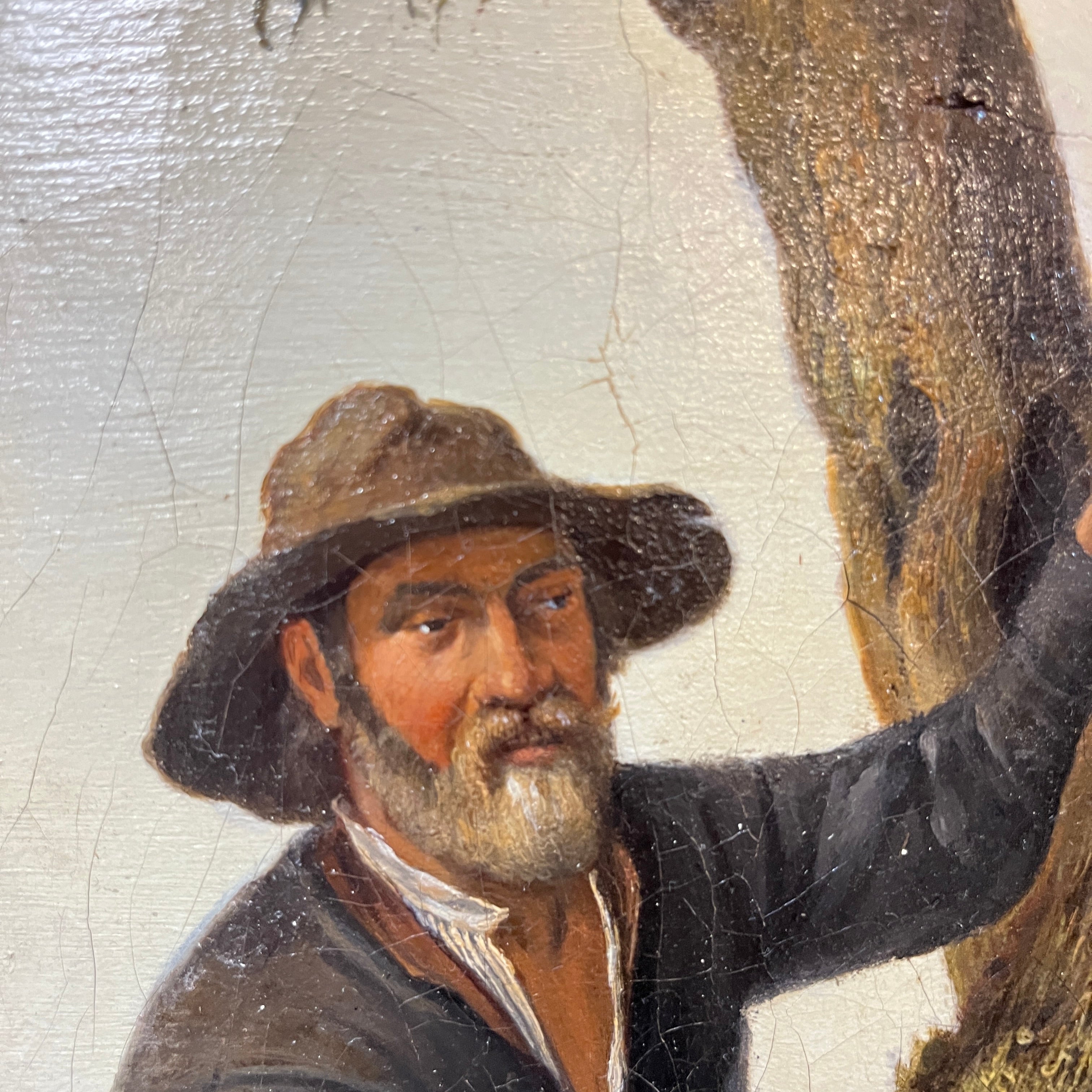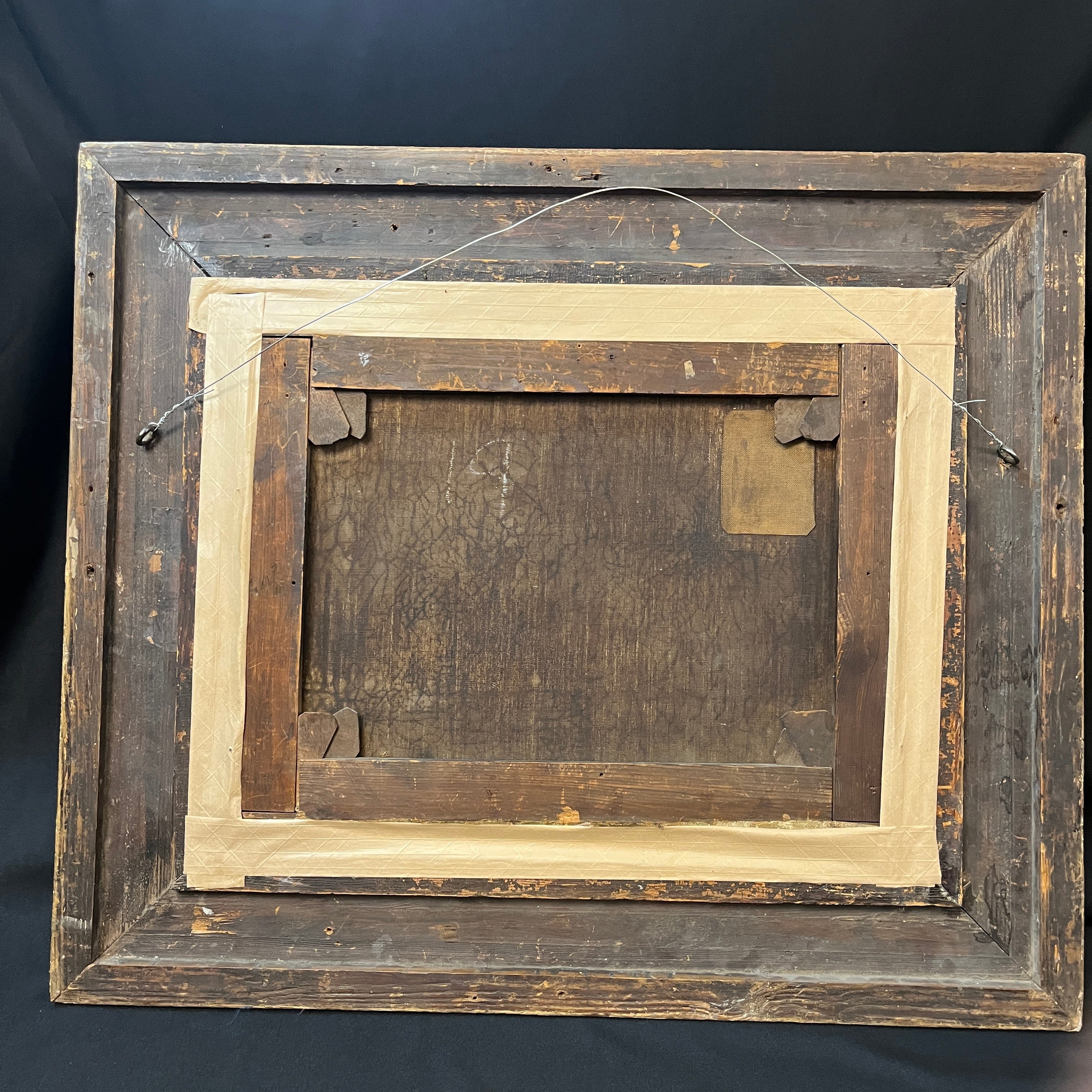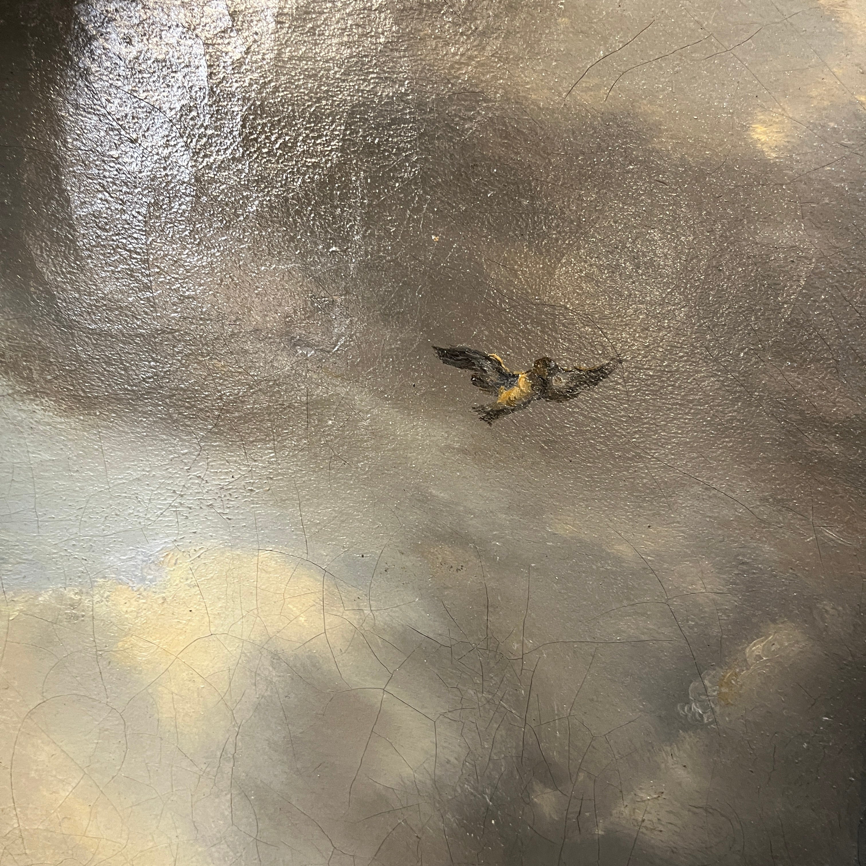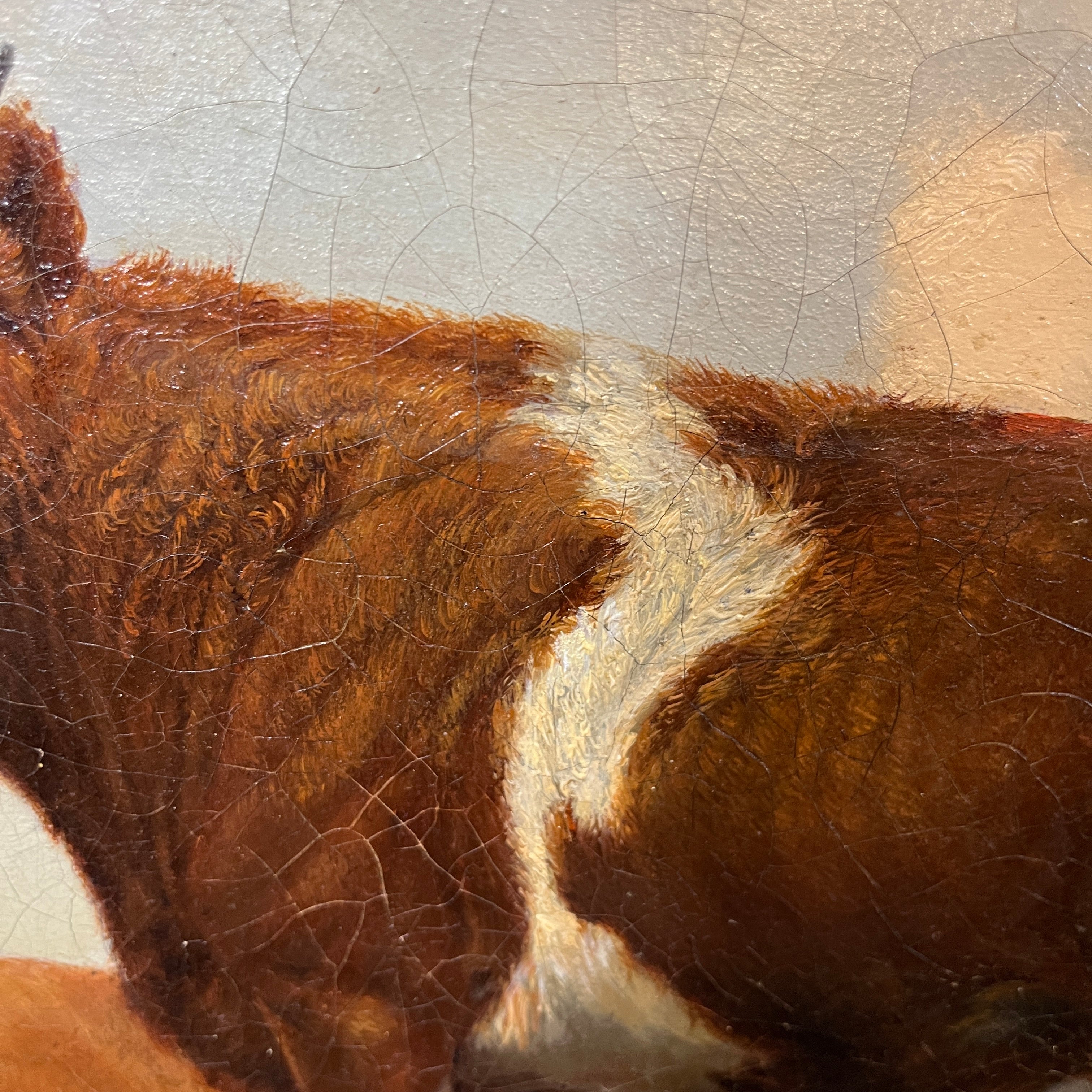 Maravilloso óleo sobre tela de Paulus Potter (1625). Fue un pintor y grabador barroco Neerlandés, especializado en animales y paisajes. Nos presenta la imagen de un ganadero descansando junto a sus animales como escena principal, sin embargo si prestamos atención al fondo, podemos ver que también están ocurriendo acciones. Podemos observar las nubes grises que avisan mal tiempo, en el cielo también un ave sobrevolando y en la lejanía más ganado pastando, además de una singular rana. También es interesante el nivel de detalle que logra con su pincelada, al pintar las ramas del árbol o, incluso rizos en el lomo de una de las vacas. Es una pintura, para detenerse frente a ella y perderse buscando secretos ocultos. El marco de este cuadro también resalta con un dorado intenso, distintos niveles y tallados ornamentales mucha curva que entran a la pintura mayor dimensión. La tela posee un craquelado natural producto del paso del tiempo el cual le entrega una fuerza especial a toda la obra.