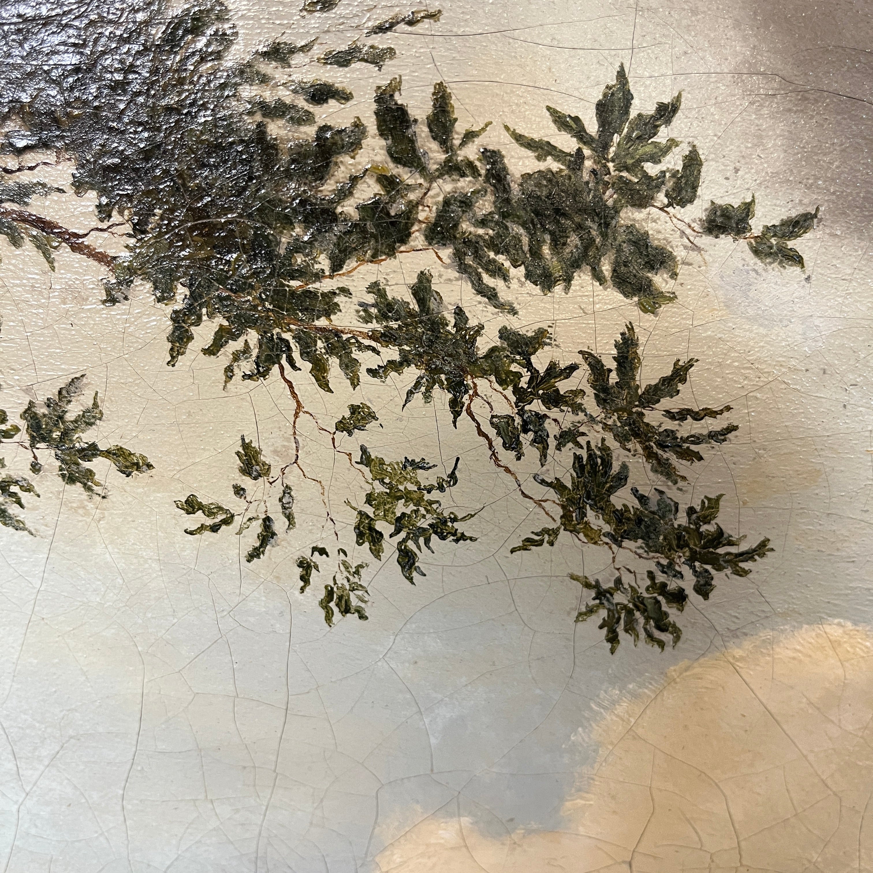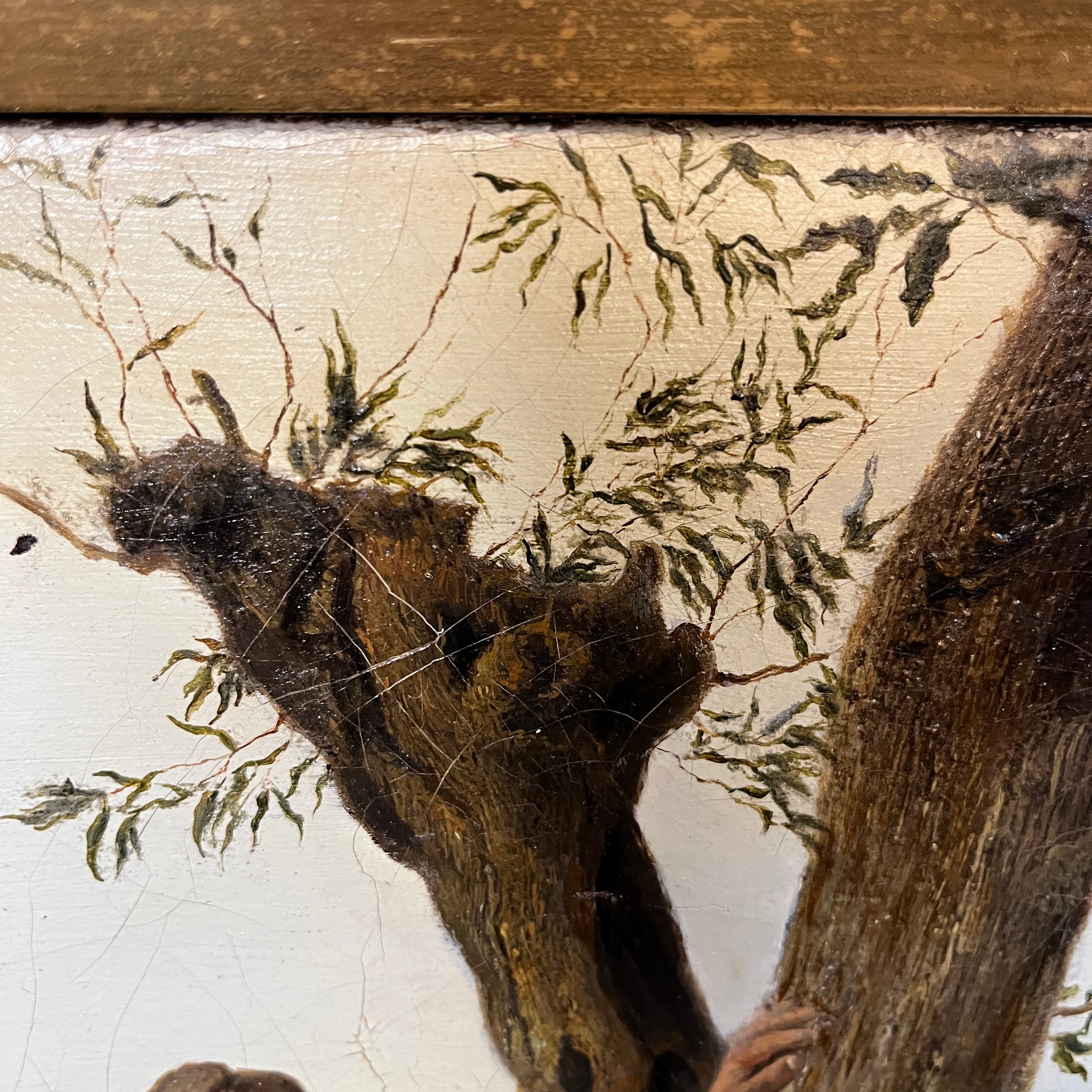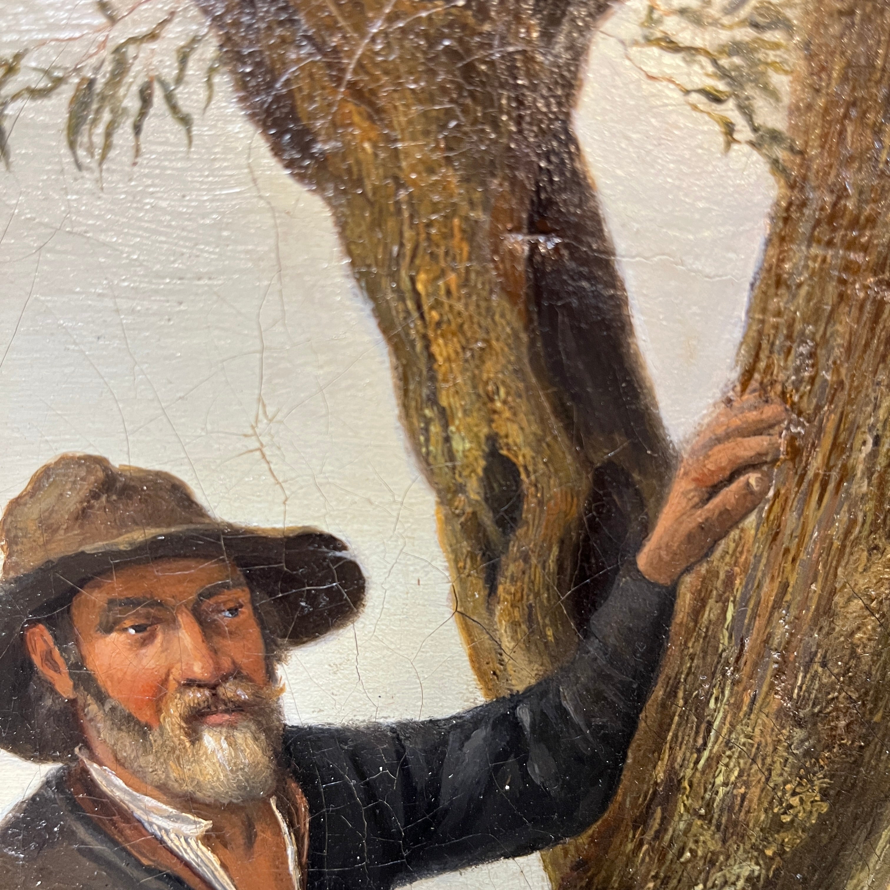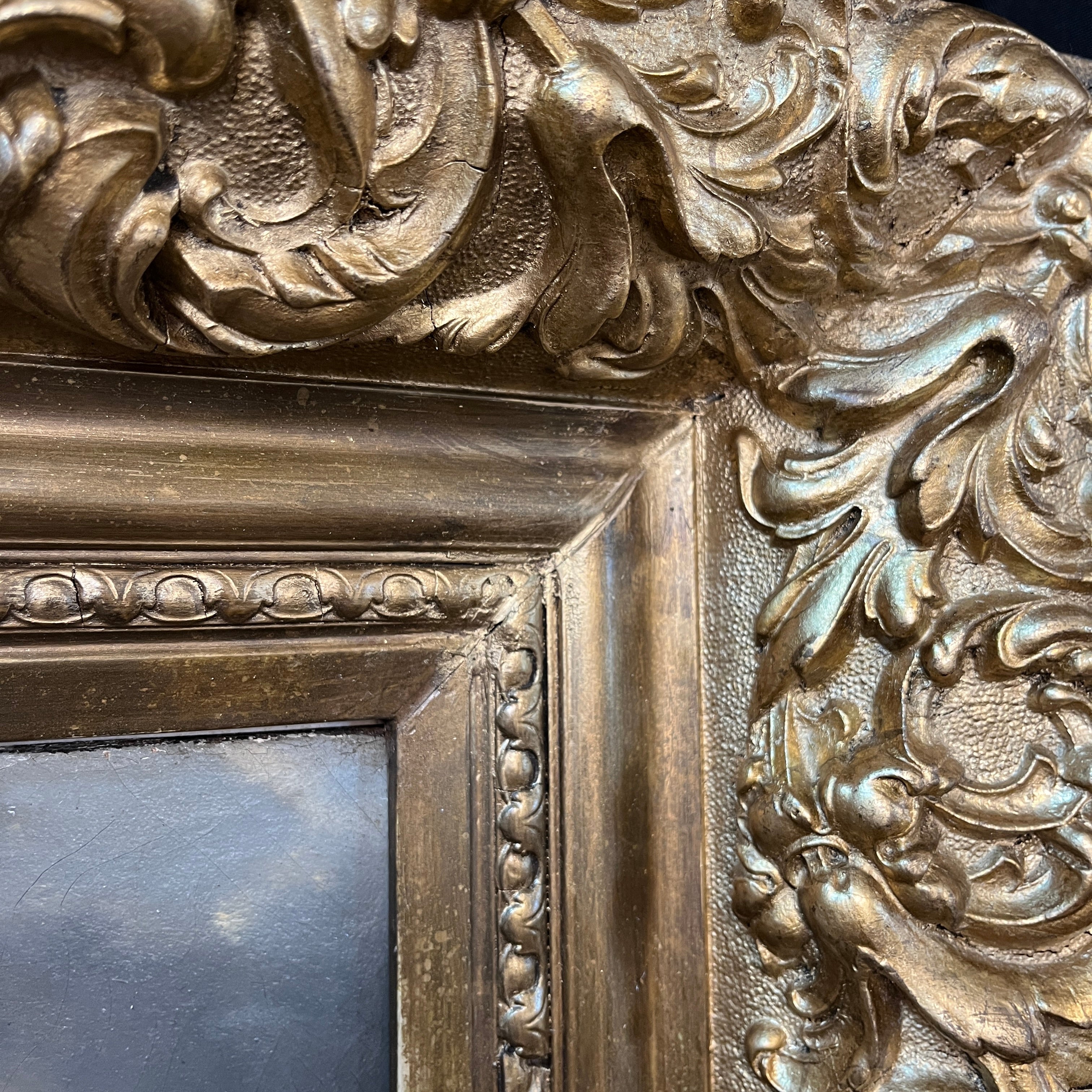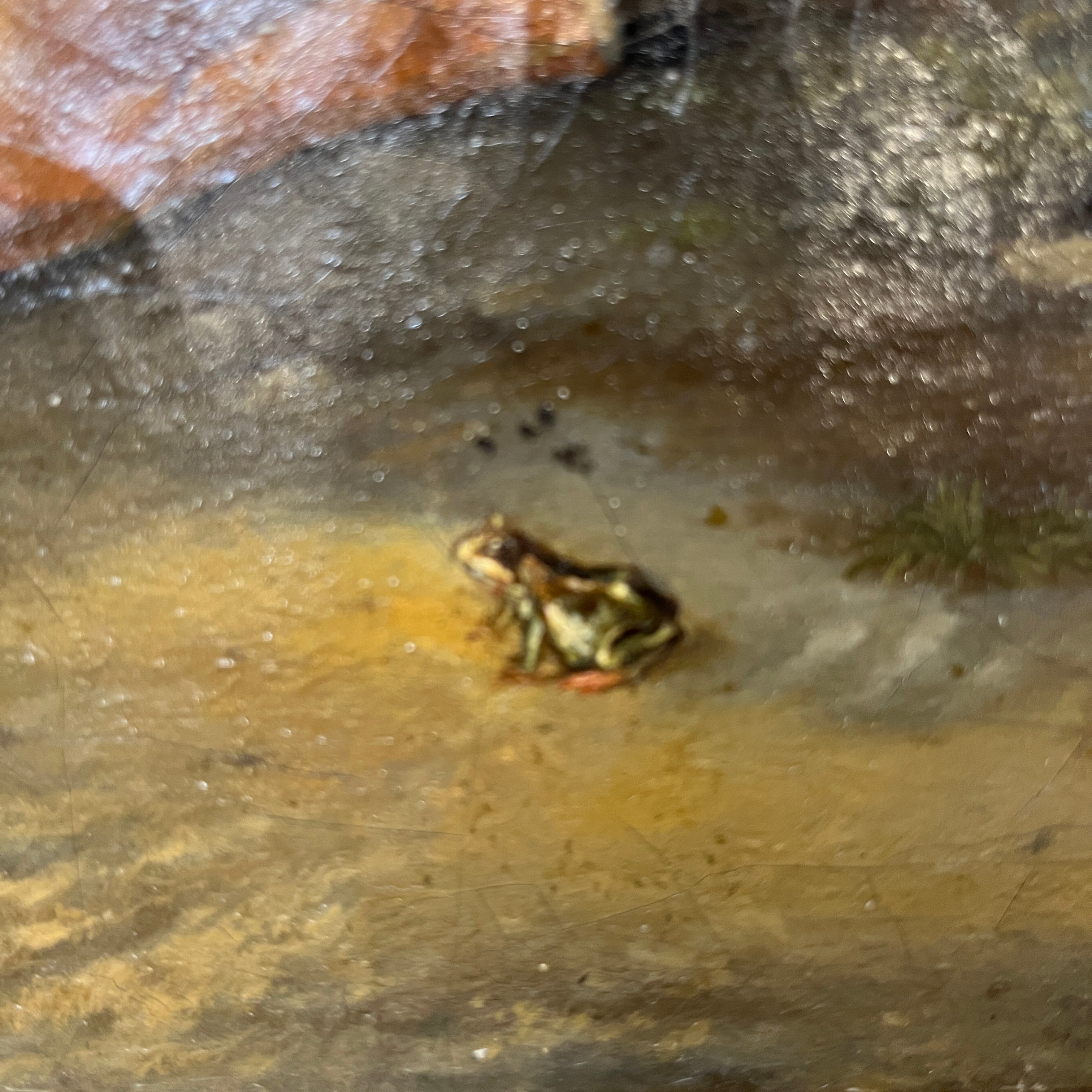 Maravilloso óleo sobre tela de Paulus Potter (1625). Fue un pintor y grabador barroco Neerlandés, especializado en animales y paisajes. Nos presenta la imagen de un ganadero descansando junto a sus animales como escena principal, sin embargo si prestamos atención al fondo, podemos ver que también están ocurriendo acciones. Podemos observar las nubes grises que avisan mal tiempo, en el cielo también un ave sobrevolando y en la lejanía más ganado pastando, además de una singular rana. También es interesante el nivel de detalle que logra con su pincelada, al pintar las ramas del árbol o, incluso rizos en el lomo de una de las vacas. Es una pintura, para detenerse frente a ella y perderse buscando secretos ocultos. El marco de este cuadro también resalta con un dorado intenso, distintos niveles y tallados ornamentales mucha curva que entran a la pintura mayor dimensión. La tela posee un craquelado natural producto del paso del tiempo el cual le entrega una fuerza especial a toda la obra.