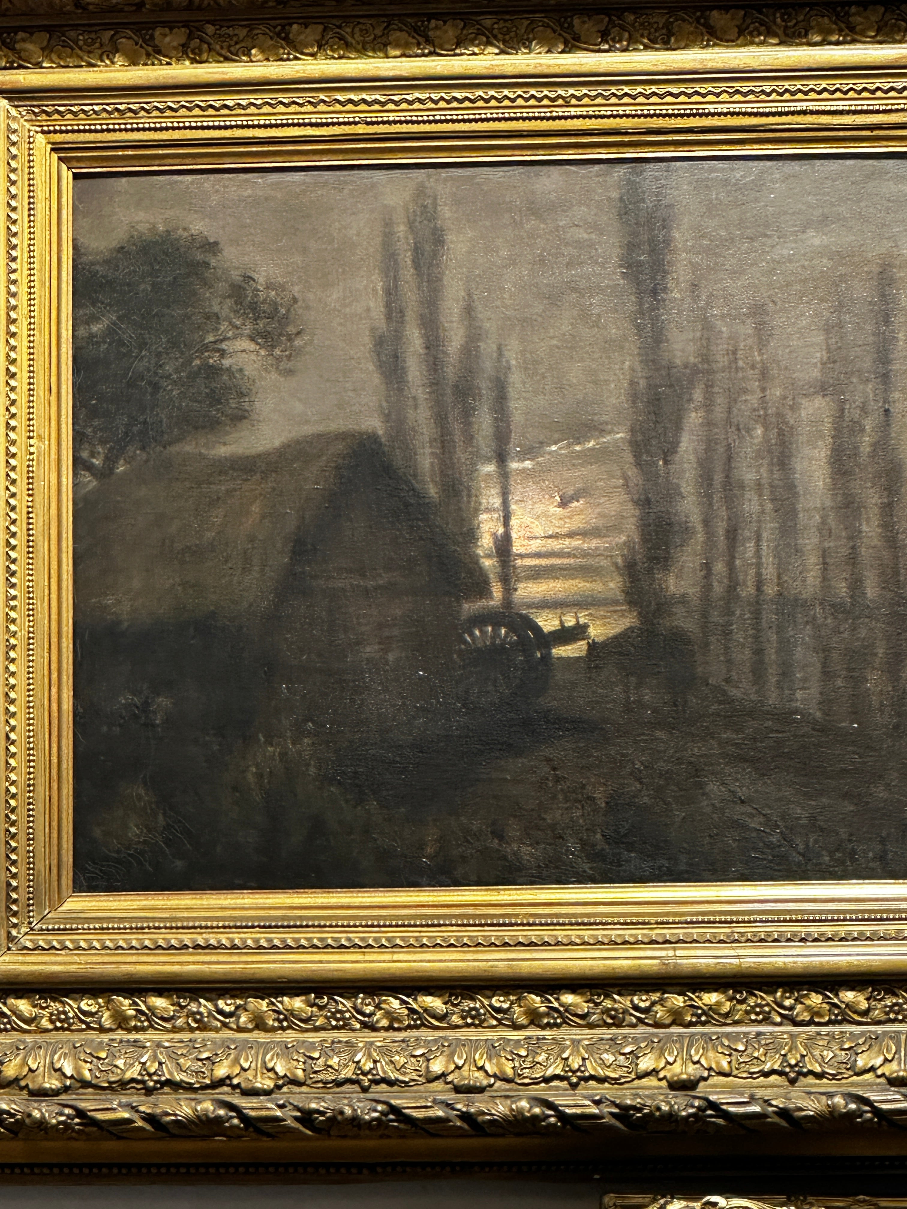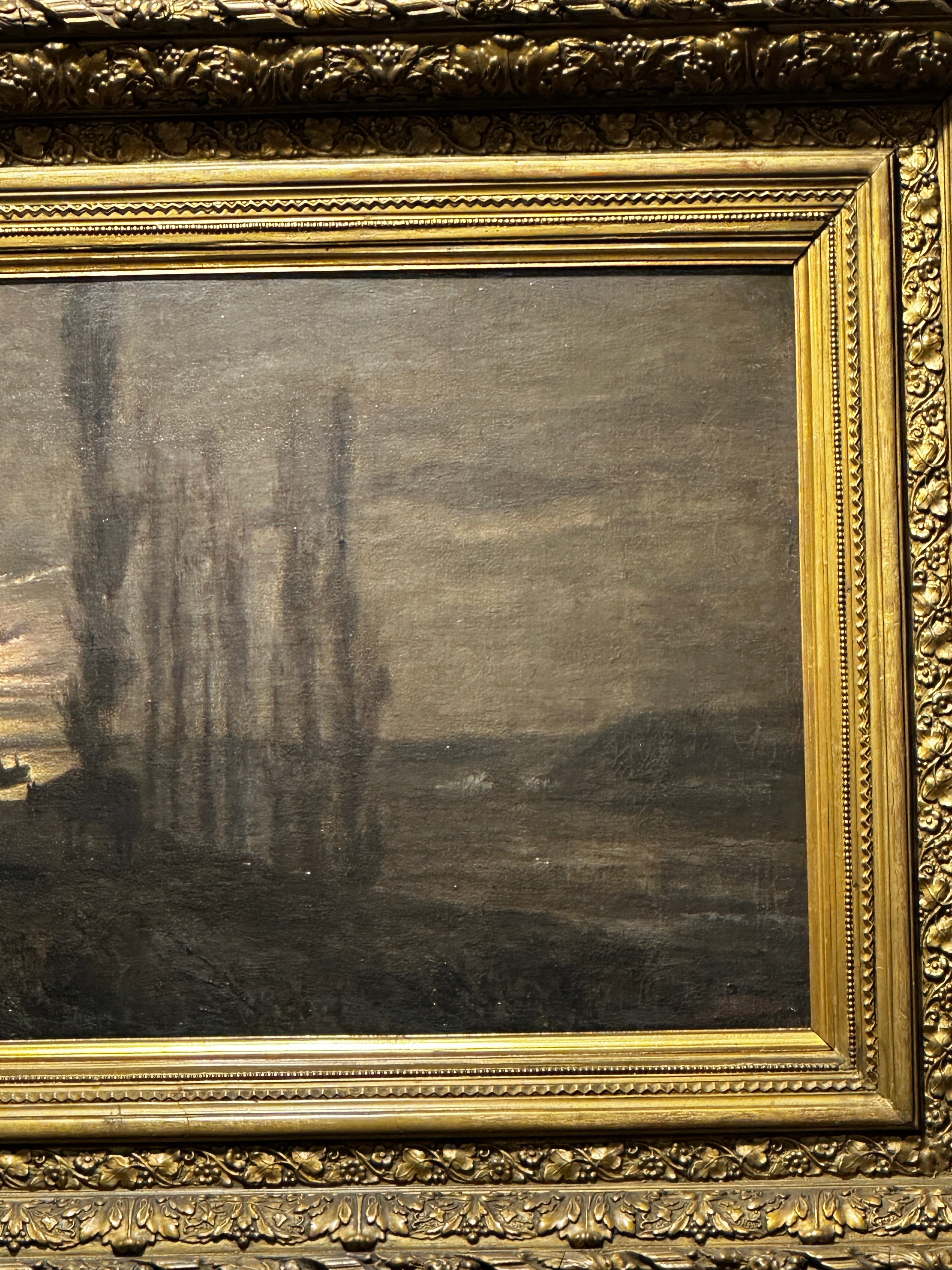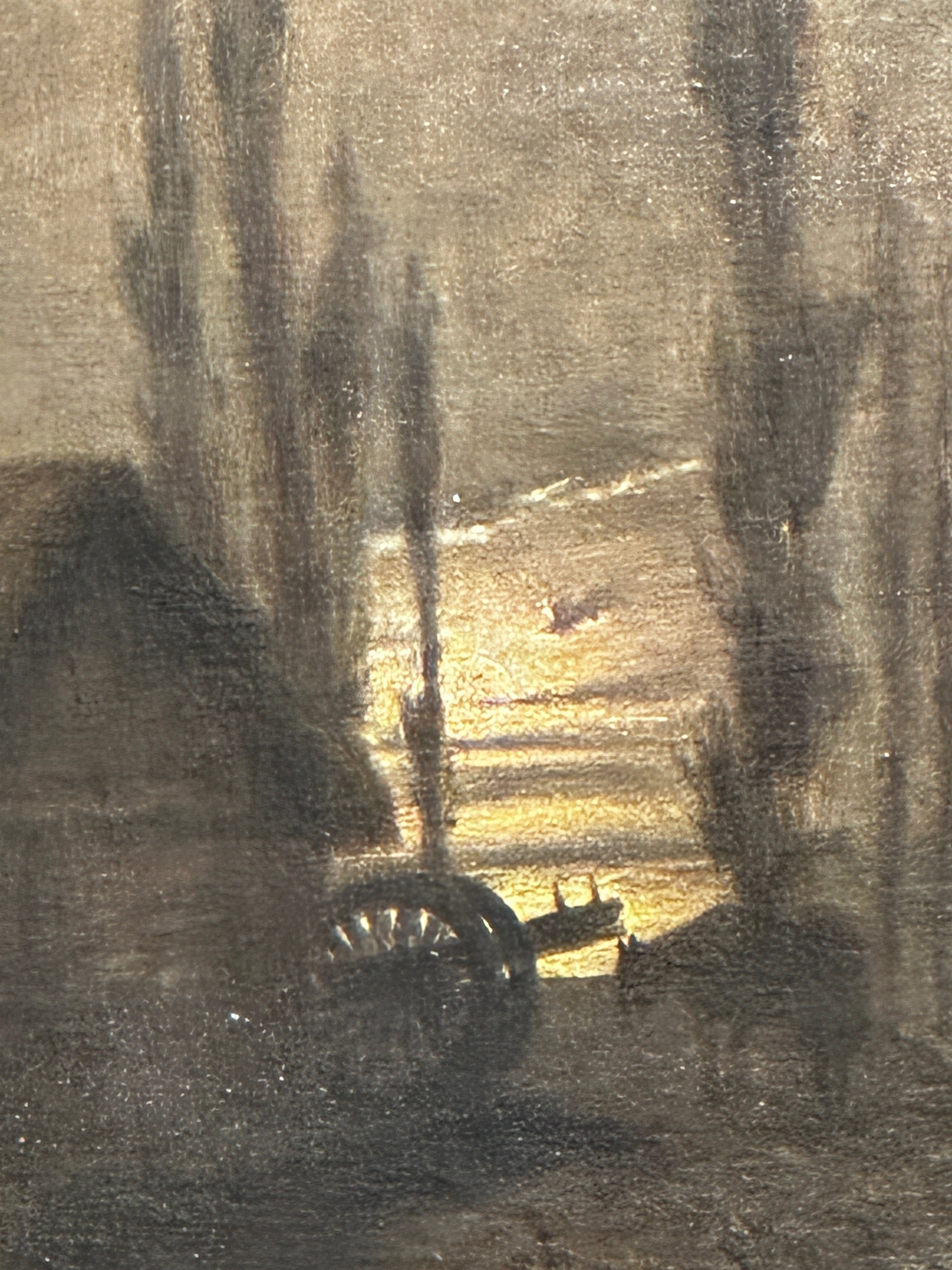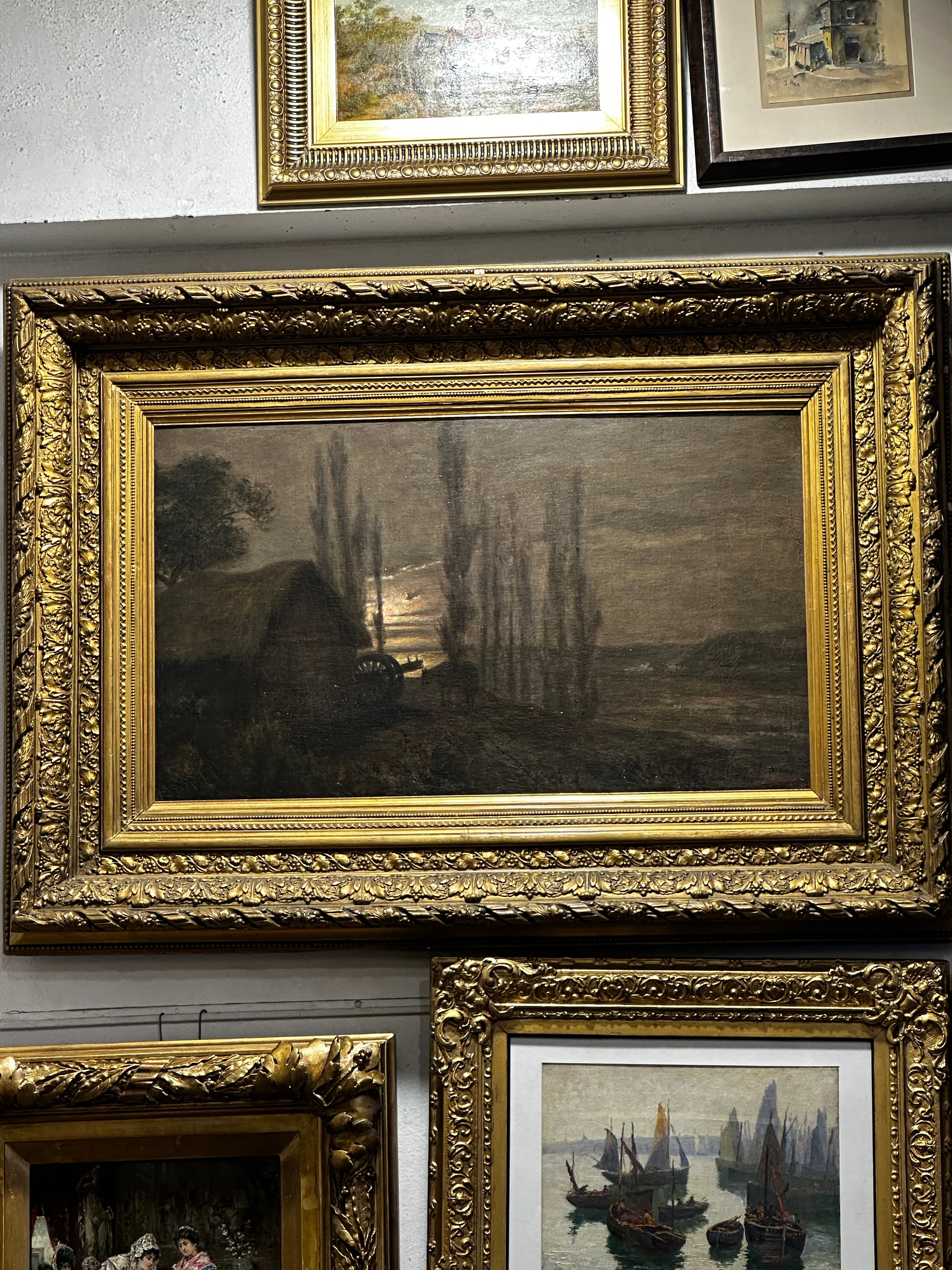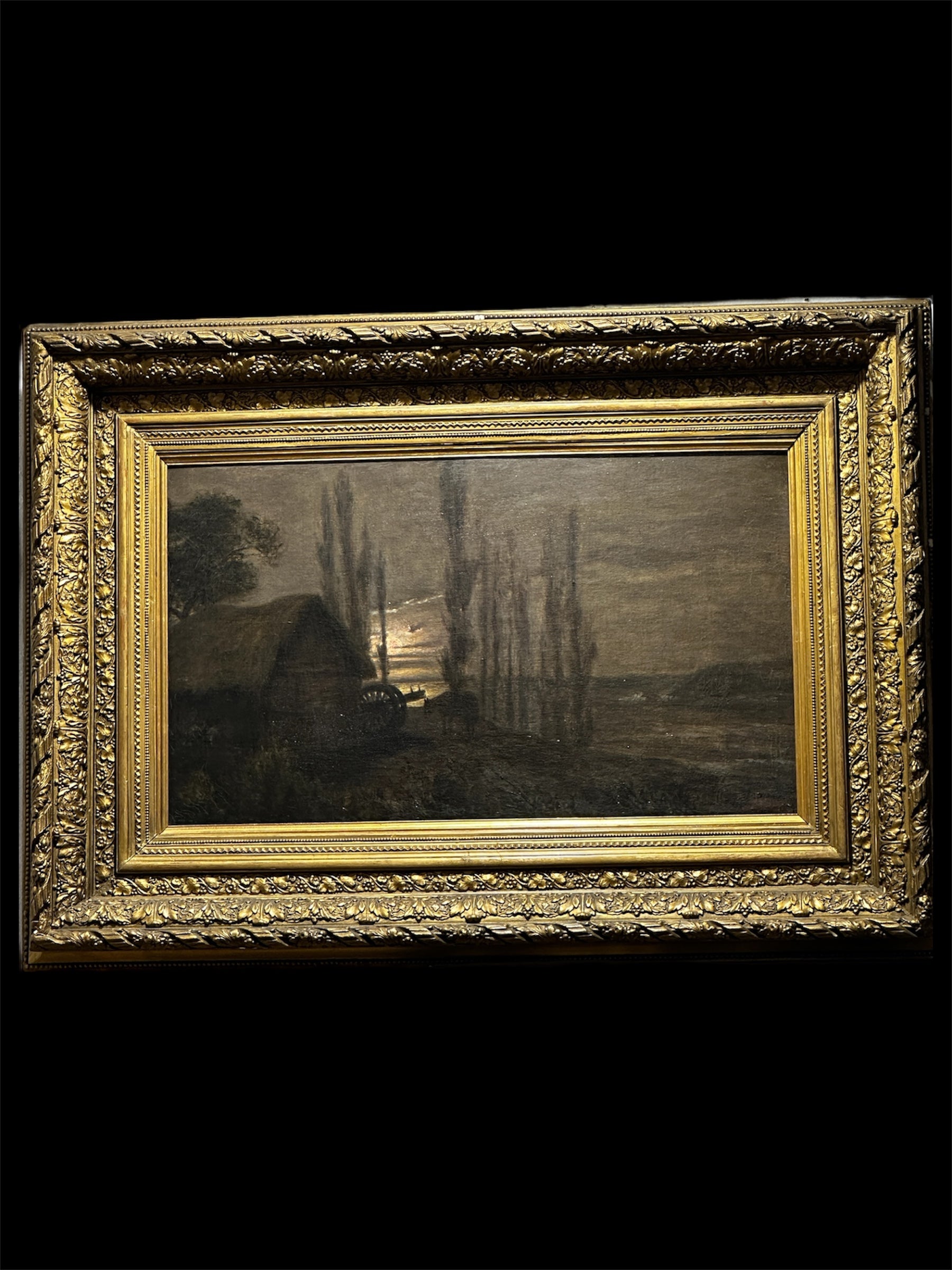 Óleo sobre tela del reconocido artista de origen chileno Pedro Lira (1845-1912), representando un paisaje rural de noche. La obra tiene un interesante trabajo de composición, en el que la luna en el horizonte ilumina la escena, haciendo aparecer las siluetas del paisaje, con sus árboles, cerros, una casa, un caballo y una carreta, a contraluz. La obra está enmarcada en bella madera tallada en relieves y pintada de dorado.
