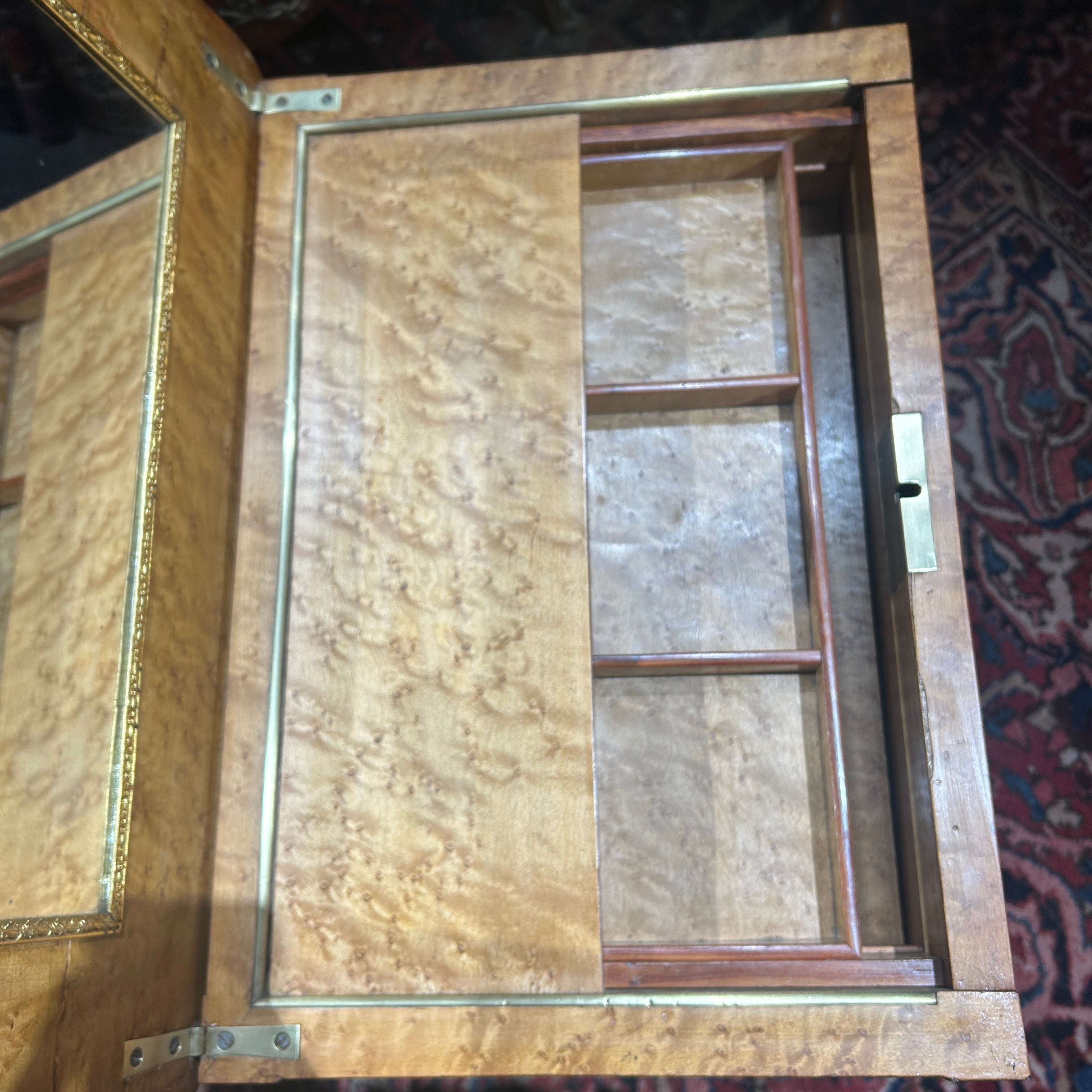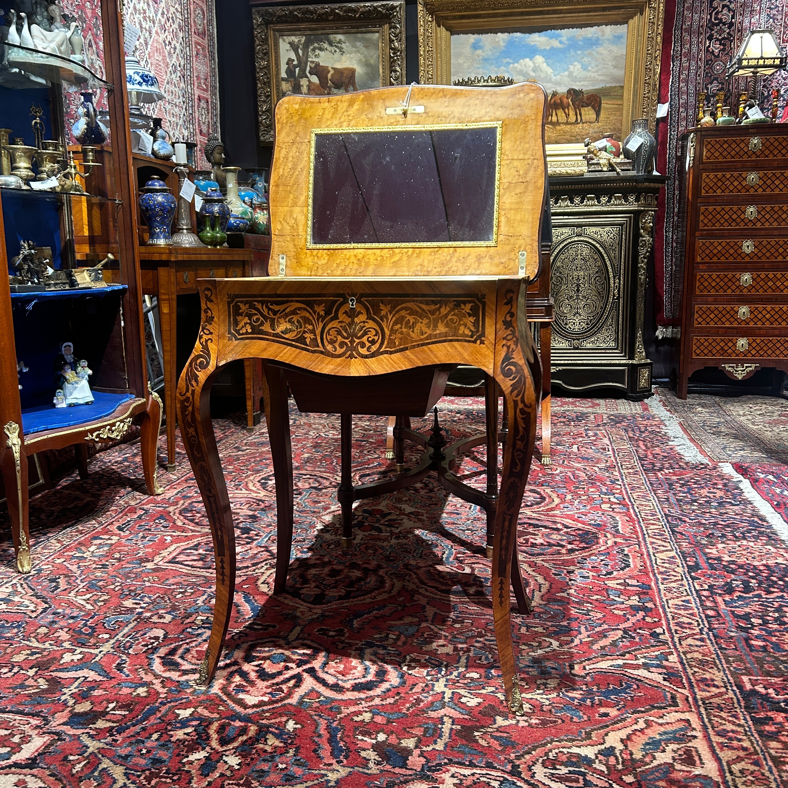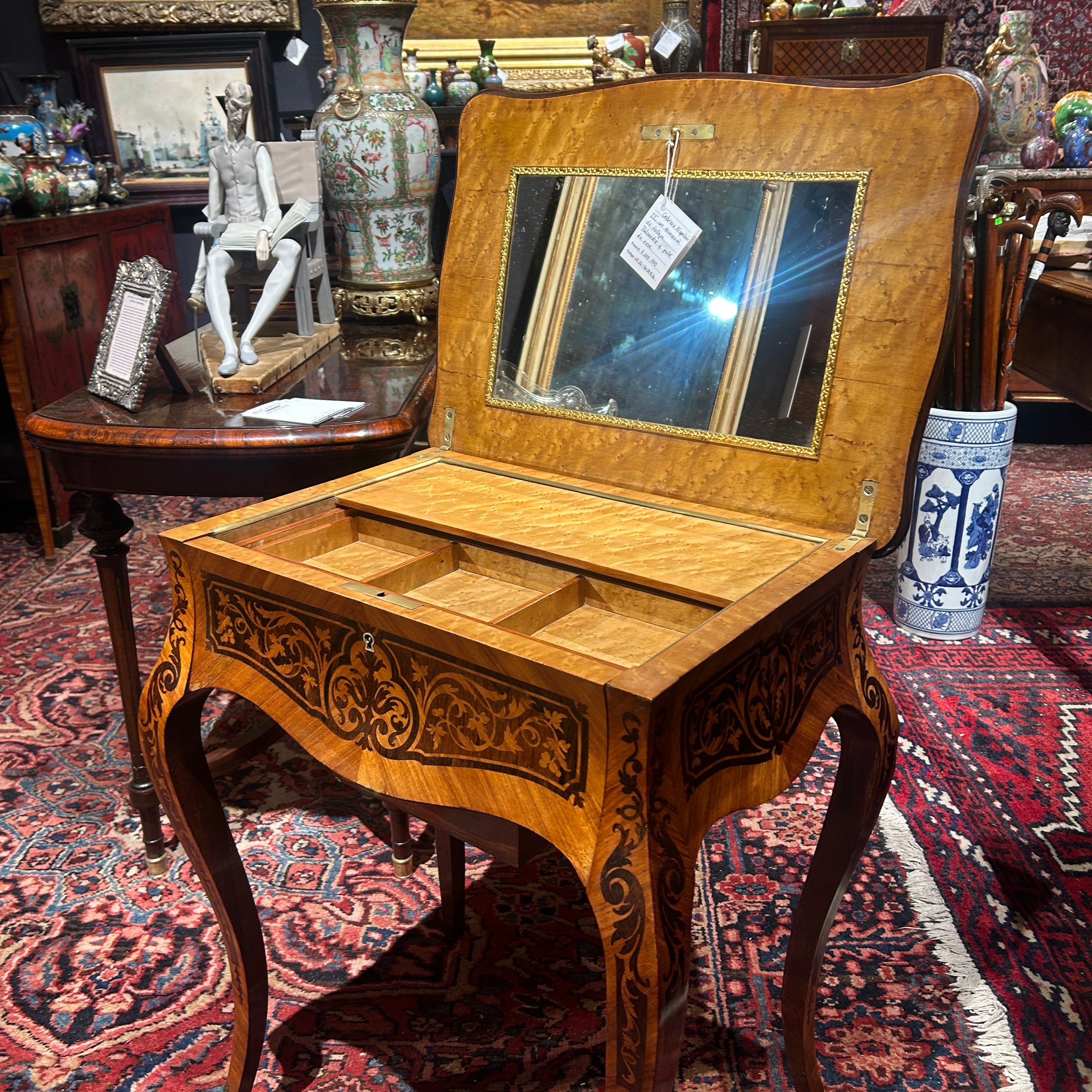 Maravilloso Costurero, peinador o joyero estilo Napoleón III con marquetería de palisandro y bois de rose representando follaje. Tapa con espejo, interior con enchapado de raíz de olmo, cajón frontal y un cajón tipo costurero debajo. Decoración de latón grabado 'EC'. Francia, 1930s.
