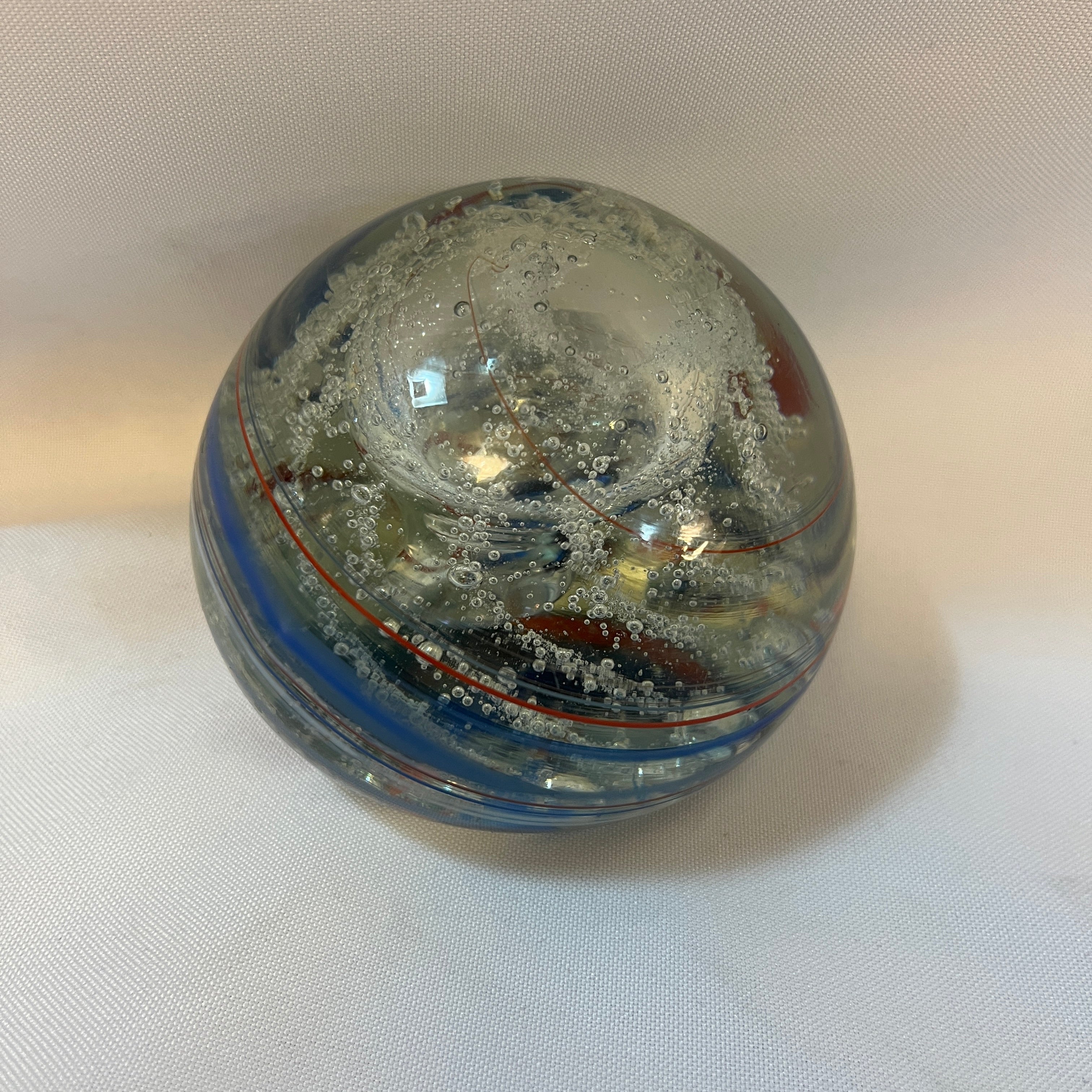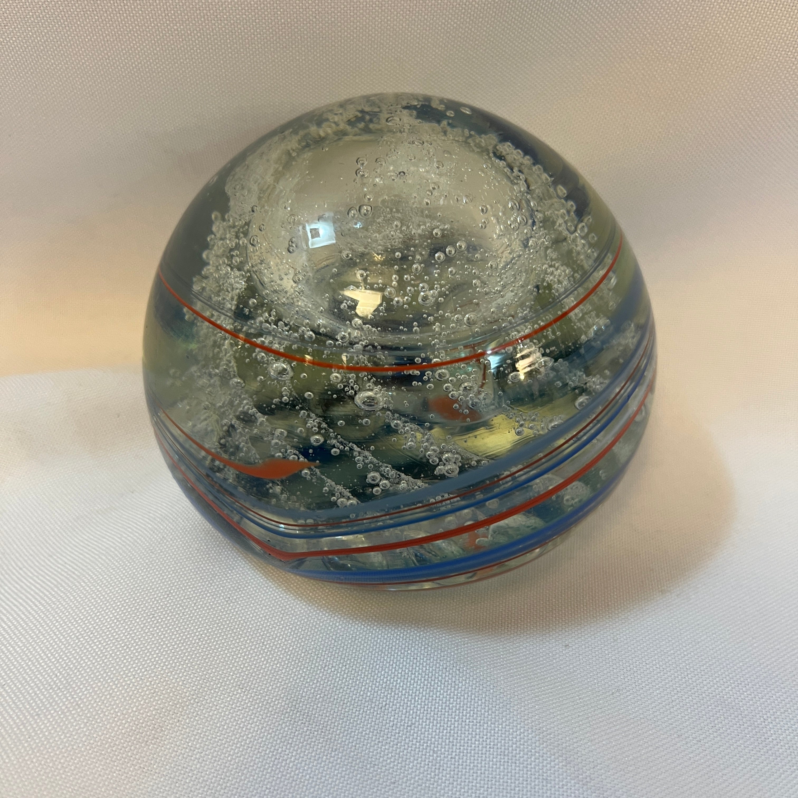 Bello pisapapel francés de vidrio soplado, con los colores patrios. Es una pieza en homenaje al reconocido piloto francés Gerard Pradelle (fallecido el 2001), en su base se puede observar su firma.