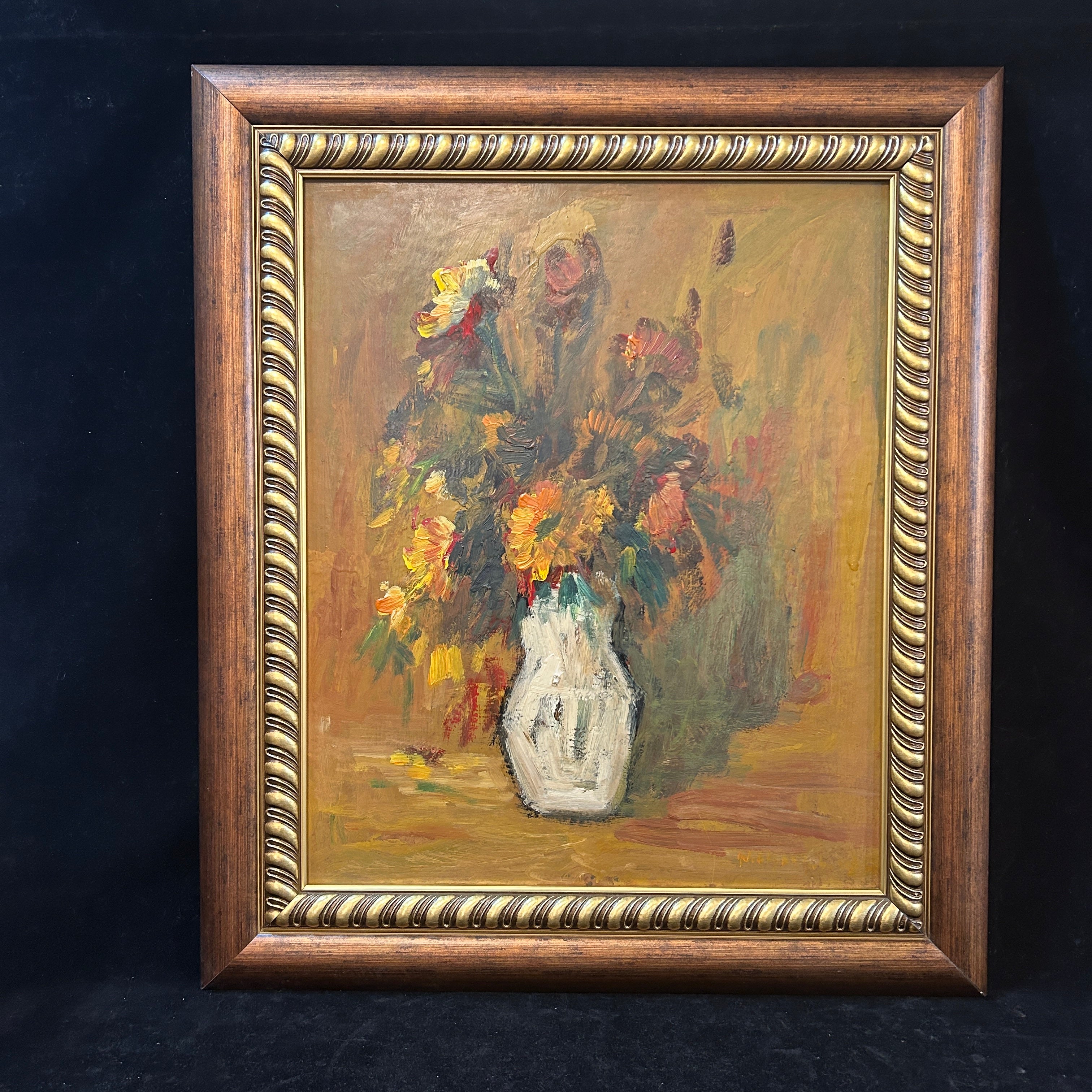 Preciosa naturaleza muerta del talentoso pintos chileno Raúl Ulloa Burgos. La pintura nos entrega un jarrón blanco muy centrado con un buquet de flores multicolor rebalsándolo y algunos pétalos en el suelo. La pintura viene enmarcada con un marco sobrio de madera con una sutil decoración dorada que complementa perfectamente la composición.