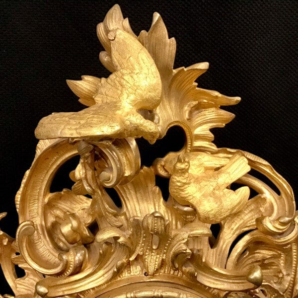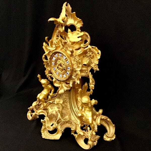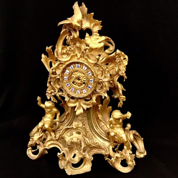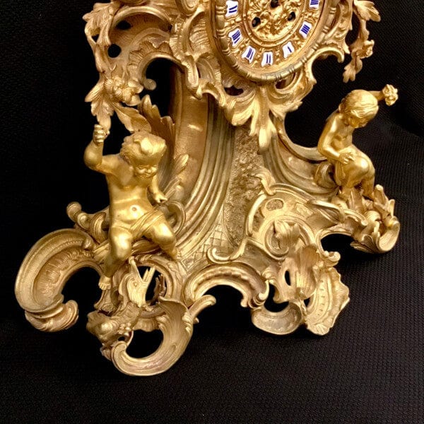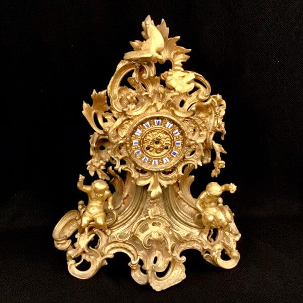 Reloj decorativo estilo Luis XV. Con base de mármol verde y estructura en bronce ormolu.