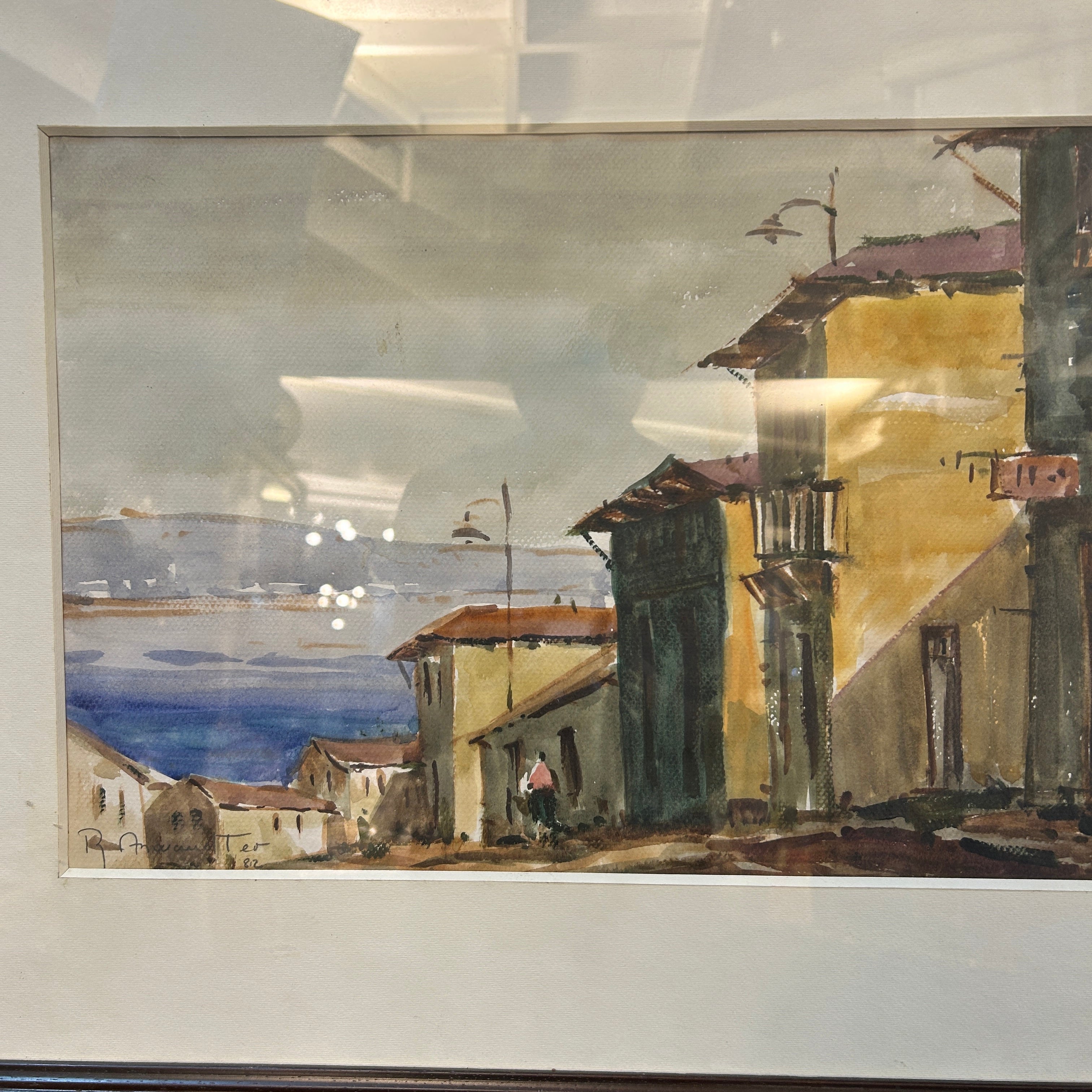 El talentoso acuarelista Ricardo Anwandter nos presenta un paisaje colorido de lo que parece ser un cerro porteño con vista al puerto. La pintura nos lleva a una escena clásica de la belleza de los cerros de Valparaíso. Es esa belleza clásica que caracteriza los paisajes porteños. Podemos ver las casas a un costado del camino de una baja hacia el puerto y el azul intenso de un mar histórico que baña la falda de los cerros. La obra está firmada con fecha '82.