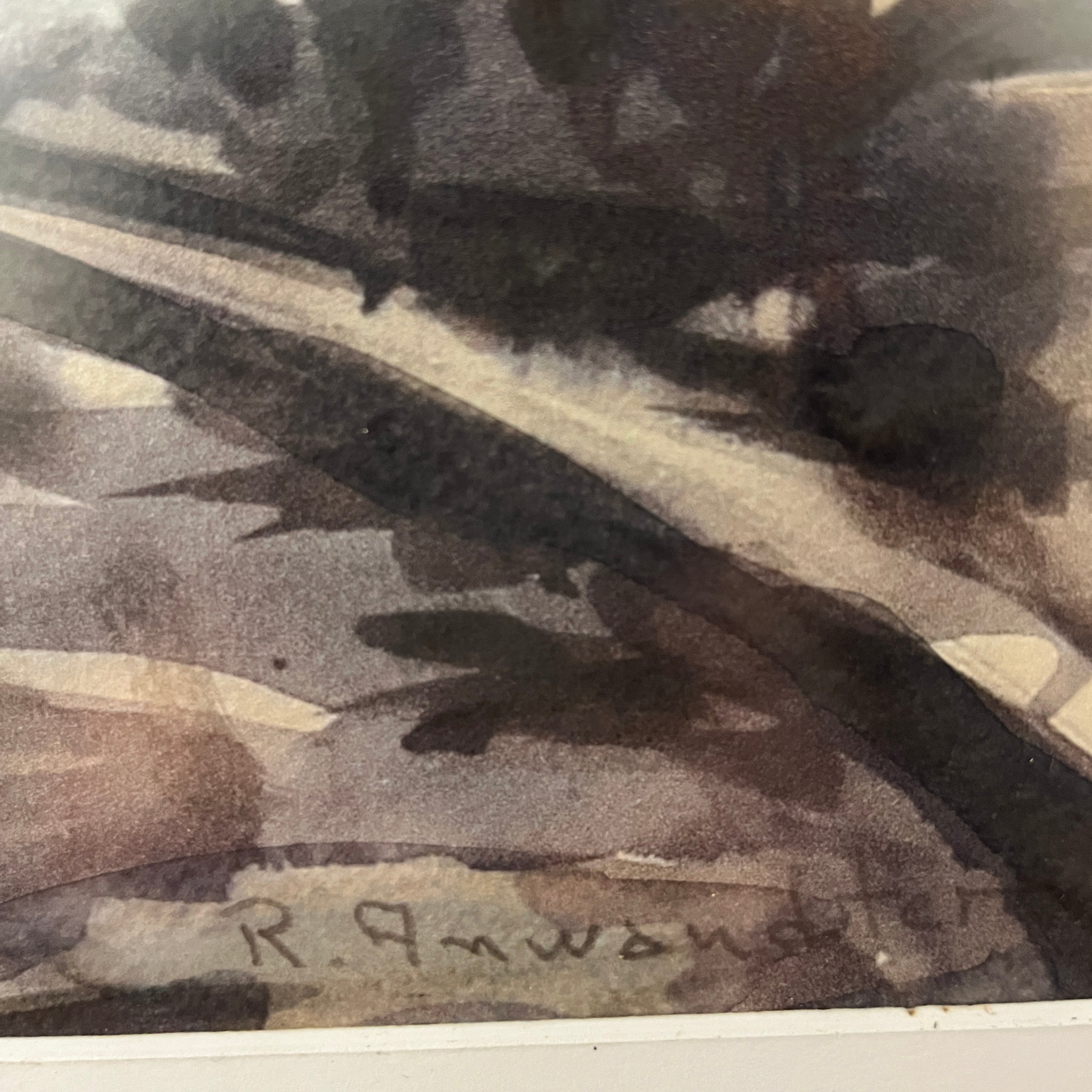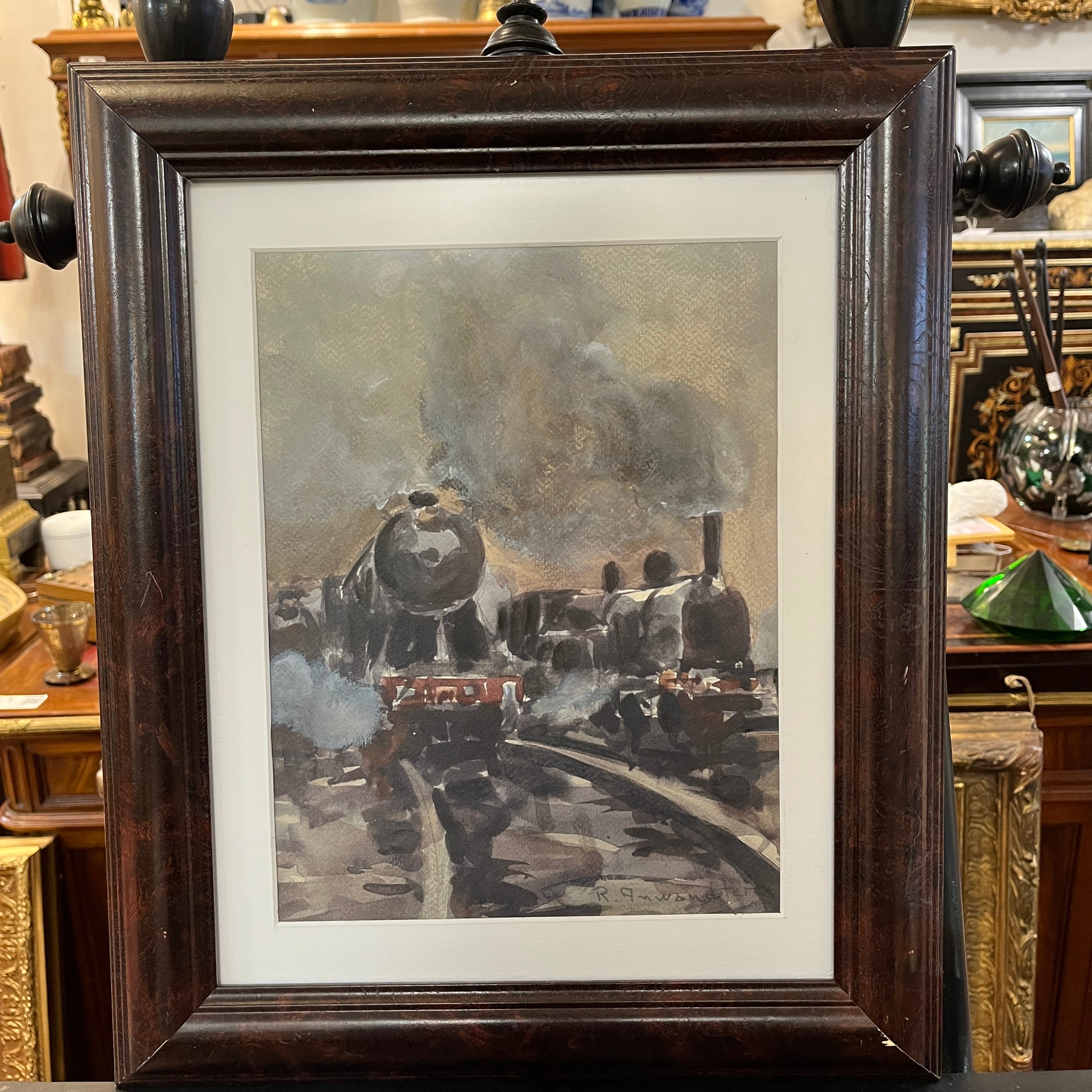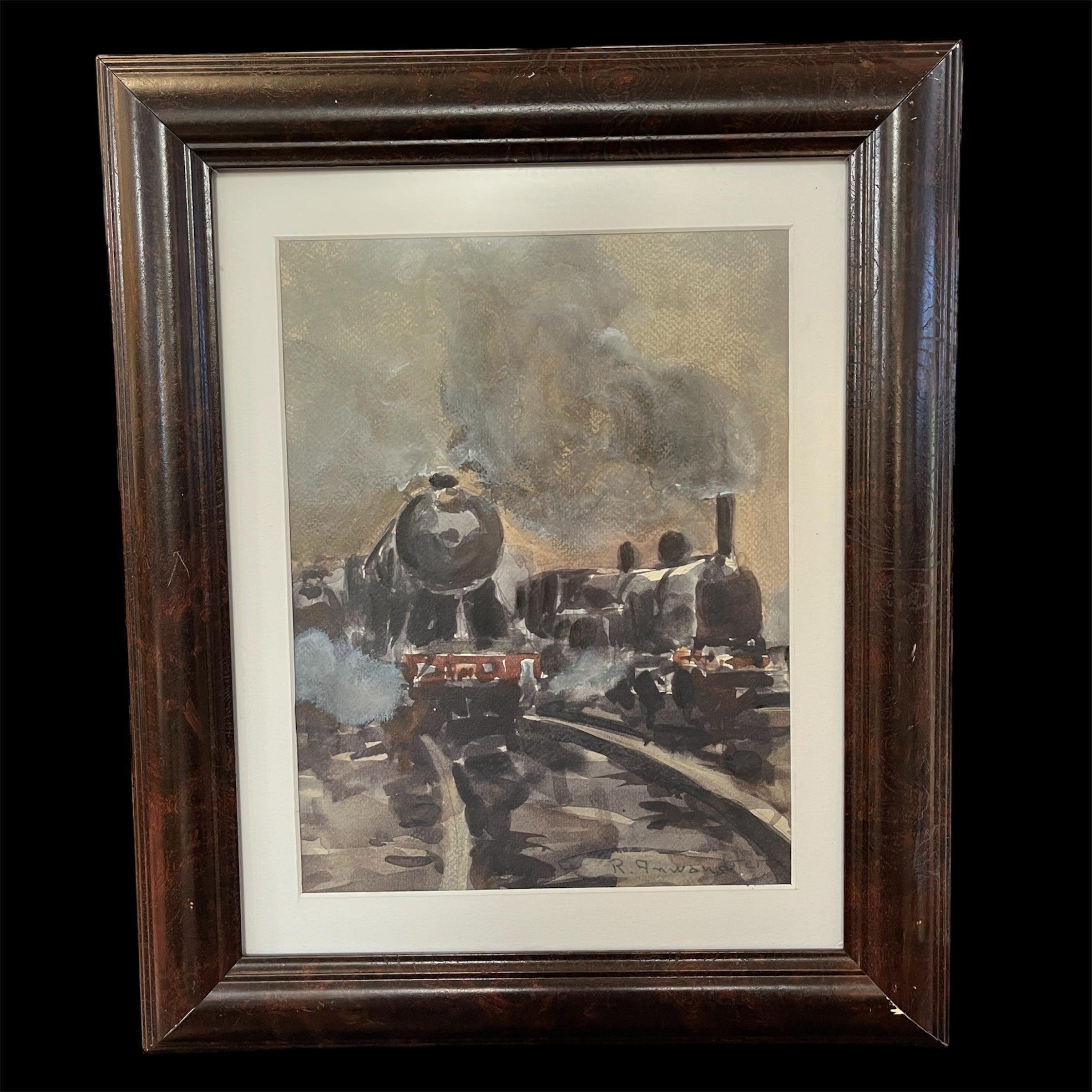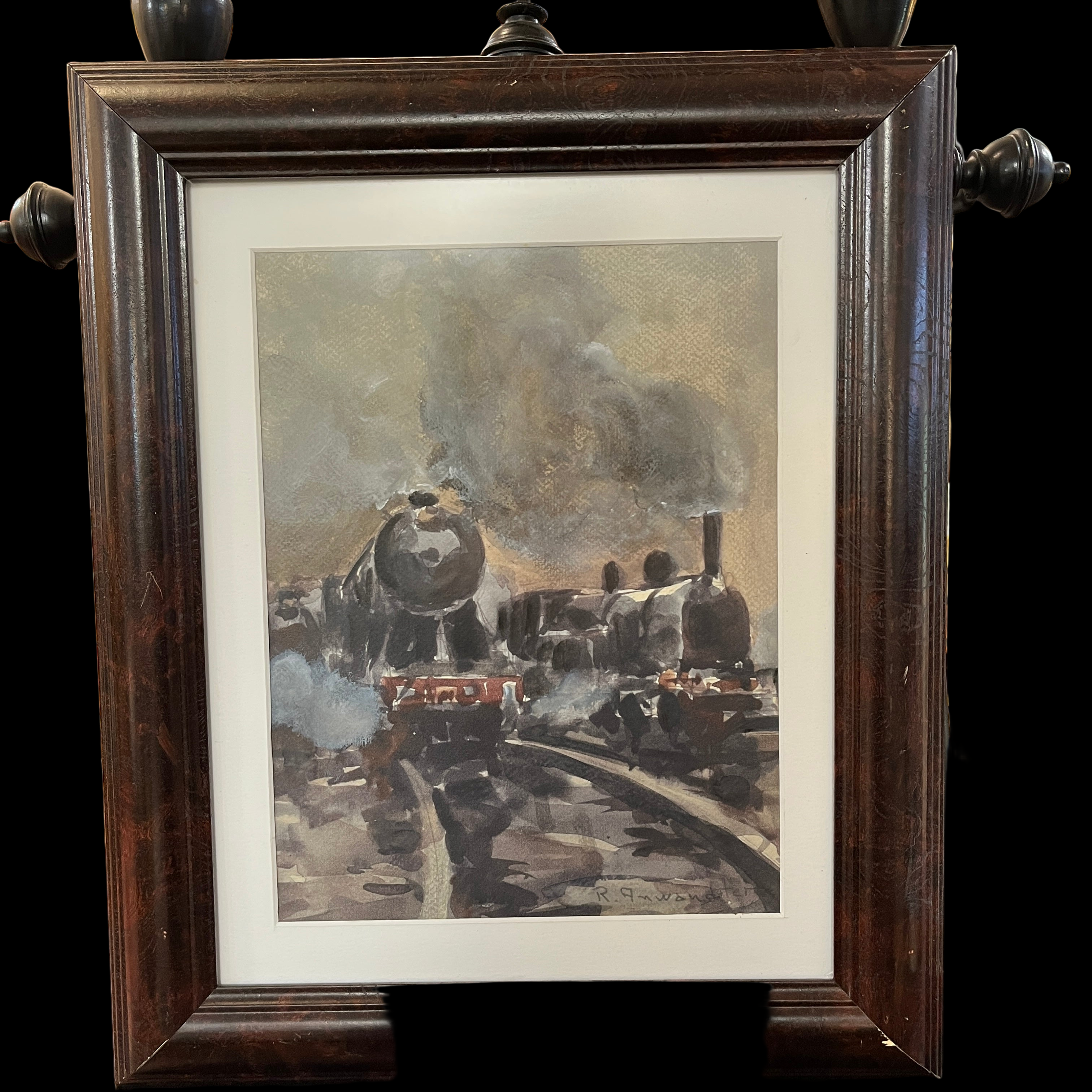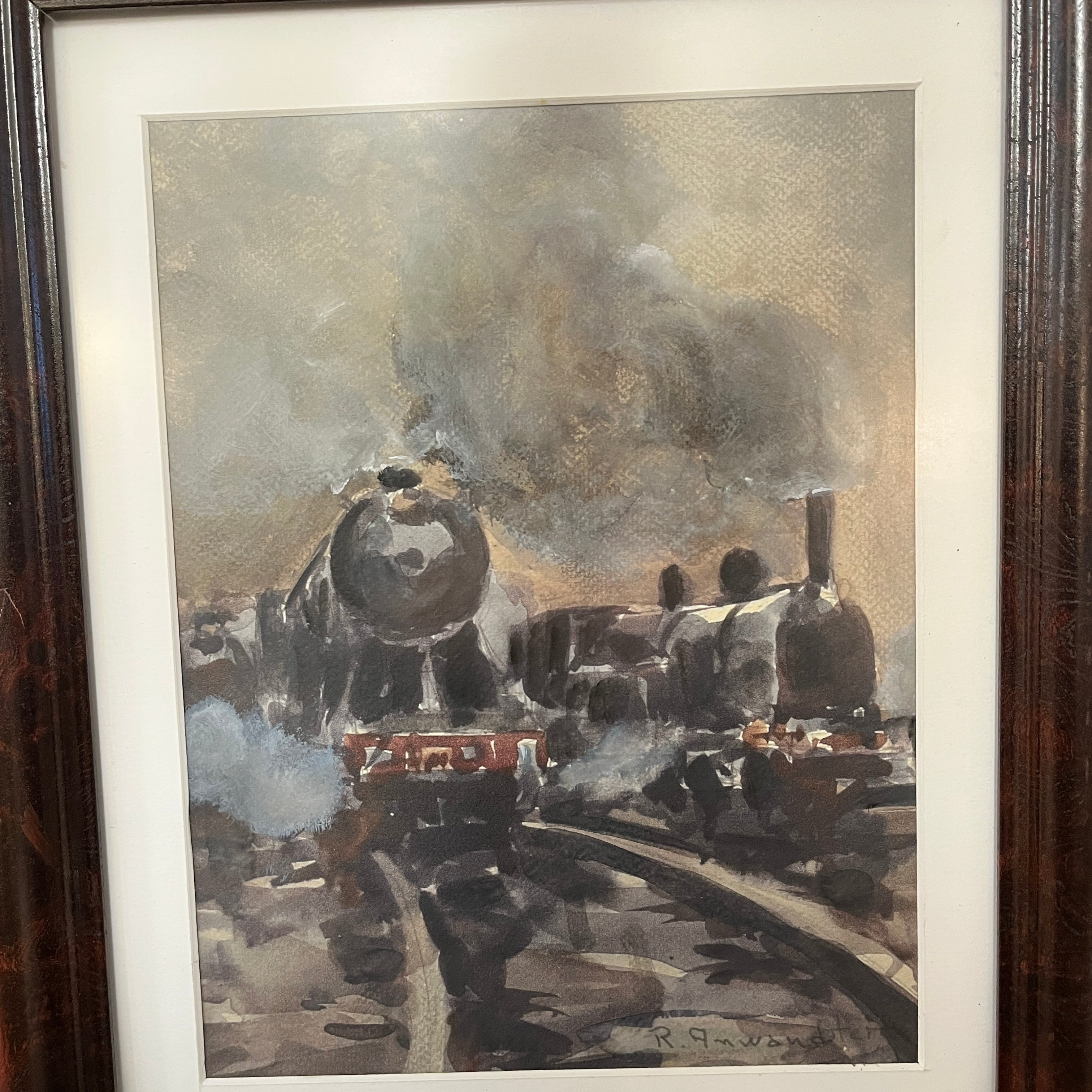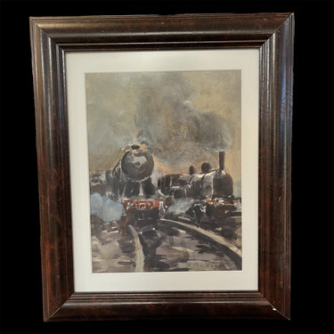Acuarela sobre papel del pintor chileno Ricardo Anwandter. Destacan dos locomotoras en movimiento con un potente vapor acompañándolas sobre ellas. La acuarela viene enmarcada en madera oscura y sencilla que permite dar protagonismo a la obra.