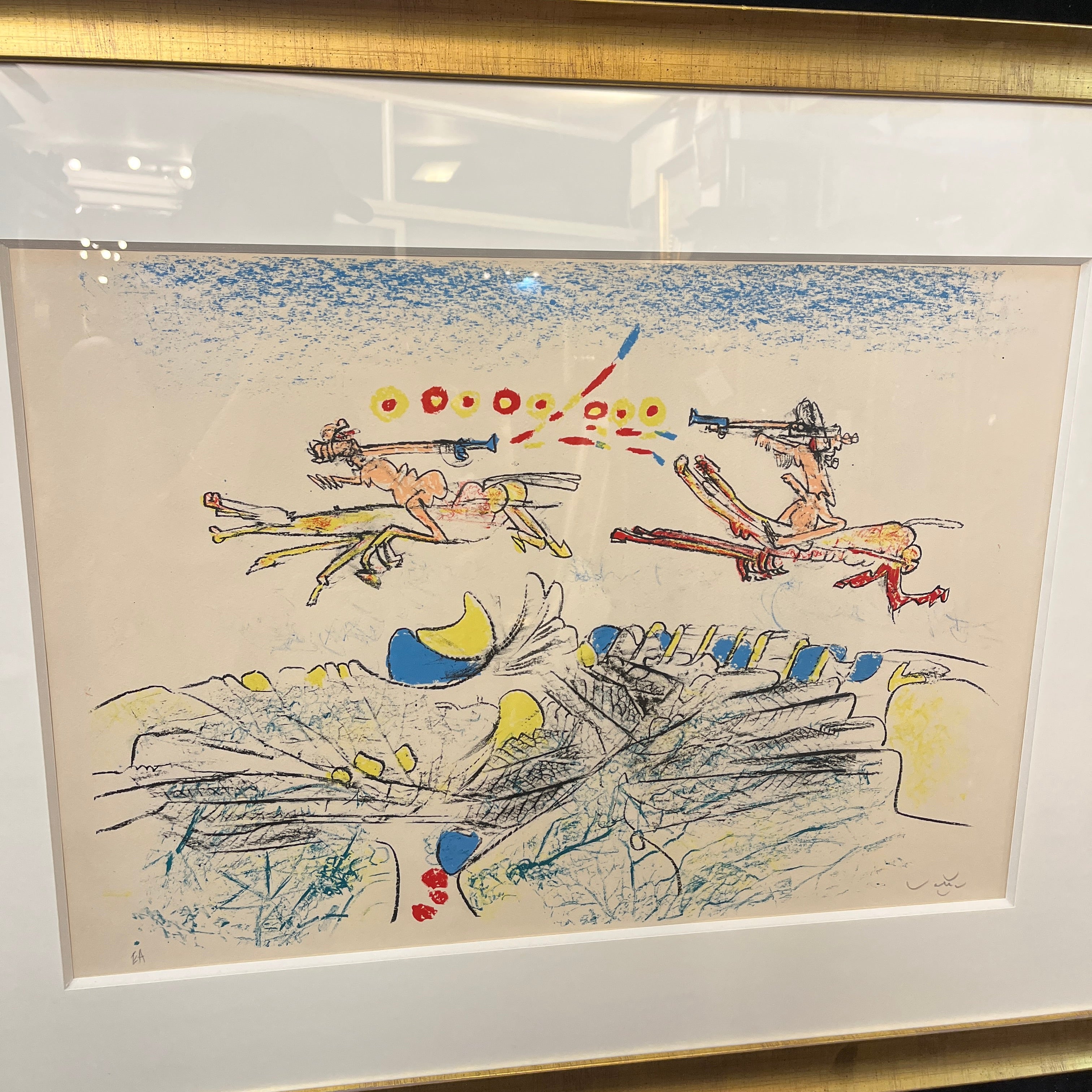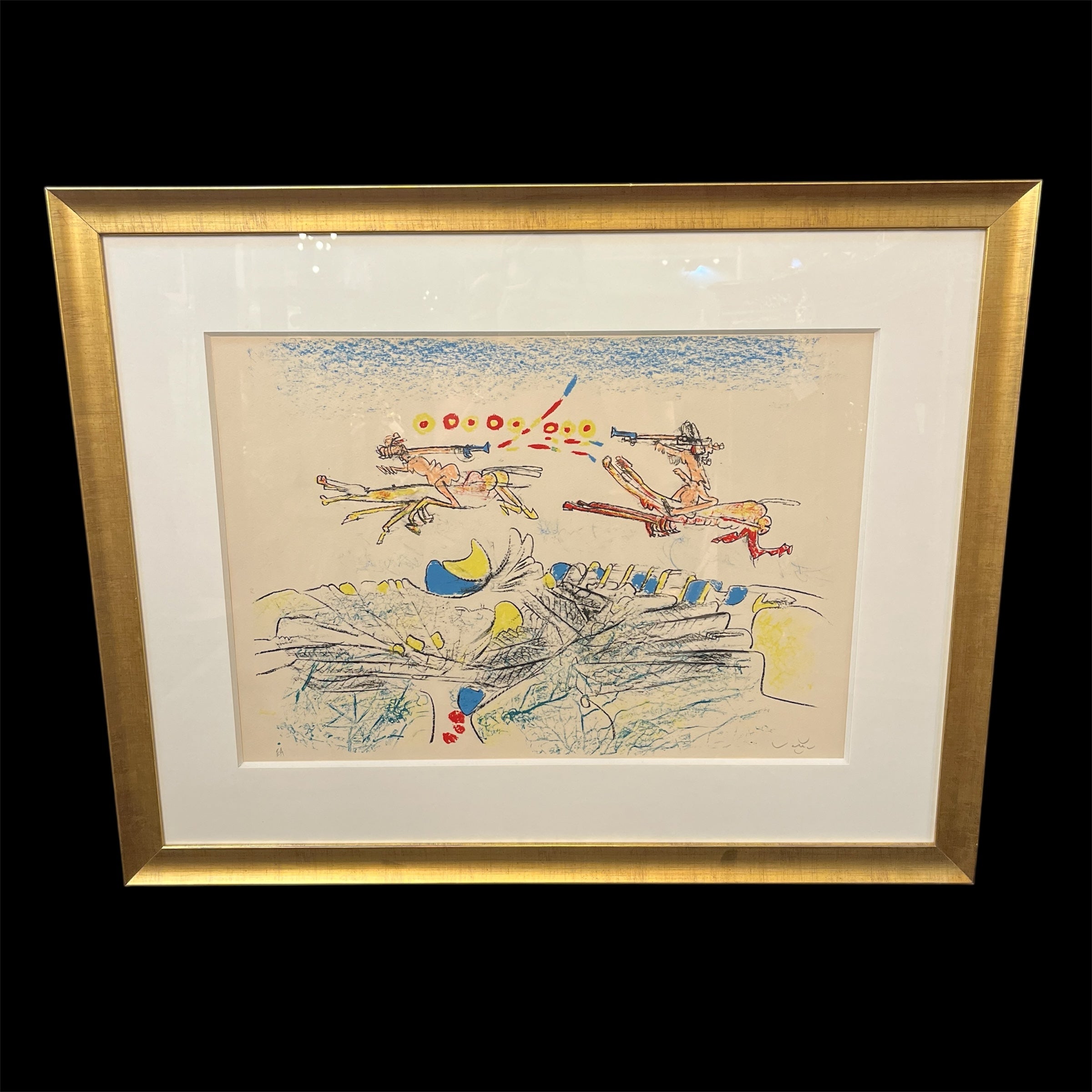 Litografía sobre papel del destacado artista surrealista chileno Roberto Matta, titulada ‘Les Jupitiens’. La obra se encuentra firmada y numerada a mano. En este caso se lee EA, siglas para “Epreuve d’Artiste” o Prueba de artista, que corresponden a las copias de la obra fuera de la serie numerada. La obra tiene un marco de madera contemporánea y sobria de color plateado.