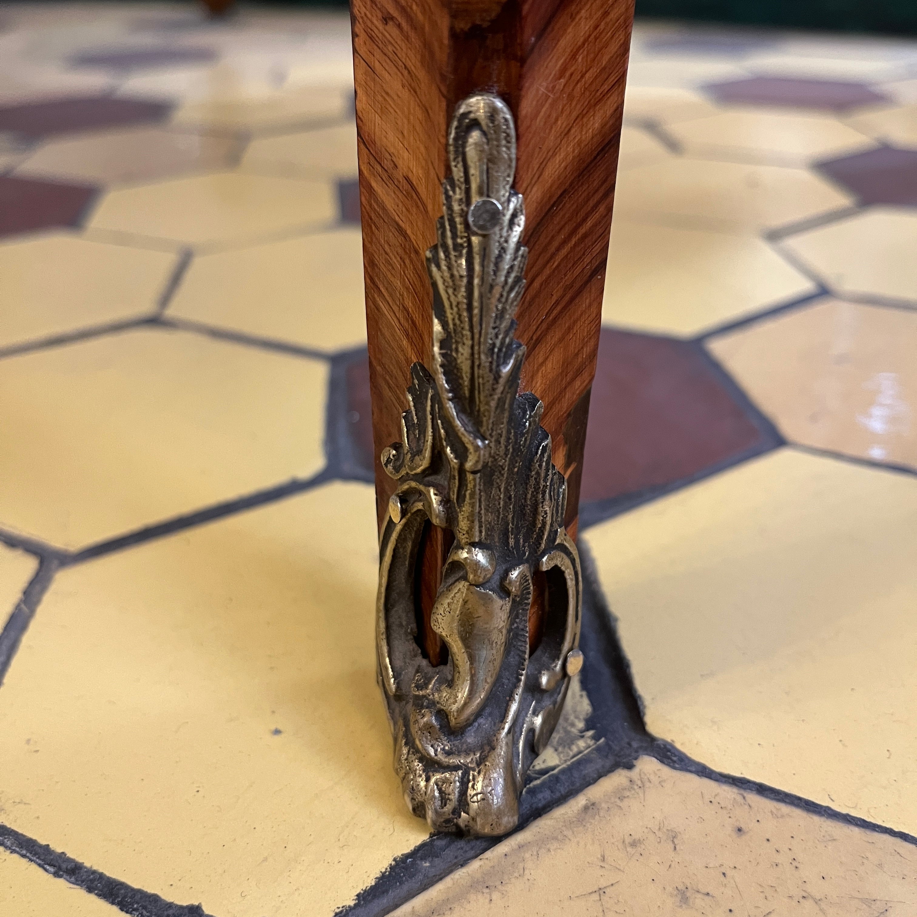 Maravilloso secretaire francés estilo Luís XV, en palisandro con aplicaciones y tiradores en bronce. Su espectacular diseño juega con las vetas de la madera creando diamantes bicolores en toda su cubierta. Las cuatro patas tienen aplicaciones en bronce, como también los bordes superiores. Posee un cajón central que ocupa todo el ancho y puerta abatible, que en su interior tiene una cubierta de cuero cafe con borde de un dorado floral y tres cajones pequeños en perfectas condiciones.