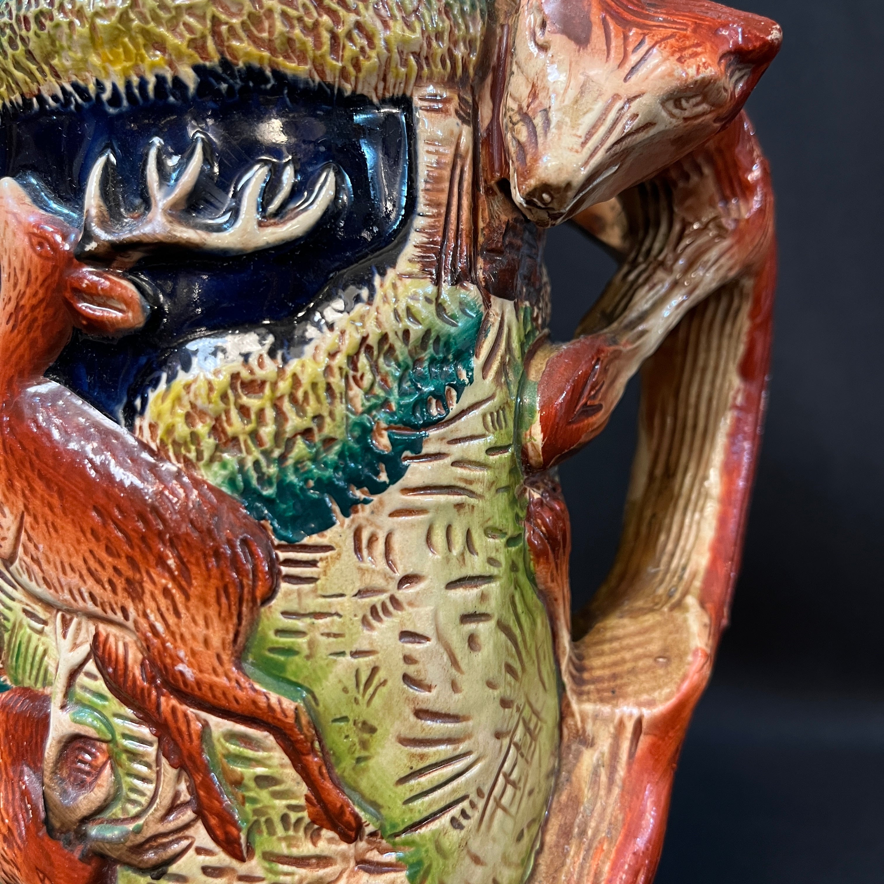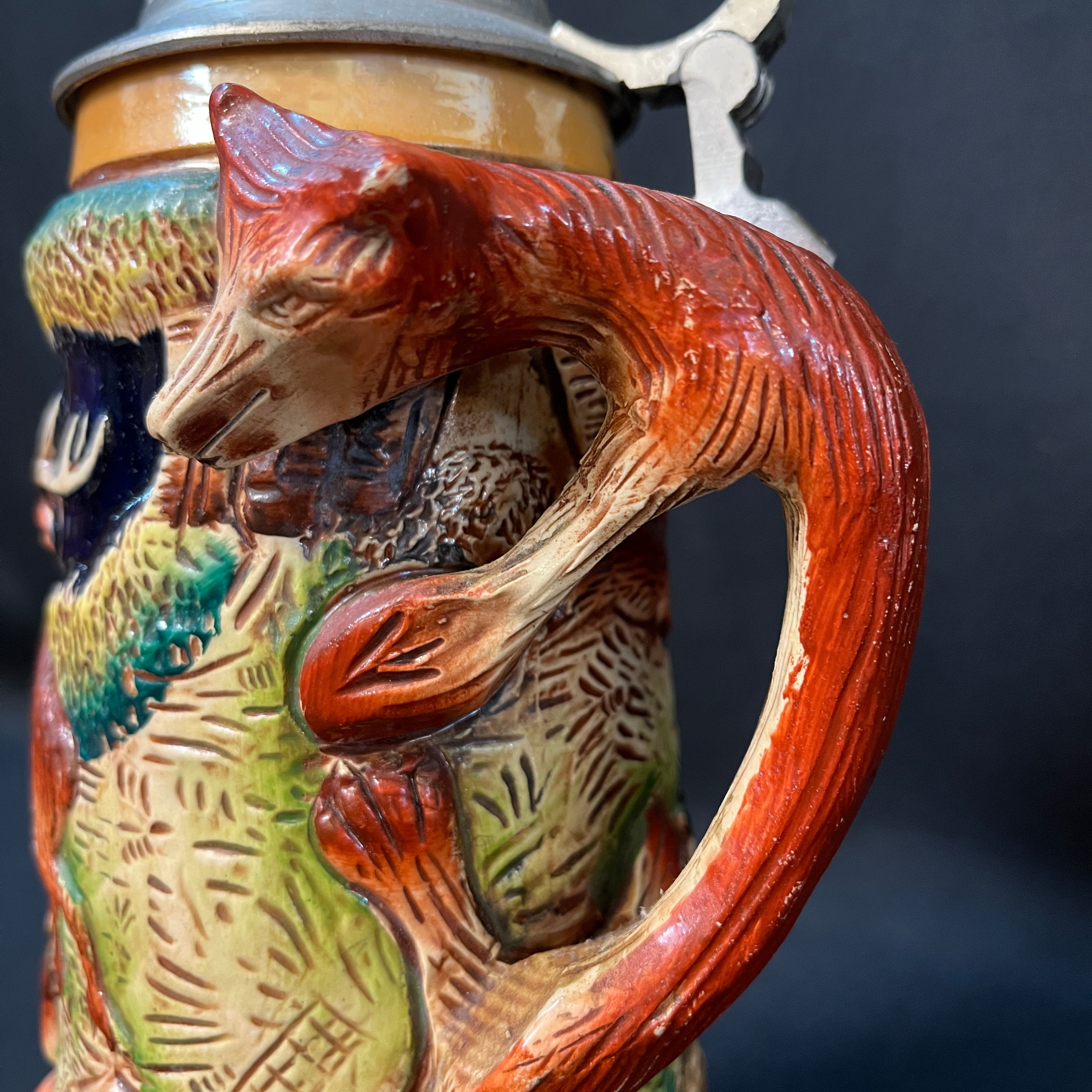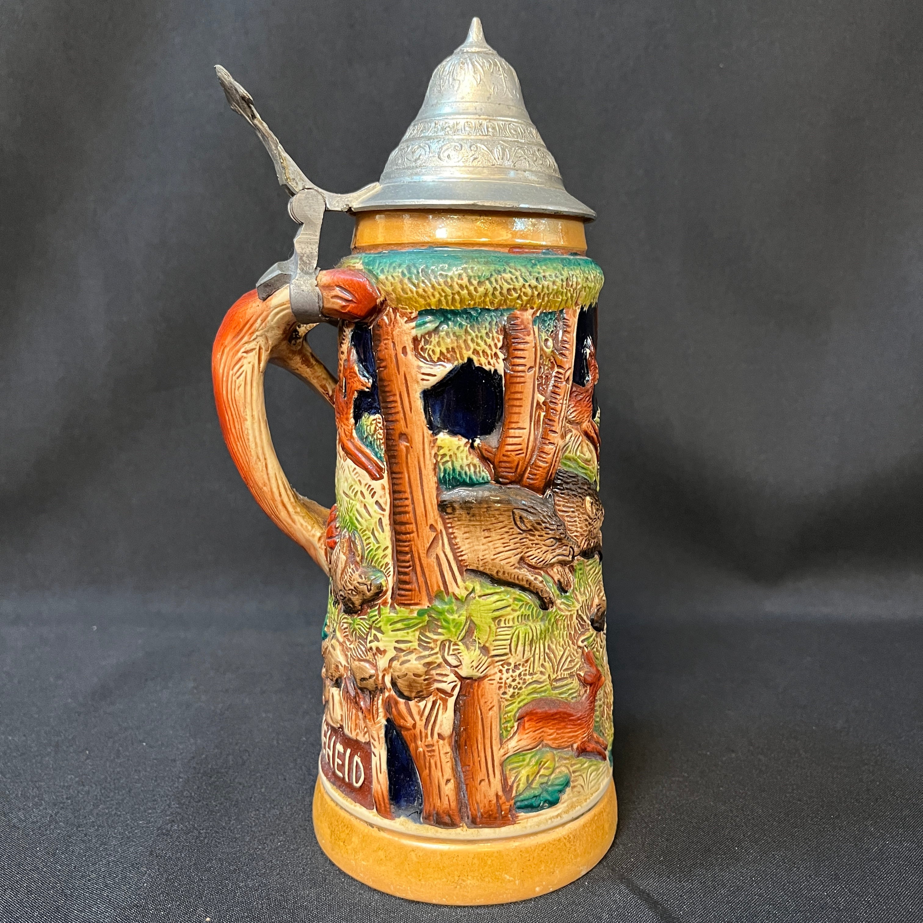 Esta pieza, conocida también como 'La alegría del cazador', es una jarra de cerveza coleccionable Alemana con temática de caza, destacada por sus relieves detallados, a menudo pintados a mano y una tapa de peltre.