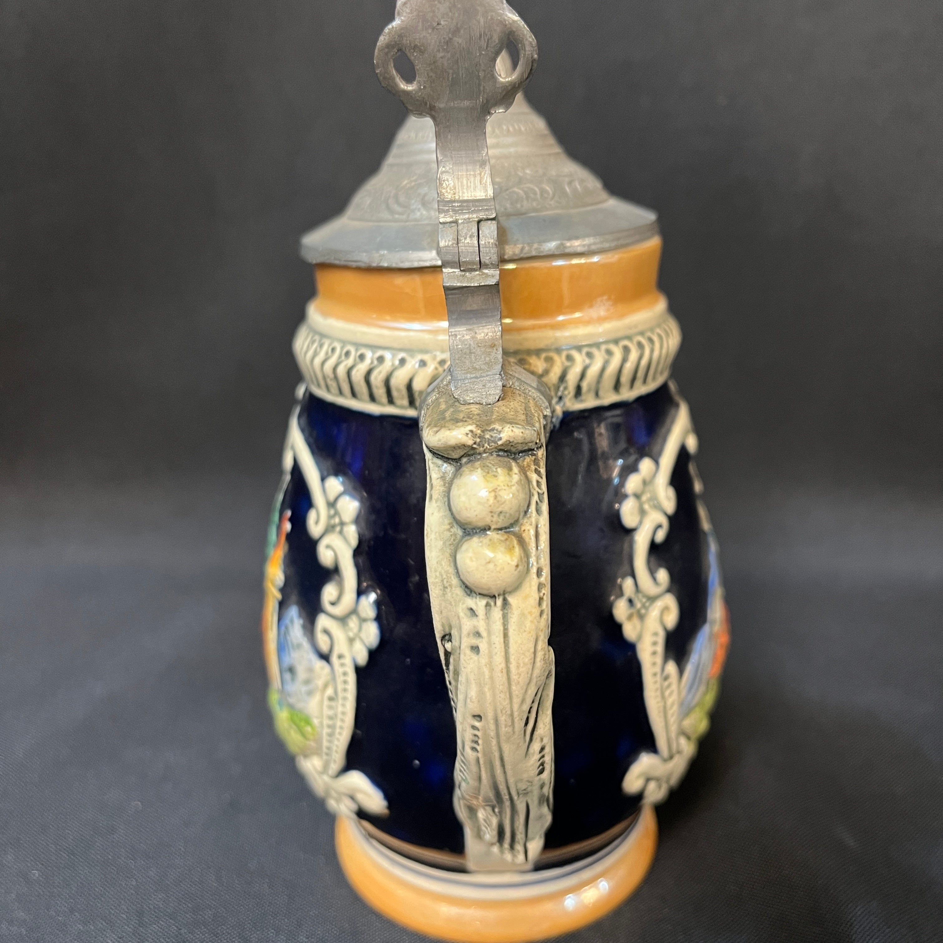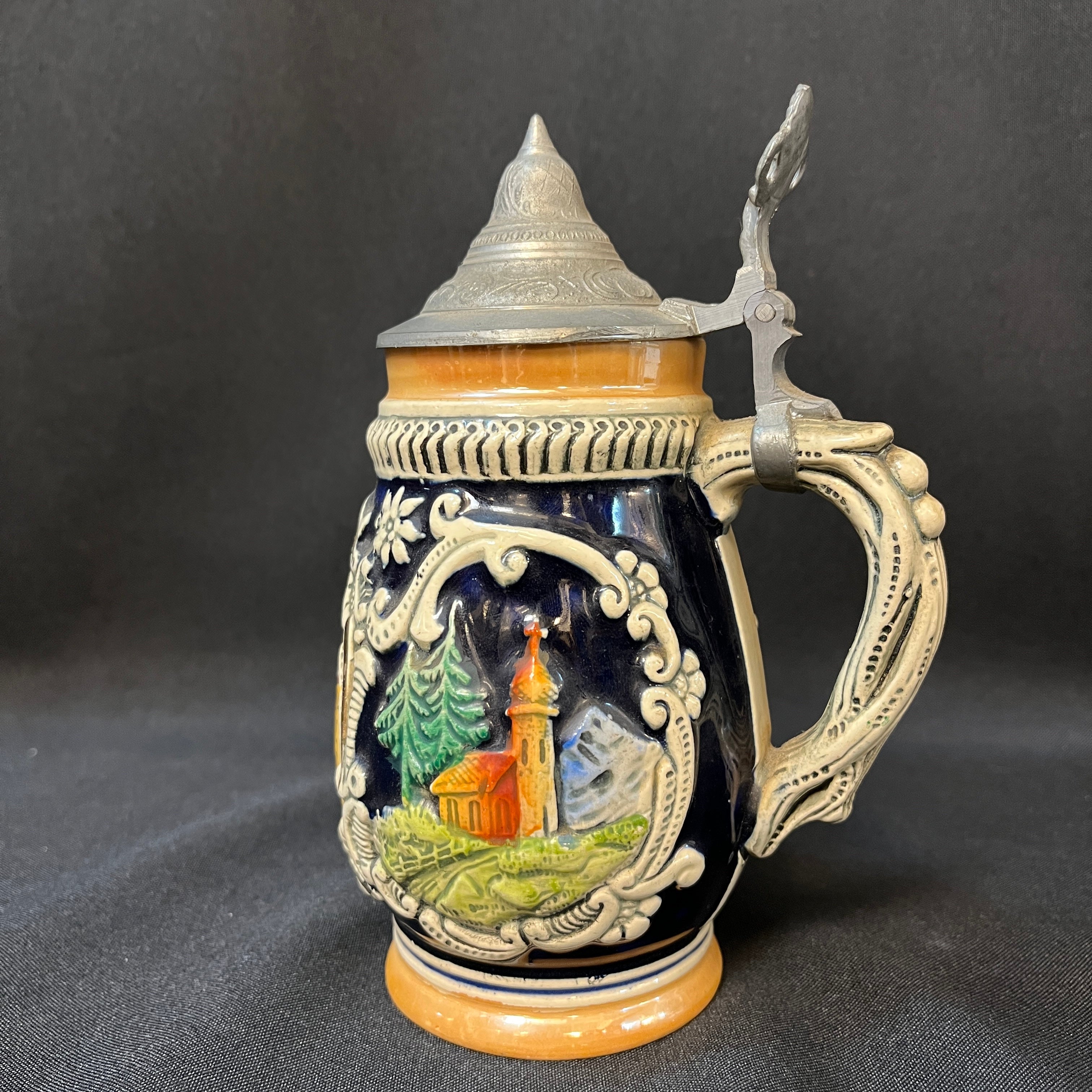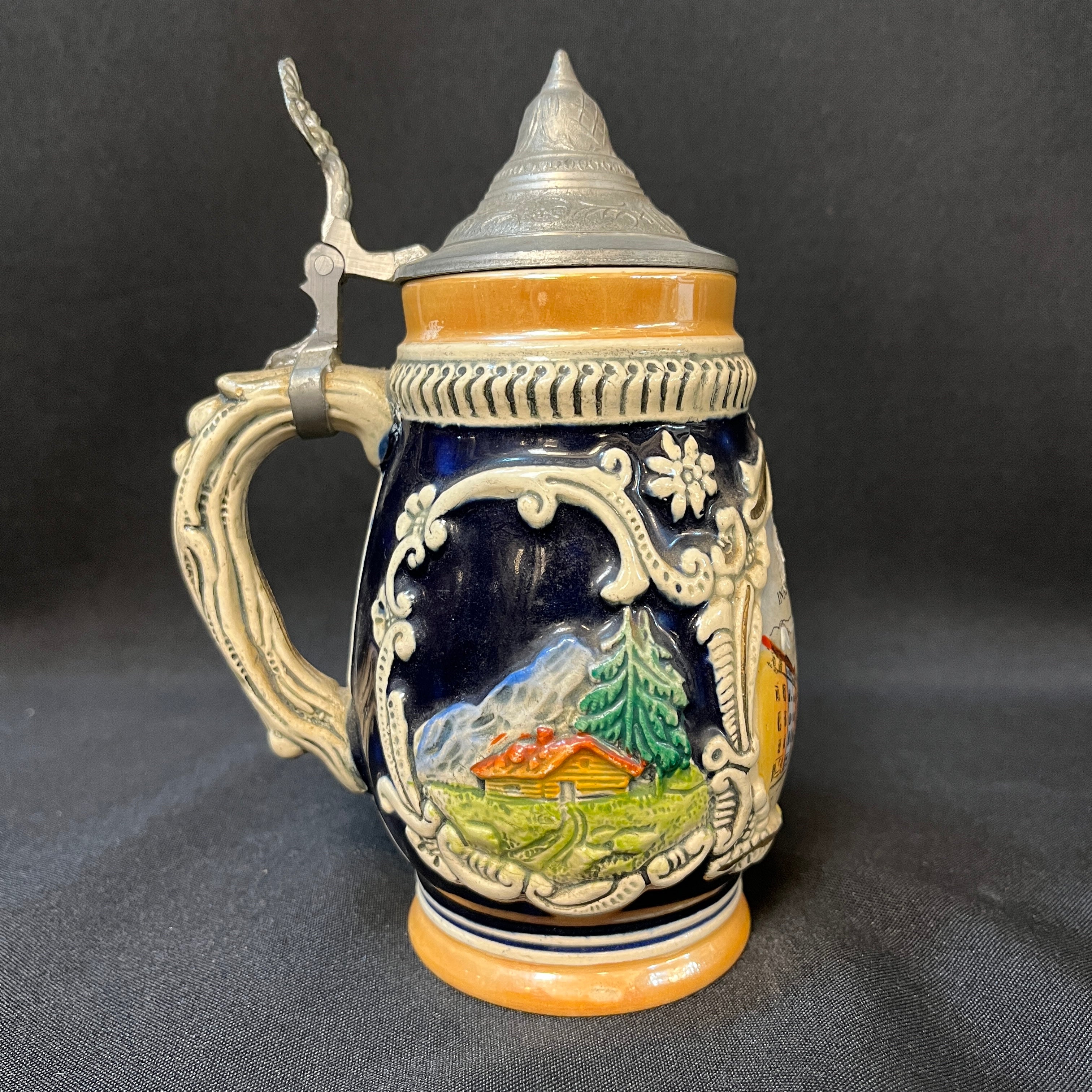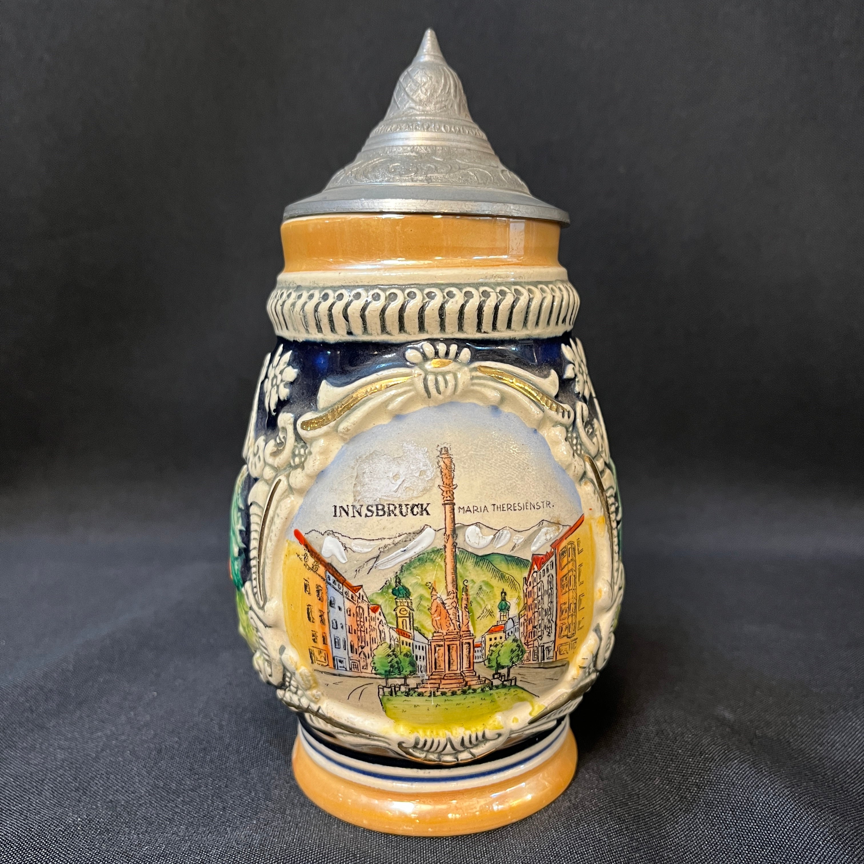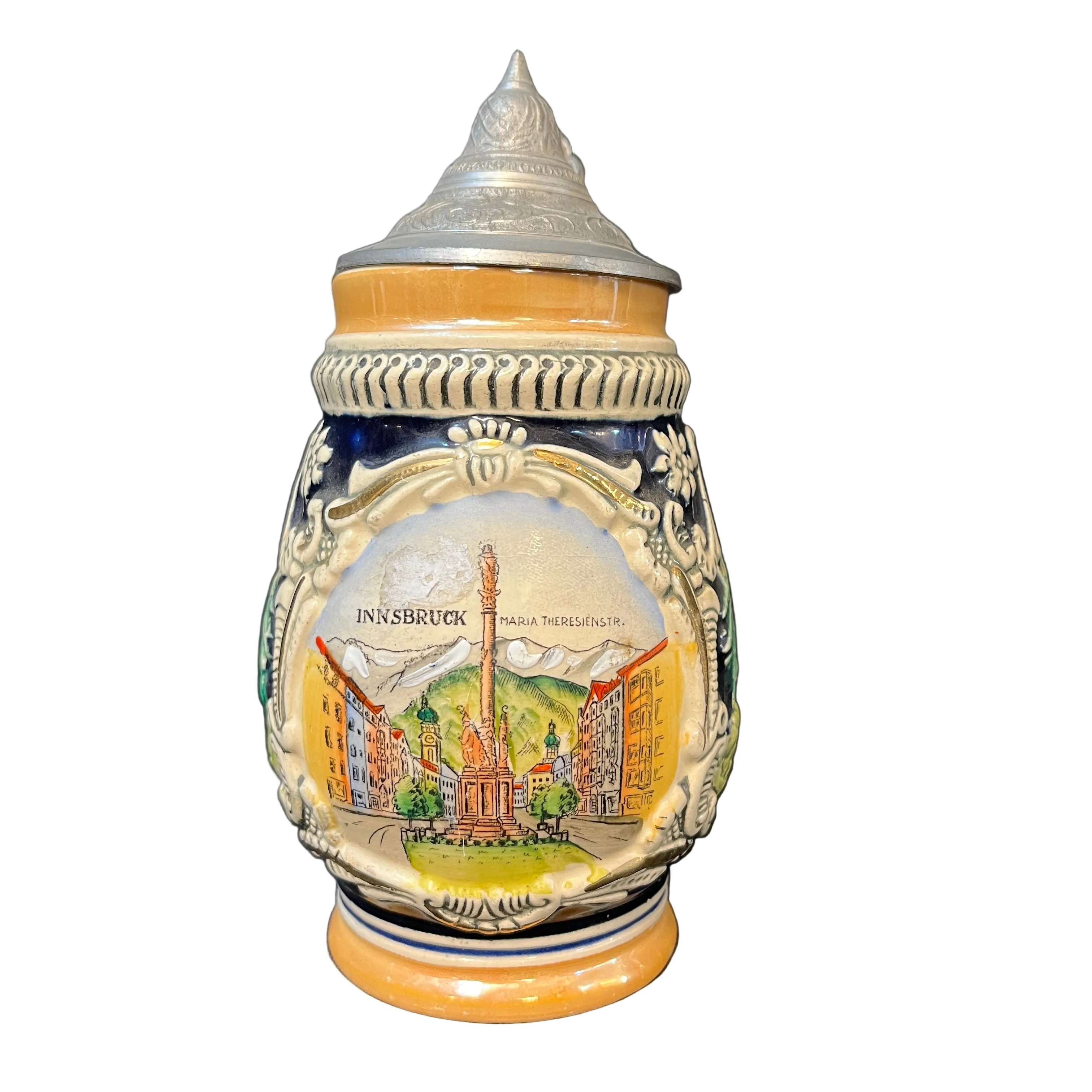 Shopero alemán de porcelana de pequeño tamaño con tapa de peltre. La jarra presenta la escena central es la clásica plaza María Theresien, en Innsbruck, coronada con bellos rosetones blancos y detalles dorados, que se extienden hacia los lado donde nos encontramos con una capilla y una casa rural por el otro