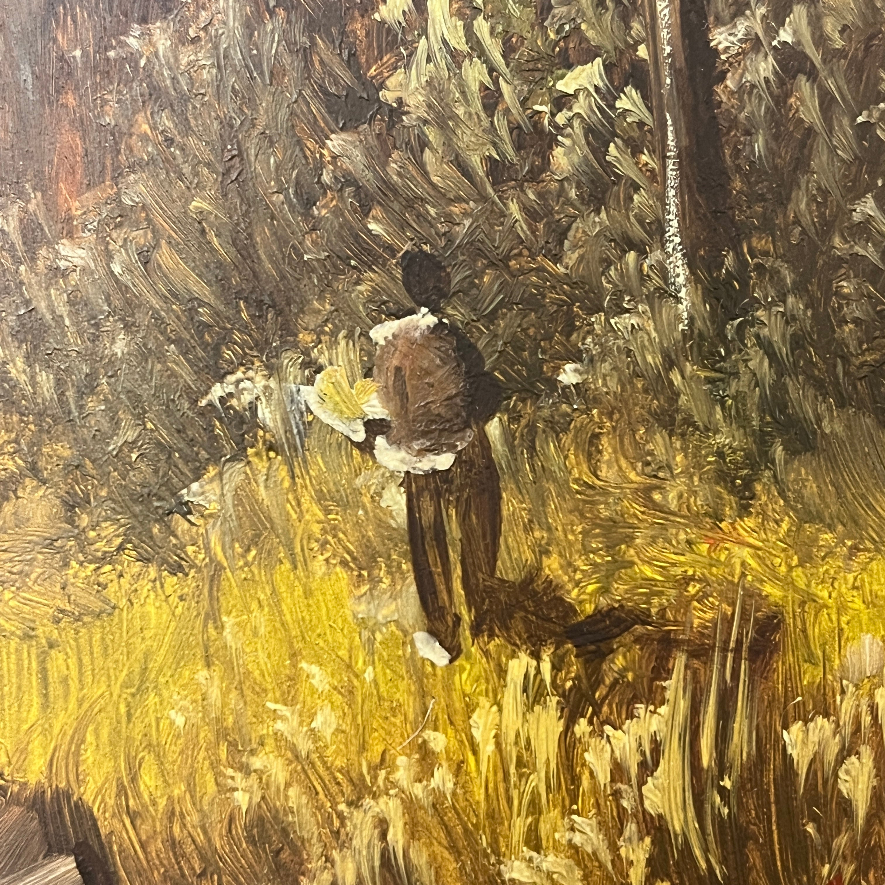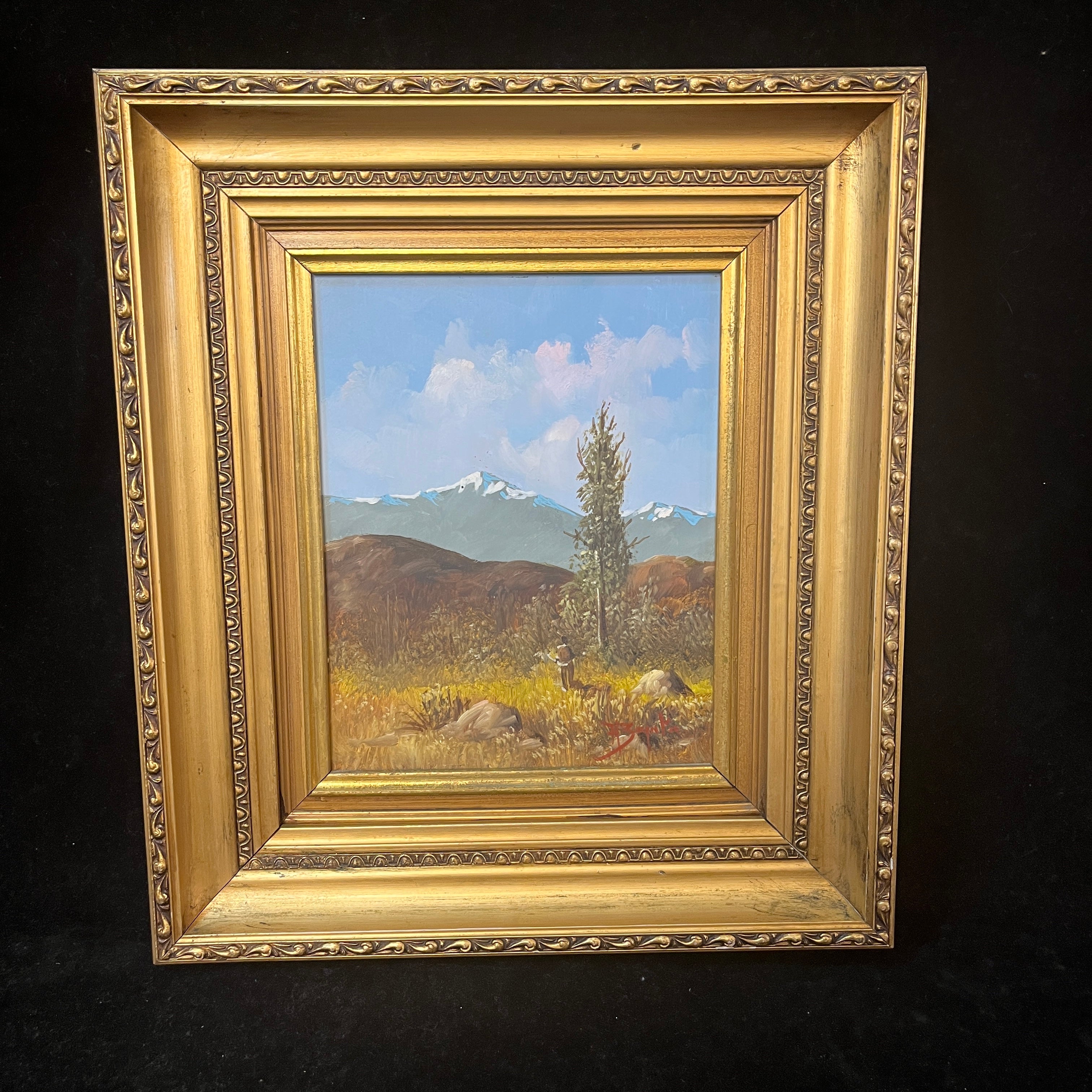 Óleo sobre tela del pintor chileno Hugo Zapata, representando un paisaje en el que un hombre solo contempla la cordillera de Los Andes, rodeado de vegetación. El pintor hace una bella progresión desde los tonos más cálidos y anaranjados del pasto, hasta el cielo celeste, con reflejos rosas en sus nubes. Entre los dos, la cordillera con un tinte verdoso. La obra tiene un marco de madera tallada con sutiles decorados y pintada de elegante dorado.