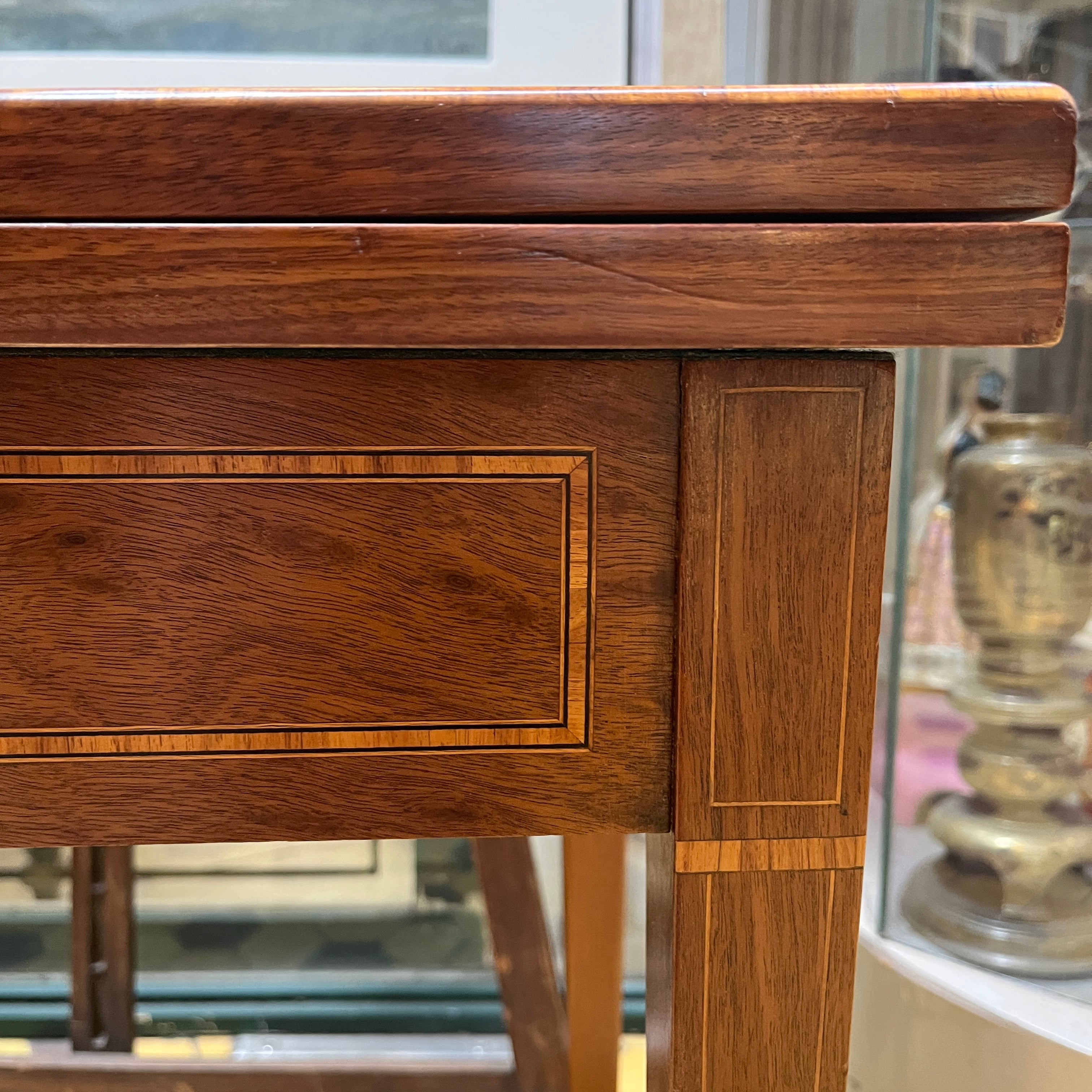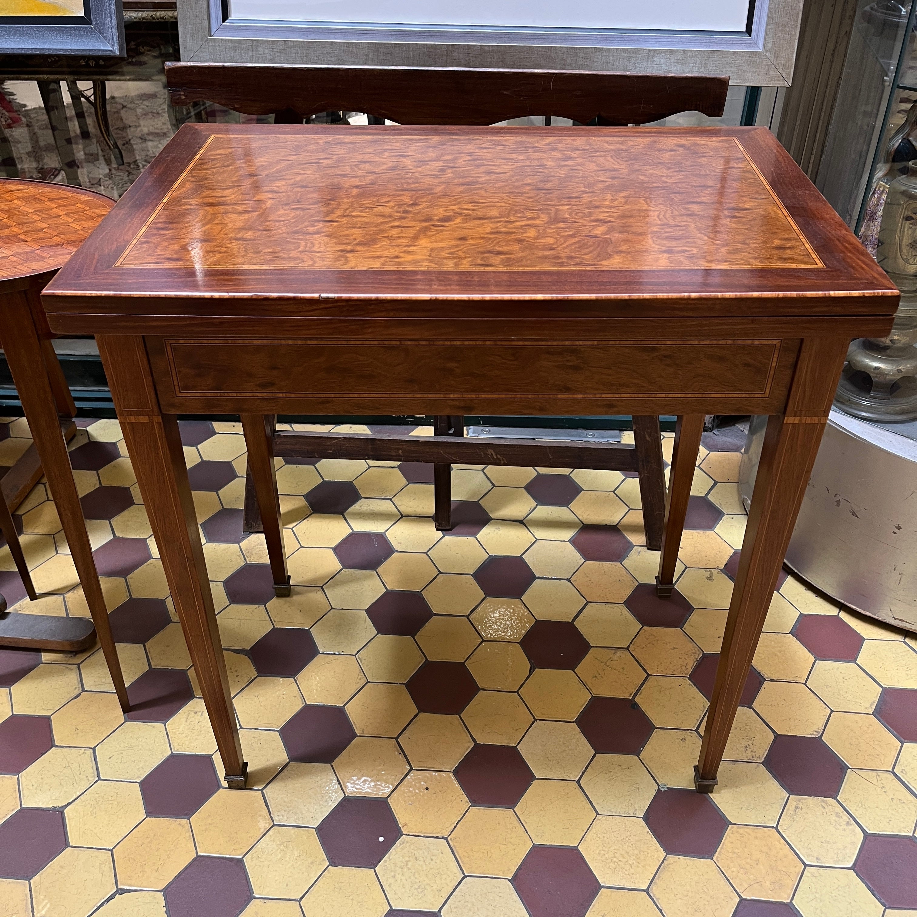 Elegante mesa de juegos francesa estilo Luis XVI en caoba y filetes enchapados en raíz de nogal. La mesa tiene un sistema desplegable, con un paño verde de juego con un bellísimo detalle de cenefa dorada en filigrana en su interior.