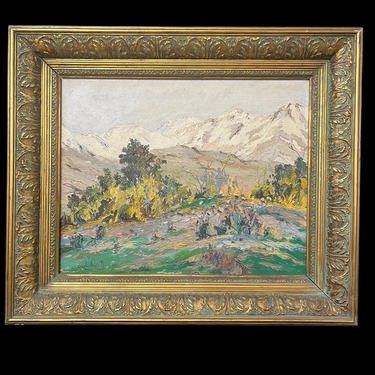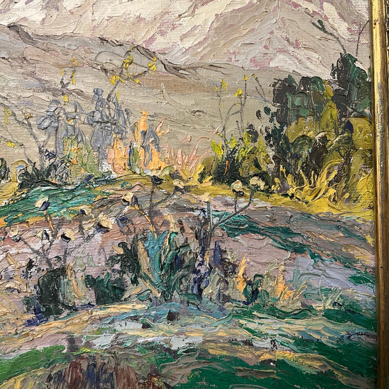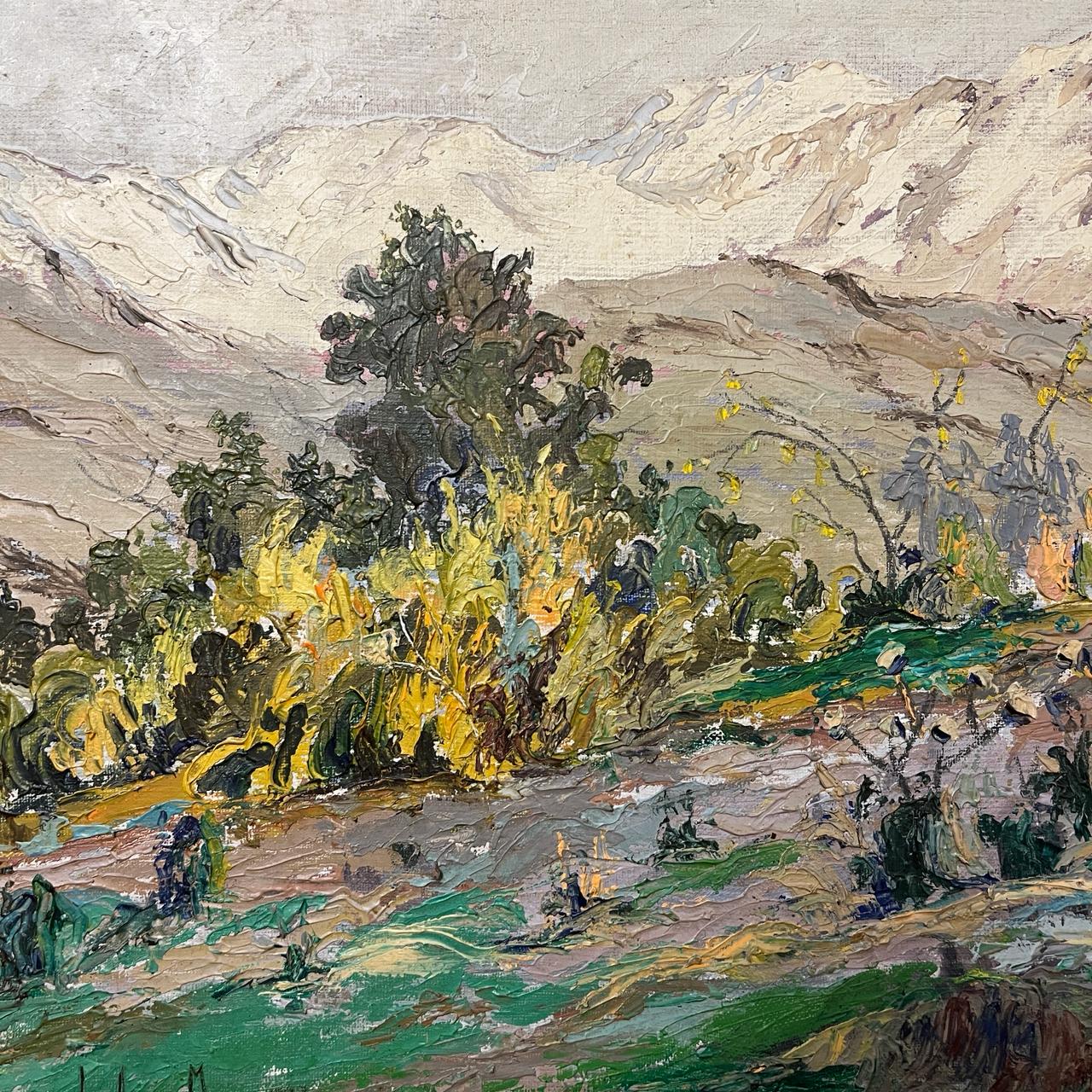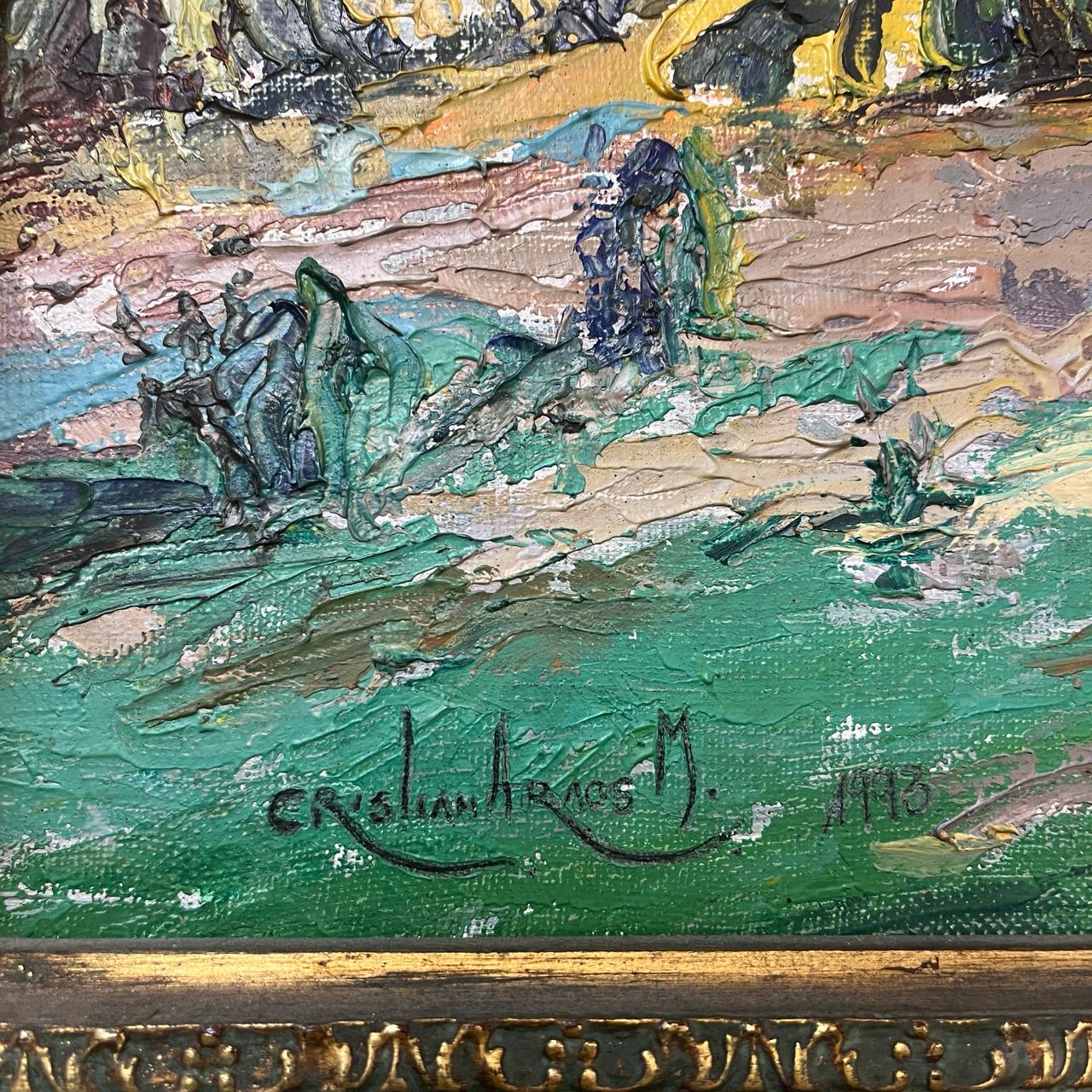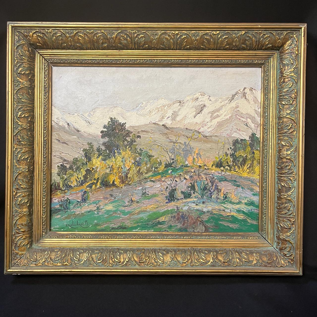 Precioso óleo del talentoso artista chileno Cristian Araos, que nos entrega un paisaje rural de lomas verdes floridas, con grandes arboles y una imponente cordillera de Los Andes nevada. Es una encantadora pintura que nos lleva valorar la belleza de la naturaleza plasmada en una tela. Es una invitación a contemplar escenas atemporales de la naturaleza.
