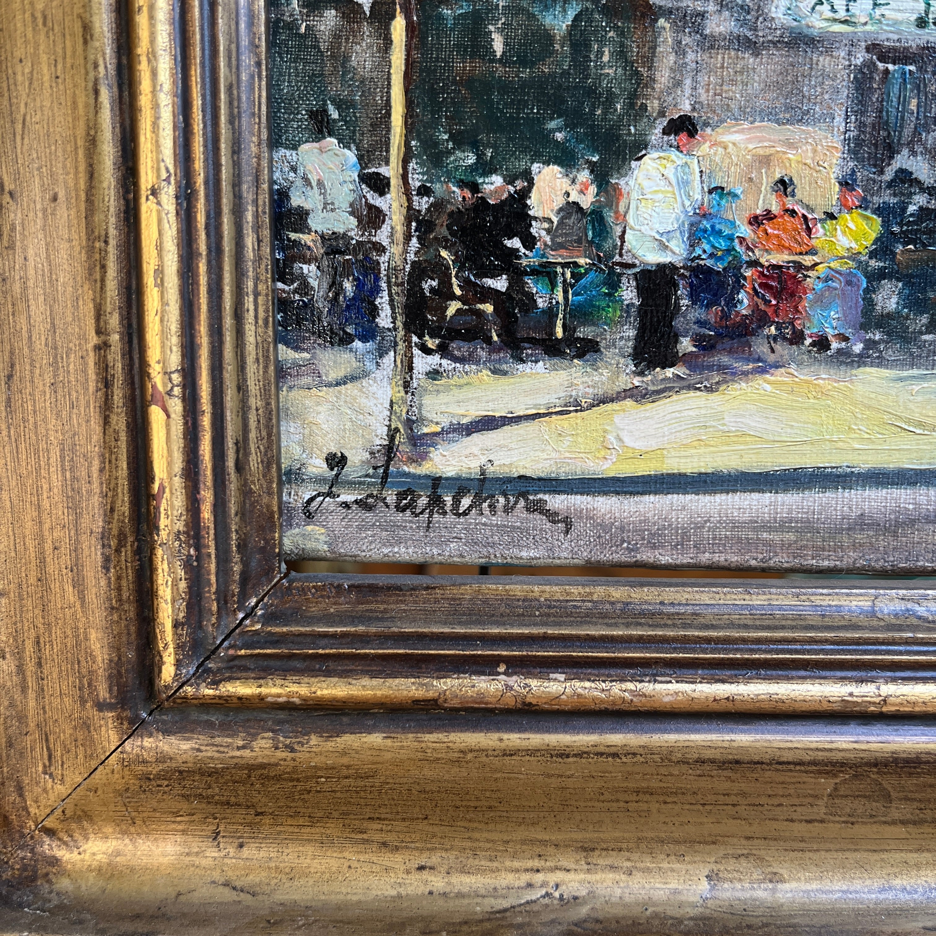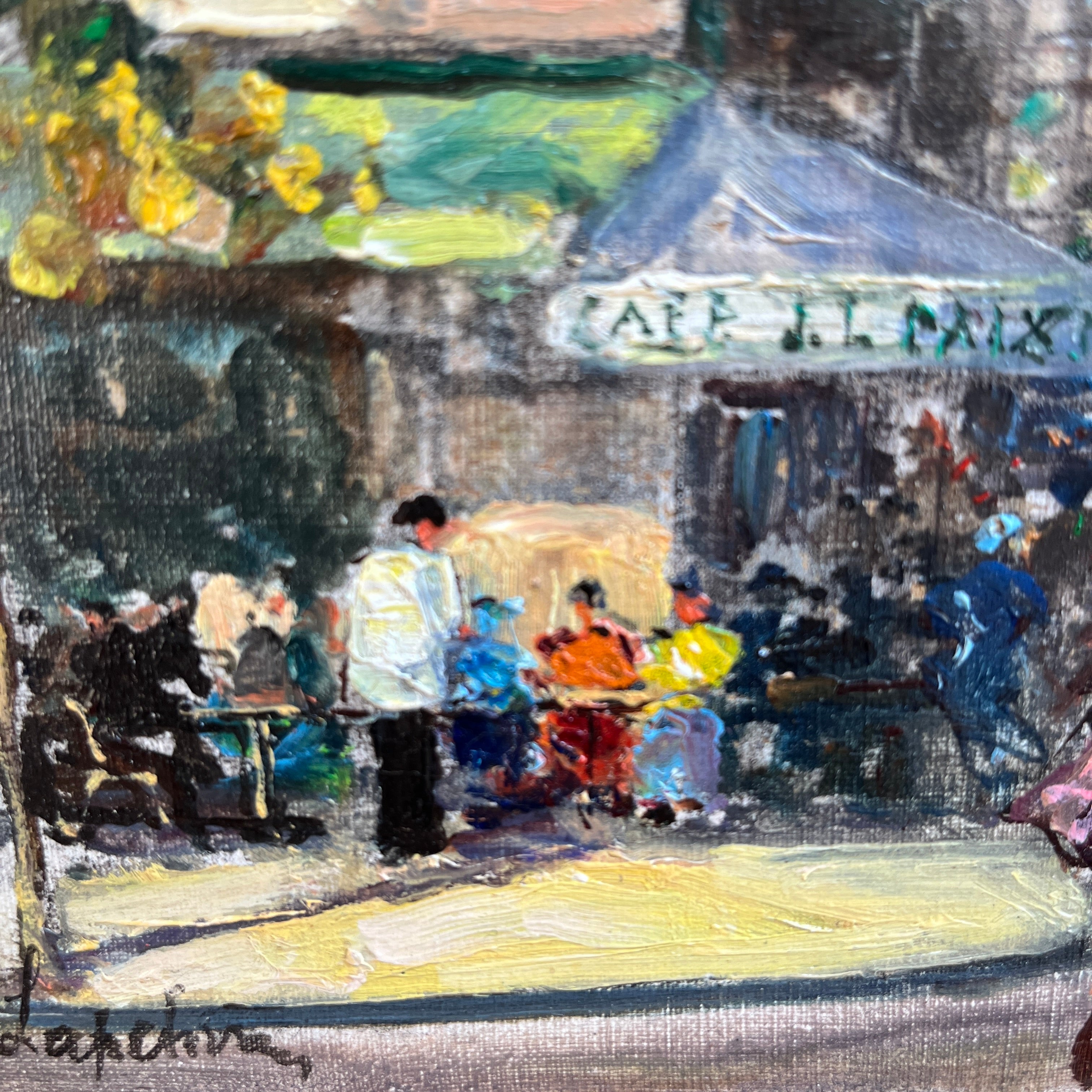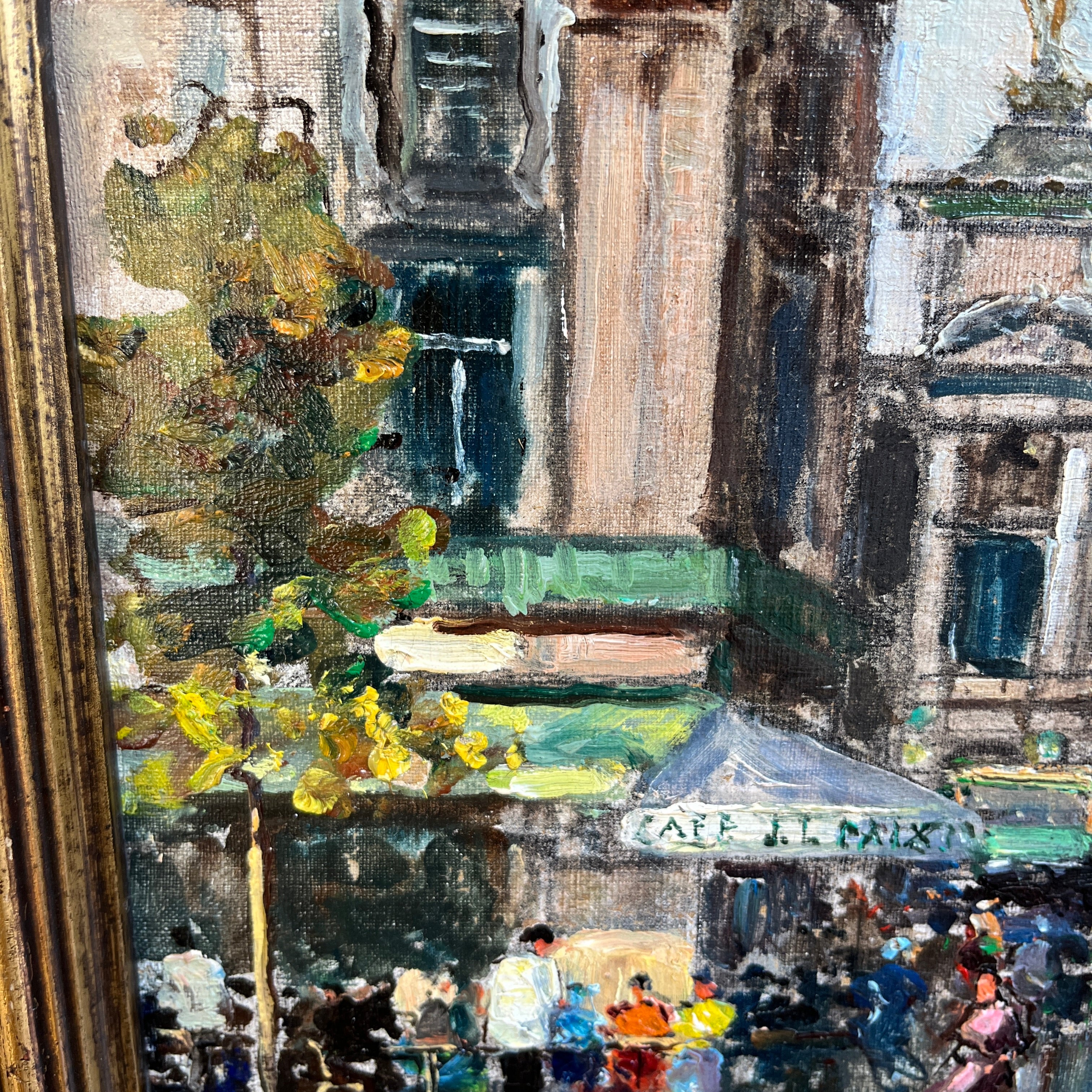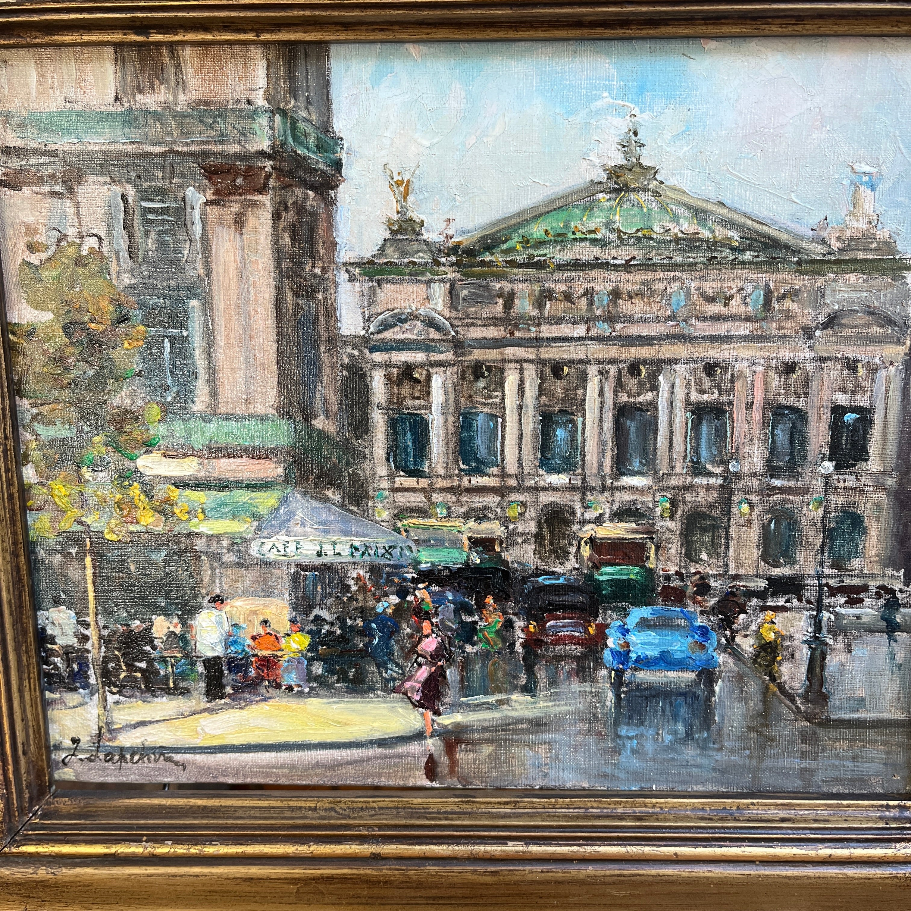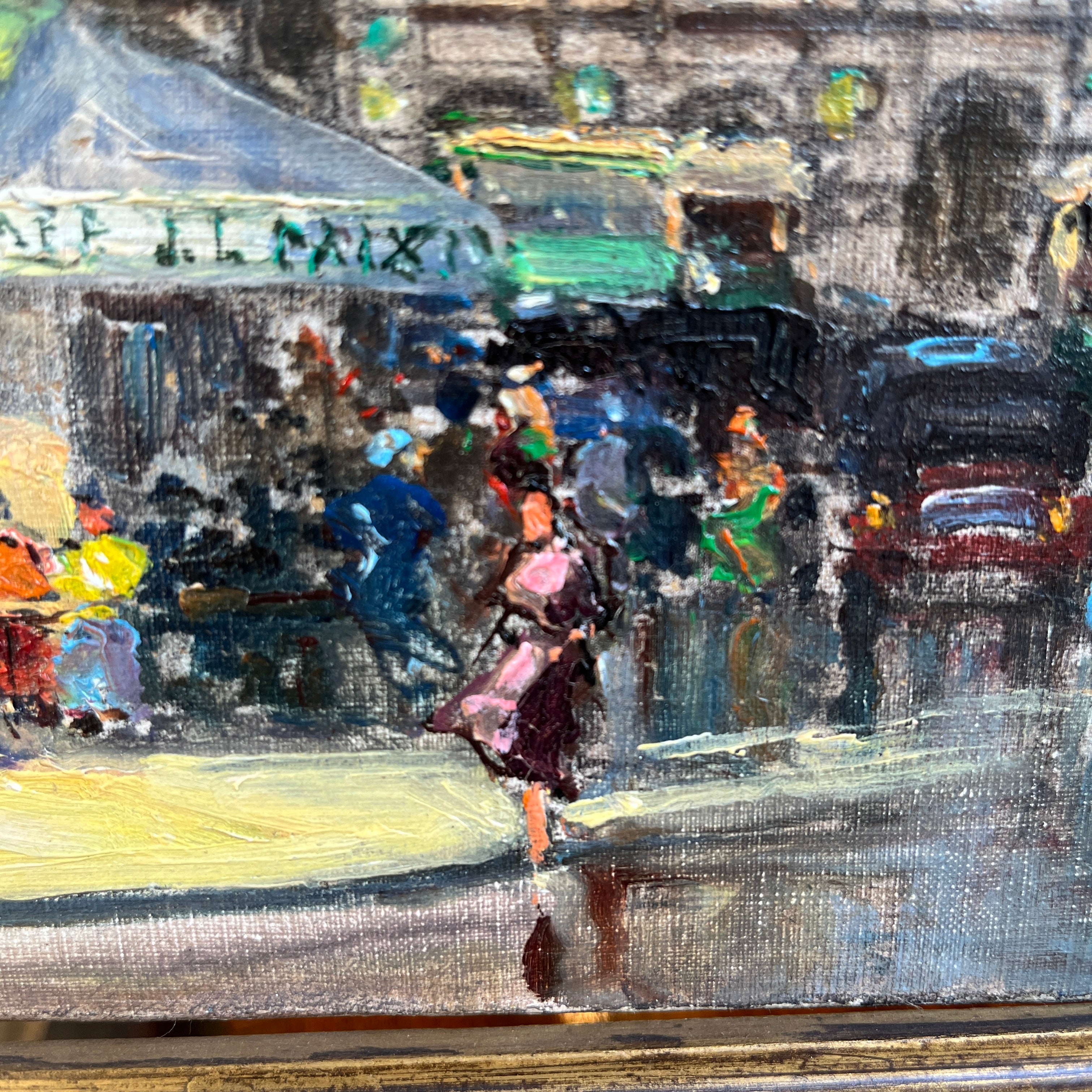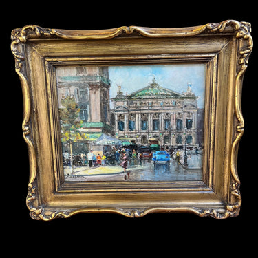 Bello óleo sobre tela de origen Europeo, mostrando una postal parisina con vista al Palais Garnier (Ópera de París), un típico café con sus visitantes sentados mirando la calles, transeúntes y vehículos. El artista seleccion colores primarios como el azul y amarillo, en tonos saturados, para destacar el pequeños detalles dentro de la escena, haciendo que nuestra mirada viaje y descubramos de a poco los rincones del paisaje. La obra está enmarcada en madera tallada en relieves decorativos y terminada en elegante dorado.