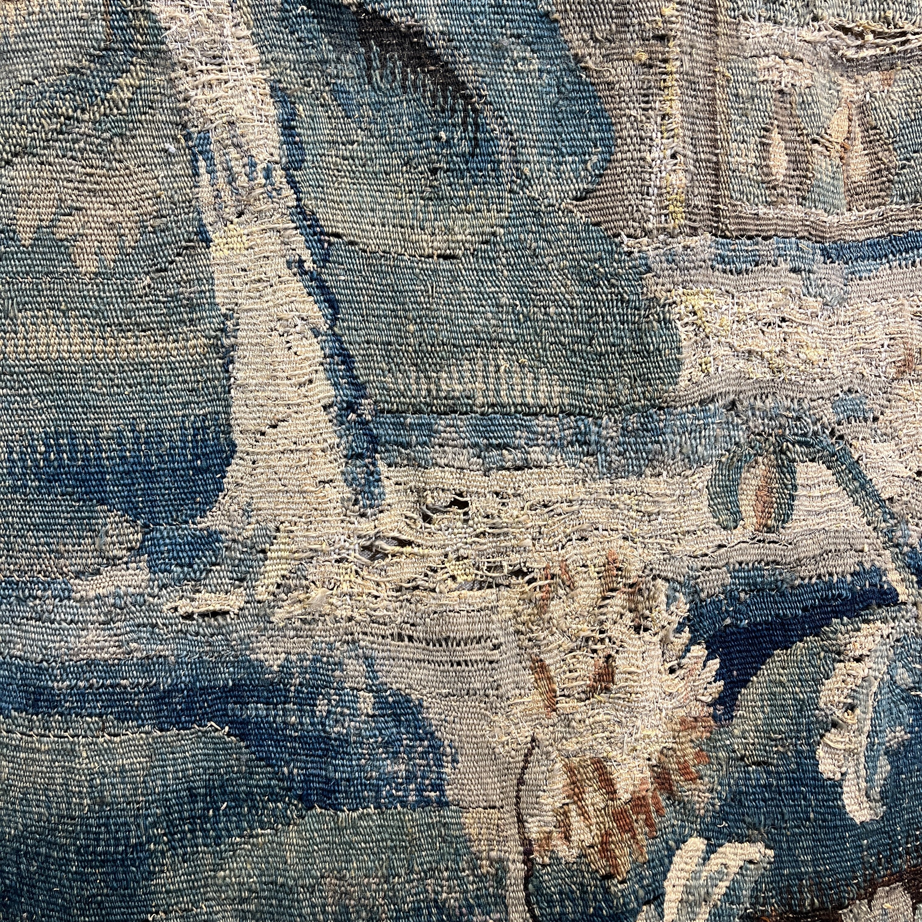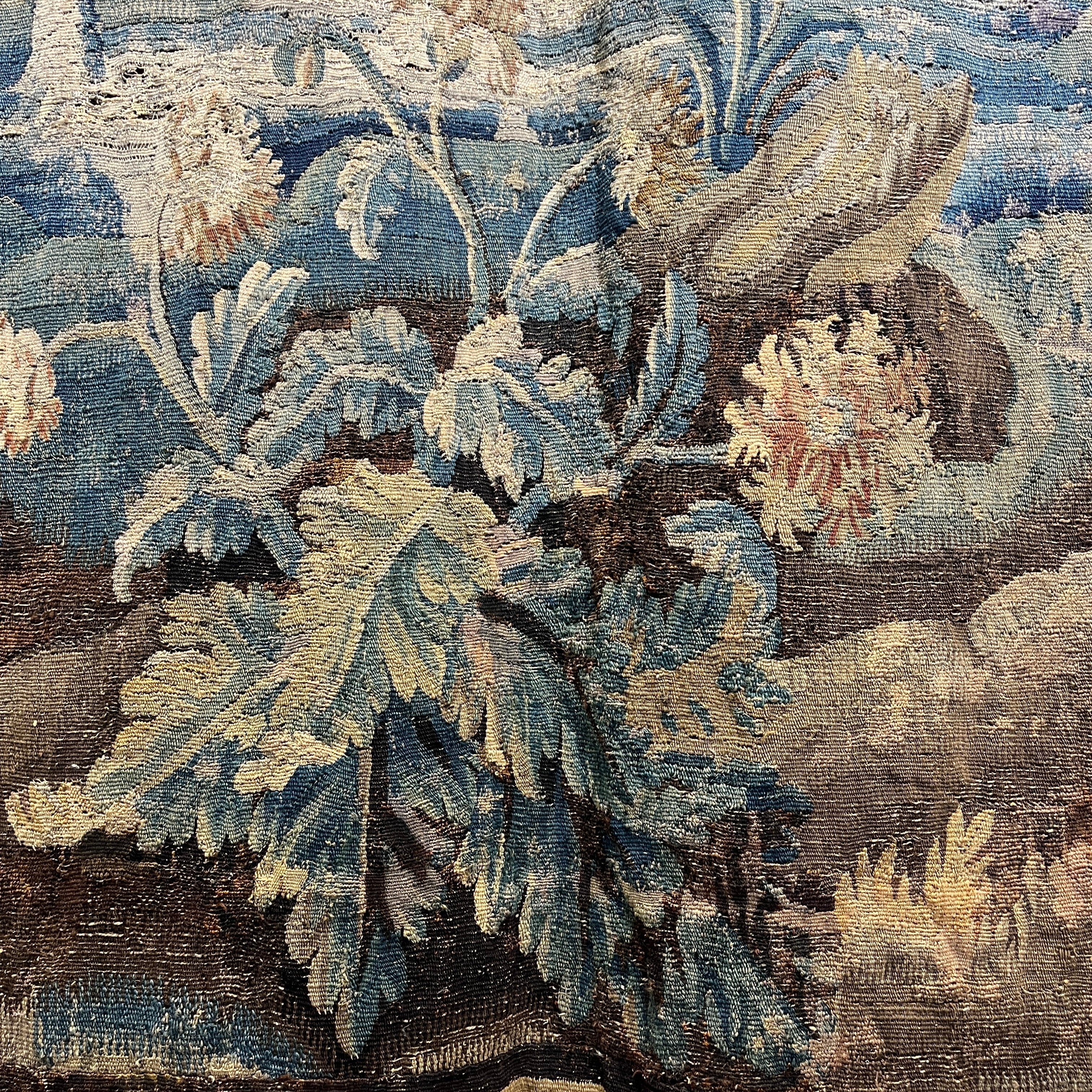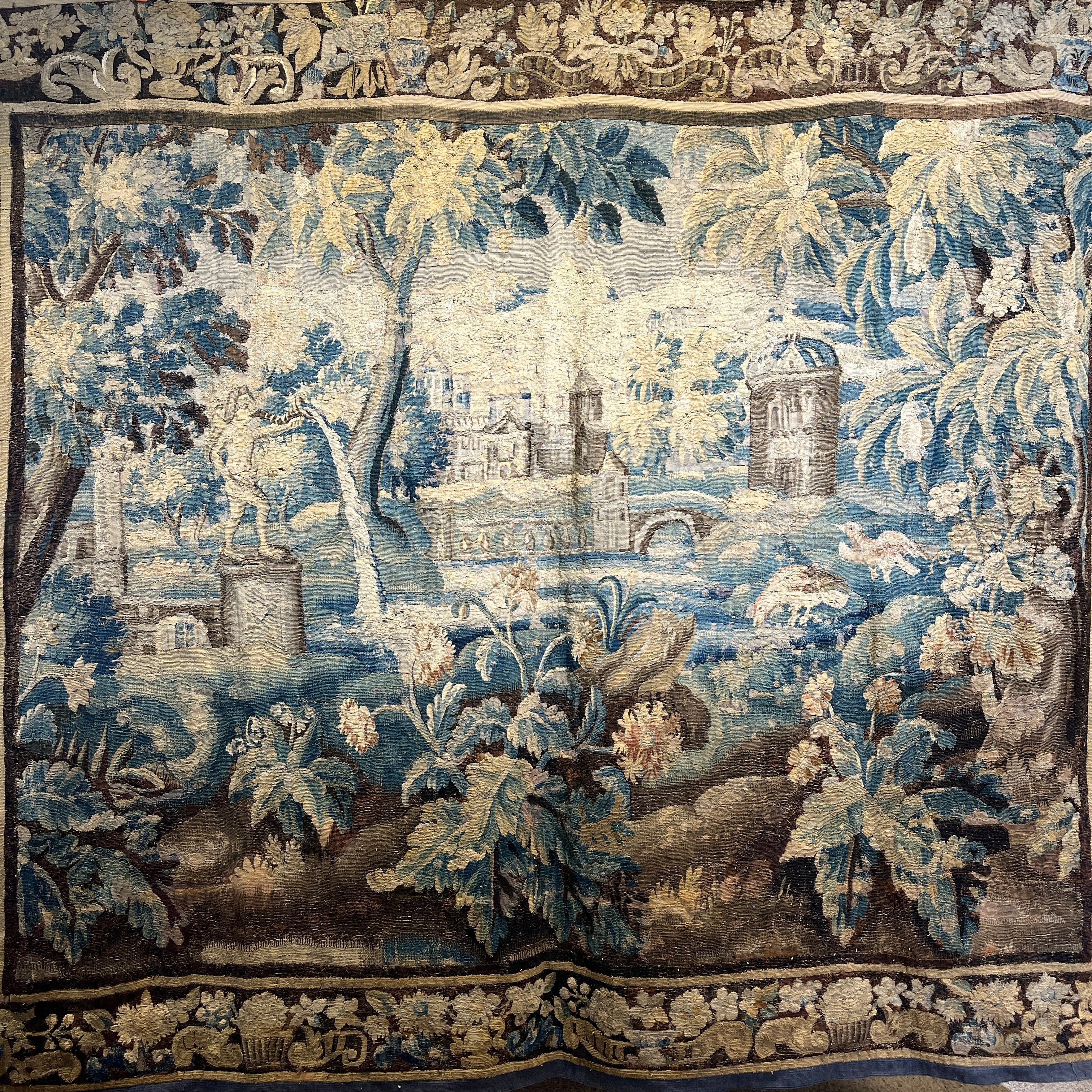 Espectacular tapicería francesa D'Aubbuson Verdure, de finales del siglo XVIII, tejida a mano en lana sobre algodón. La pieza tiene un precioso diseño representando un paisaje natural lleno de vegetación abundante, lo que le da la característica de Verdure. La composición nos sitúa dentro del frondoso follaje, con vista a un Chateau en el horizonte. El tipo de flora nos hace pensar que el paisaje no está en Francia, sino que en alguna de sus colonia, posiblemente el Caribe, dando cuenta de esta época de gran expansión para Francia. Su cenefa está decorada de un patrón con motivos florales.