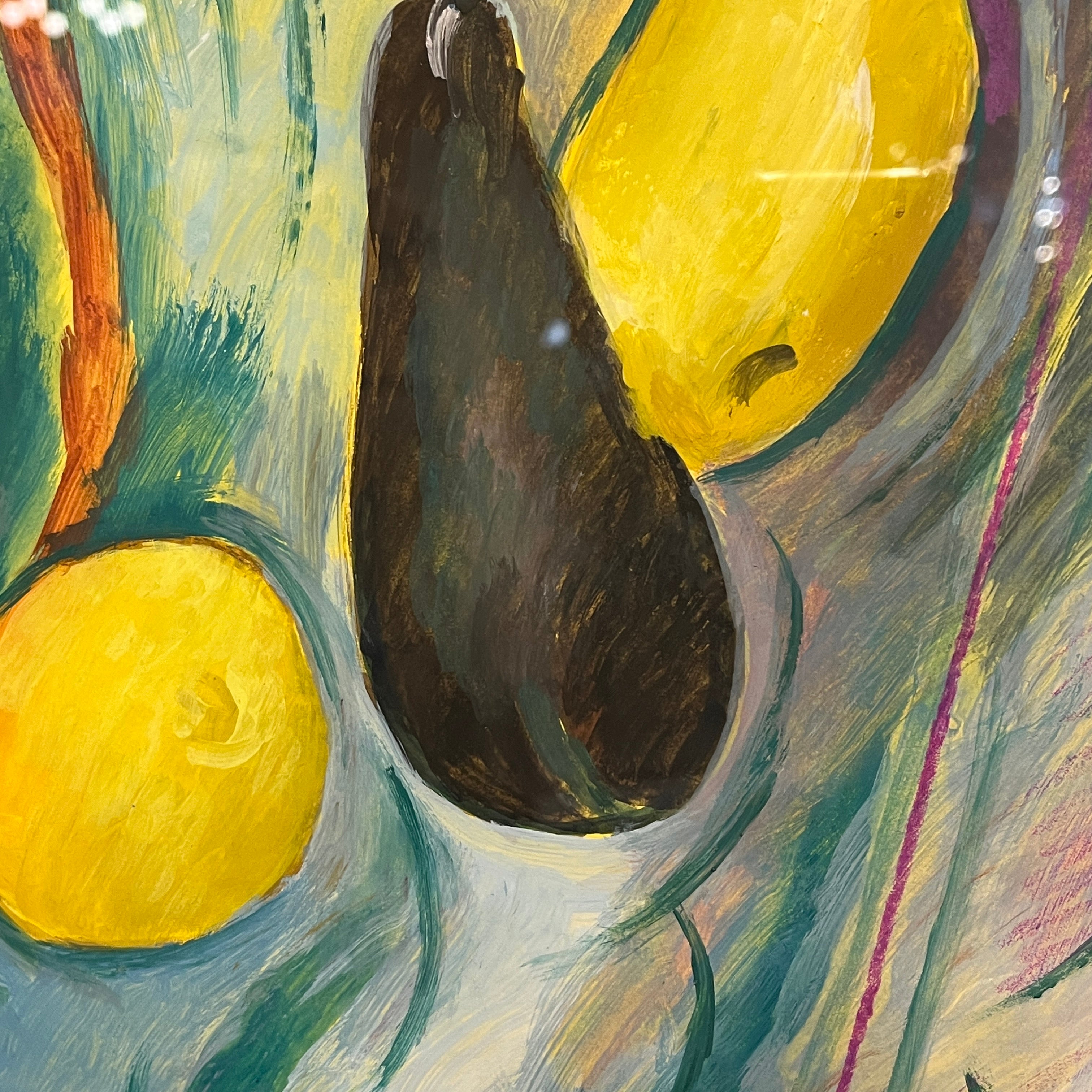 Óleo sobre papel del artista chileno Luis Tejada, representando un bodegón de frutas sobre un mantel en tonos verdes y morados con un llamativo fondo amarillo. La obra es una interpretación del artista de una temática tan tradicional en la historia del arte, como es el bodegón, dándole su característica impronta de color y geometría. Otro elemento interesante es la proyección de líneas desde el dibujo, sugiriendo una especie de boceto o estudio de perspectiva existente debajo de la pintura. La obra está enmarcada en madera, de diseño sobrio y terminación plateada.