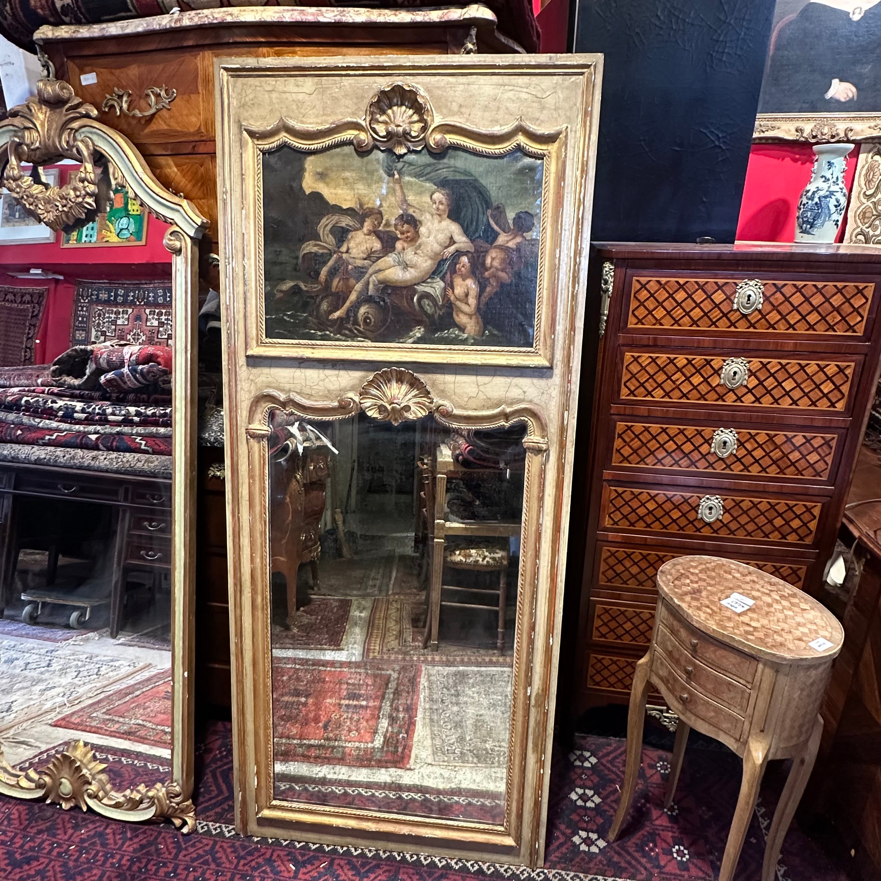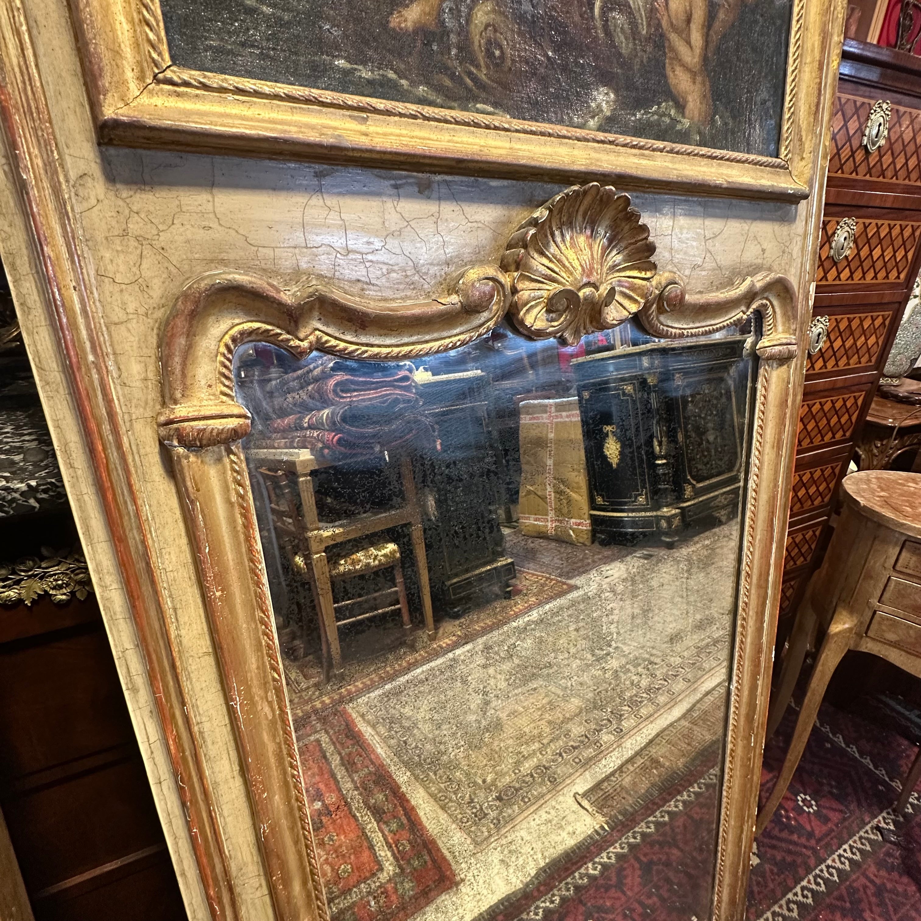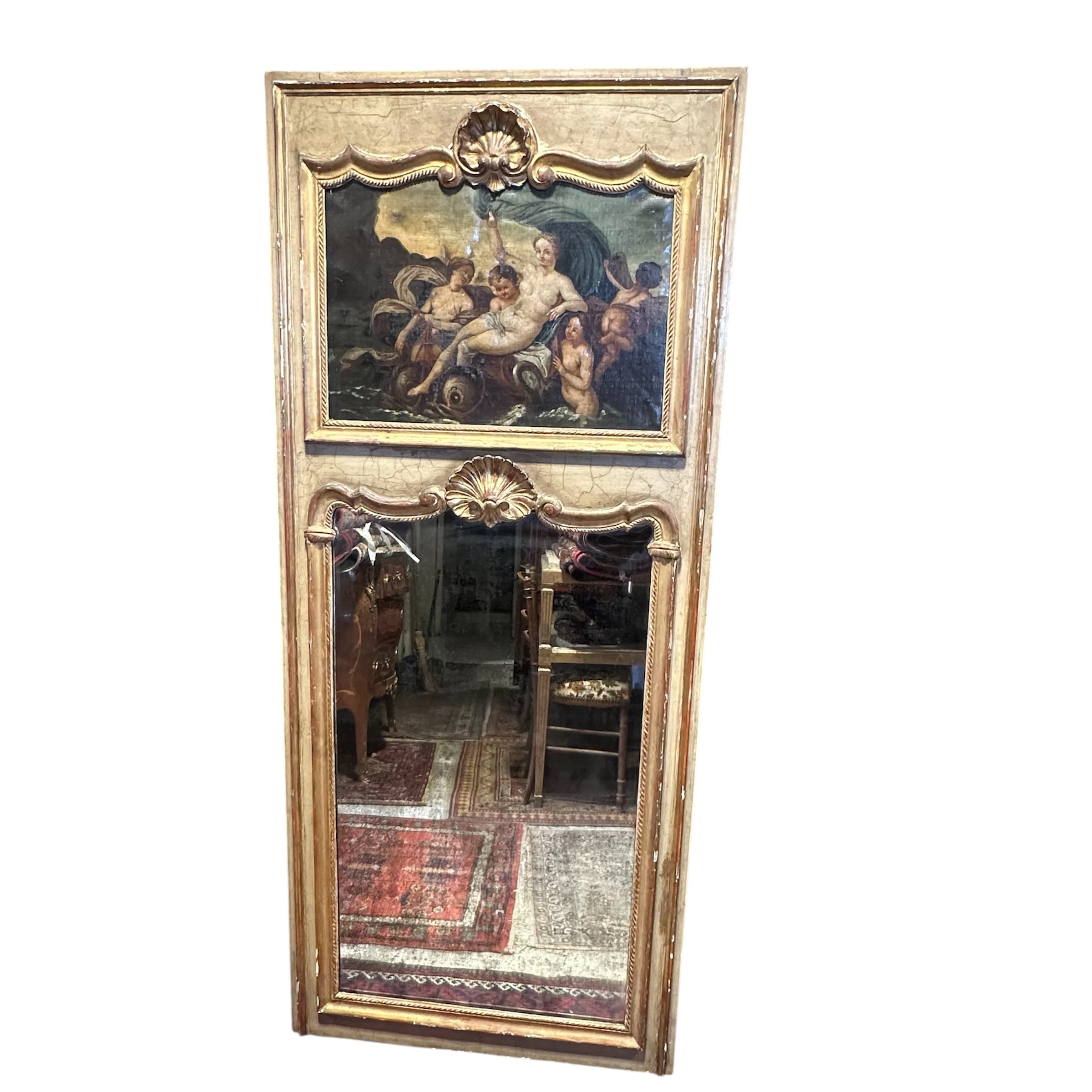 Gran espejo Trumeau, de origen francés, hecho de madera rechapada en color crema dorada. El espejo se encuentra en su parte inferior, mientras que la parte de arriba muestra un bellísima escena, hecha en óleo, representando con un bello trabajo de luces, una Venus con querubines.