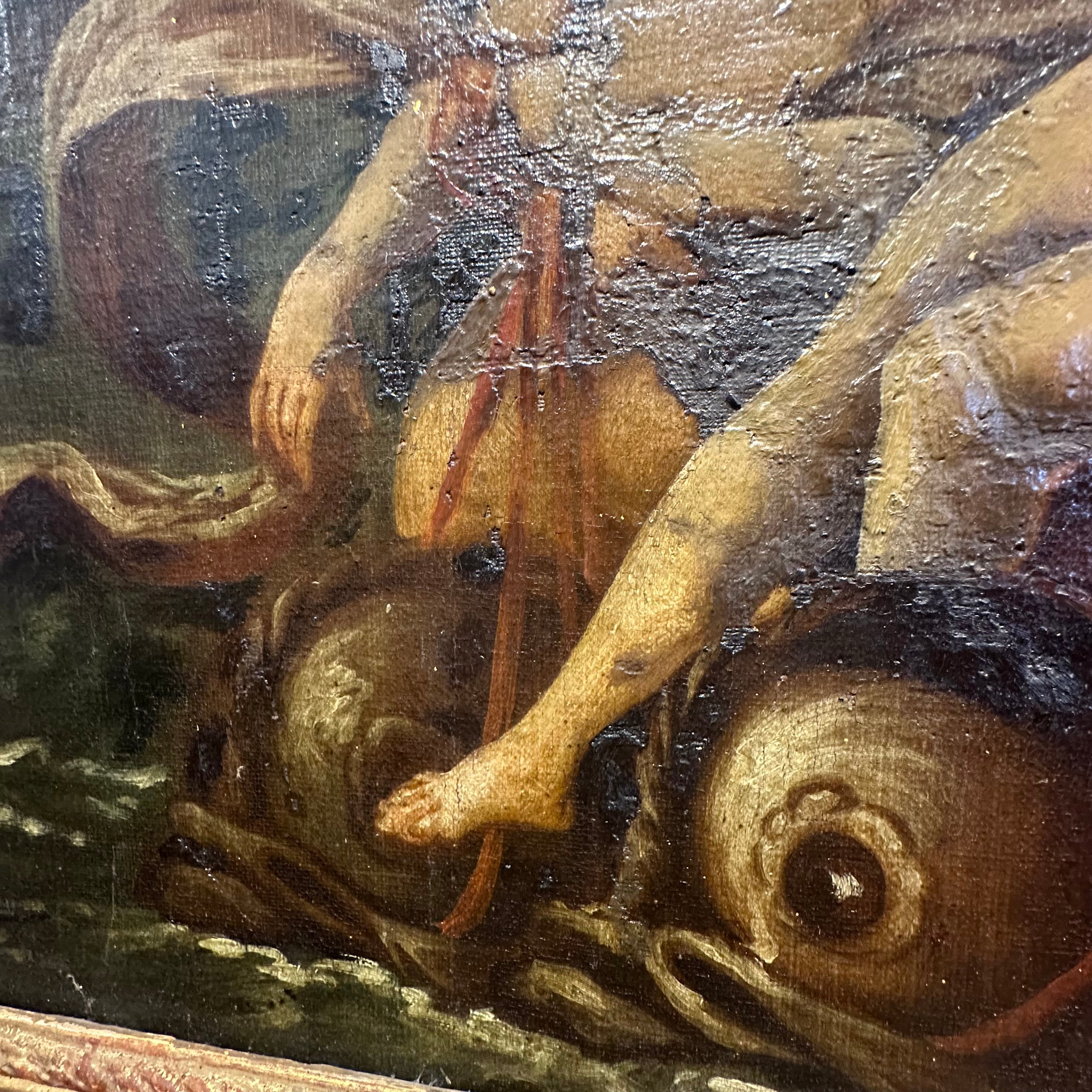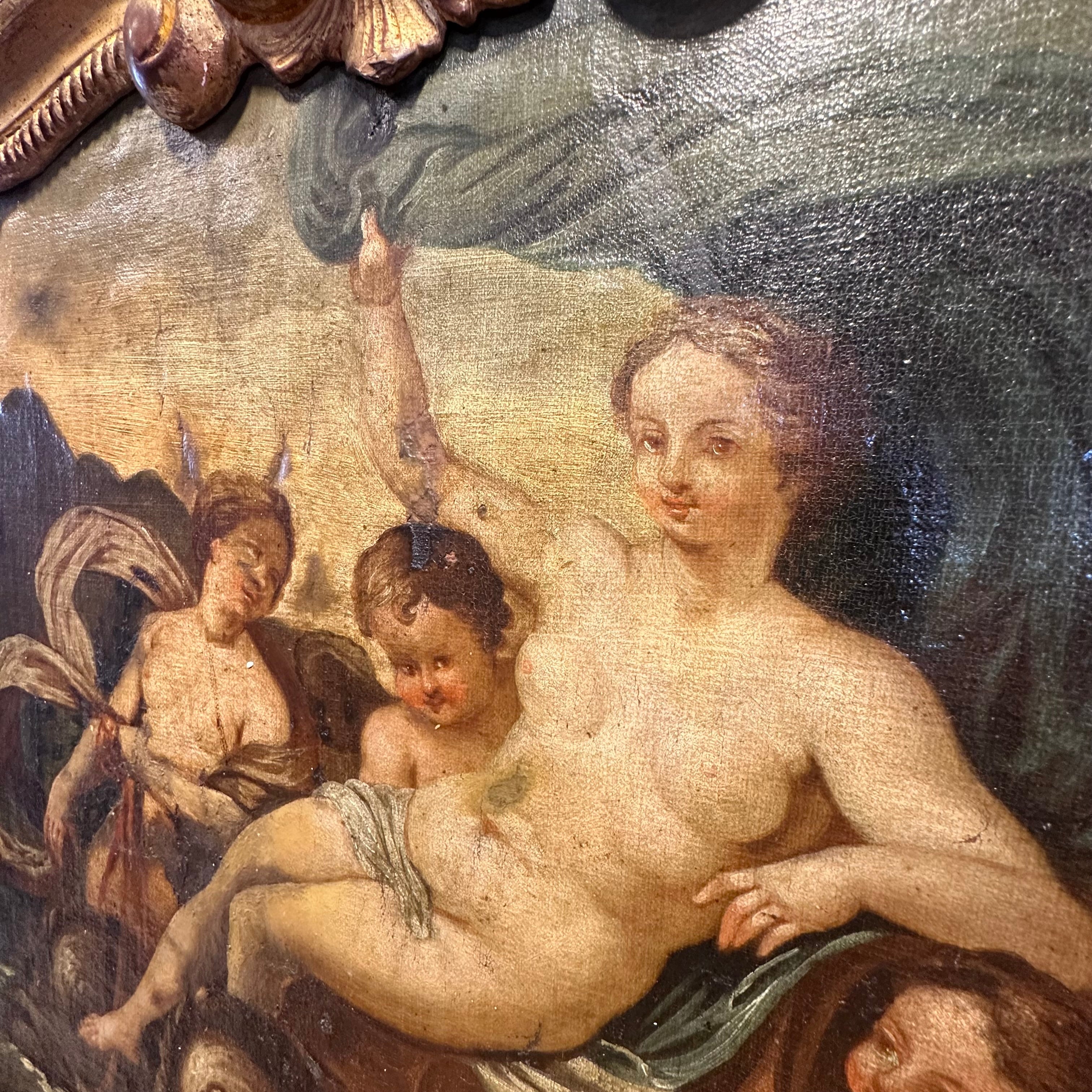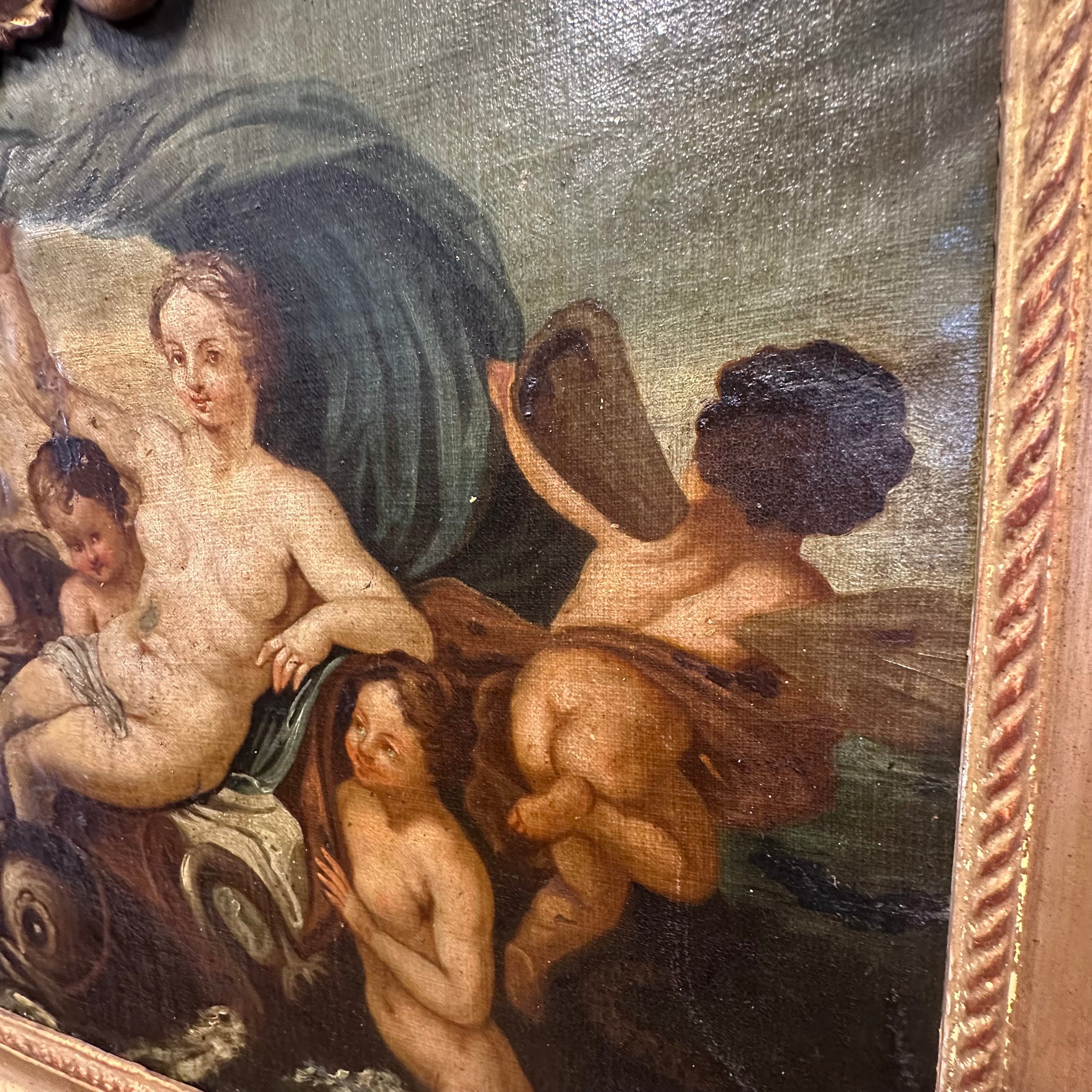 Gran espejo Trumeau, de origen francés, hecho de madera rechapada en color crema dorada. El espejo se encuentra en su parte inferior, mientras que la parte de arriba muestra un bellísima escena, hecha en óleo, representando con un bello trabajo de luces, una Venus con querubines.