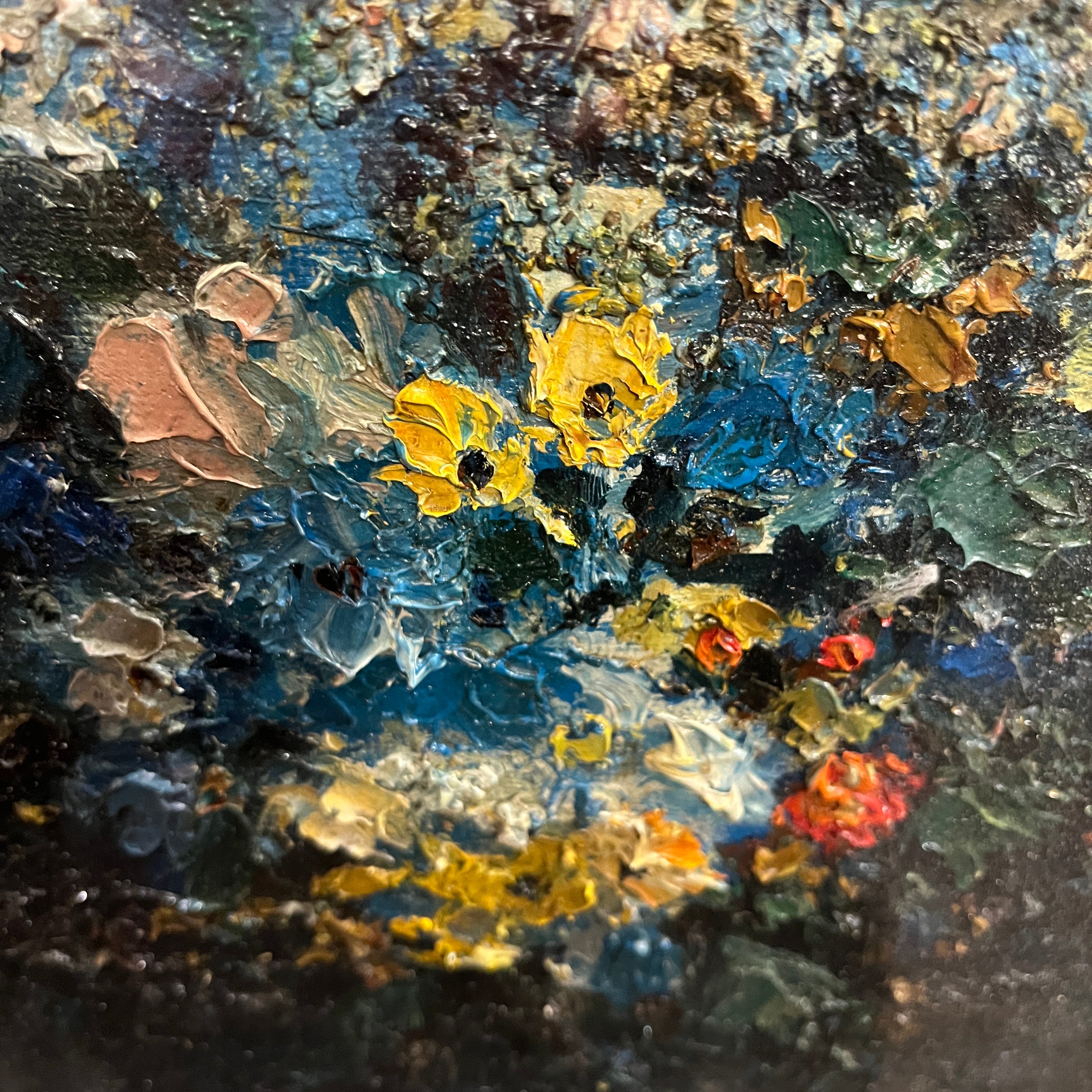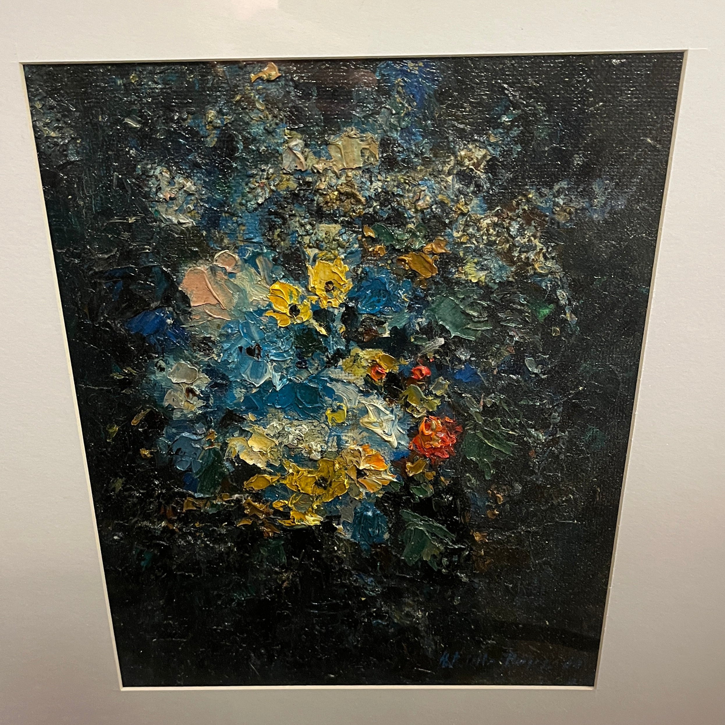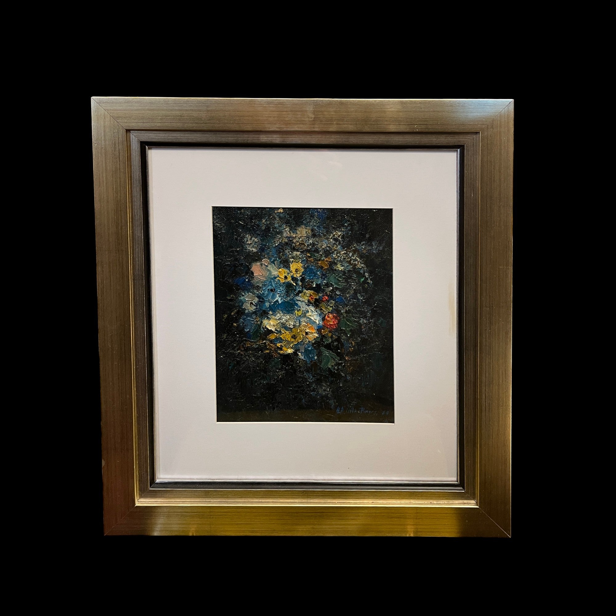 Especial trabajo del destacado artista chileno Héctor Raúl Ulloa Burgos. La técnica utilizada para representar un ramillete floral es de acrílico sobre tela, con vivos colores, tanto cálidos como fríos, para destacar las flores sobre un fondo en penumbra. La obra cuenta con un marco plateado.