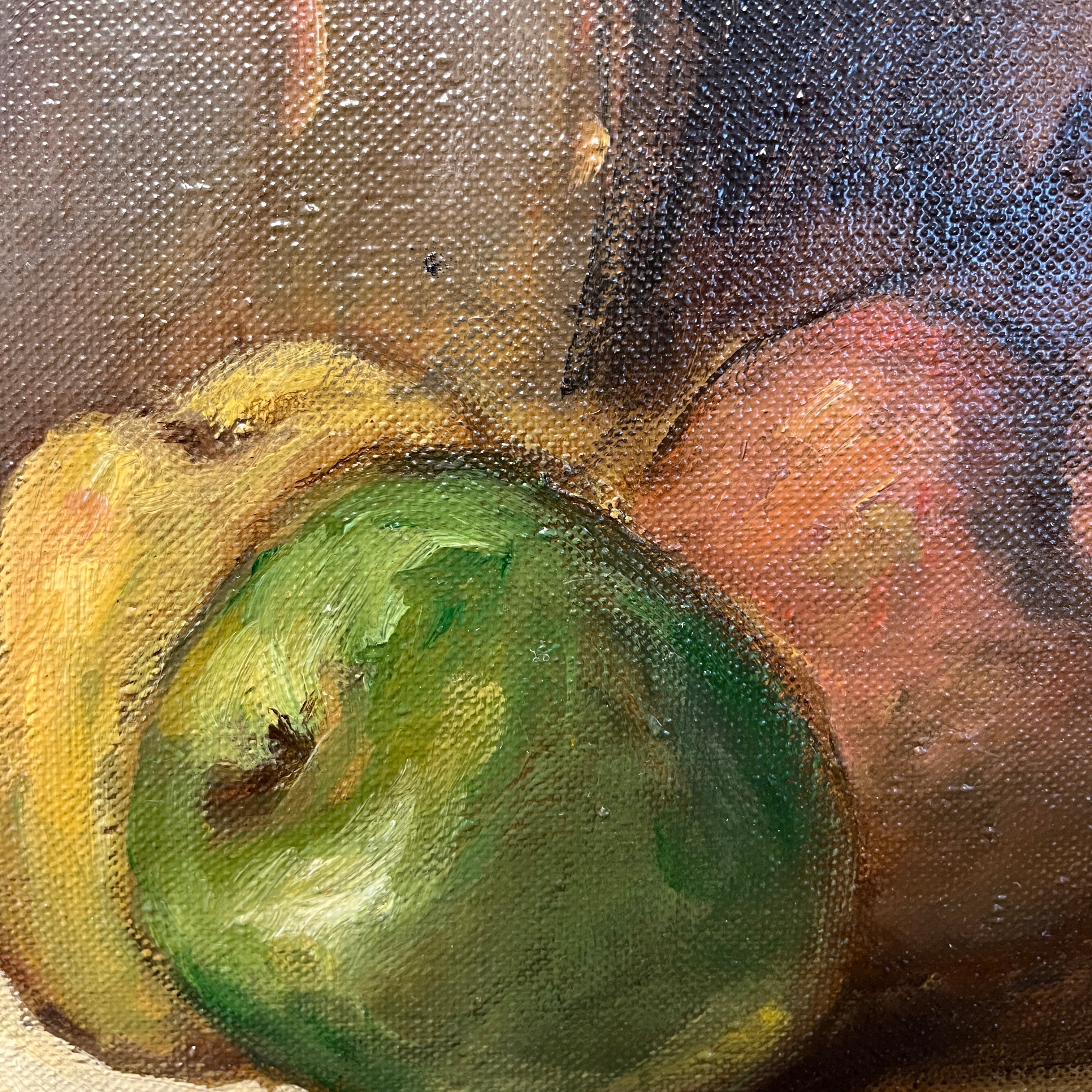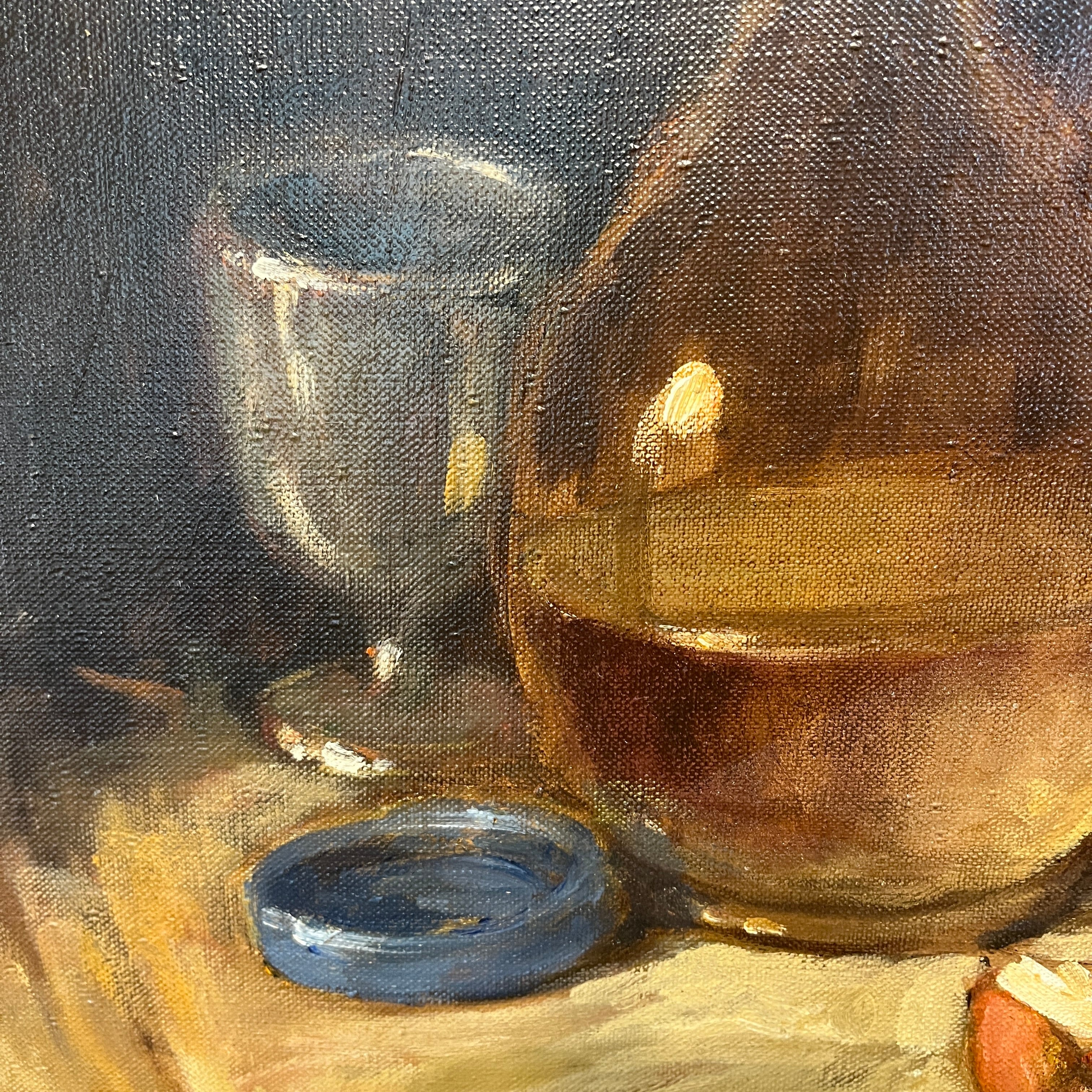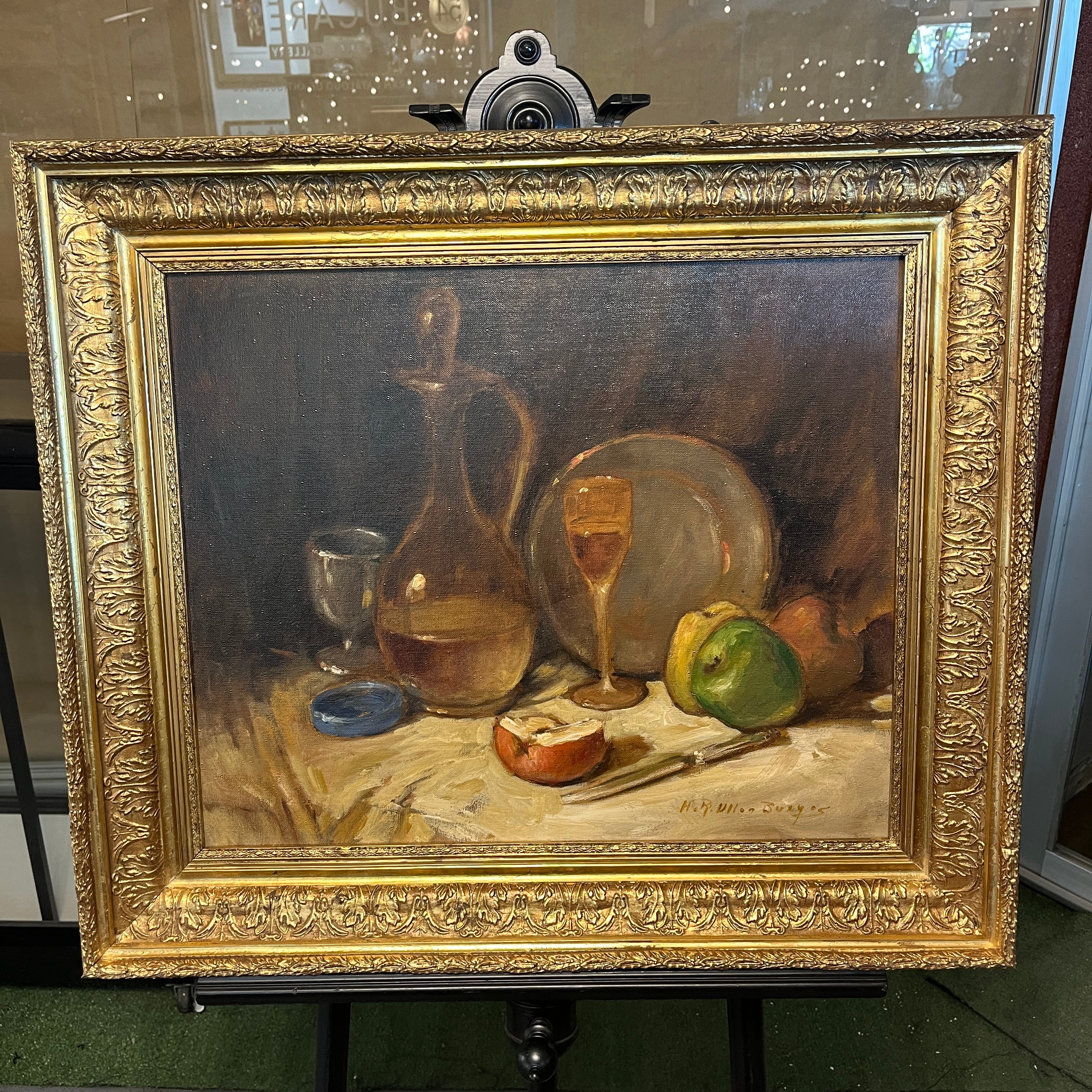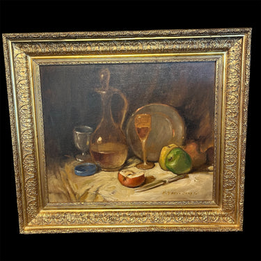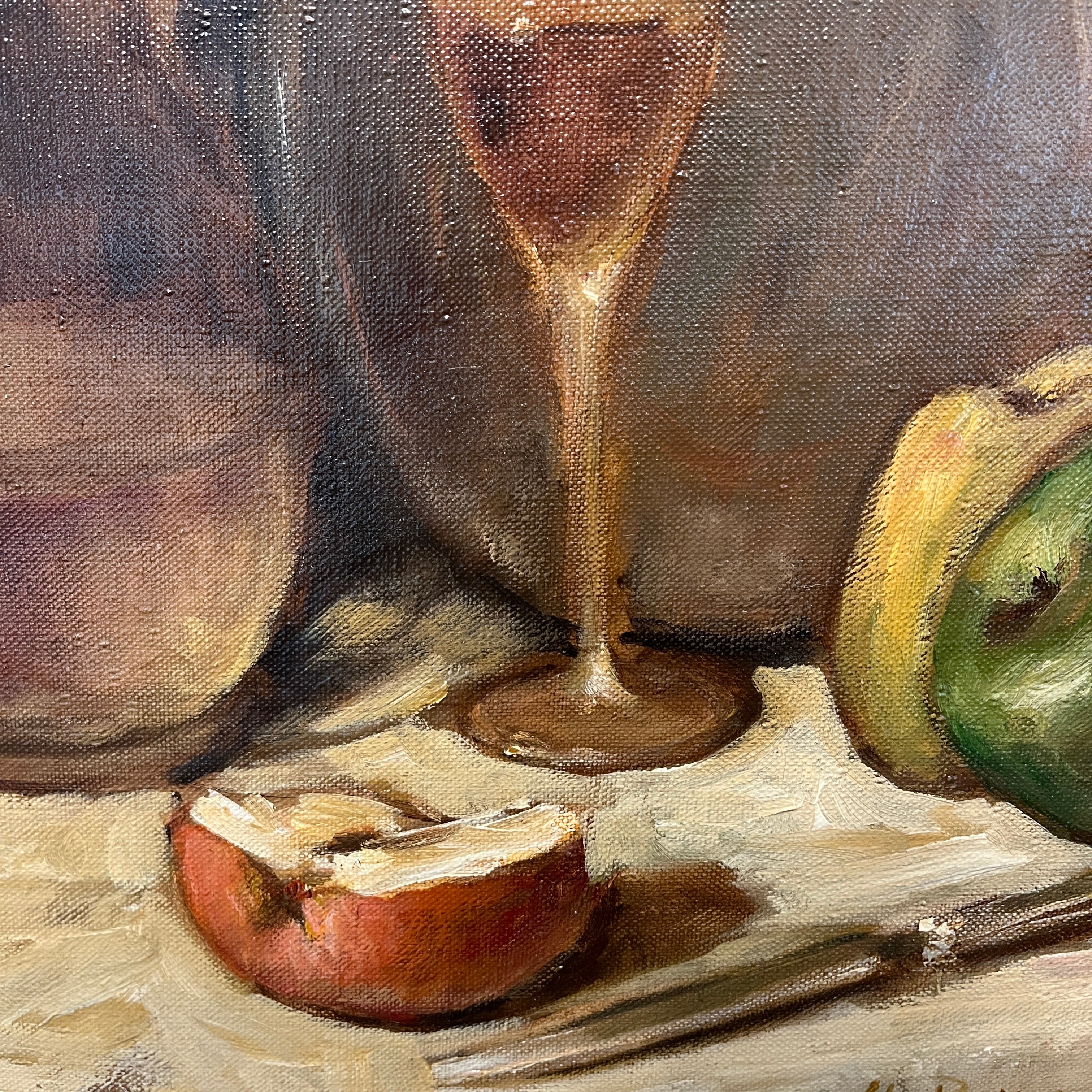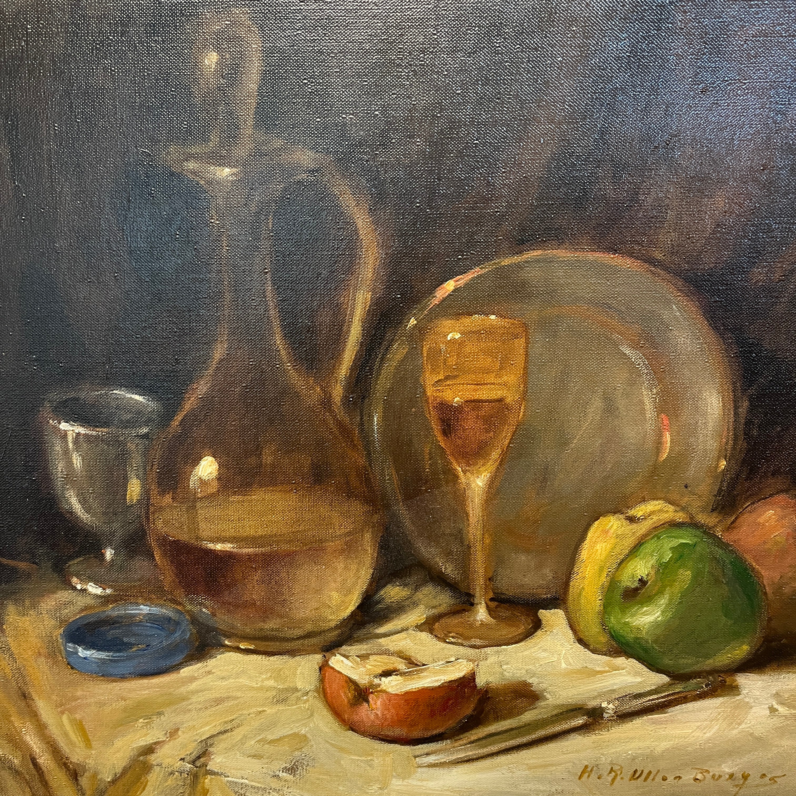 Óleo sobre tela del reconocido artista chileno Raúl Ulloa Burgos, representando un bello bodegón de colores cálidos. En la composición podemos ver algunas manzanas y objetos de cristal para la mesa, como una botella, una copa, un plato y un cenicero. Es una naturaleza muerta con un juego entre los tonos dorados cálidos y colores primarios saturados, que hacen resaltar los elementos. La obra está enmarcada en madera tallada en finos relieves y terminada en dorado.