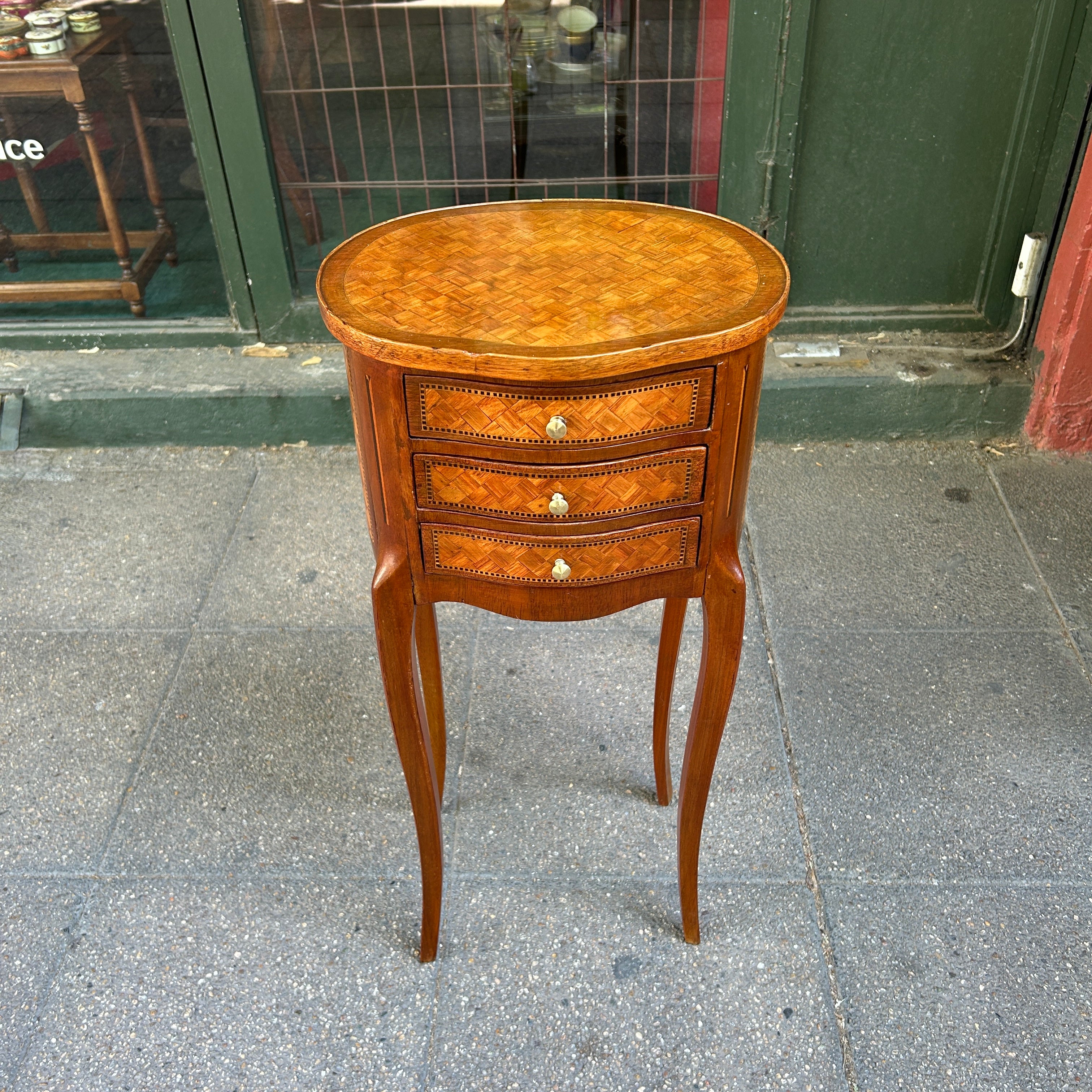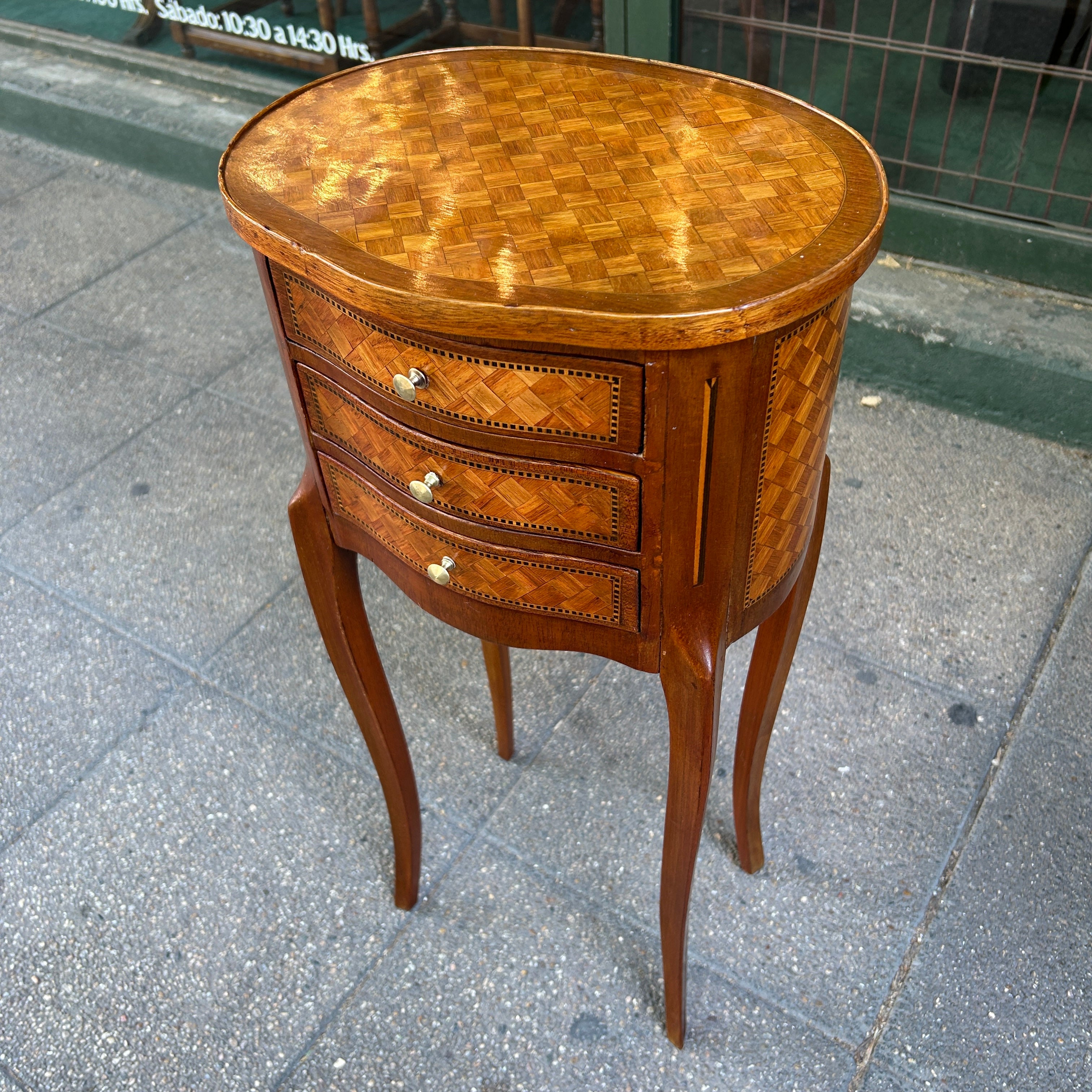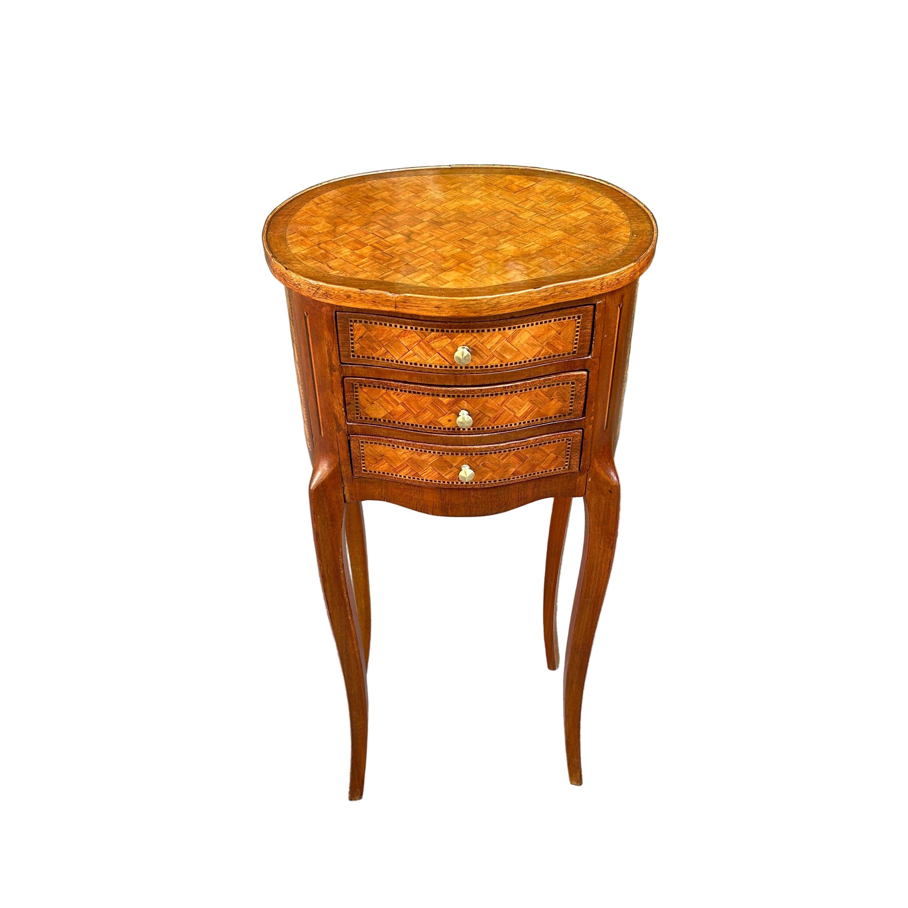 Velador francés estilo Transición parquetería cabriolé y tres cajones