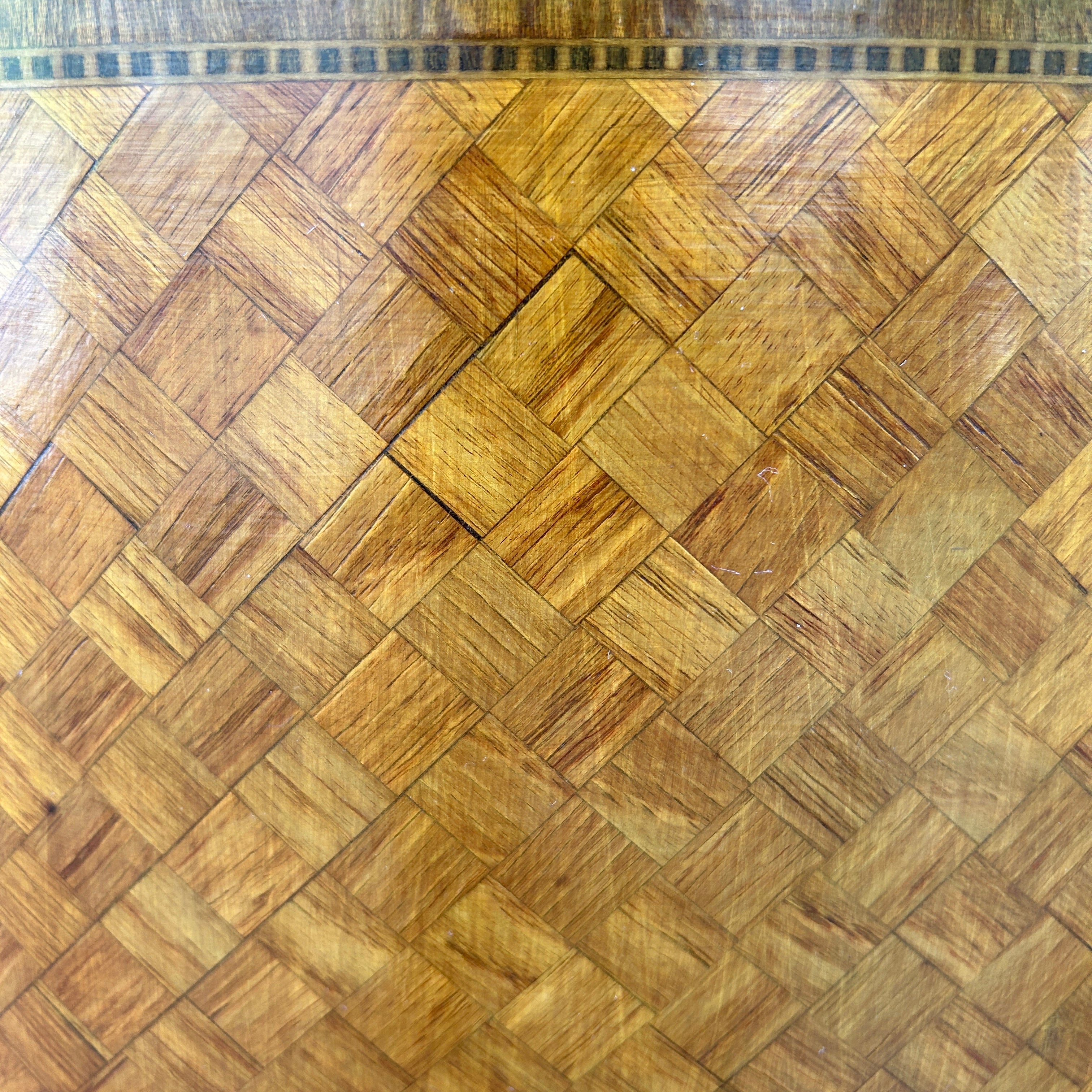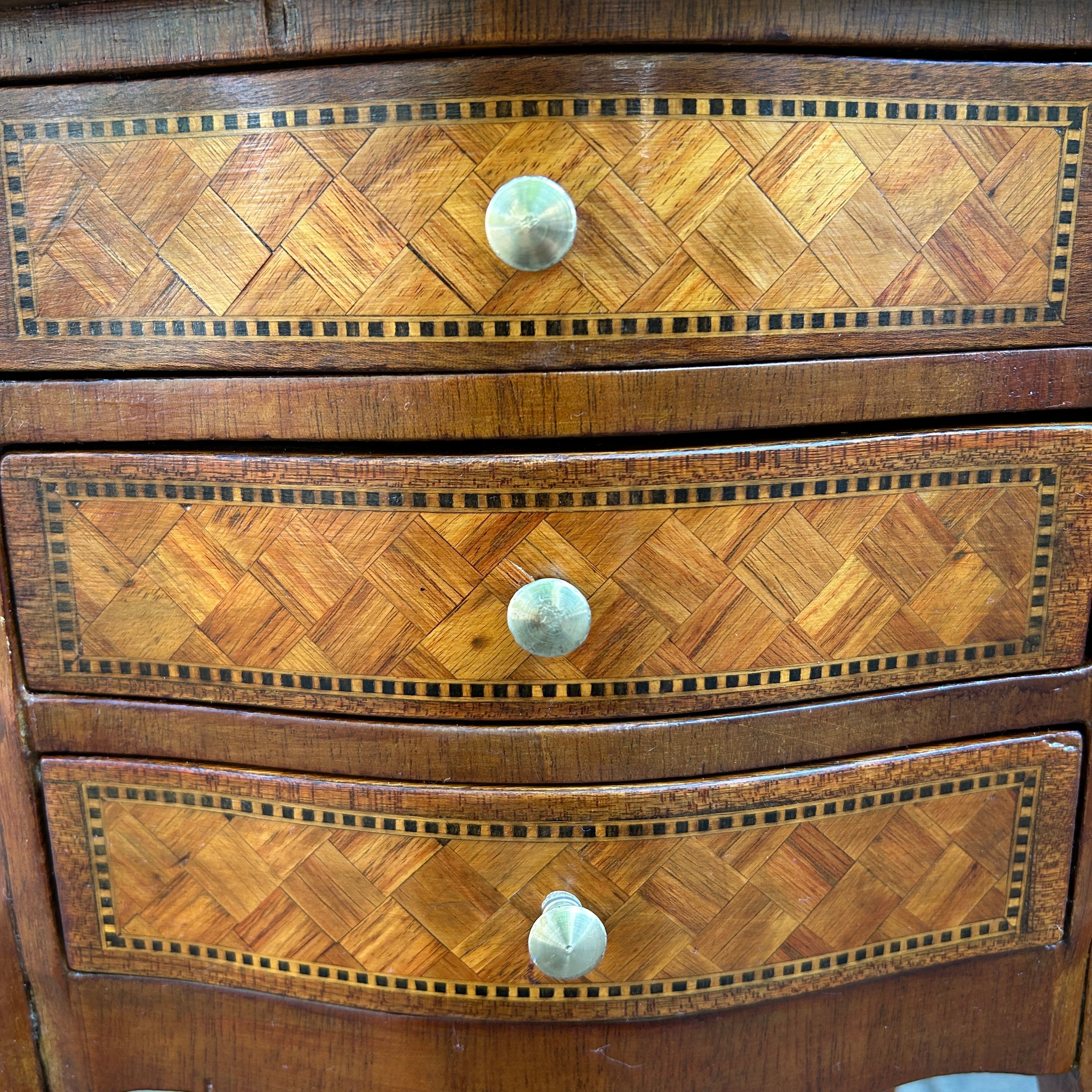 Bello velador francés estilo Transición, hecho de madera enchapada, con una exquisita parquetería de ajedrez bicolor en su superficie, costados y cajones, tiradores de bronce y patas cabriolé. La pieza cuenta con tres cajones.