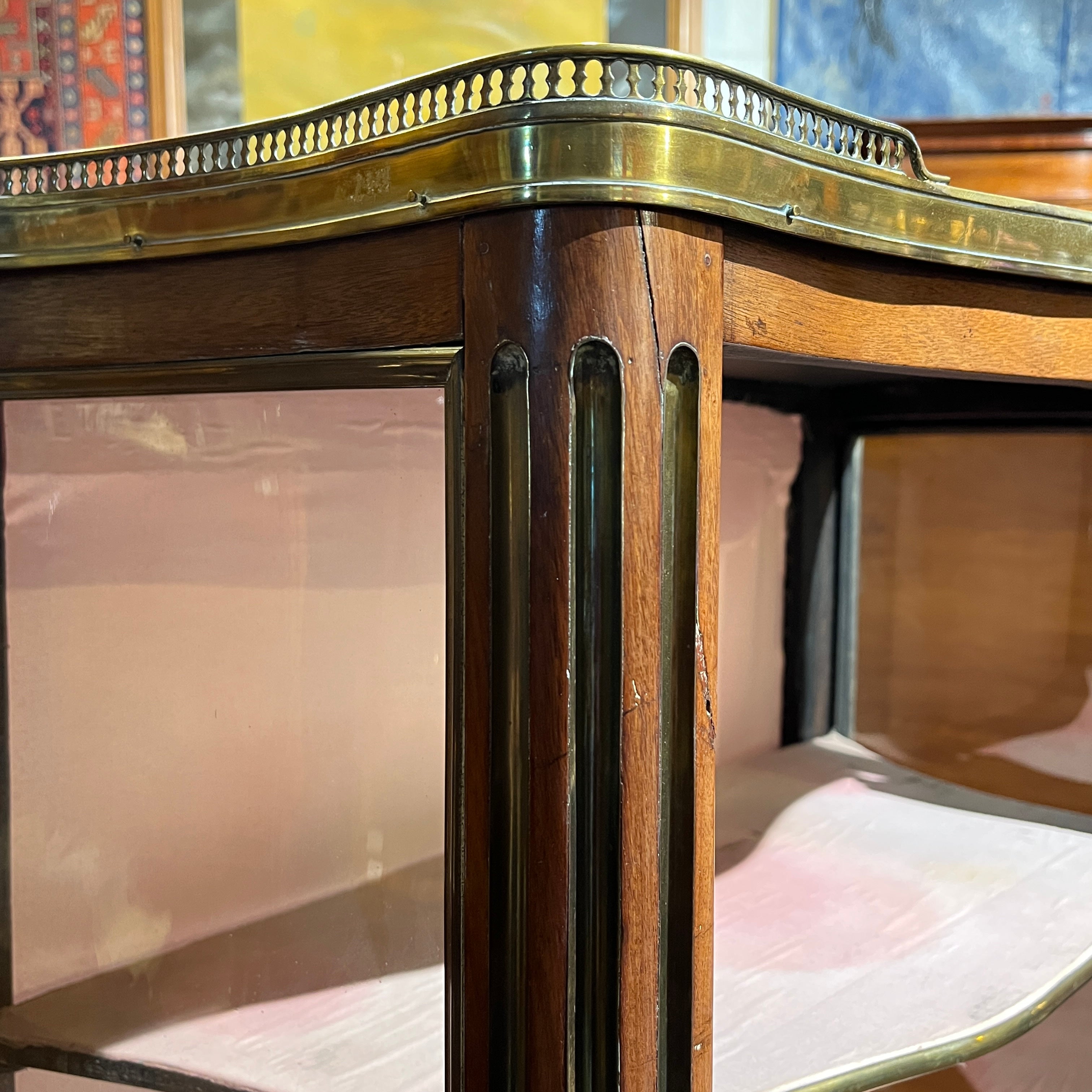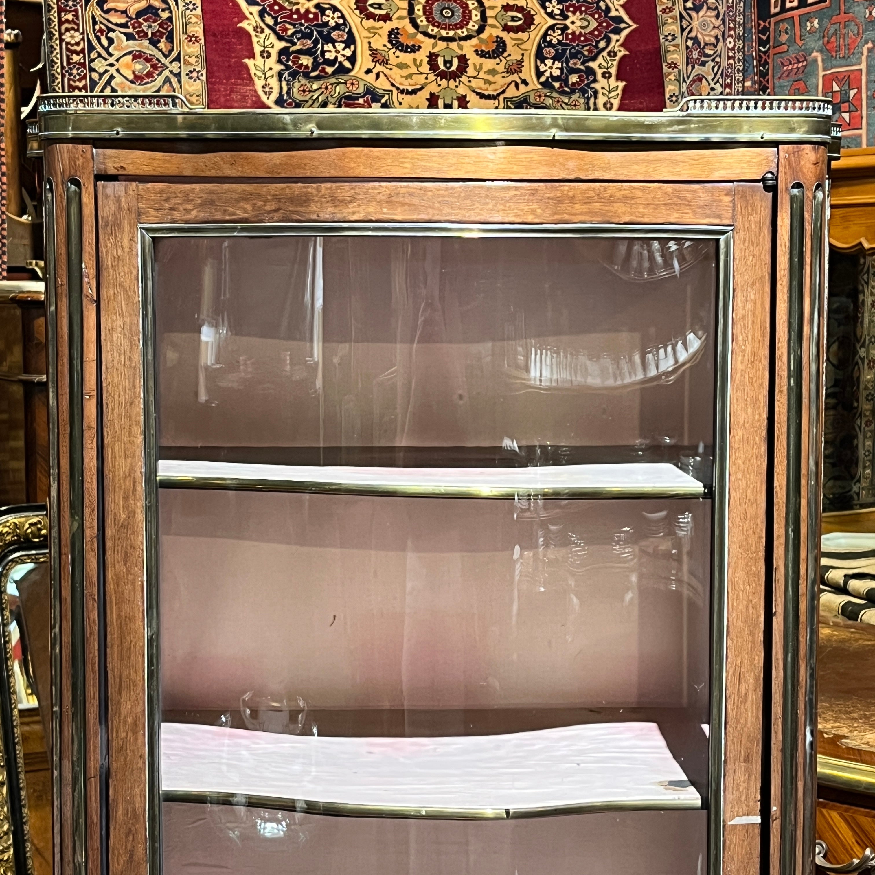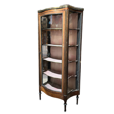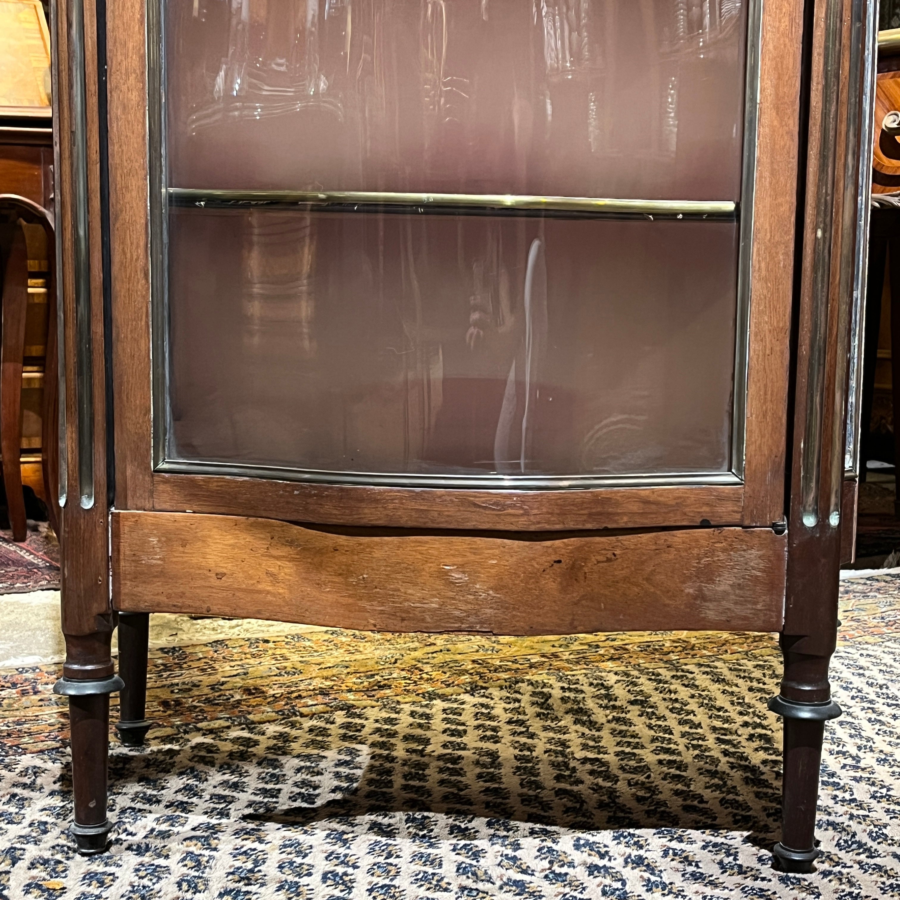 Esta pieza francesa de principio del siglo xx, es una finísima vitrina de caoba y bronce, forrada por dentro. Tiene un elegante balcón de bronce en la parte superior, bellas columnas acanaladas con baguette de bronce, molduras y aplicaciones también en bronce. Cuenta con cuatro repisas en madera forrada, terminadas en moldura de bronce. Destaca por su trabajo de curva y contra curva en vidrios.
