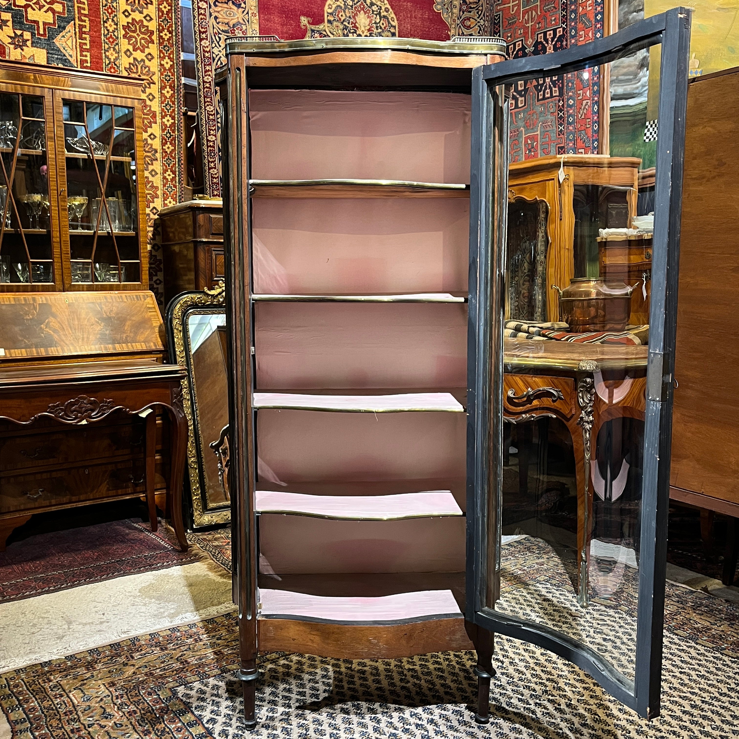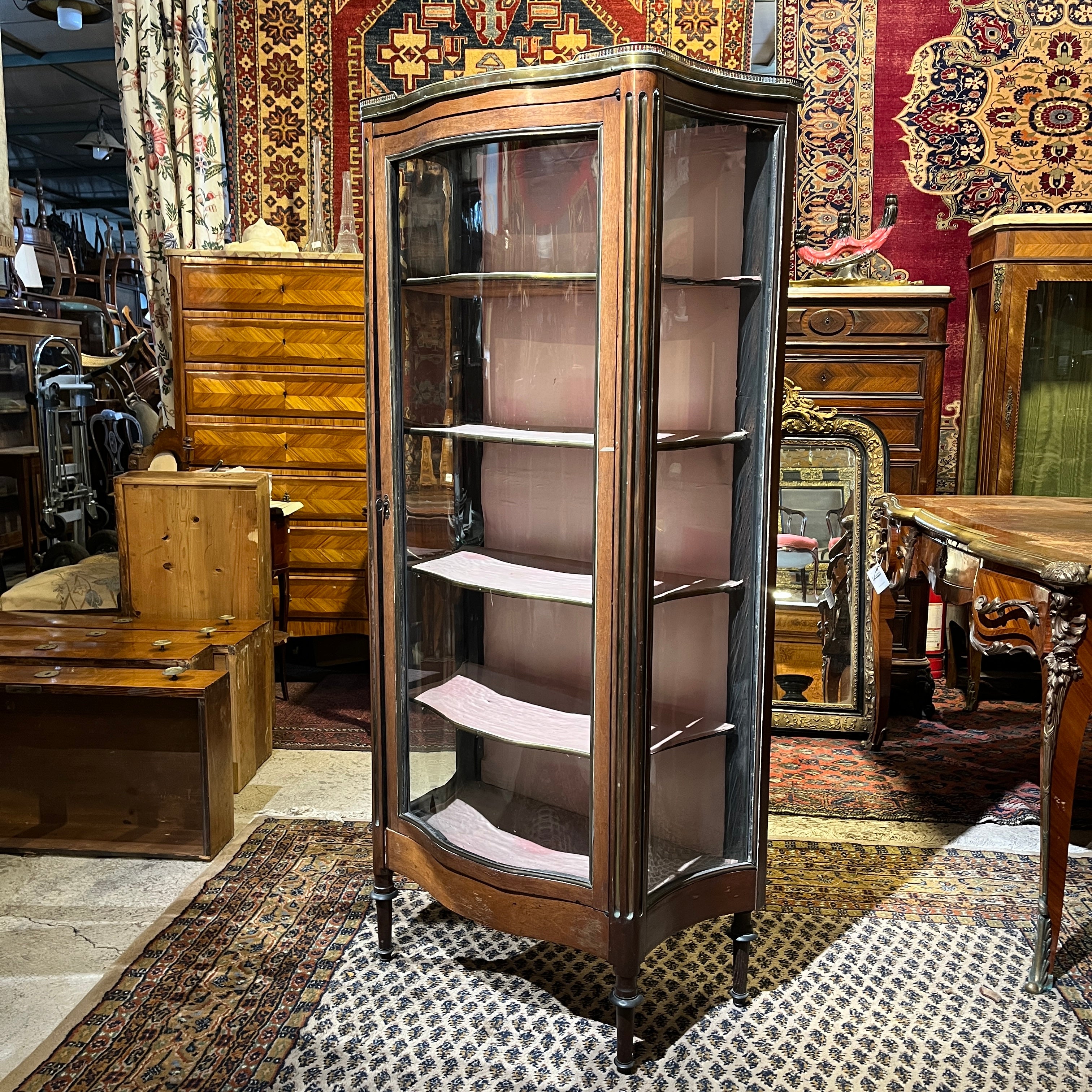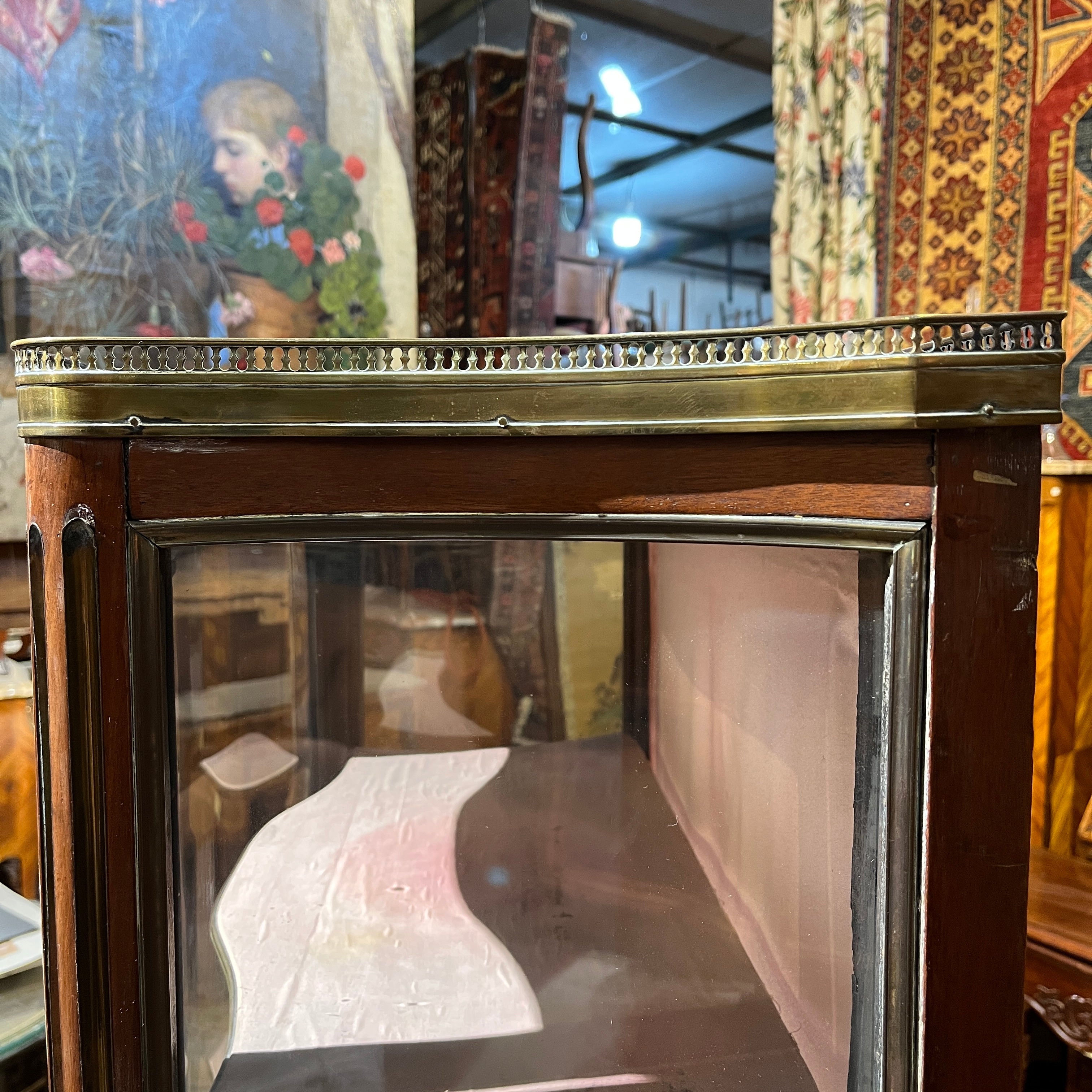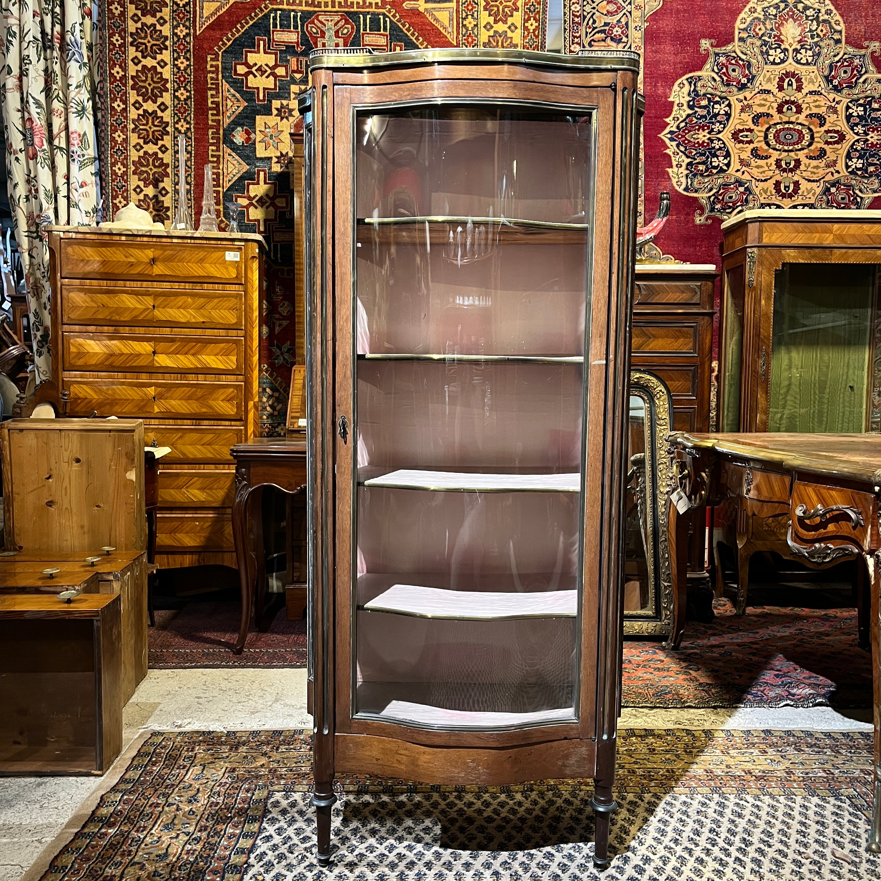 Esta pieza francesa de principio del siglo xx, es una finísima vitrina de caoba y bronce, forrada por dentro. Tiene un elegante balcón de bronce en la parte superior, bellas columnas acanaladas con baguette de bronce, molduras y aplicaciones también en bronce. Cuenta con cuatro repisas en madera forrada, terminadas en moldura de bronce. Destaca por su trabajo de curva y contra curva en vidrios.