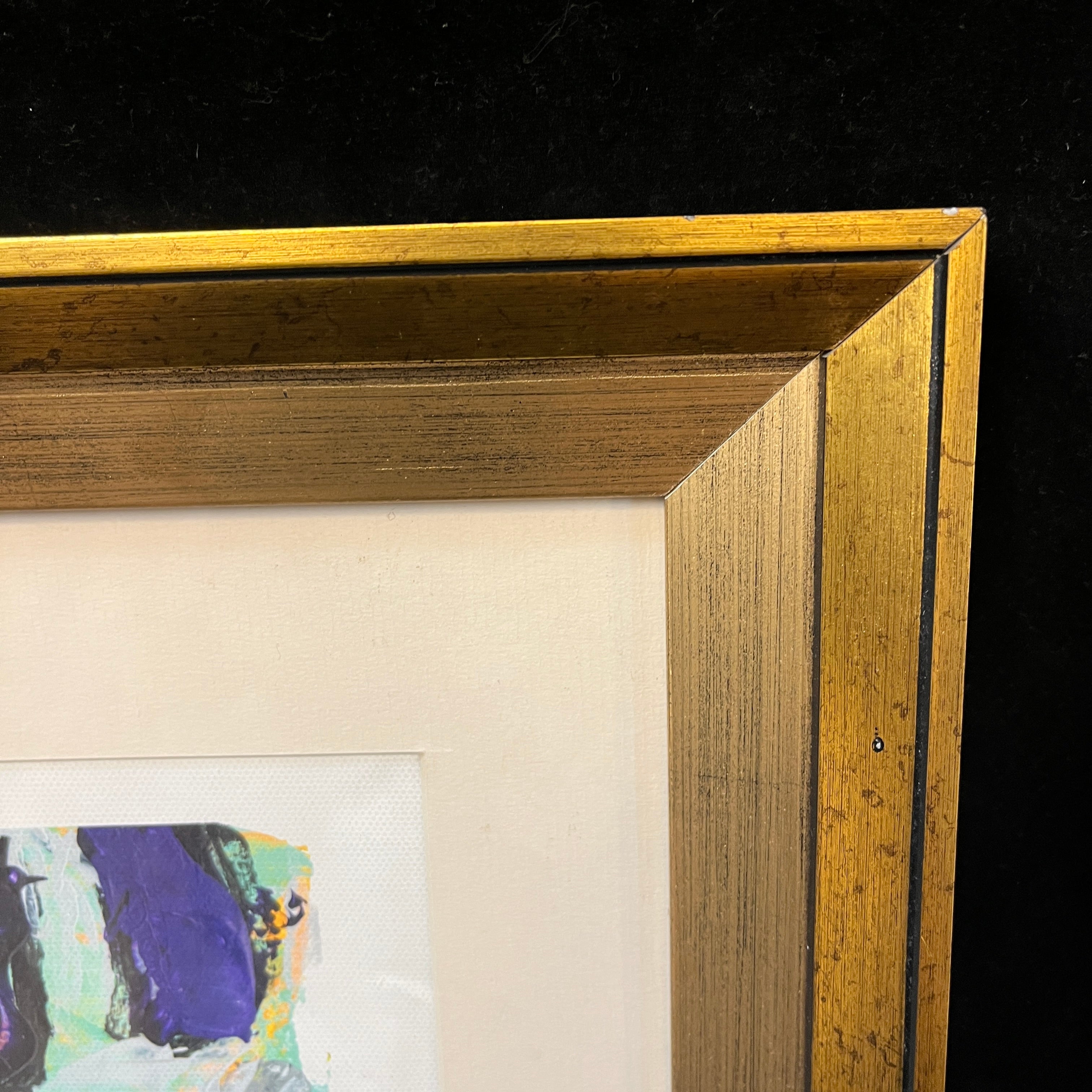 Acrílico sobre papel del artista chileno Vittorio Queirolo, representando unos lirios con su reconocible estilo lúdico y expresivo en el uso del material. Las flores, de colores saturados, están sobre un fondo de trazos grises, haciendo resaltar la combinación de verde, morado y amarillo. La obra tiene un marco contemporáneo, de diseño minimalista, pintado en dorado.
