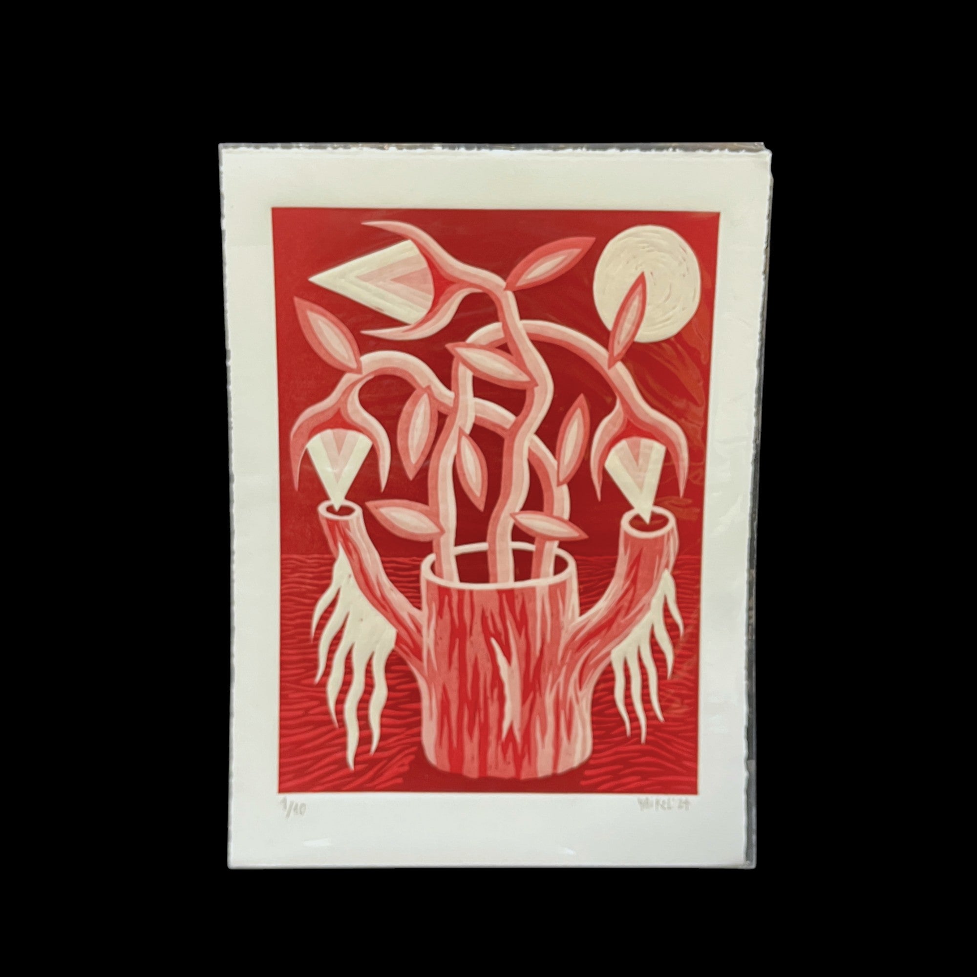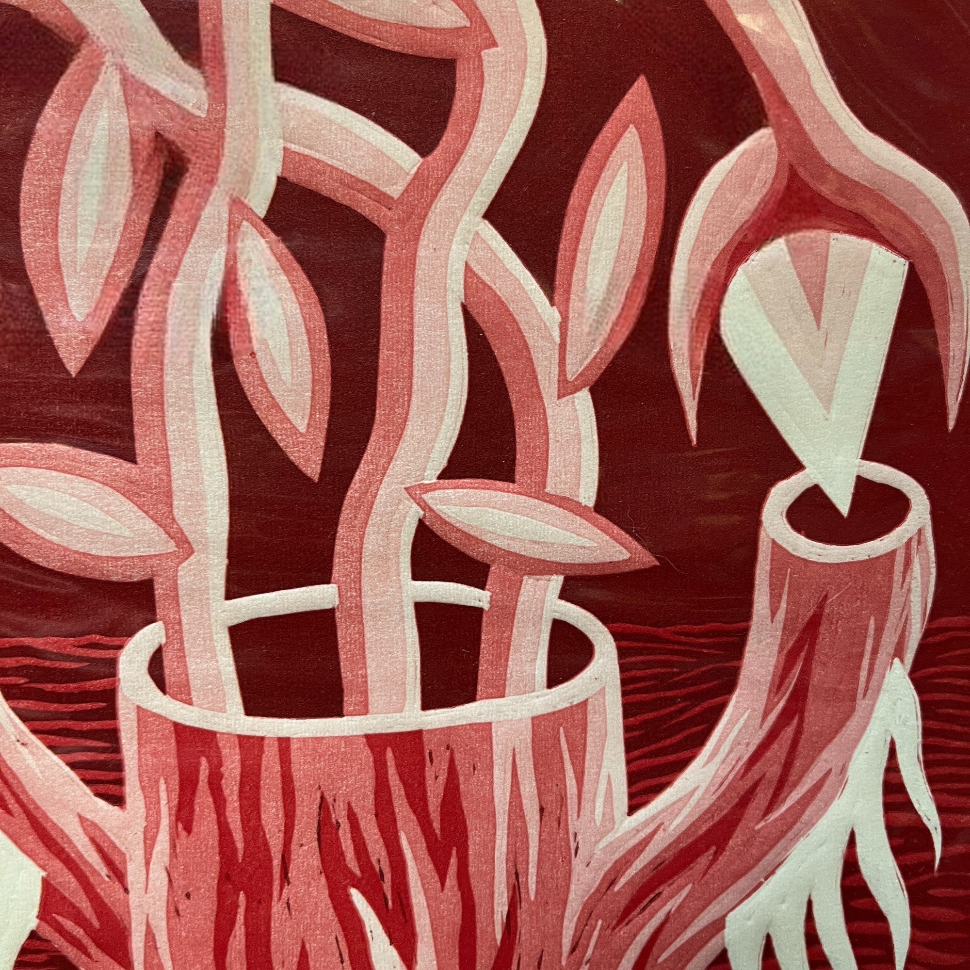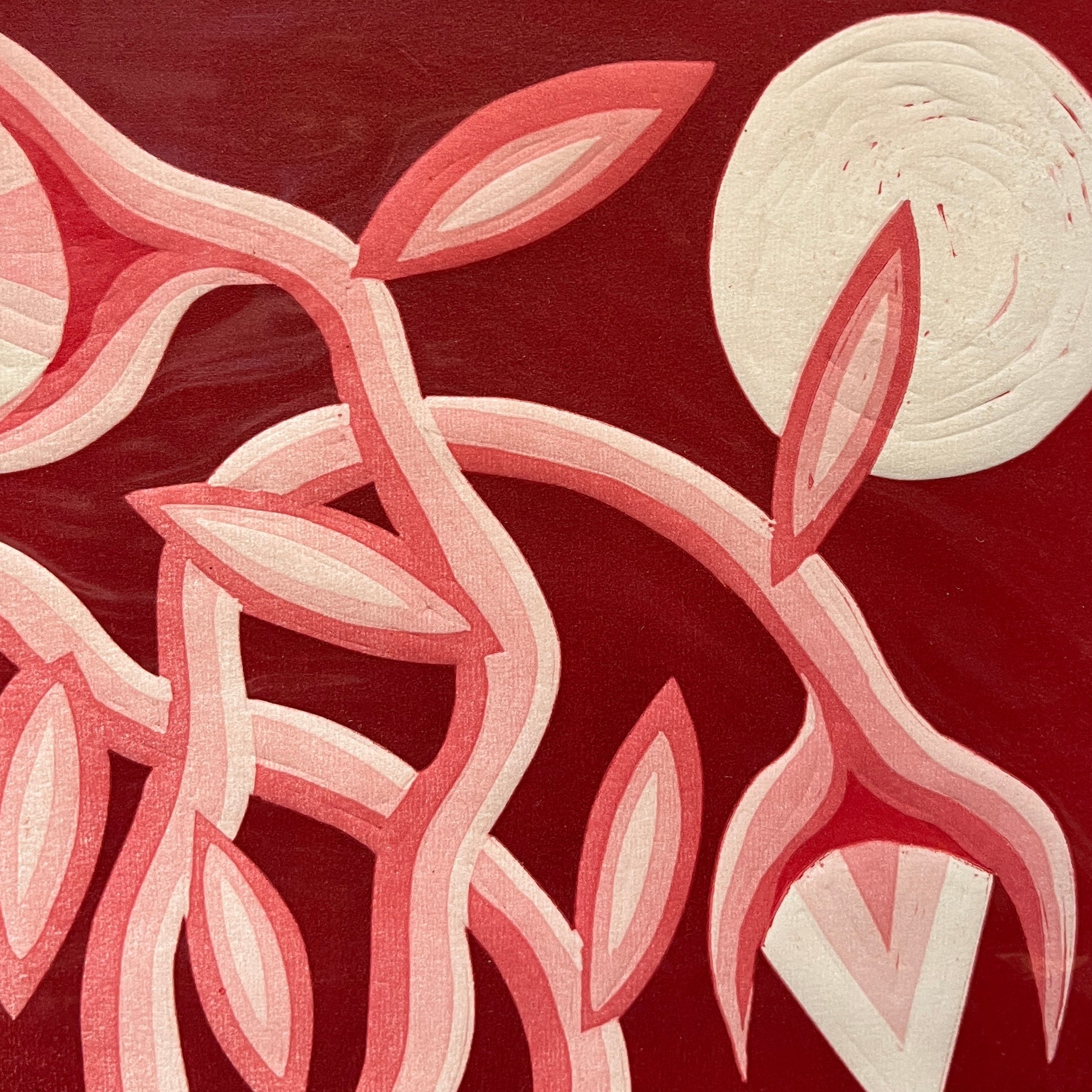 Hermoso linóleo del artista chileno Michael Yaikel, vemos un tronco hueco desde donde brotan ramas de vida en diferentes direcciones. Es una obra cargada en los tonos rojos que entrega a la vista una alta carga de movimiento y su observación abre a un abanico de simbolismos personales.