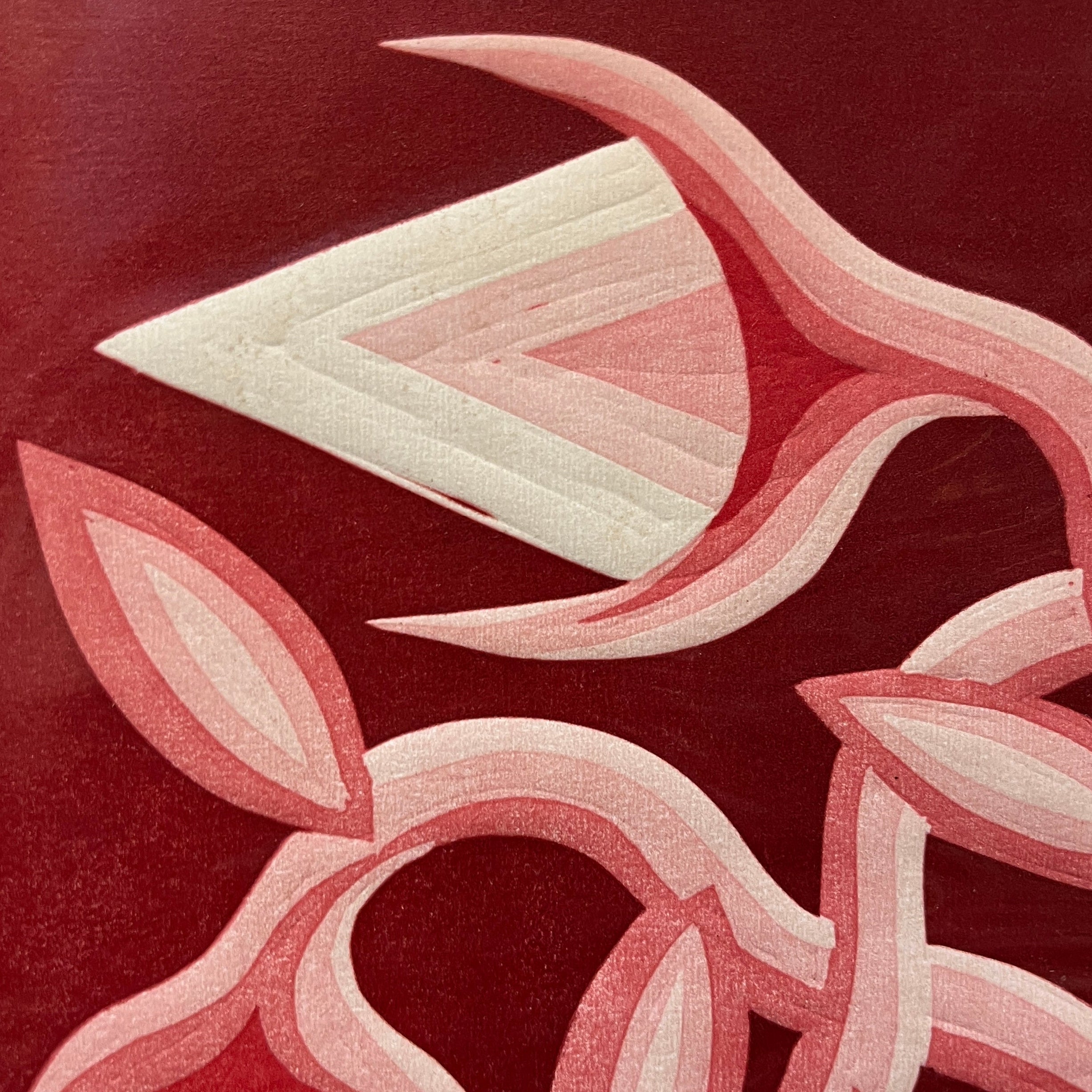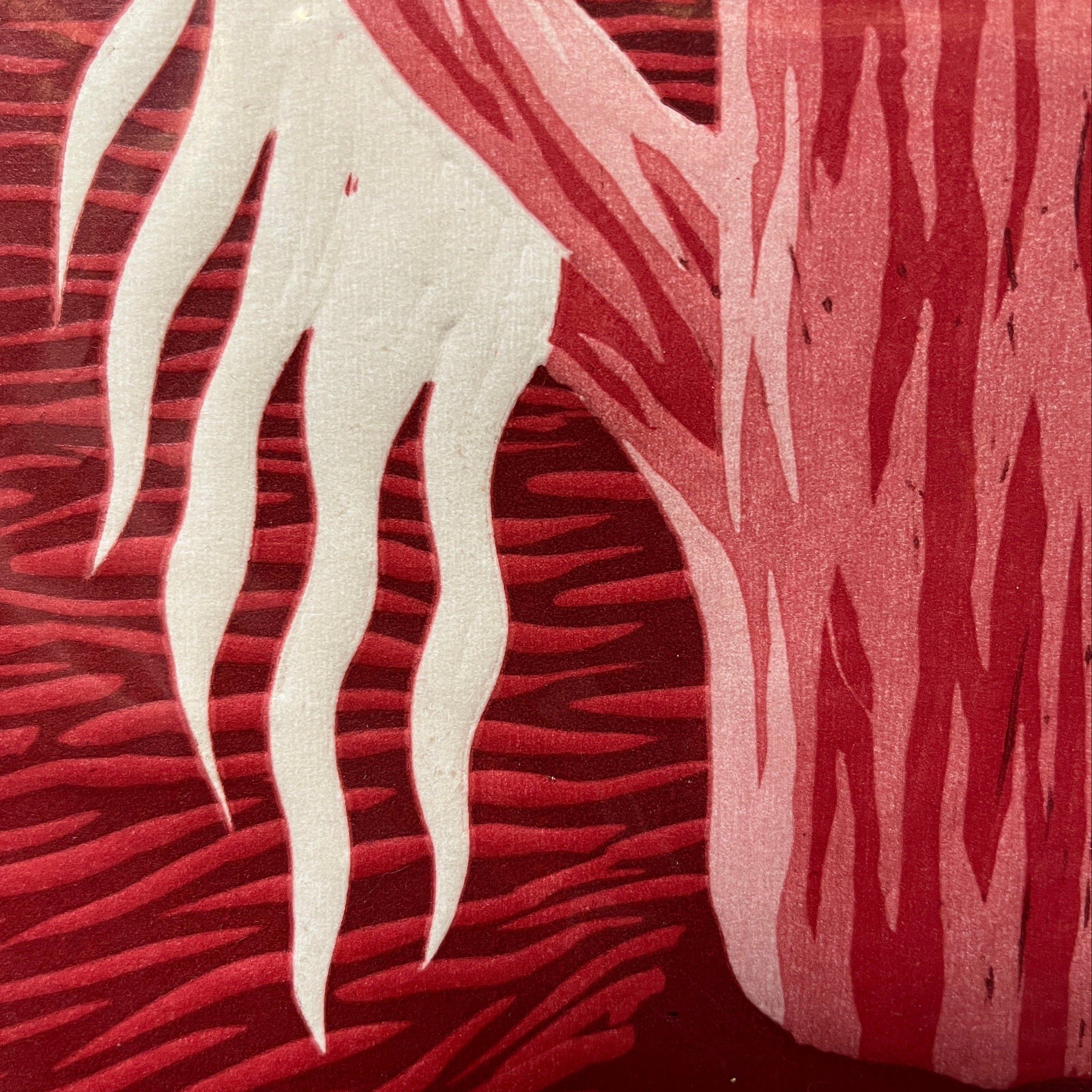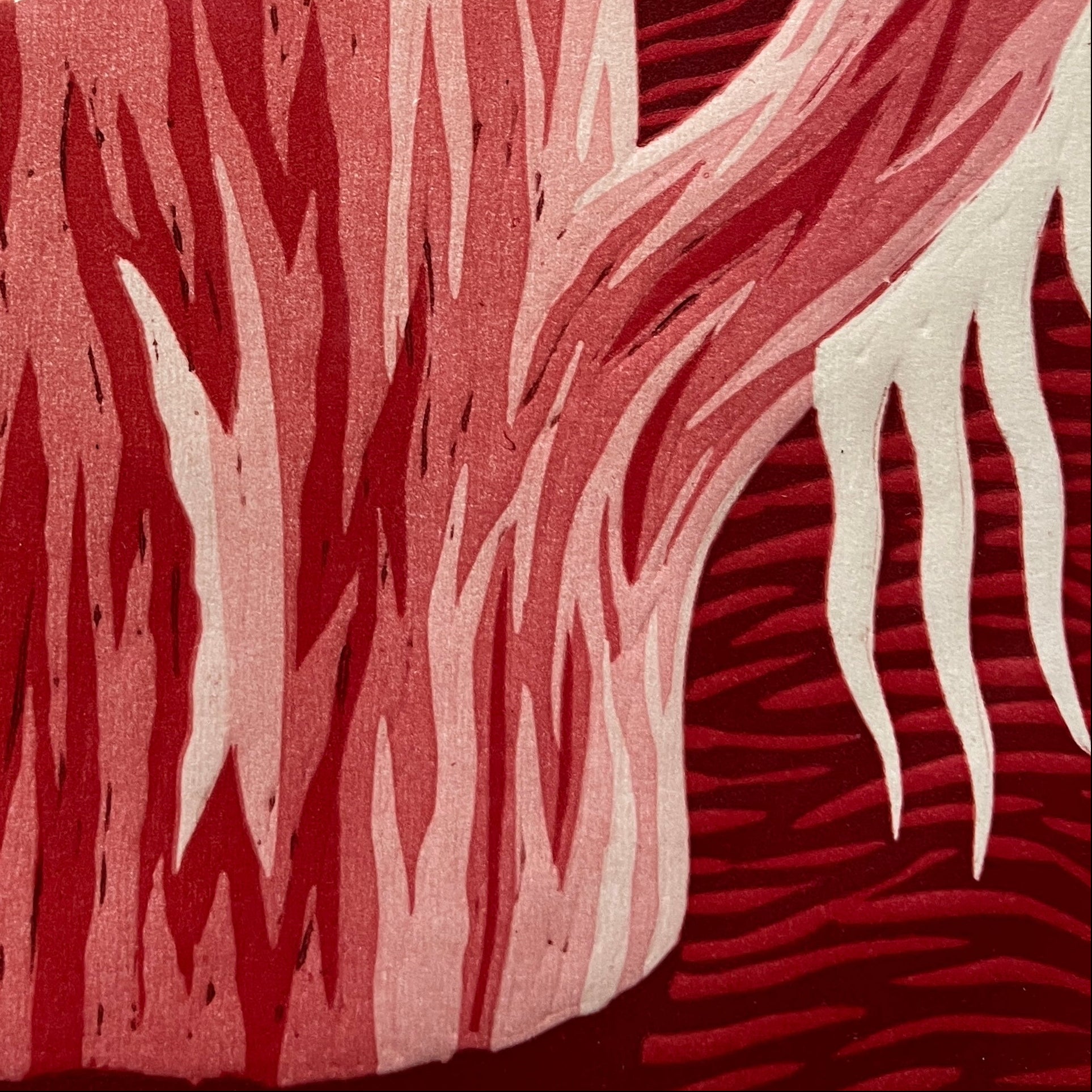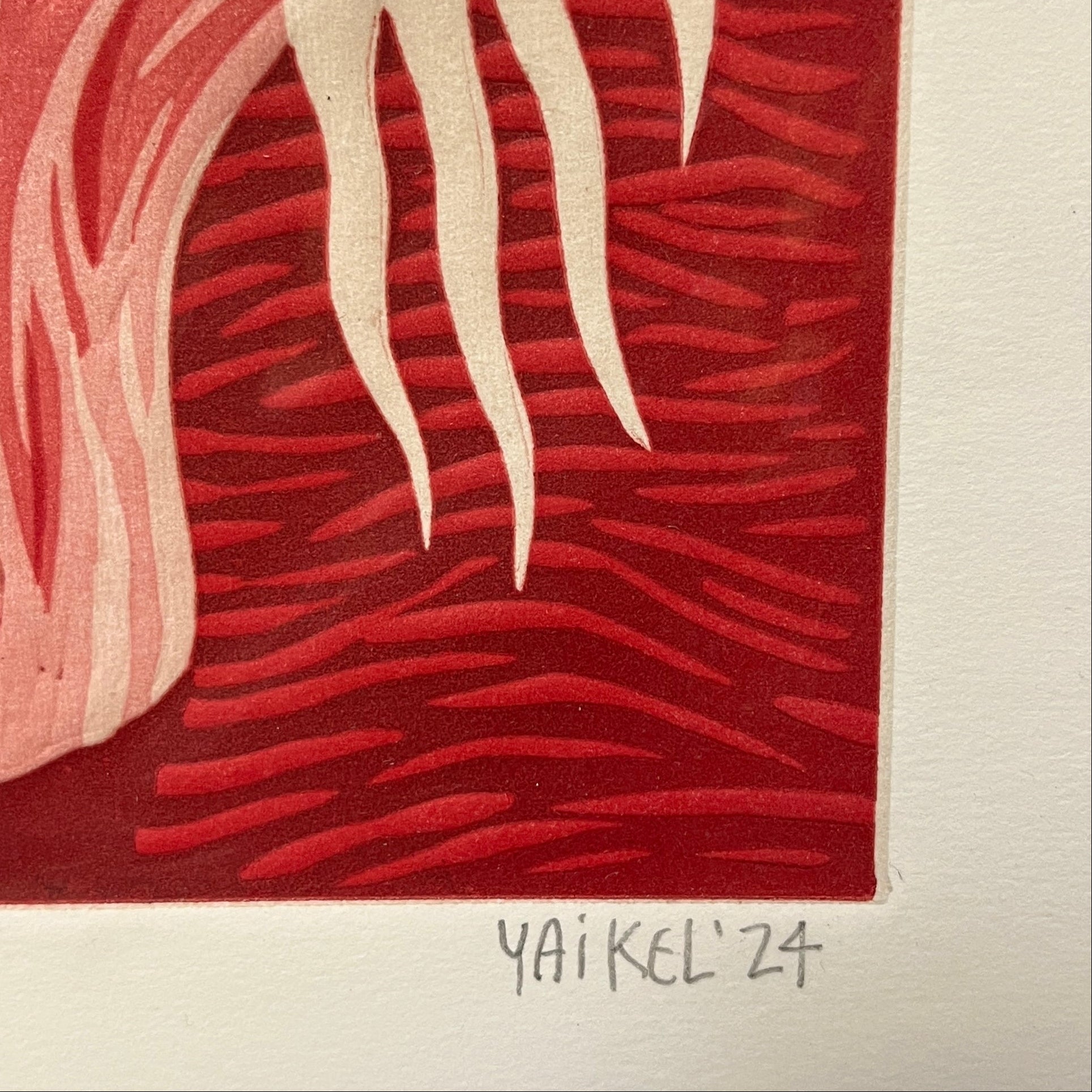 Hermoso linóleo del artista chileno Michael Yaikel, vemos un tronco hueco desde donde brotan ramas de vida en diferentes direcciones. Es una obra cargada en los tonos rojos que entrega a la vista una alta carga de movimiento y su observación abre a un abanico de simbolismos personales.